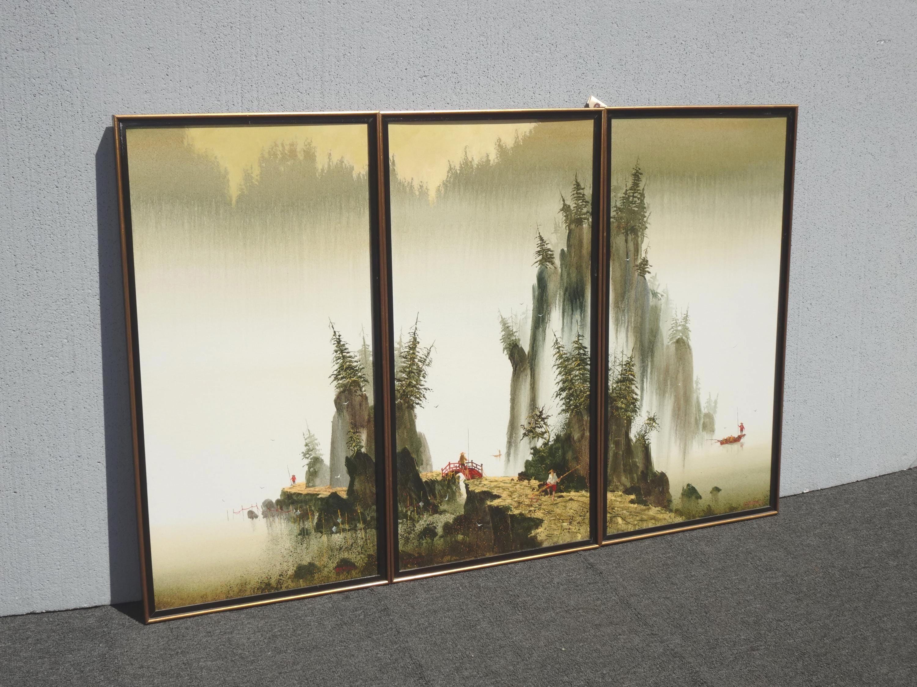 Vintage Oriental Asian Oil on Canvas Picture Painting Mountain Fishing ~ Signed