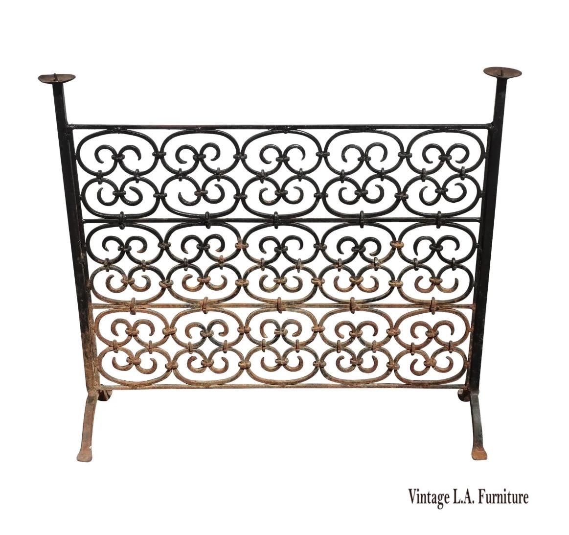 Vtg French Country Black Rustic Wrought Iron Fireplace Screen w Candle Holders
