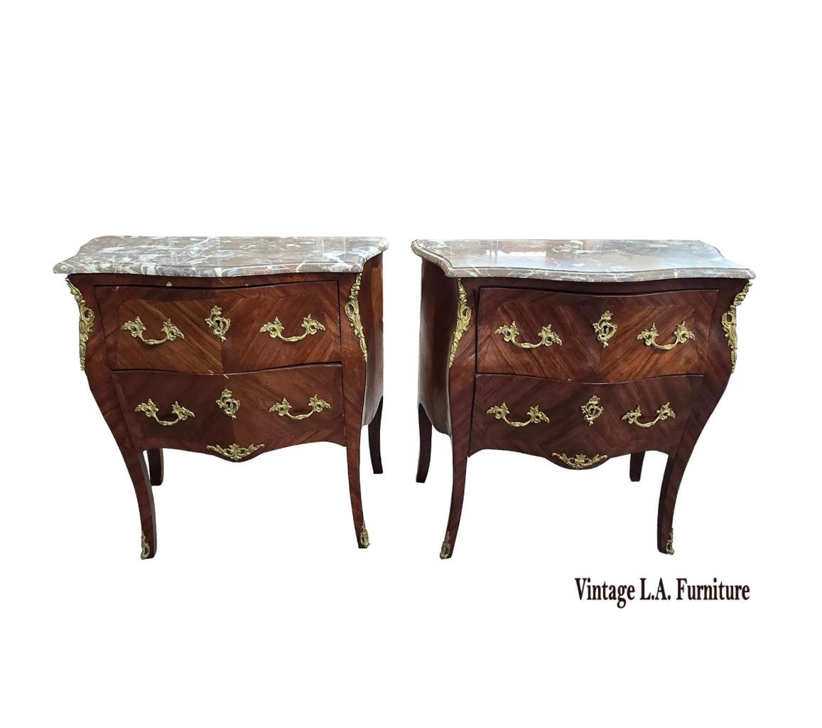 Antique French Louis Marble Bombe Nightstands w Brass Ormolu Hardware