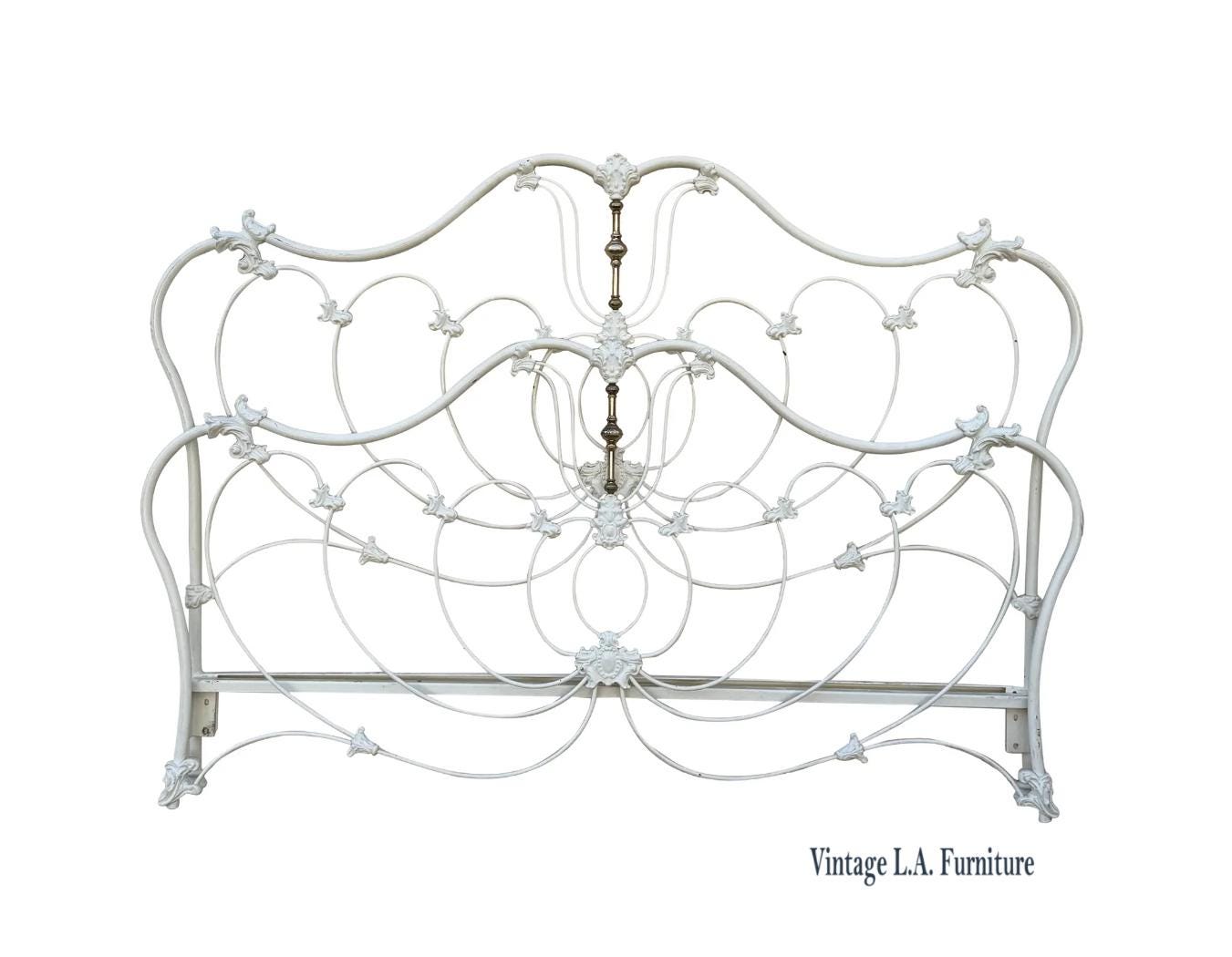 Vintage Elliott's Designs White Cast Iron Brass Queen King Headboard Footboard