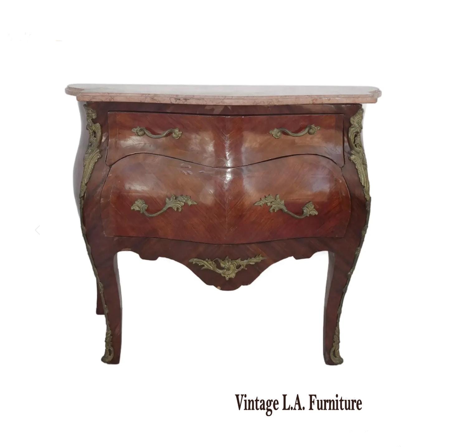 Vintage French Louis VXI Marquetry Commode Bombe Side Table W Marble and Ormolu