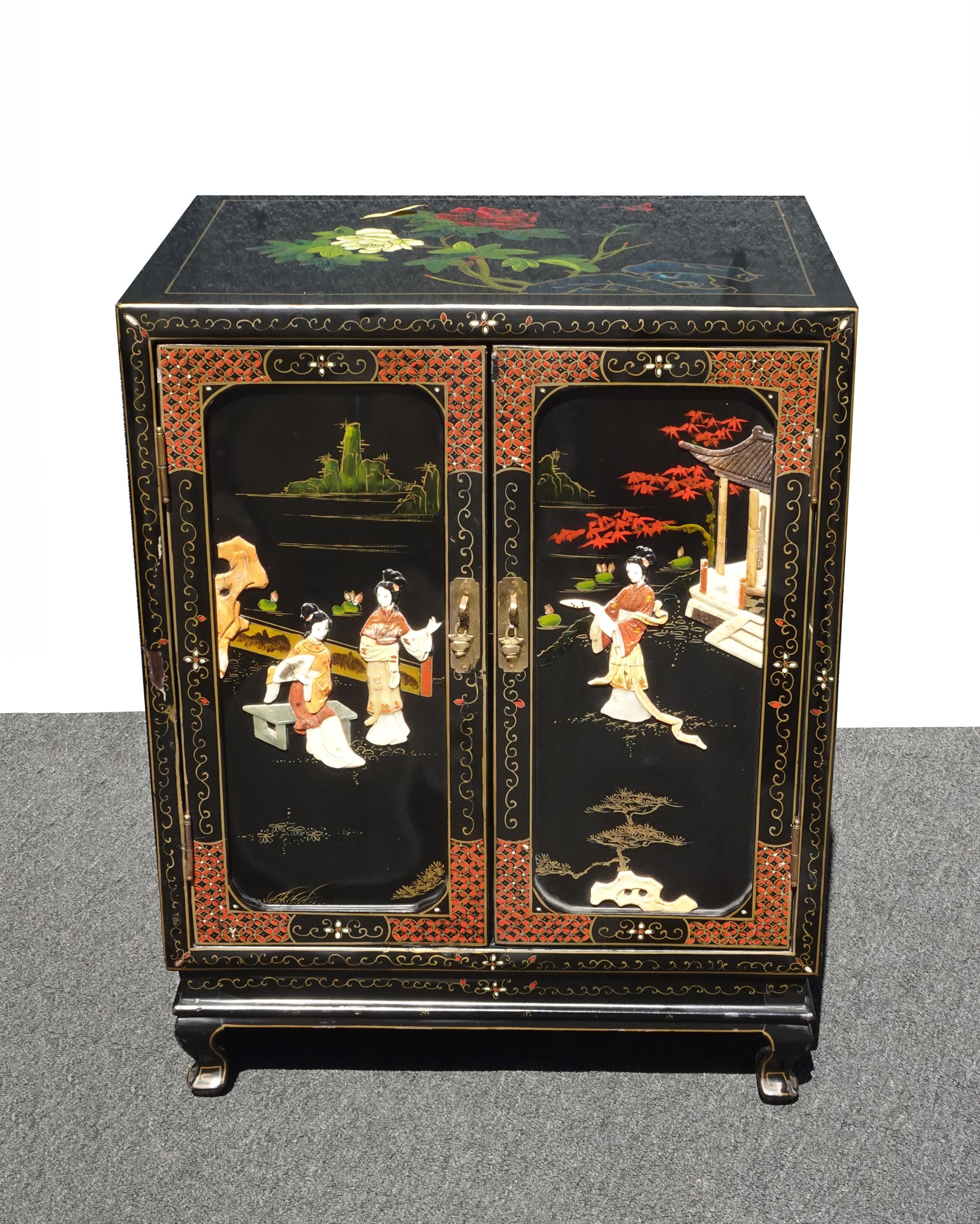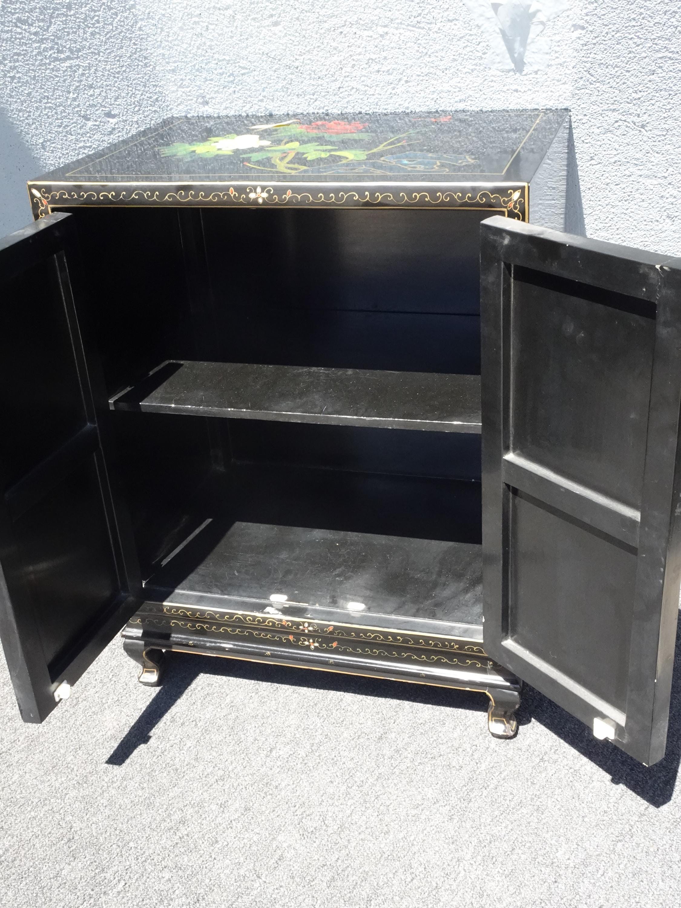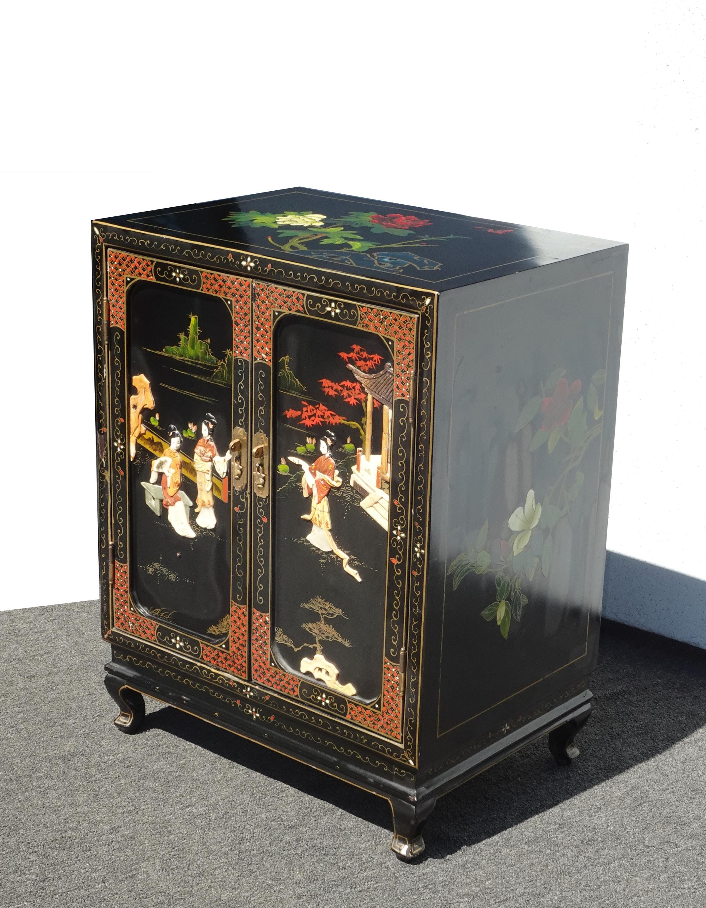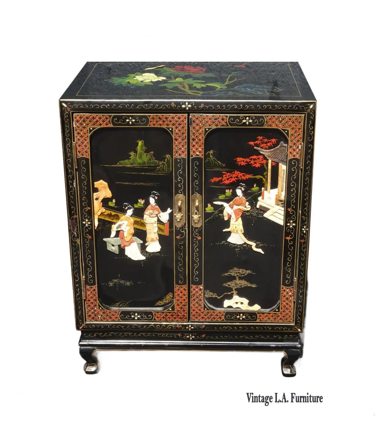 Vintage Oriental Black Lacquer Hand Painted Two Door Cabinet ~ Mother of Pearl