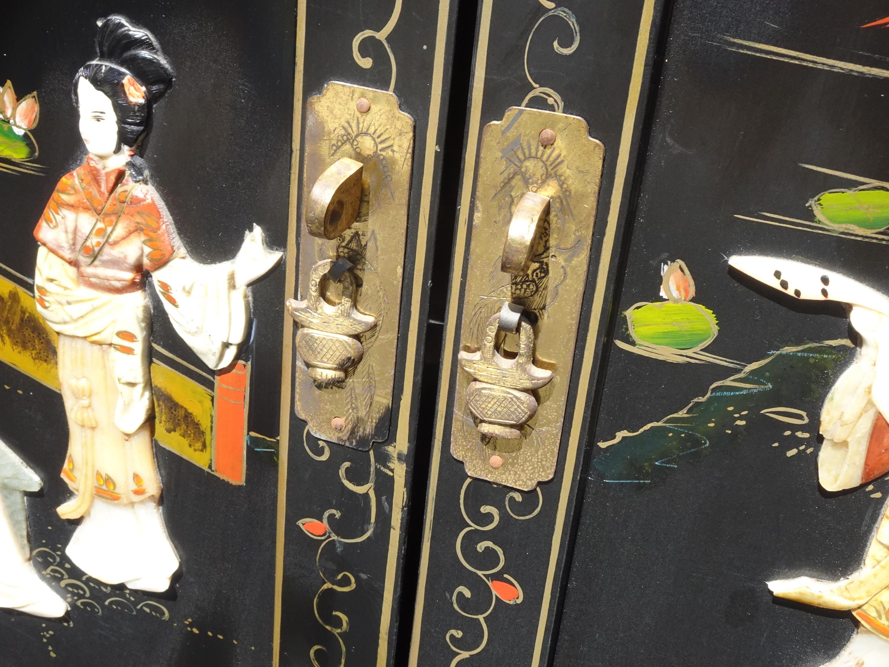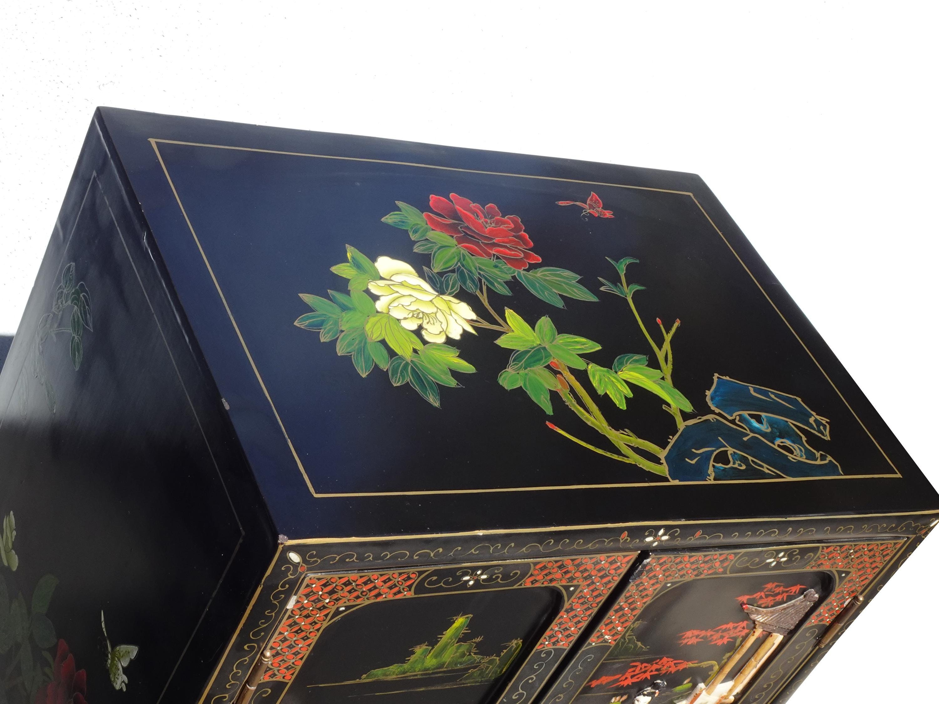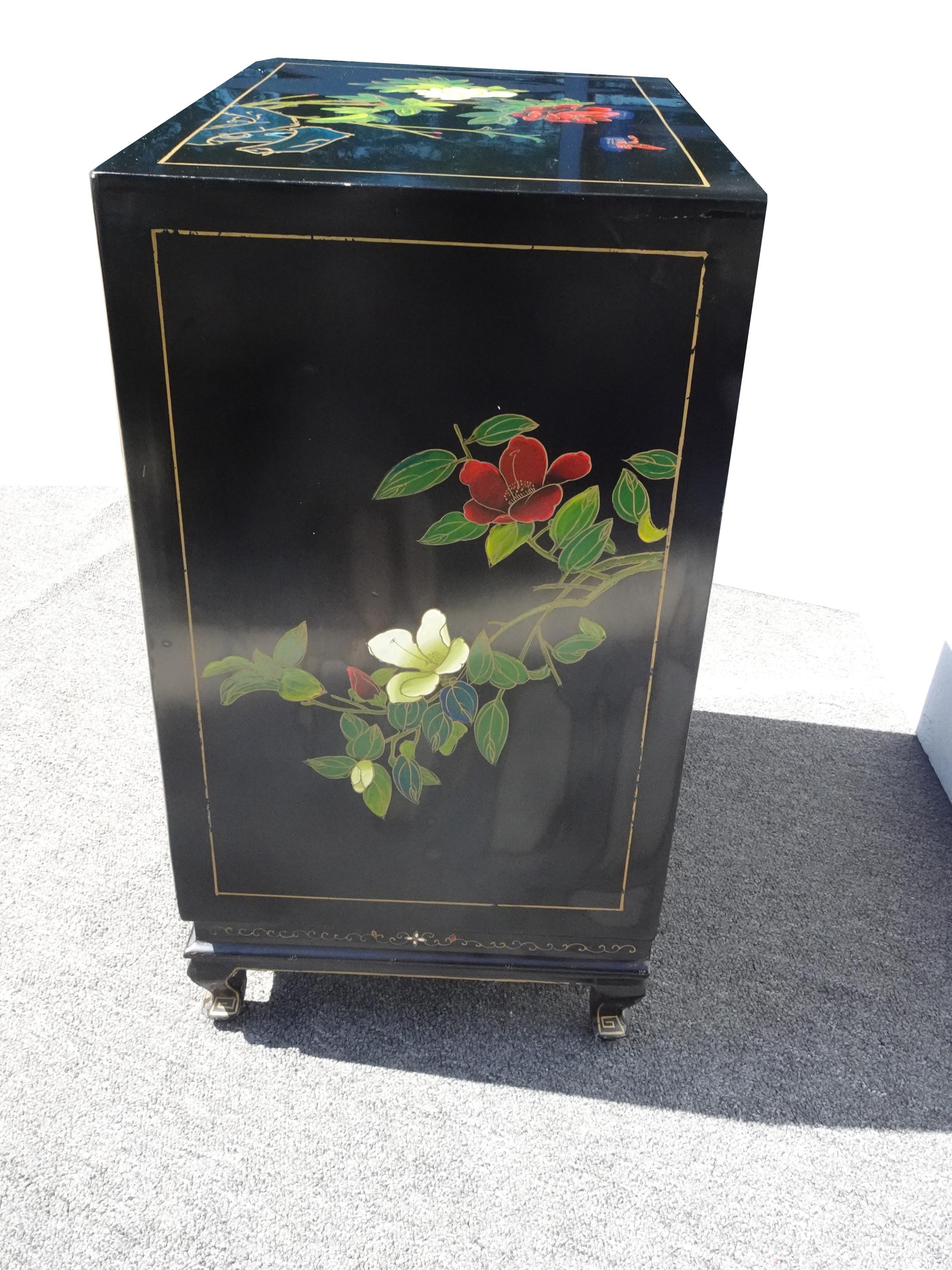 Vintage Oriental Black Lacquer Hand Painted Two Door Cabinet ~ Mother of Pearl