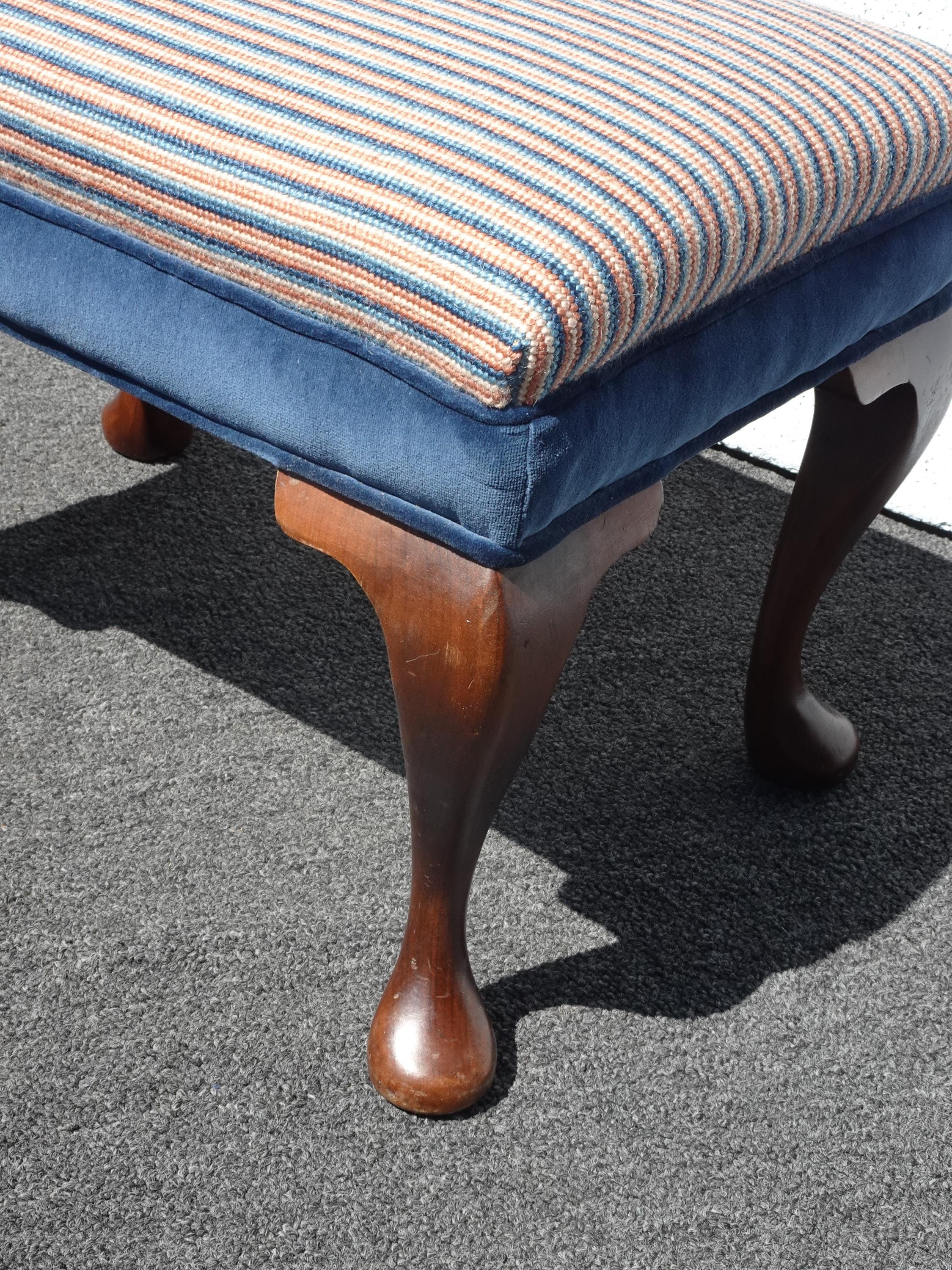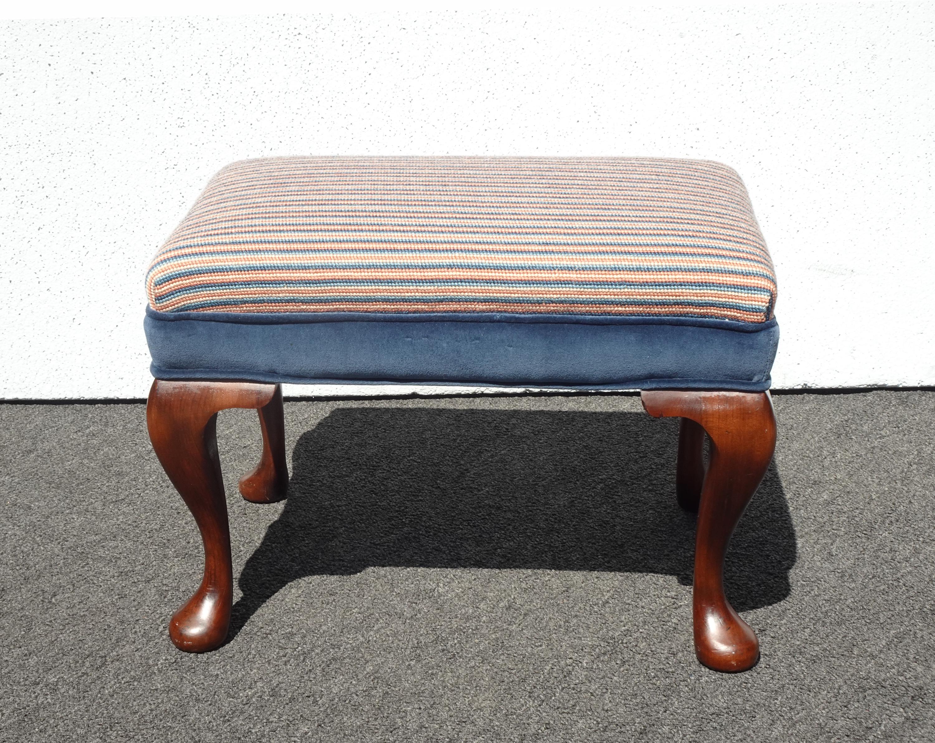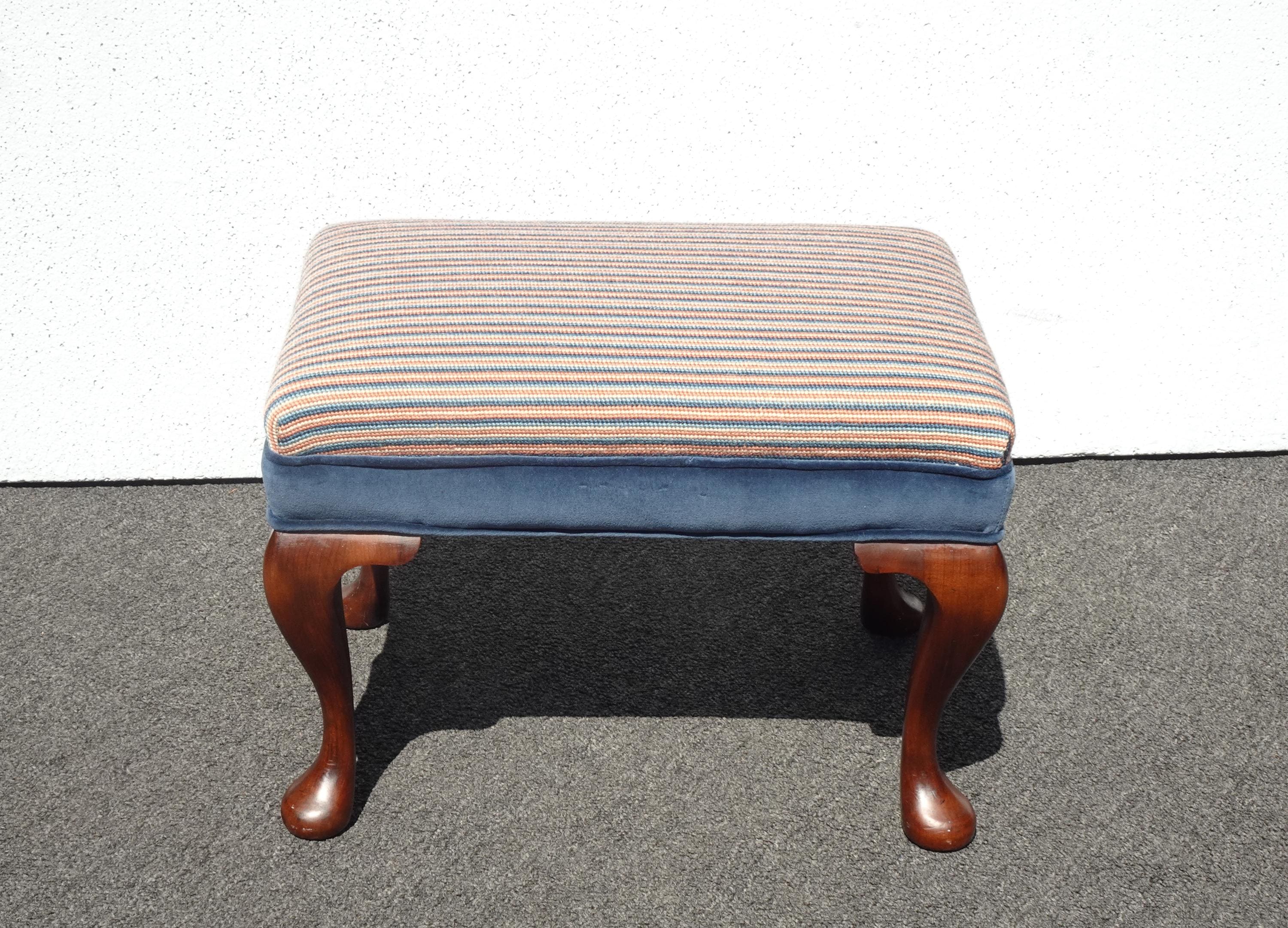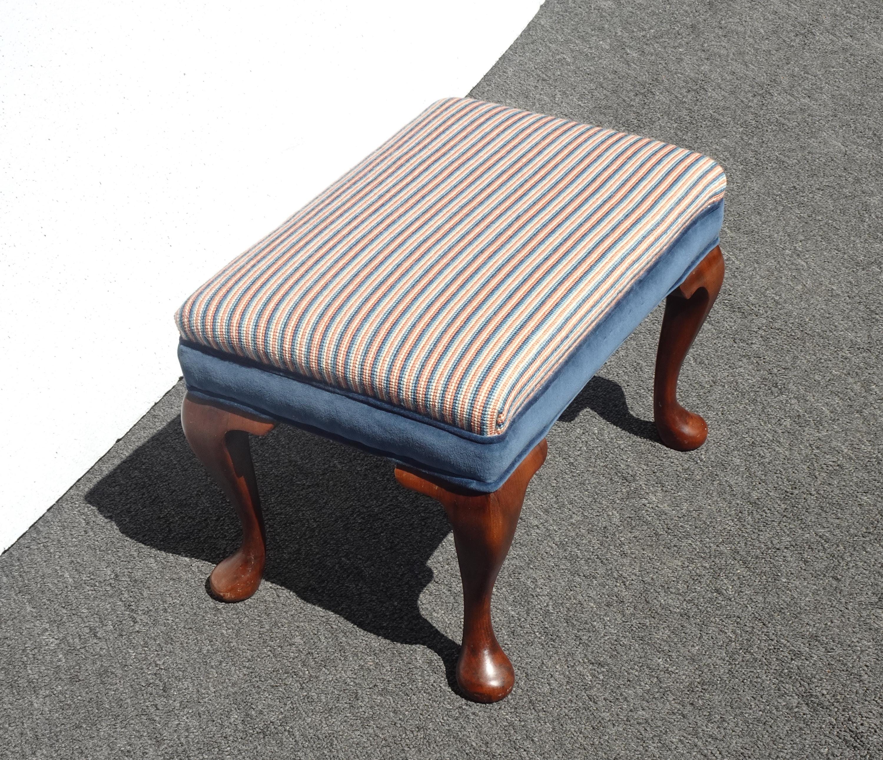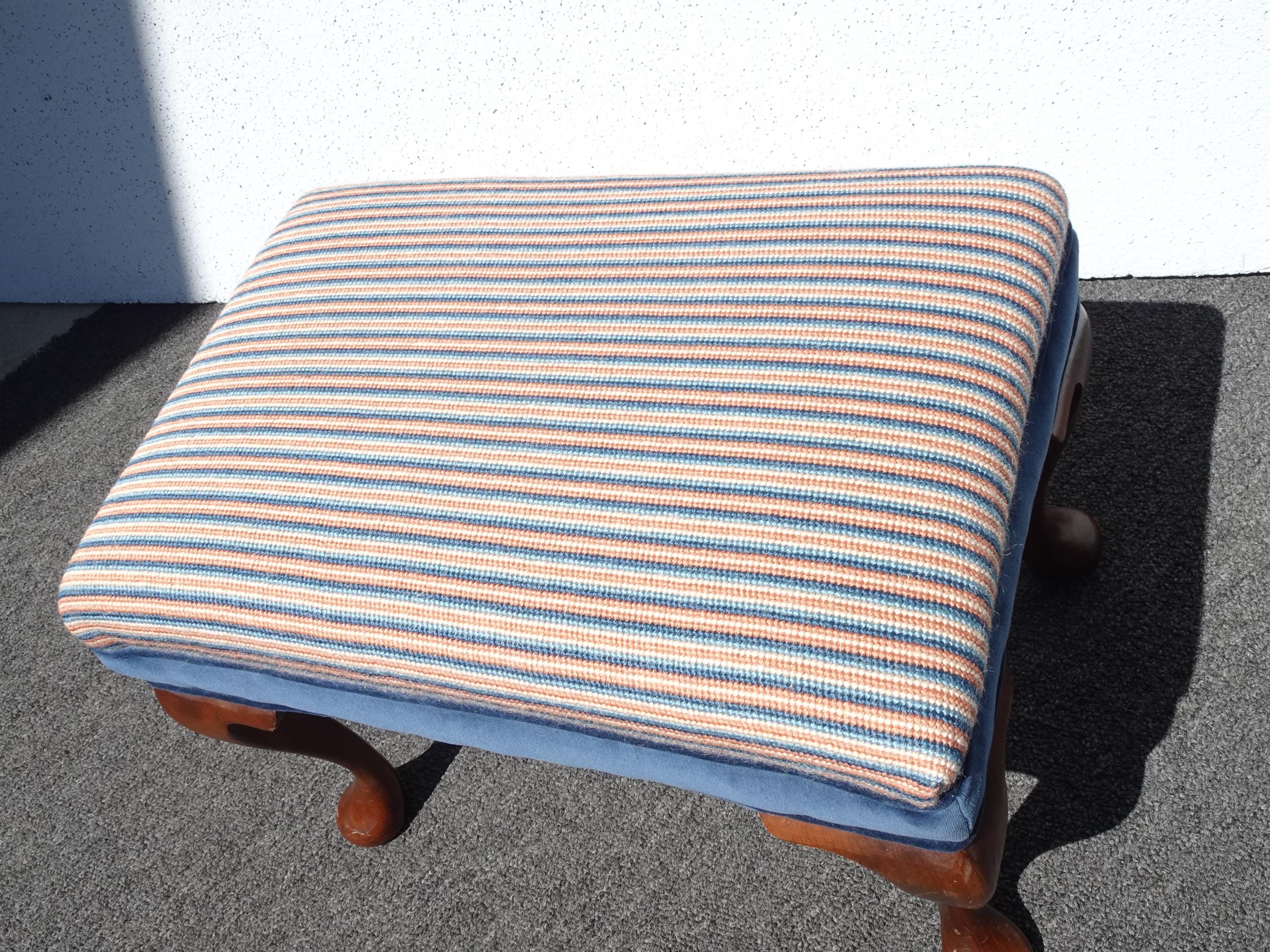 Vintage Queen Anne Blue Stripped Footstool Bench