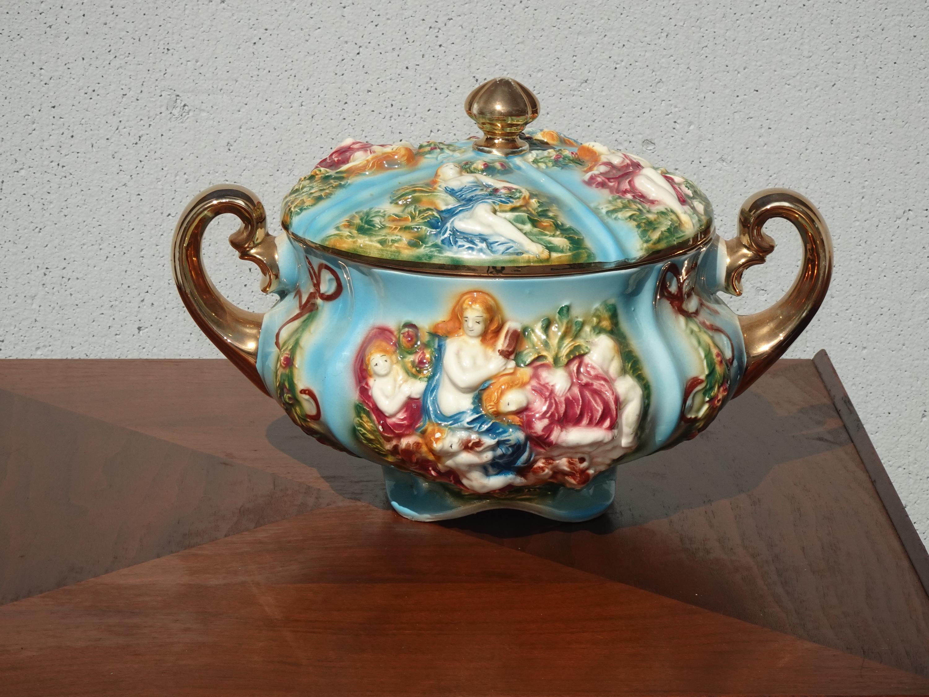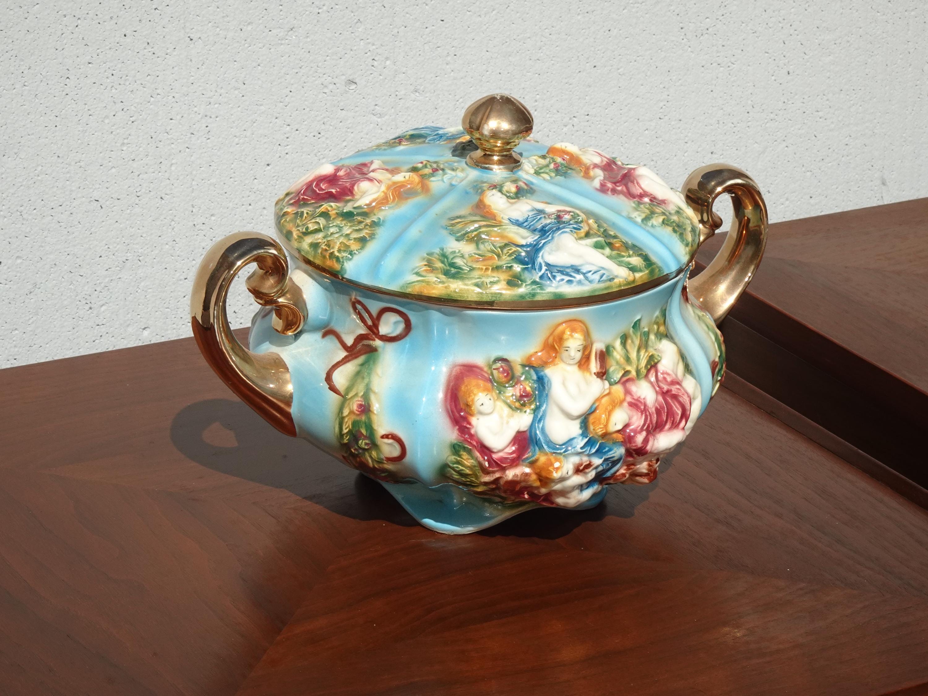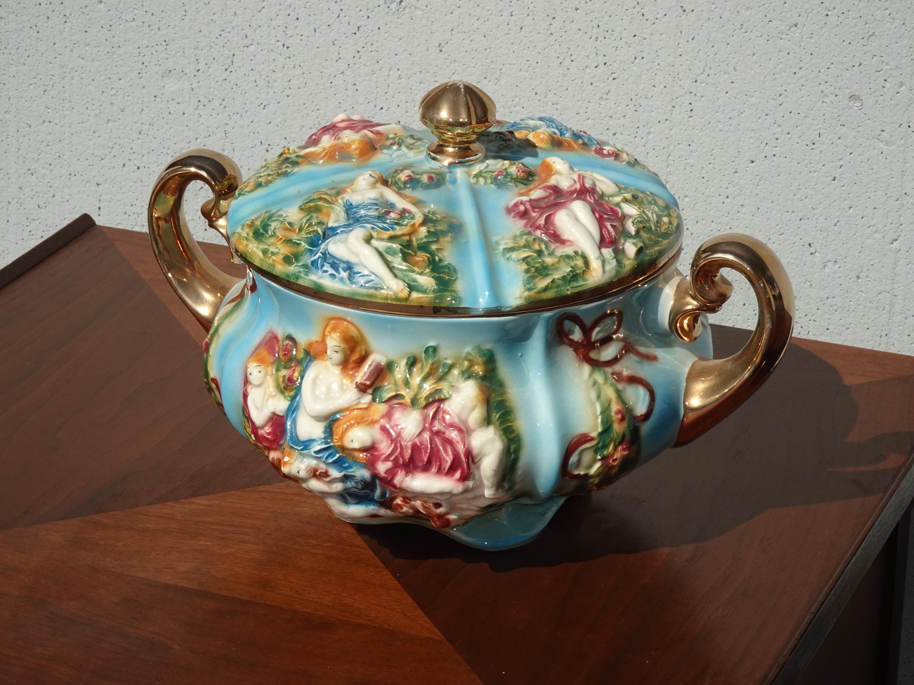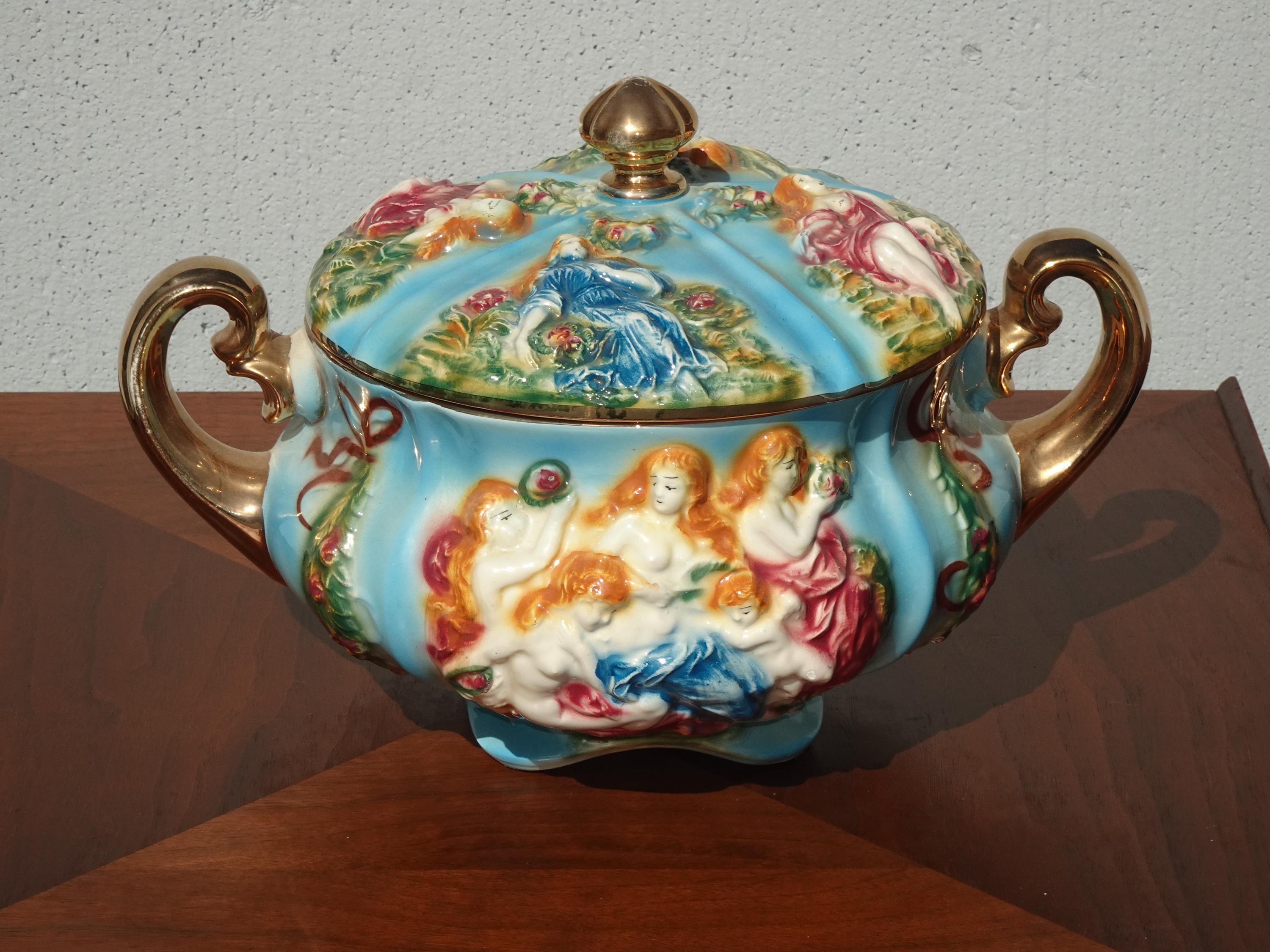 Vintage Blue Capodimonte Bowl w Lid w Handles Naked Cherubs ~ Made in Italy