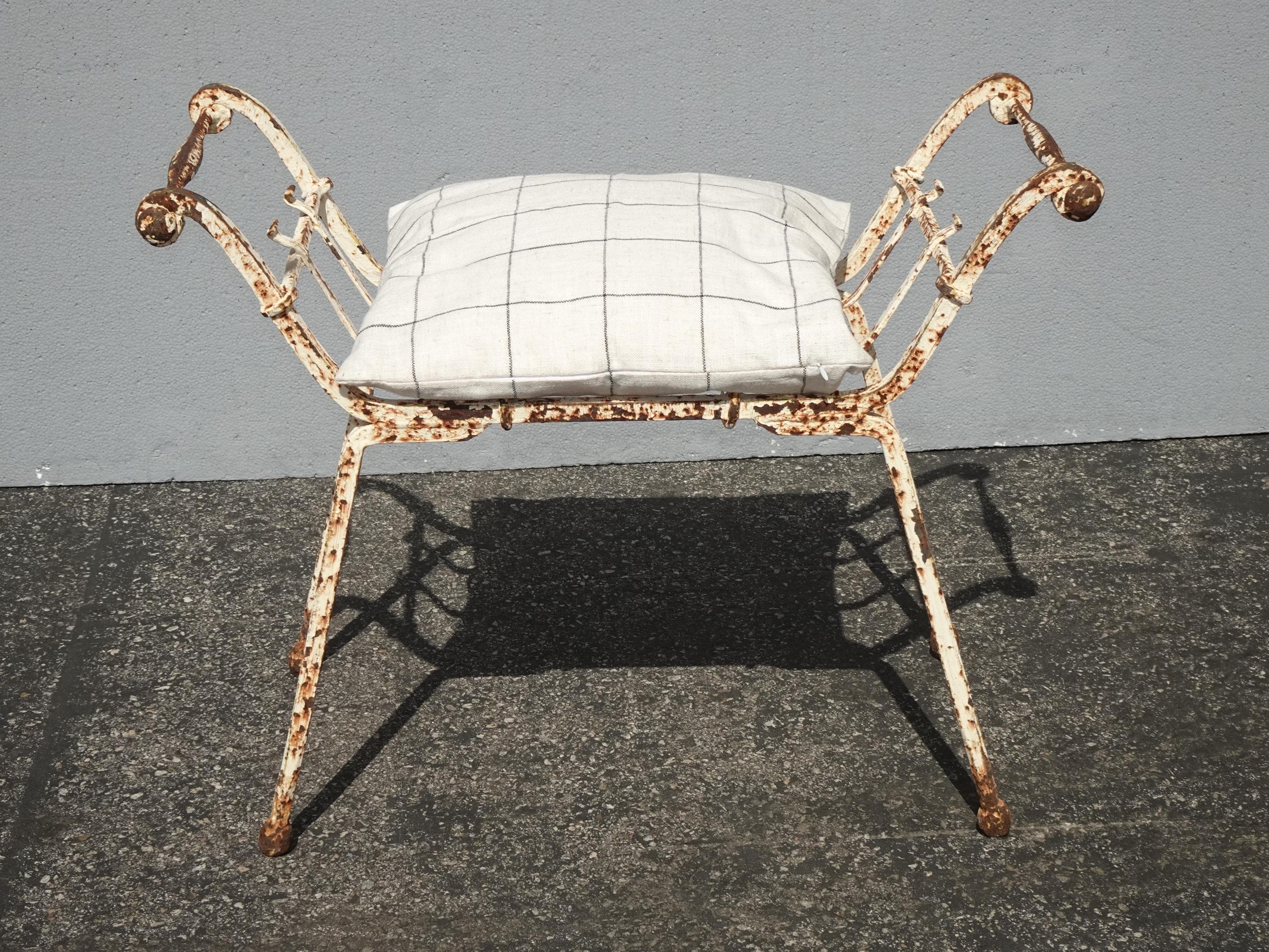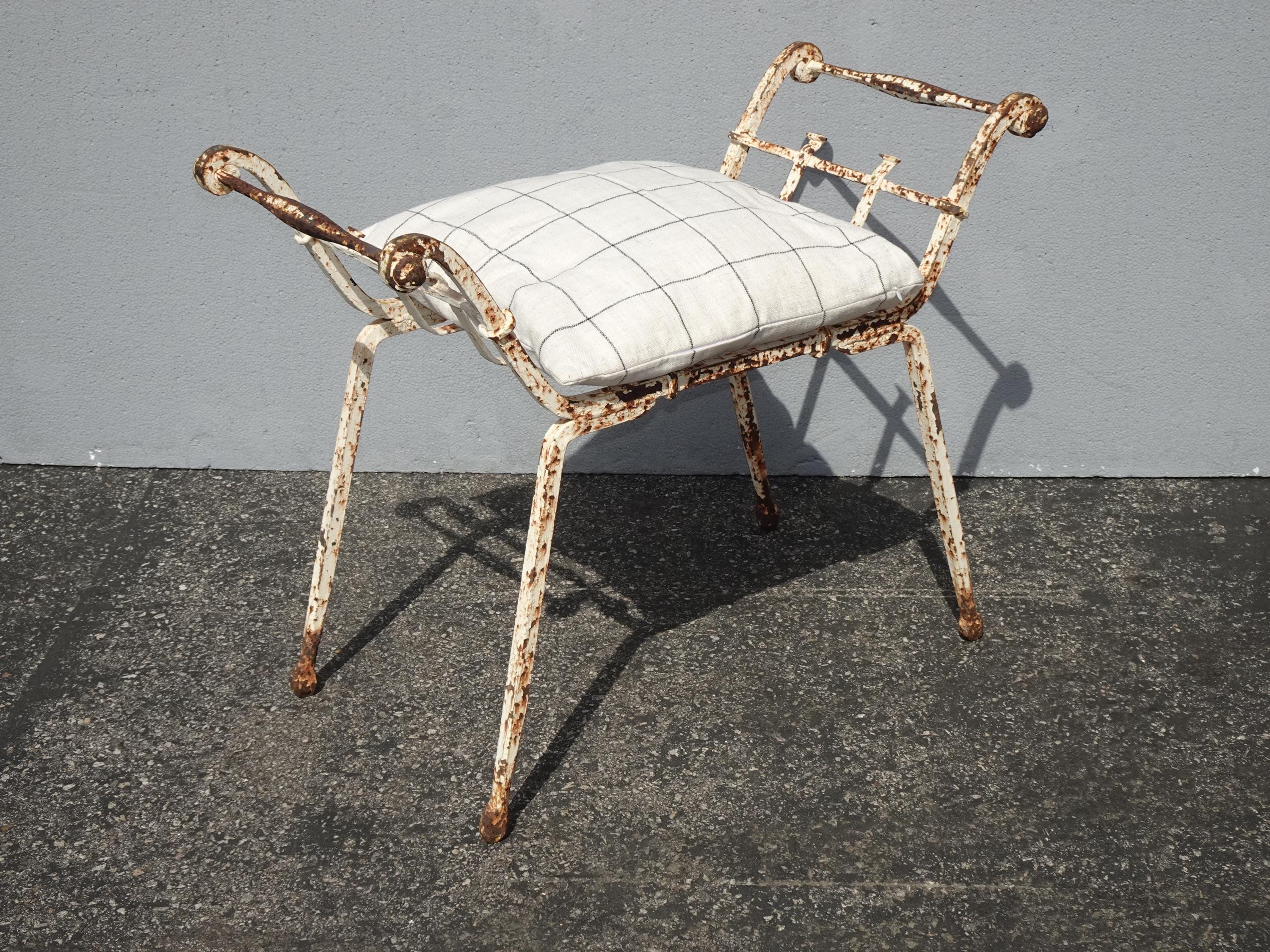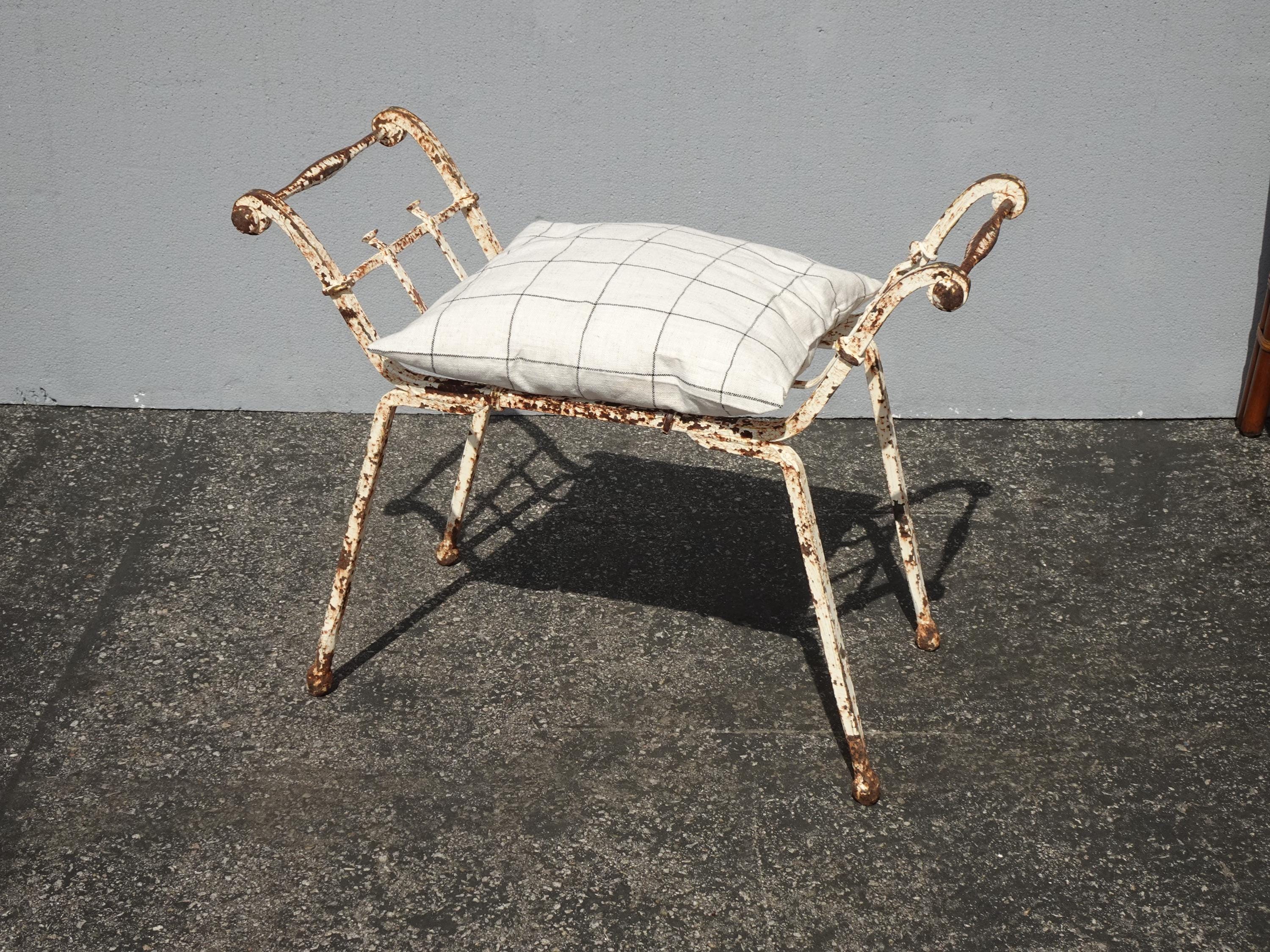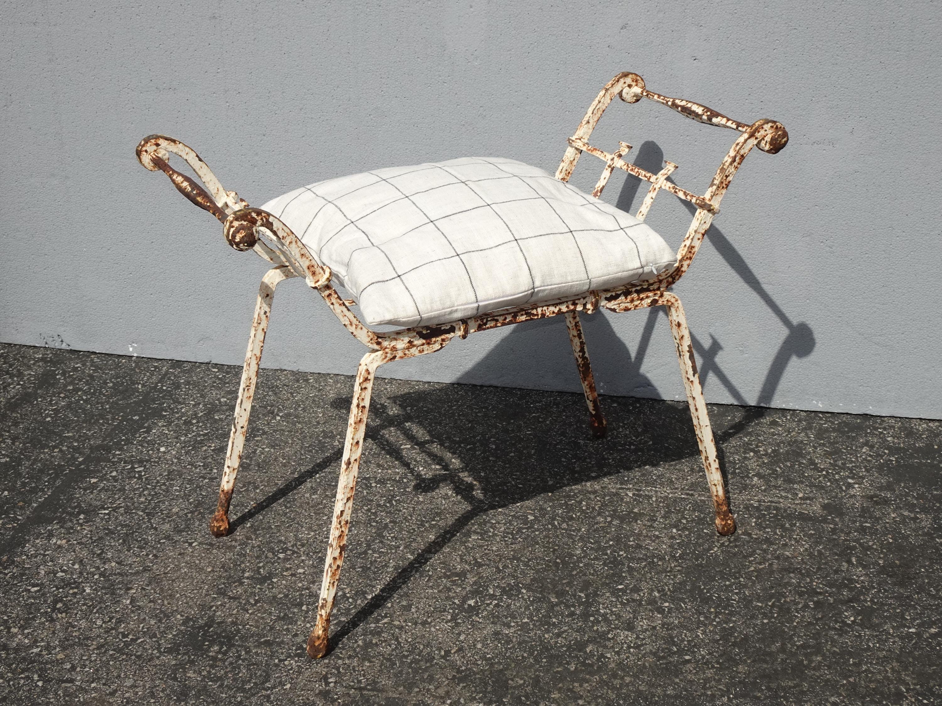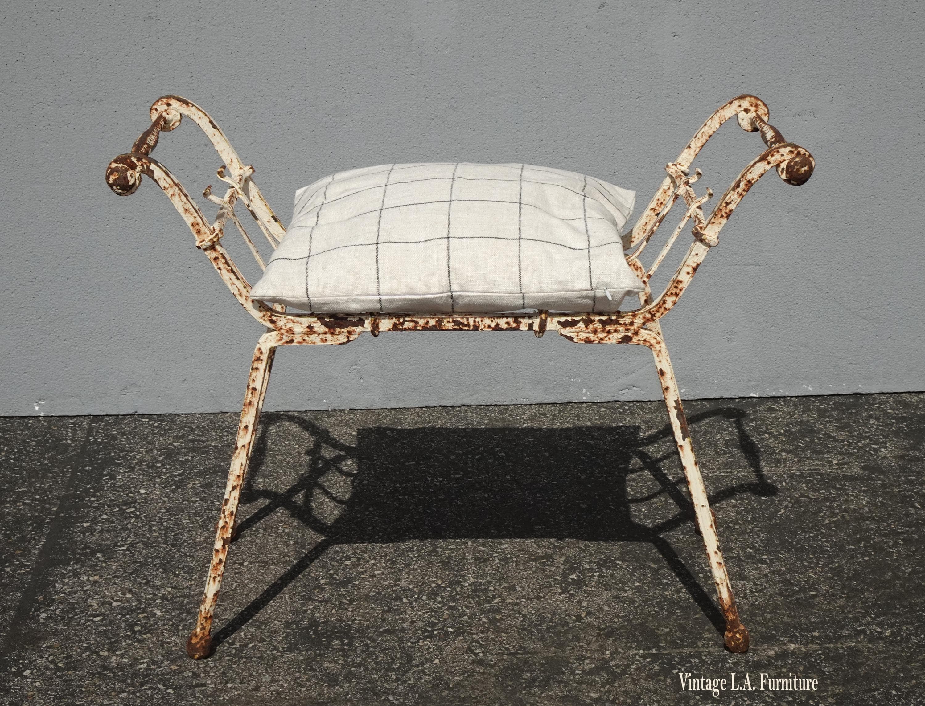 Vintage Rustic Solid Wrought Iron Bench White Cushion French Country Style