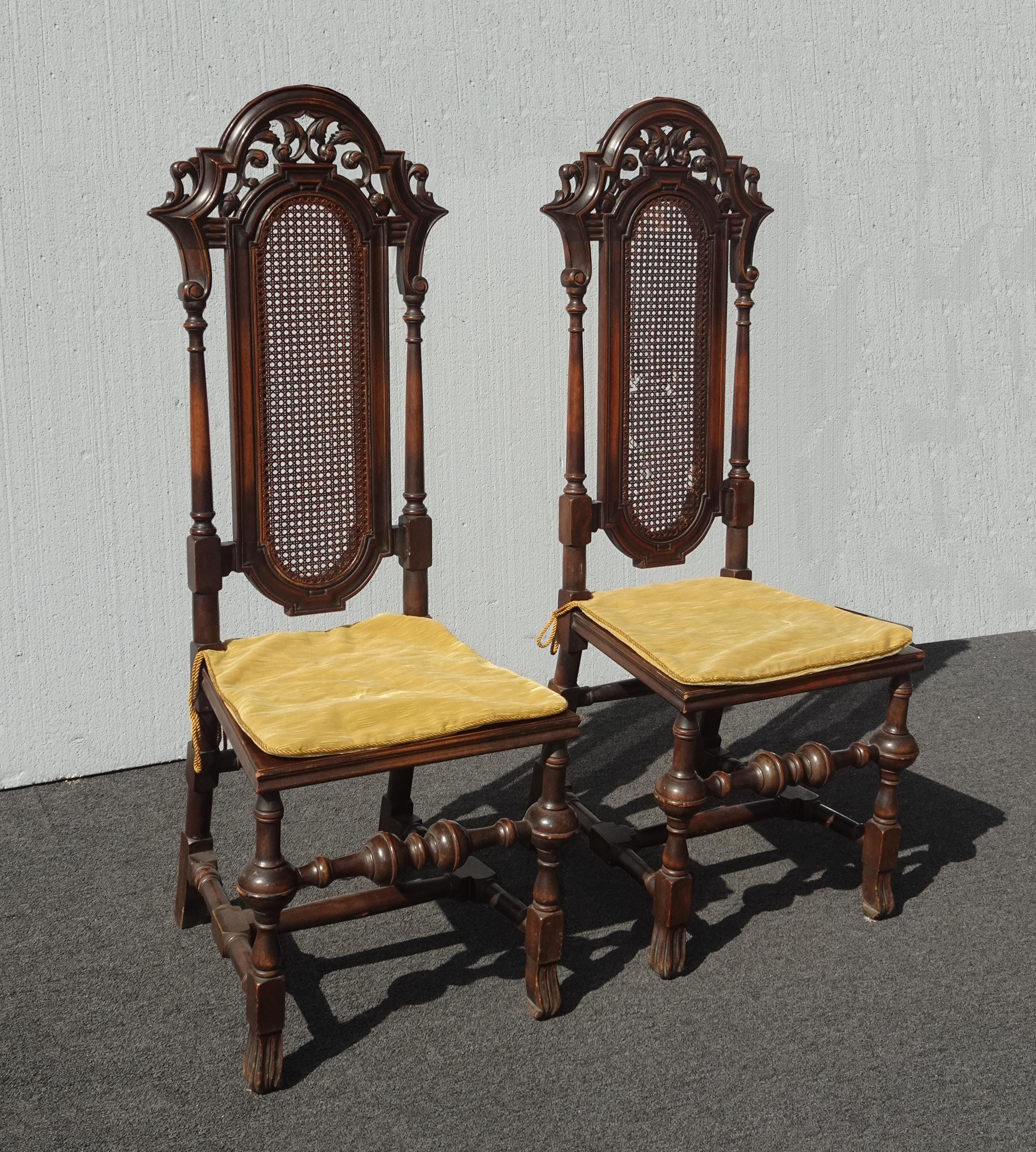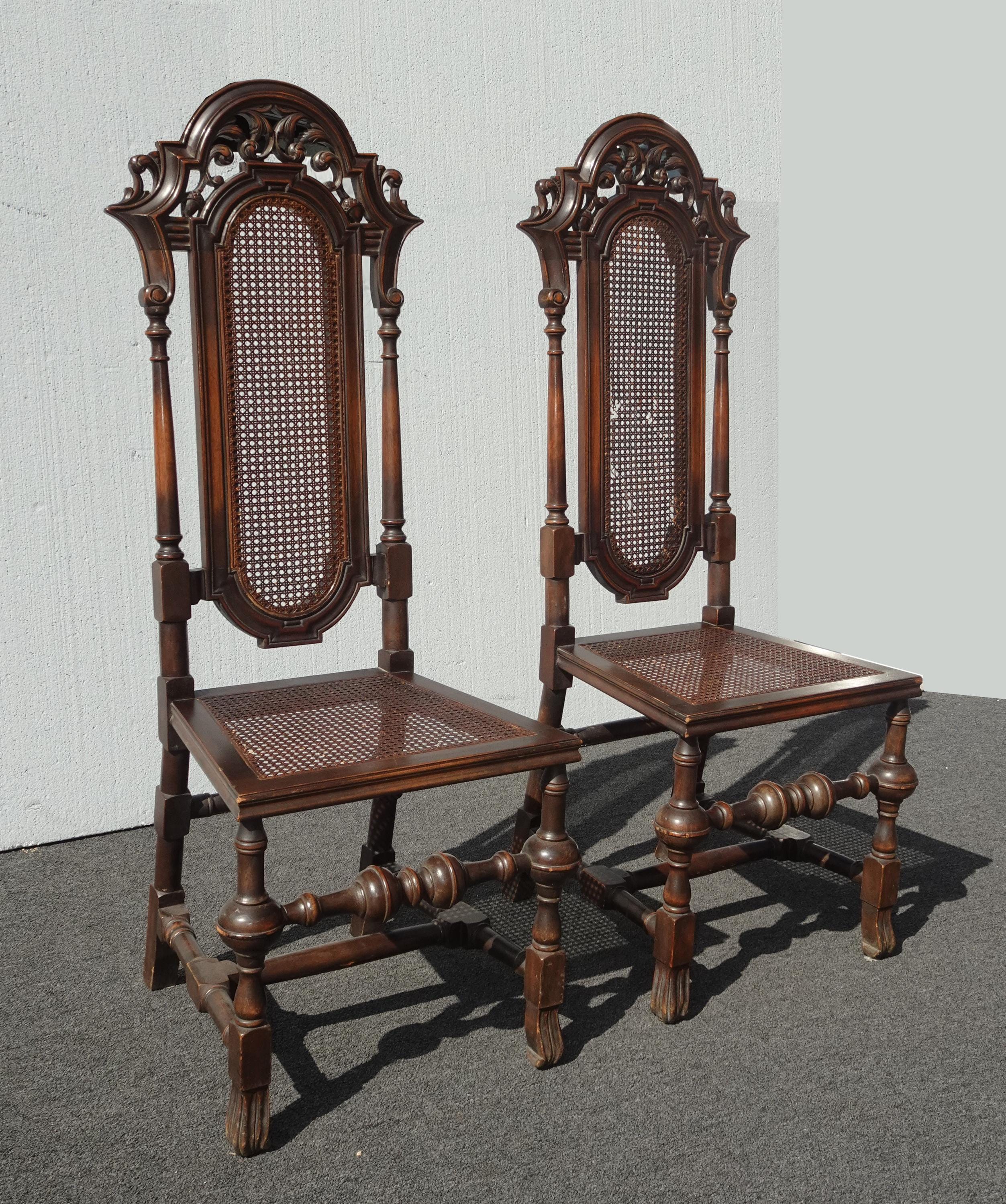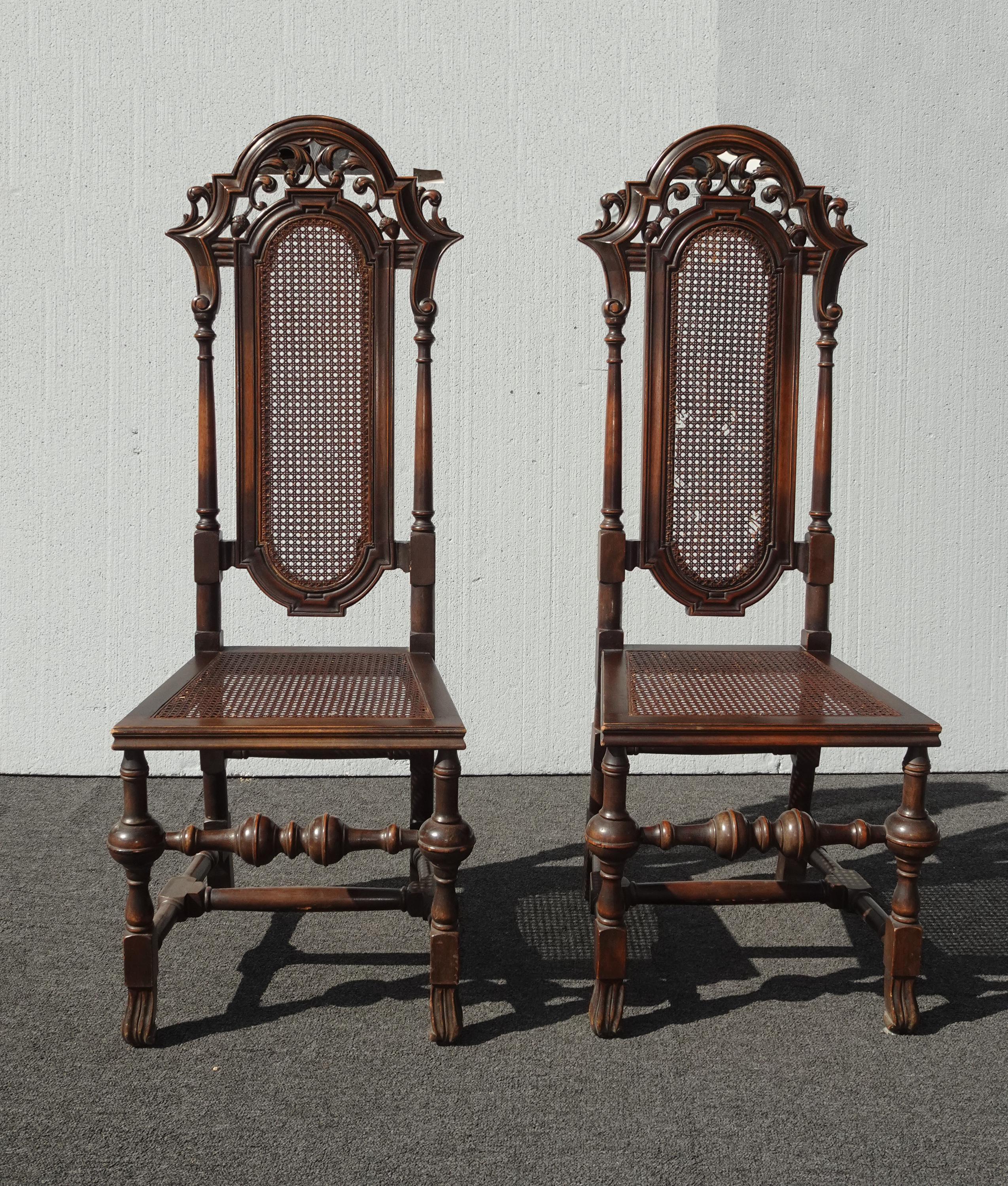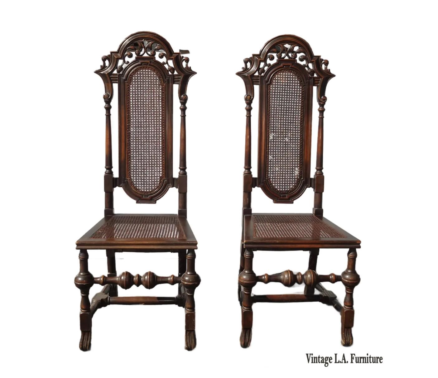 Pair Vintage Ornate Spanish Style Tallback Brown Cane Side Chairs French Style