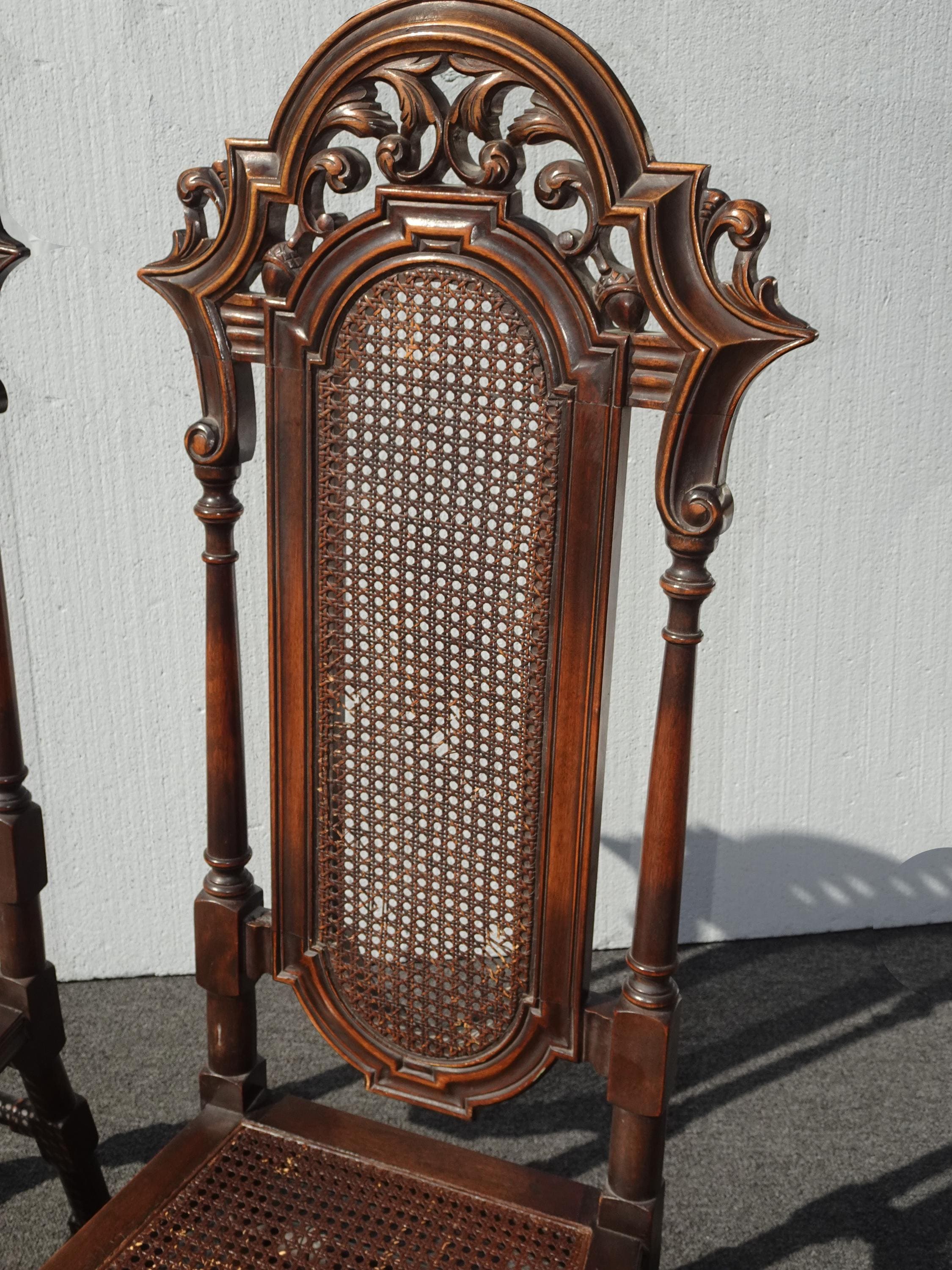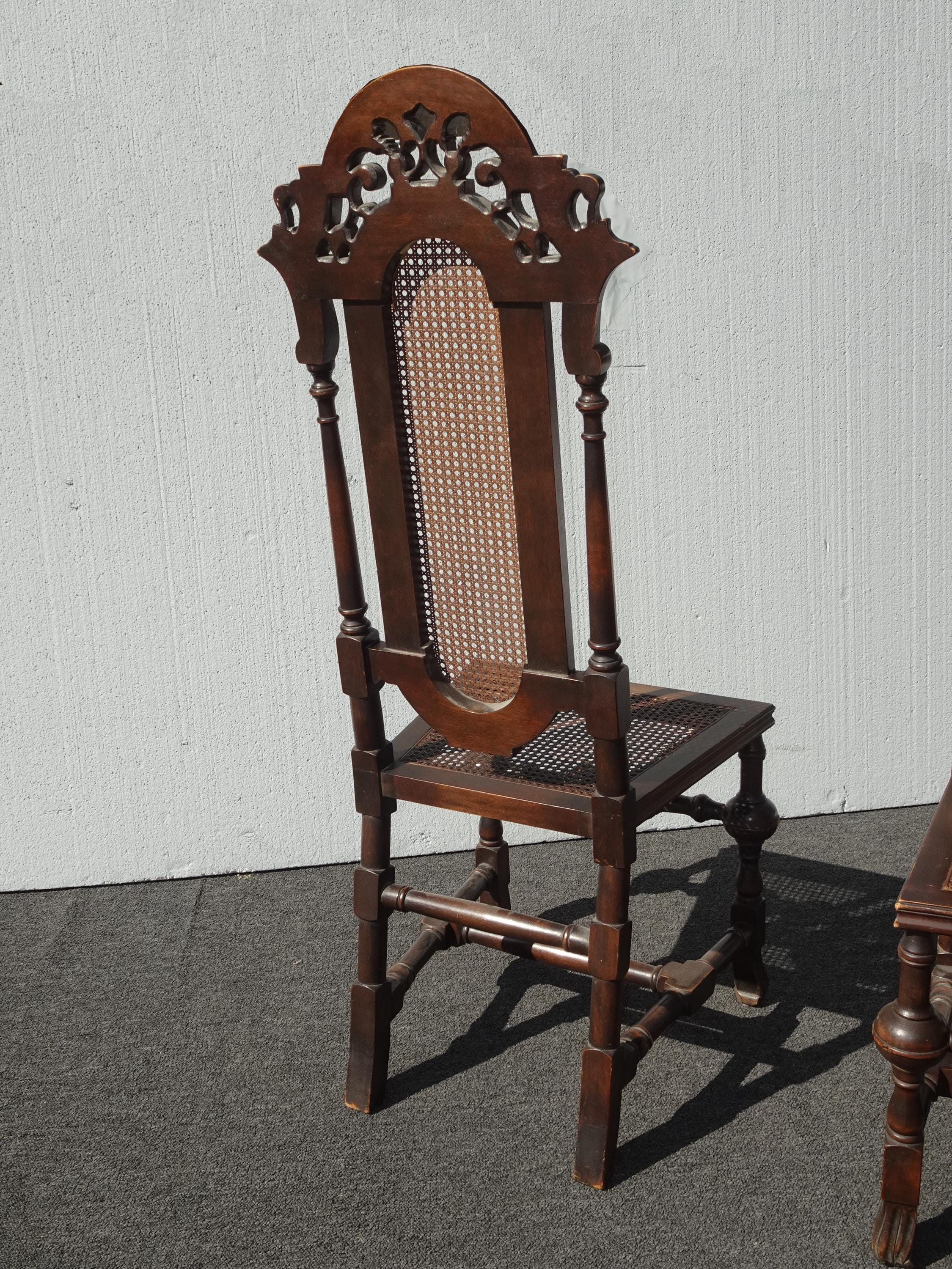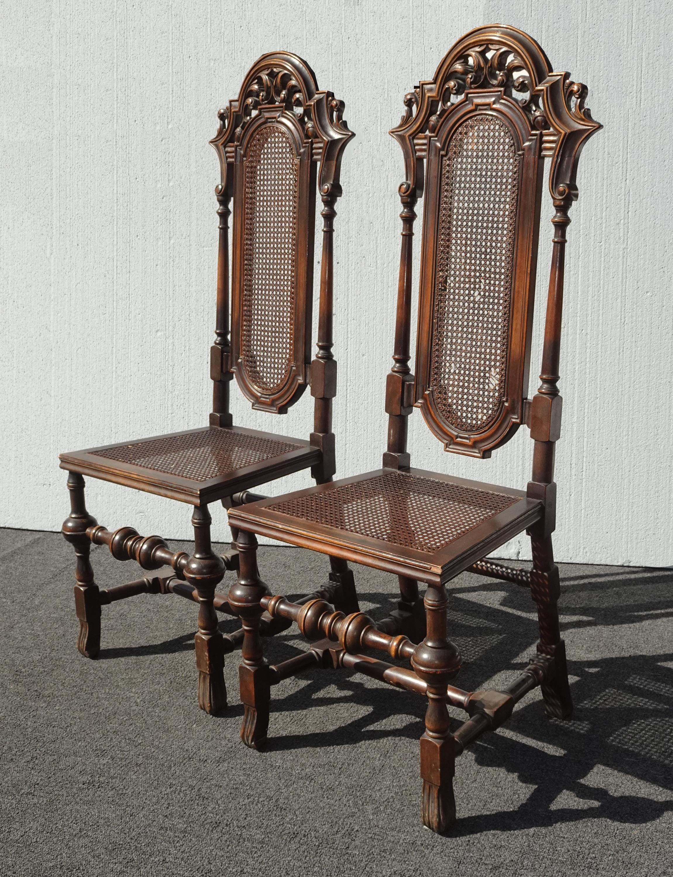 Pair Vintage Ornate Spanish Style Tallback Brown Cane Side Chairs French Style