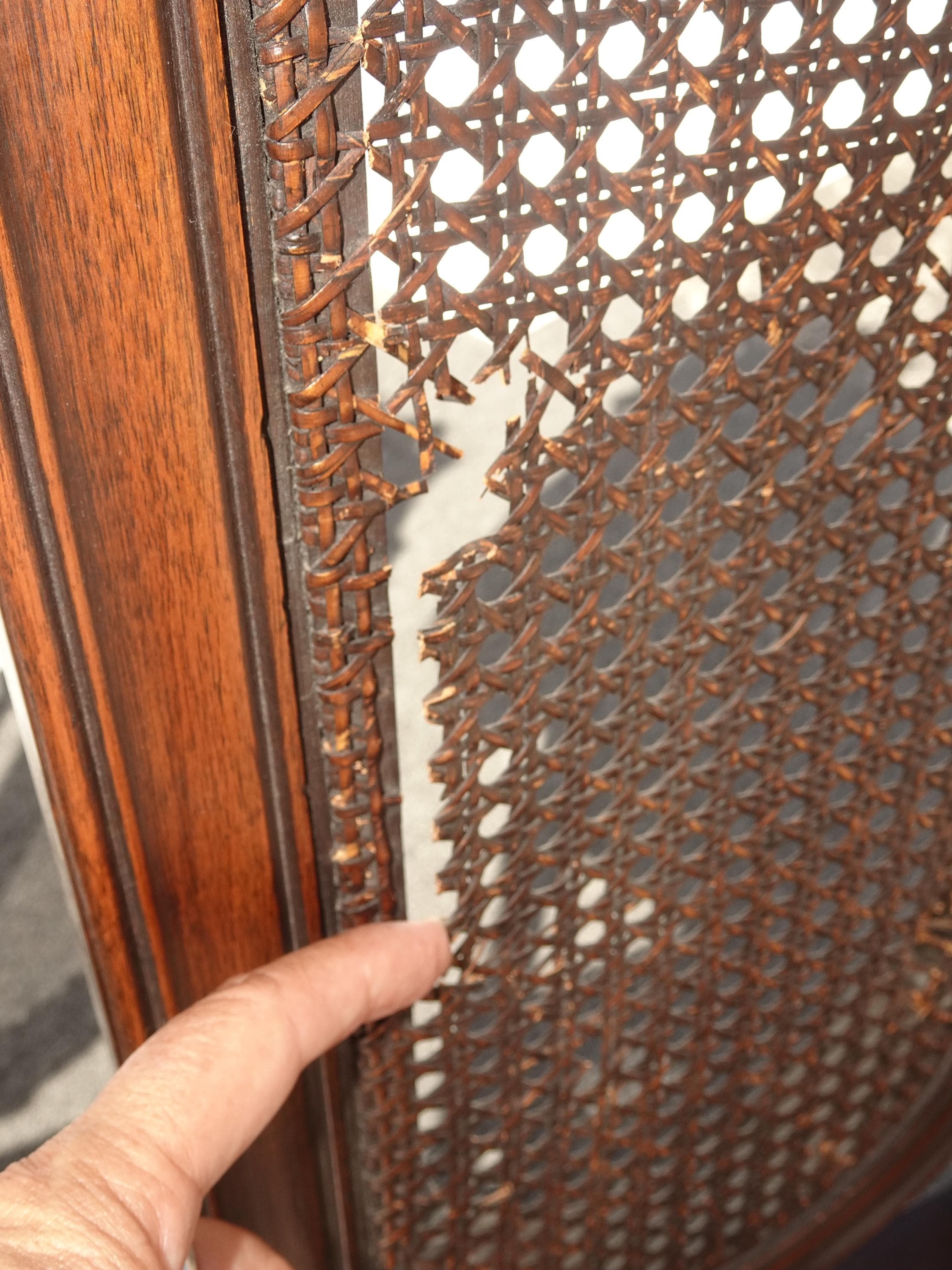 The backrest of one chair has some small spots of broken cane plus a tear.