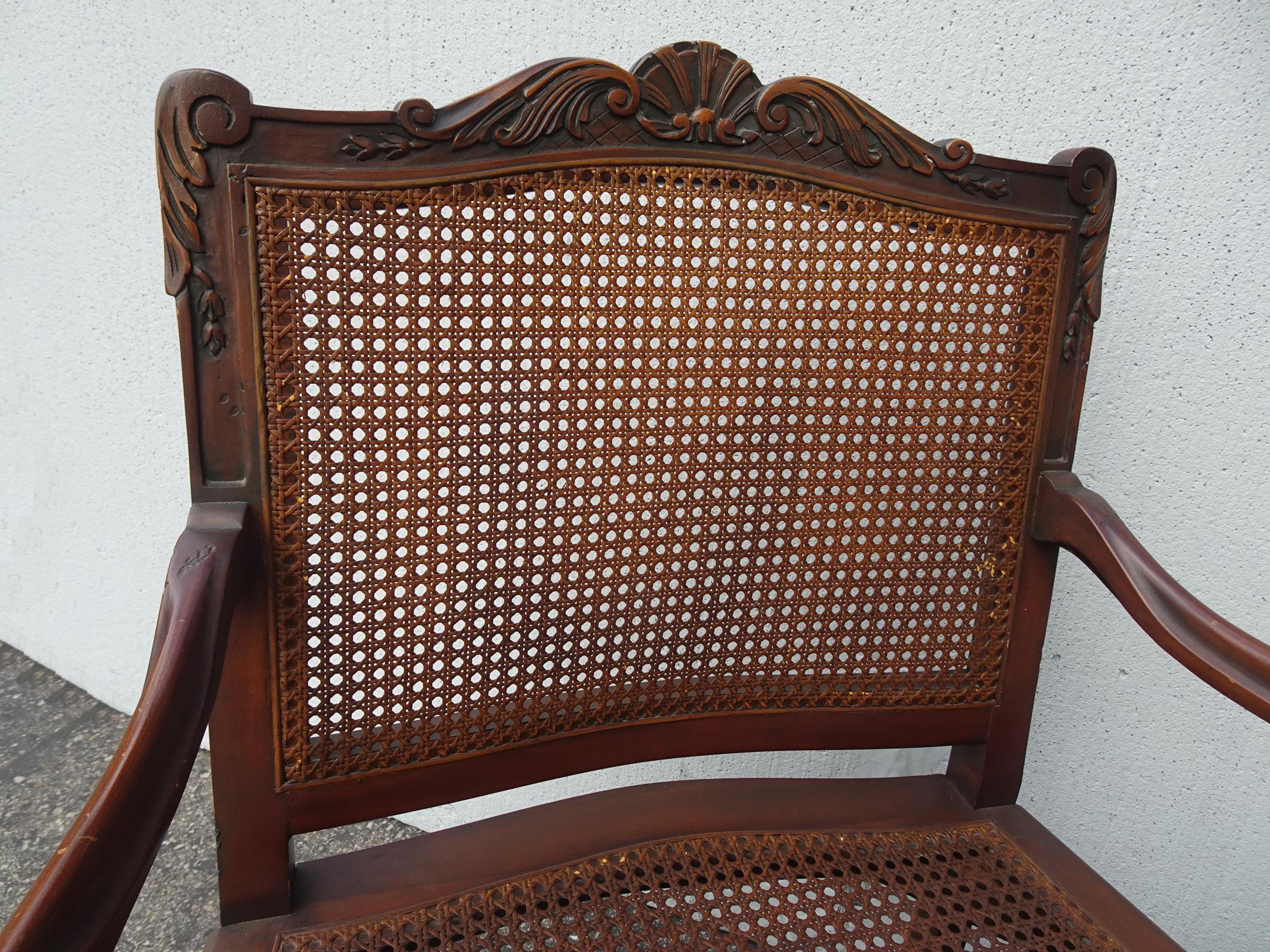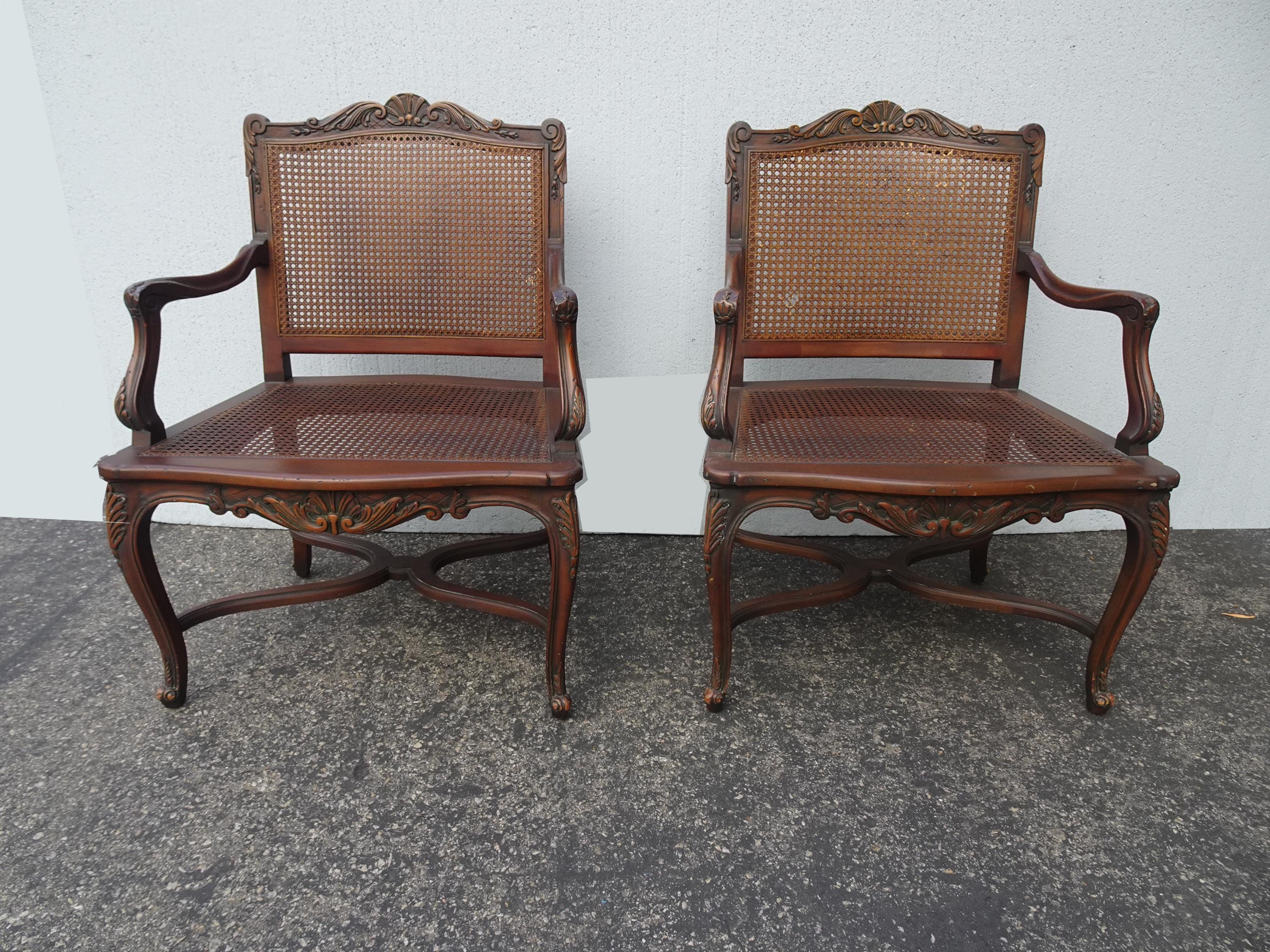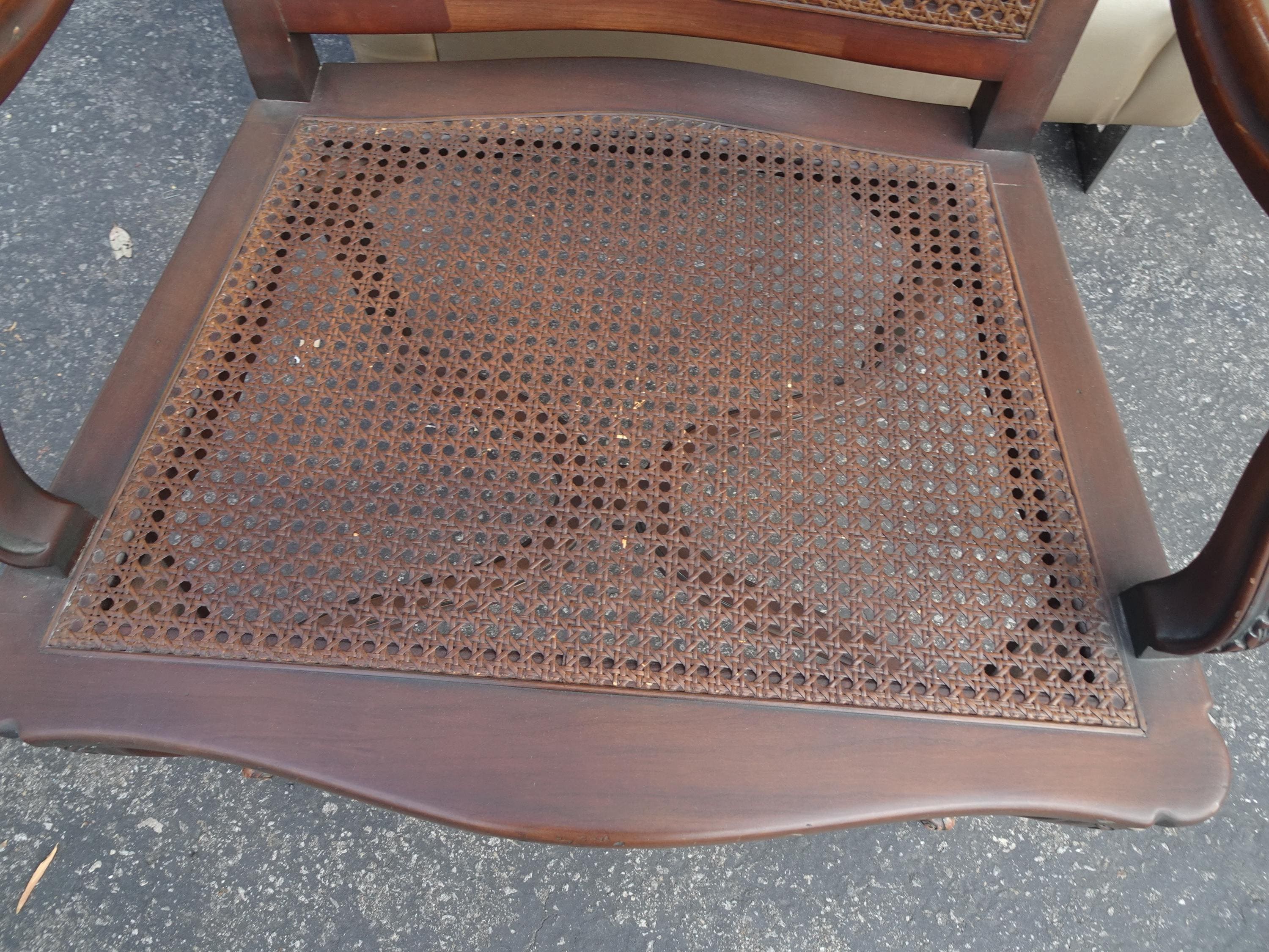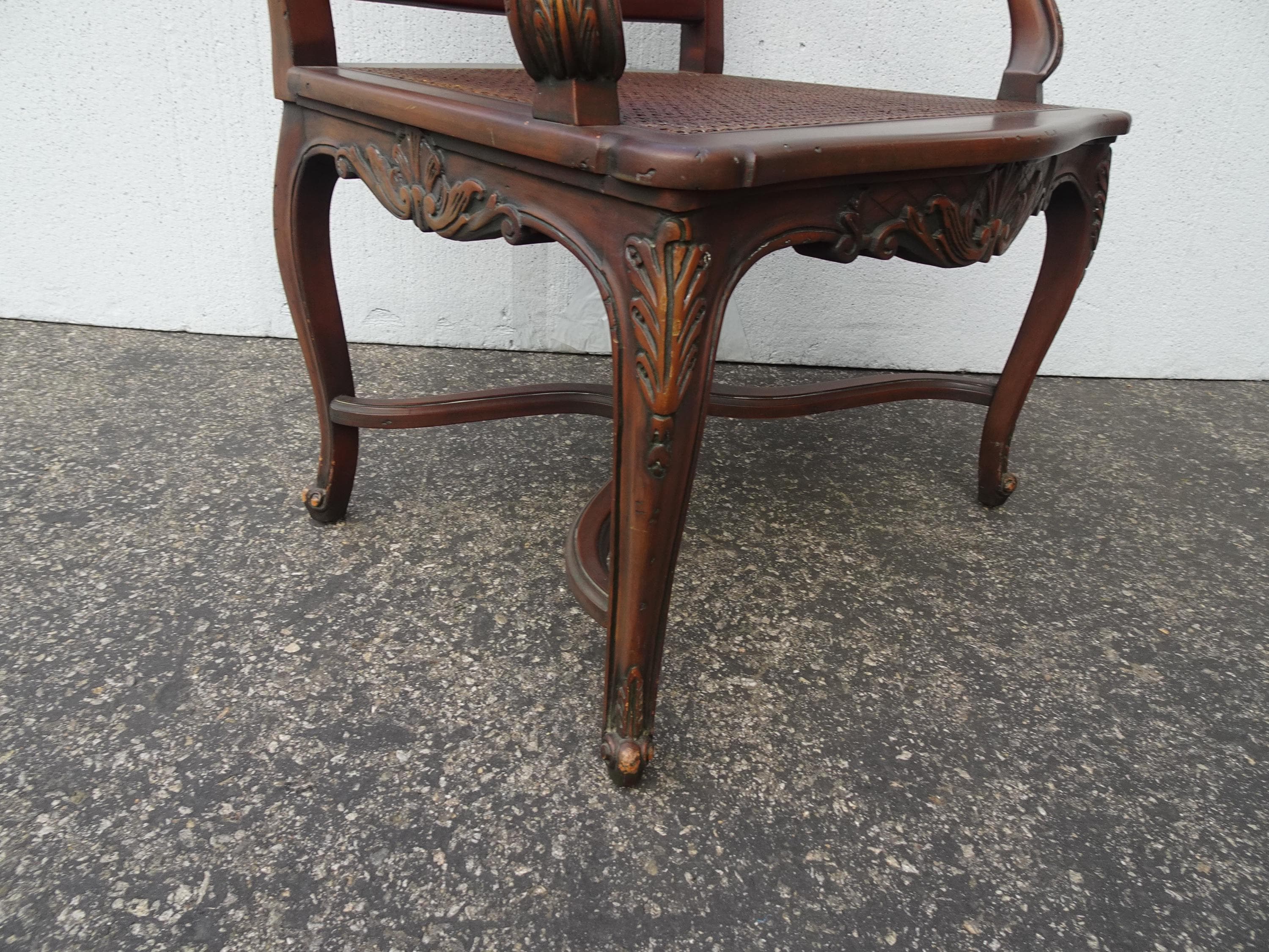 Pair French Provincial Louis XVI Style Cane Back Armchairs Chairs w Stretcher
