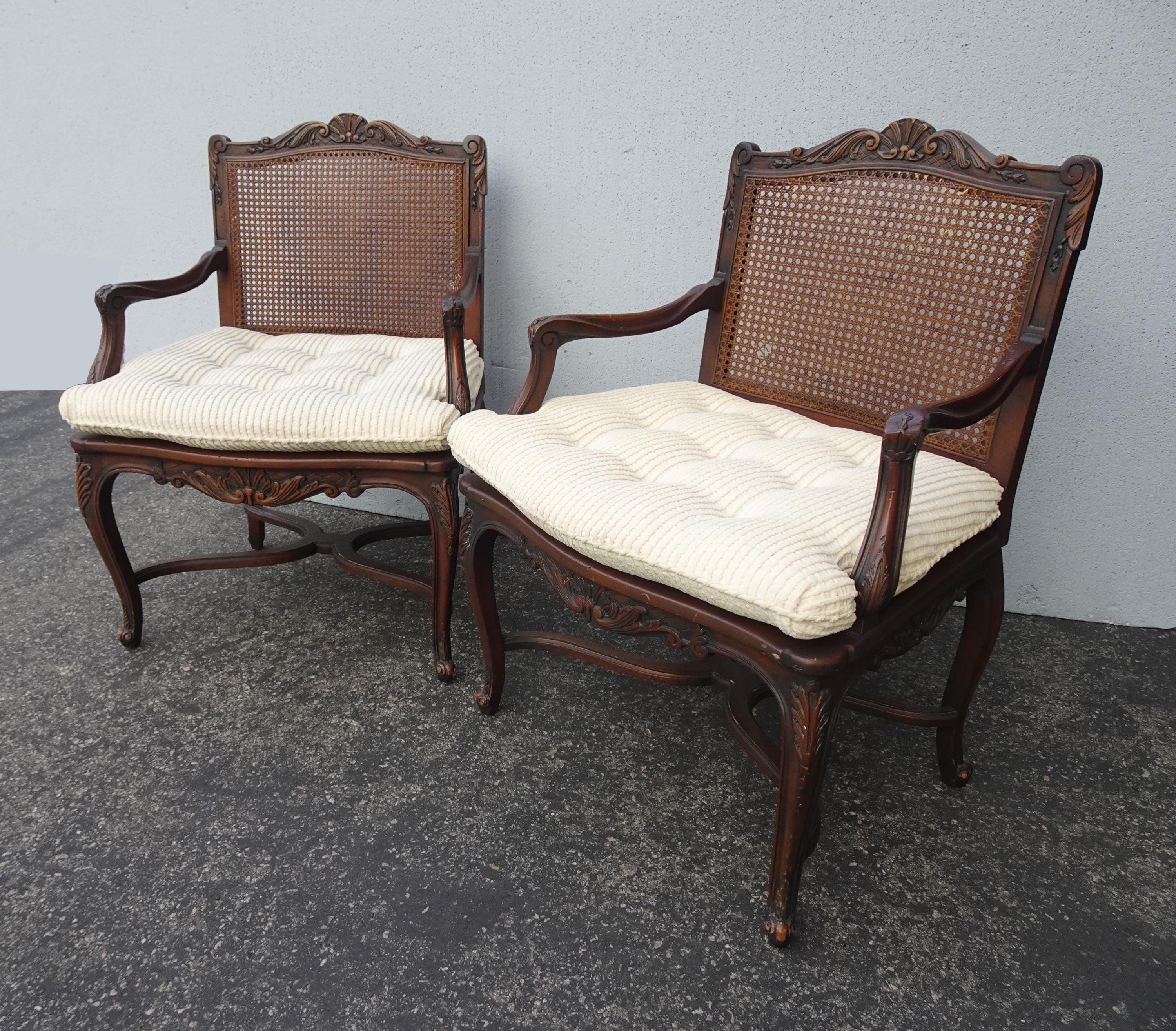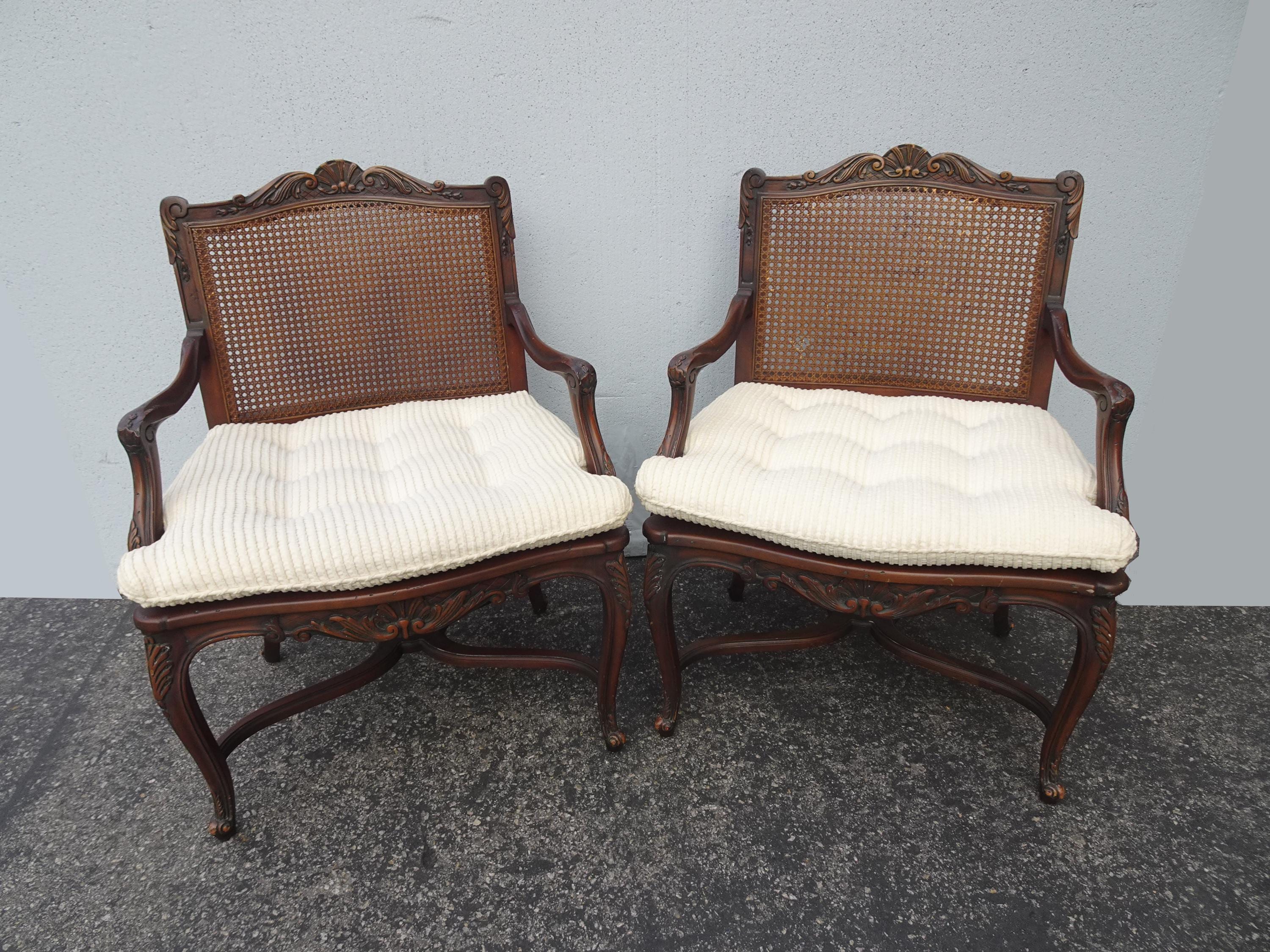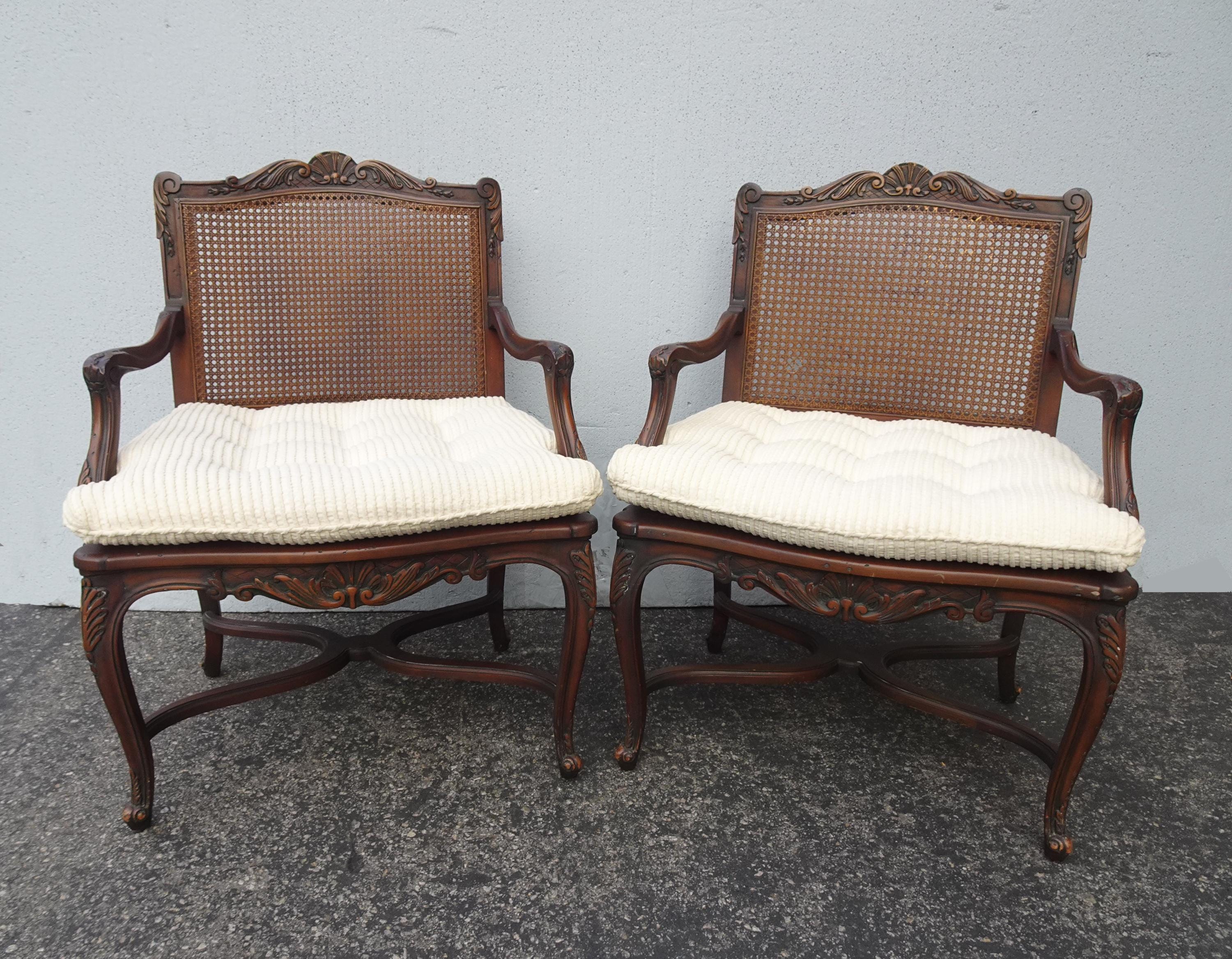 Pair French Provincial Louis XVI Cane Armchairs Chairs White Cushion & Stretcher