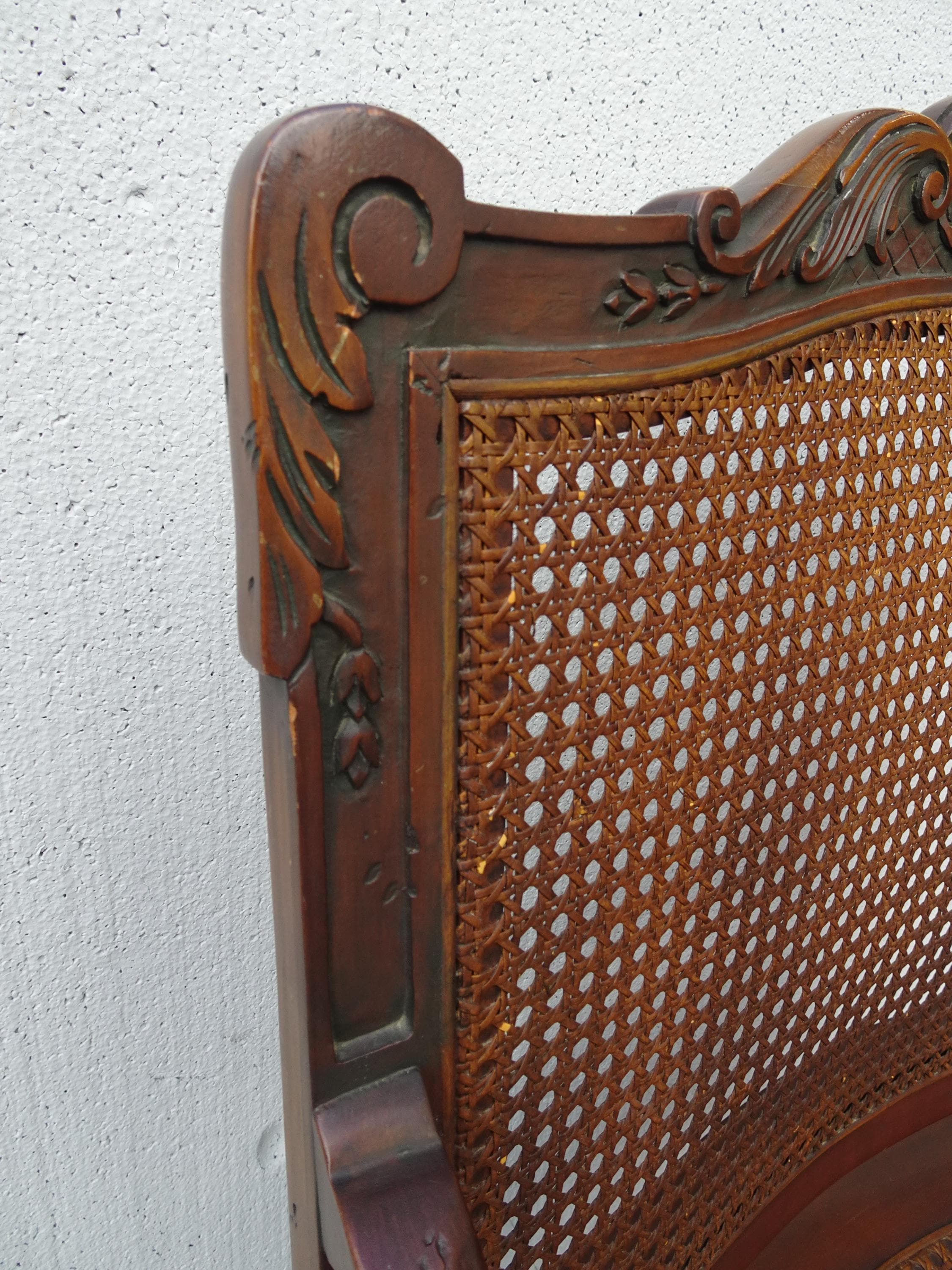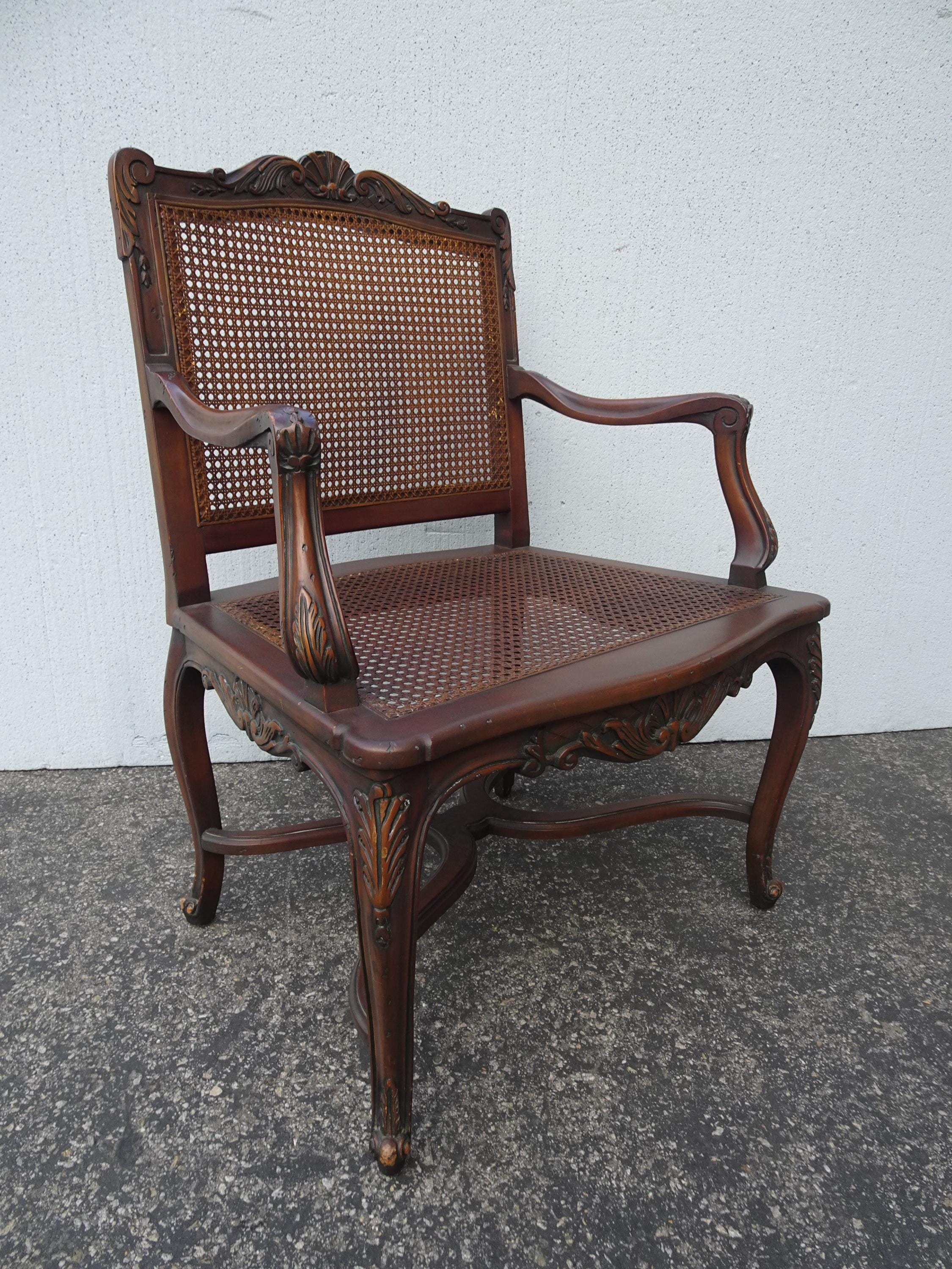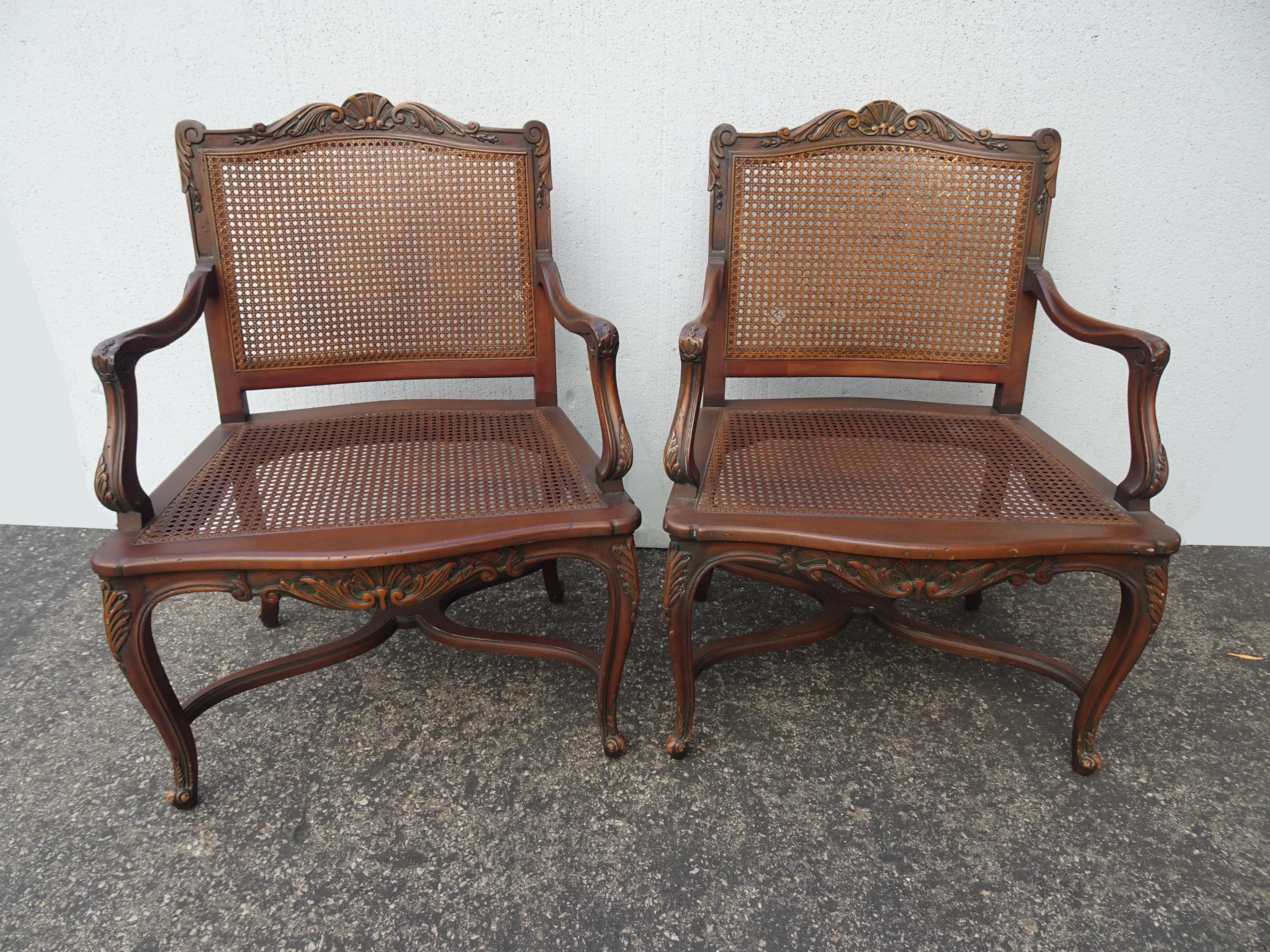 Pair French Provincial Louis XVI Cane Armchairs Chairs White Cushion & Stretcher