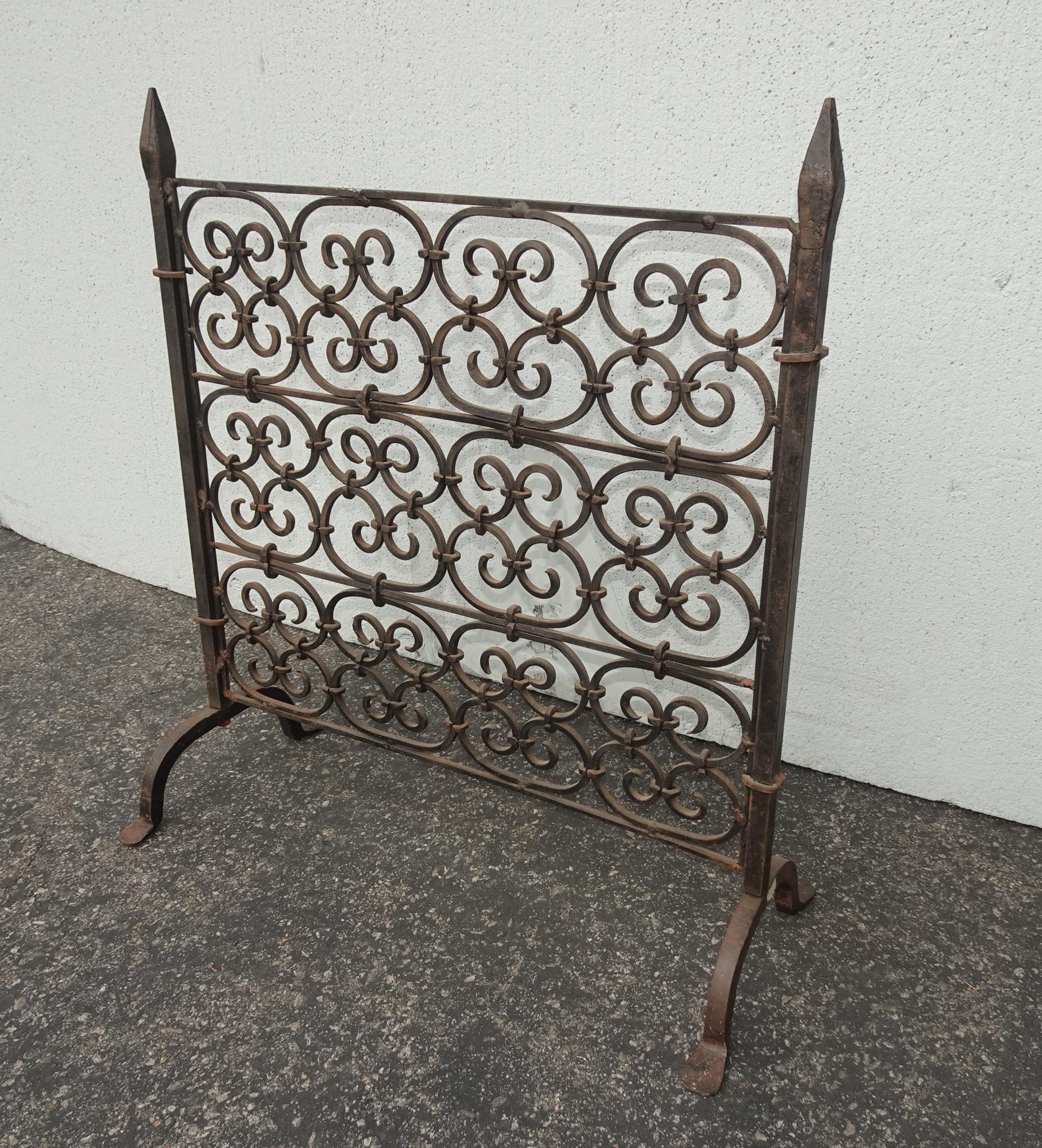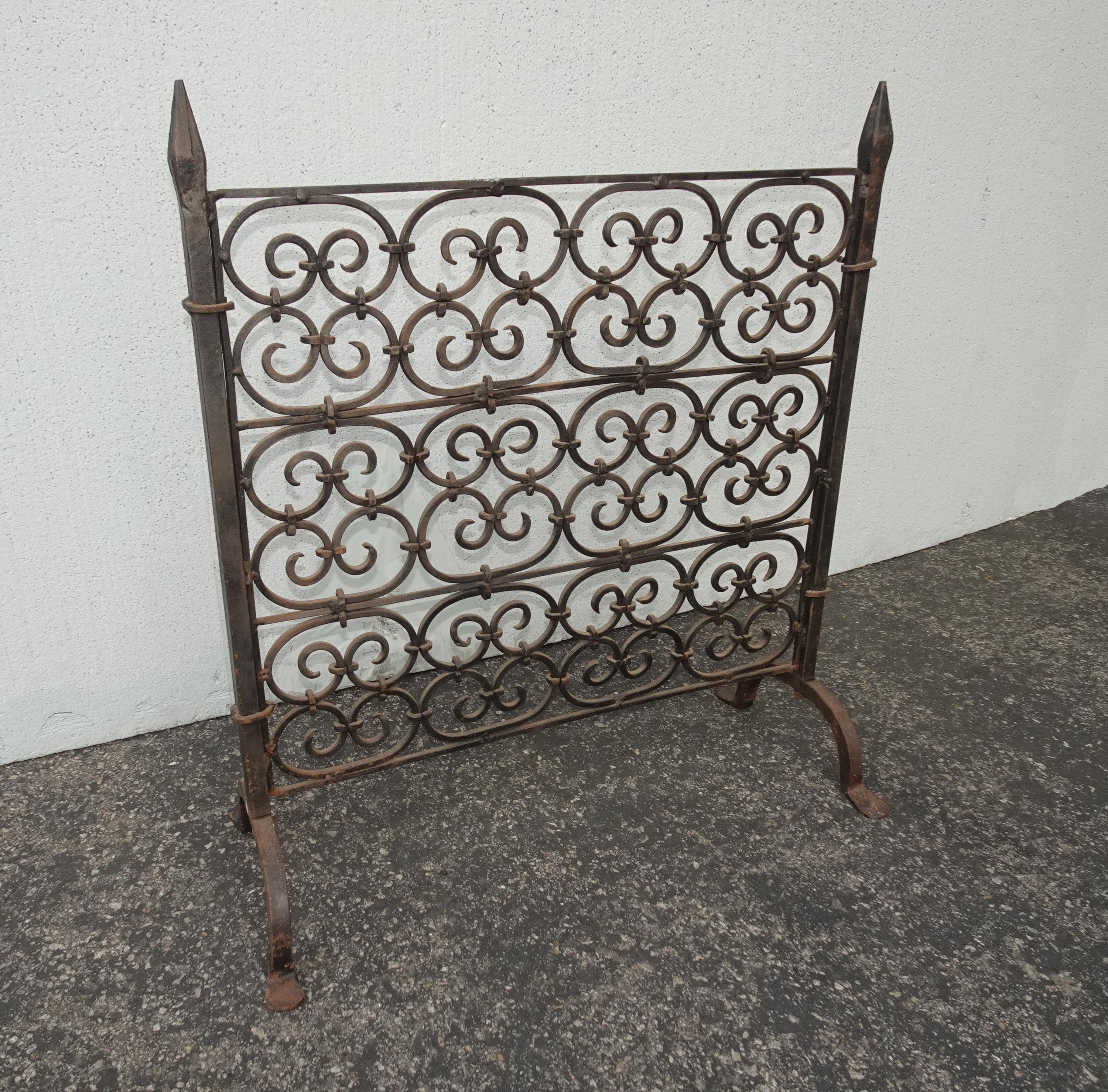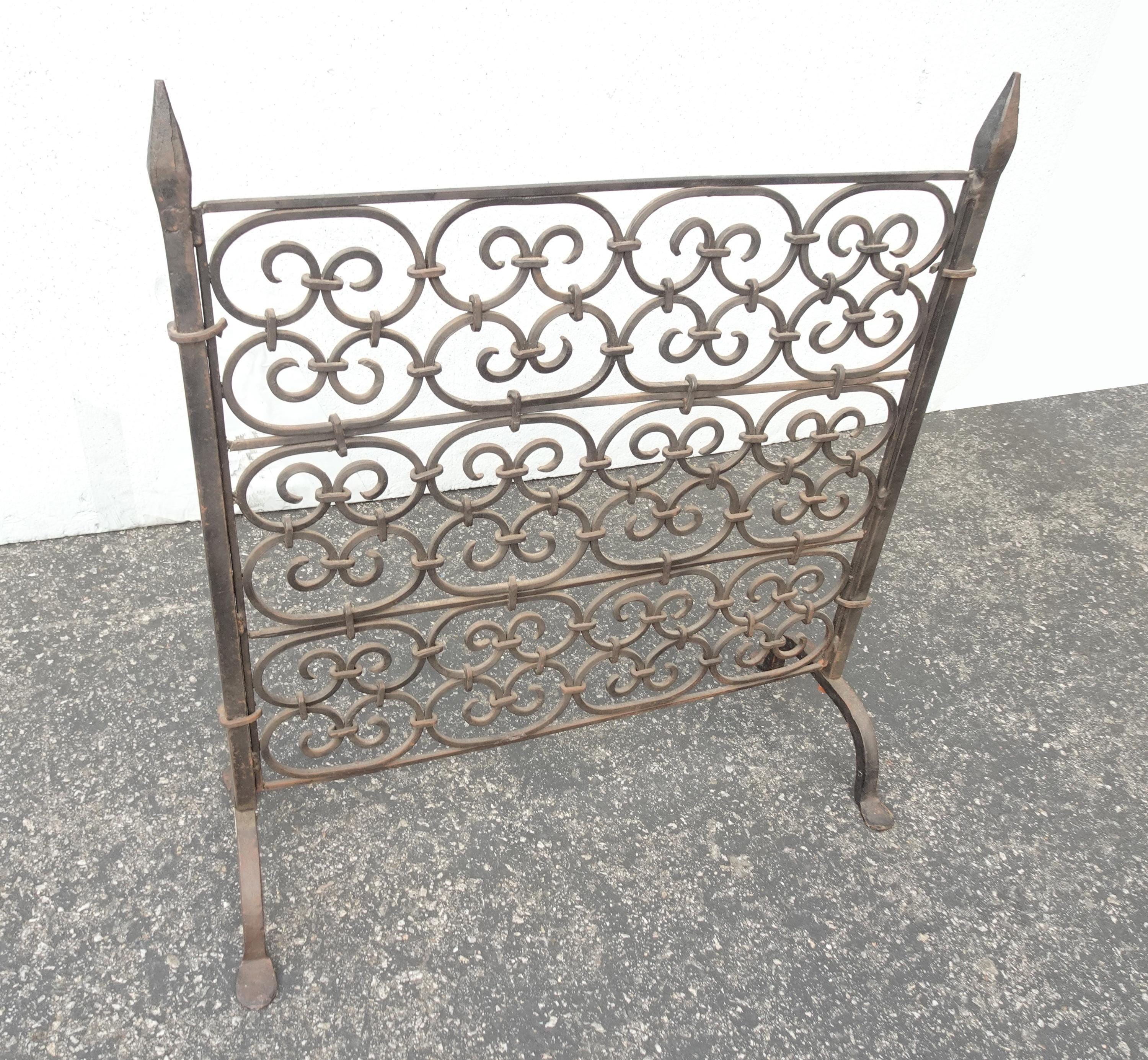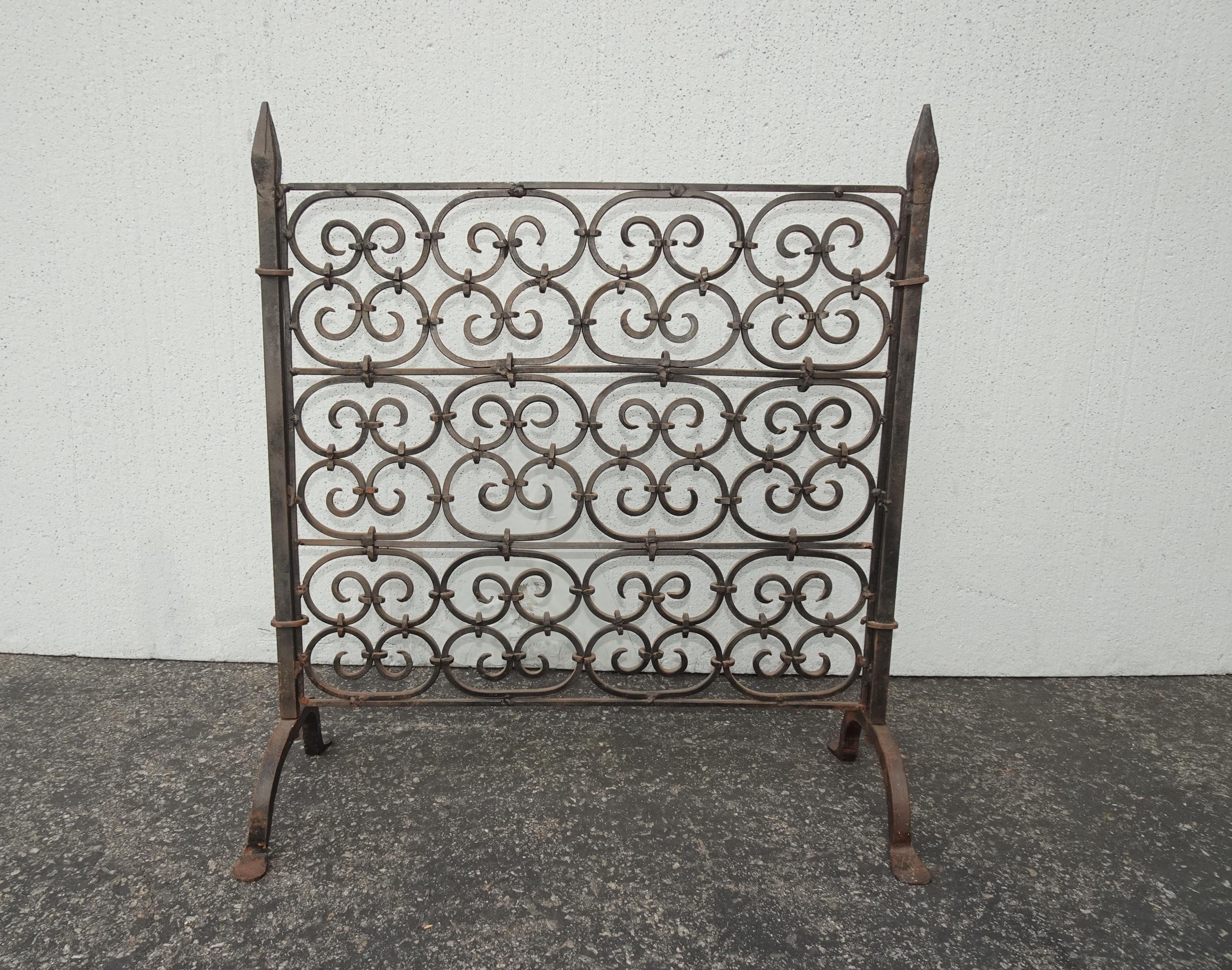 Vintage French Country Black Wrought Iron Fireplace Screen w Spear Tip Finials