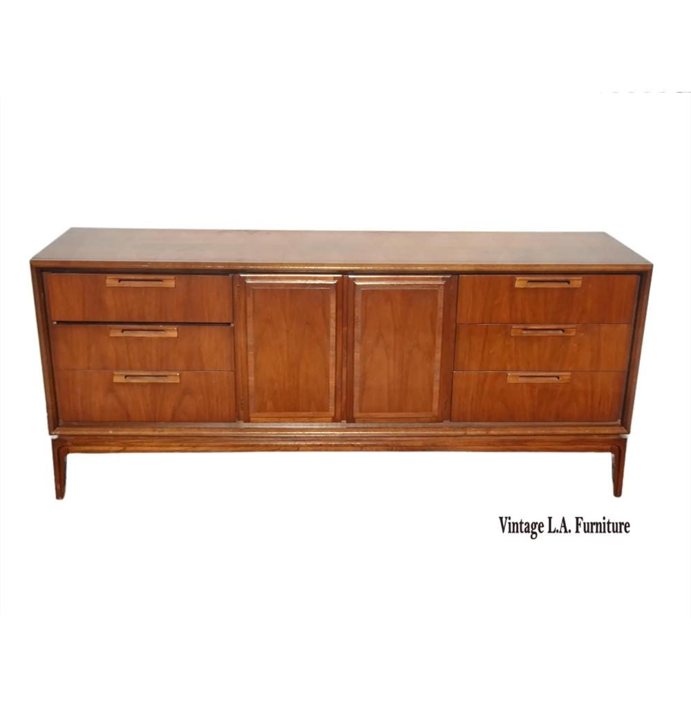 Vintage Mid Century Modern Brown Double Door 9 Drawer Dresser / Credenza