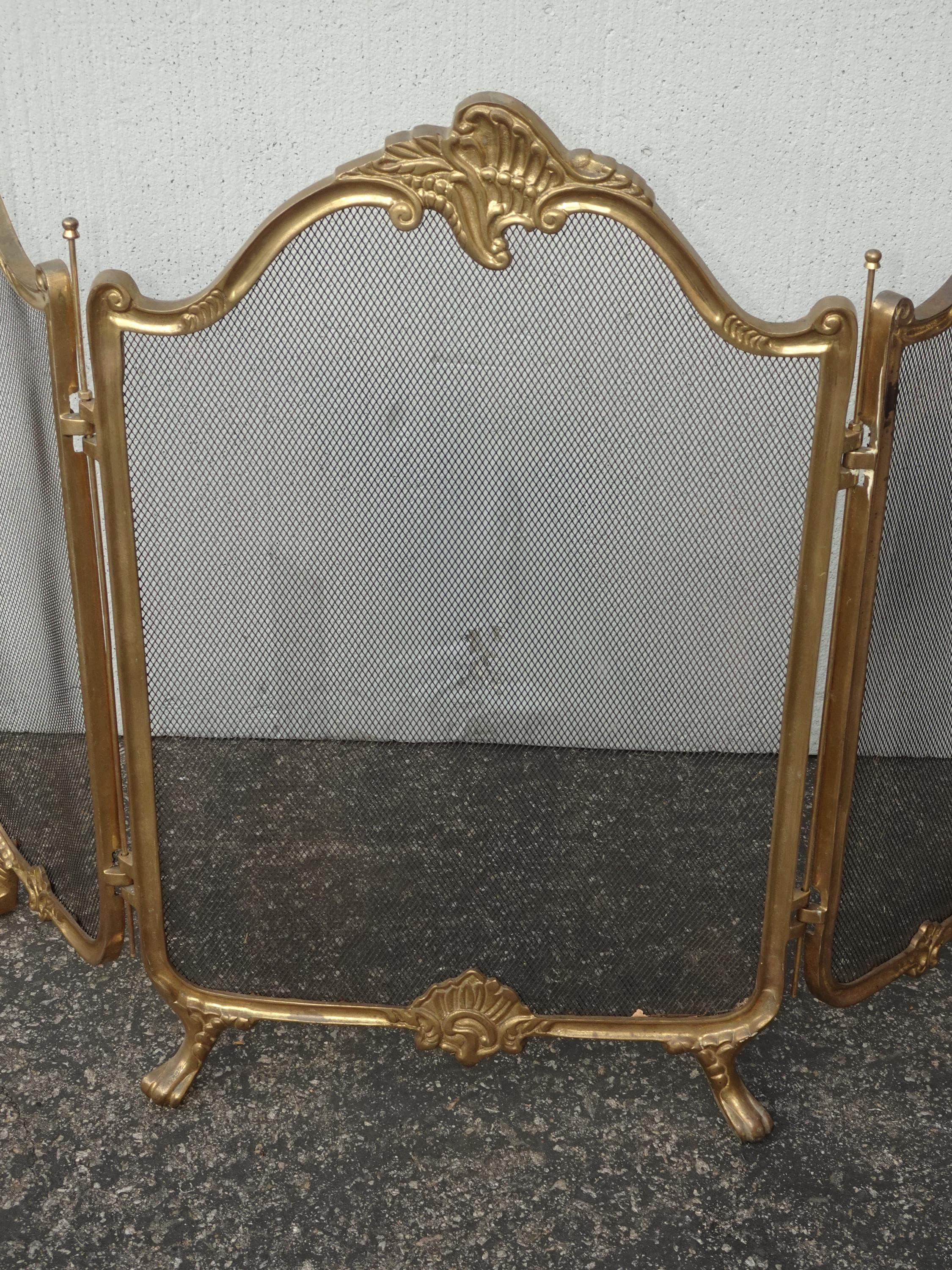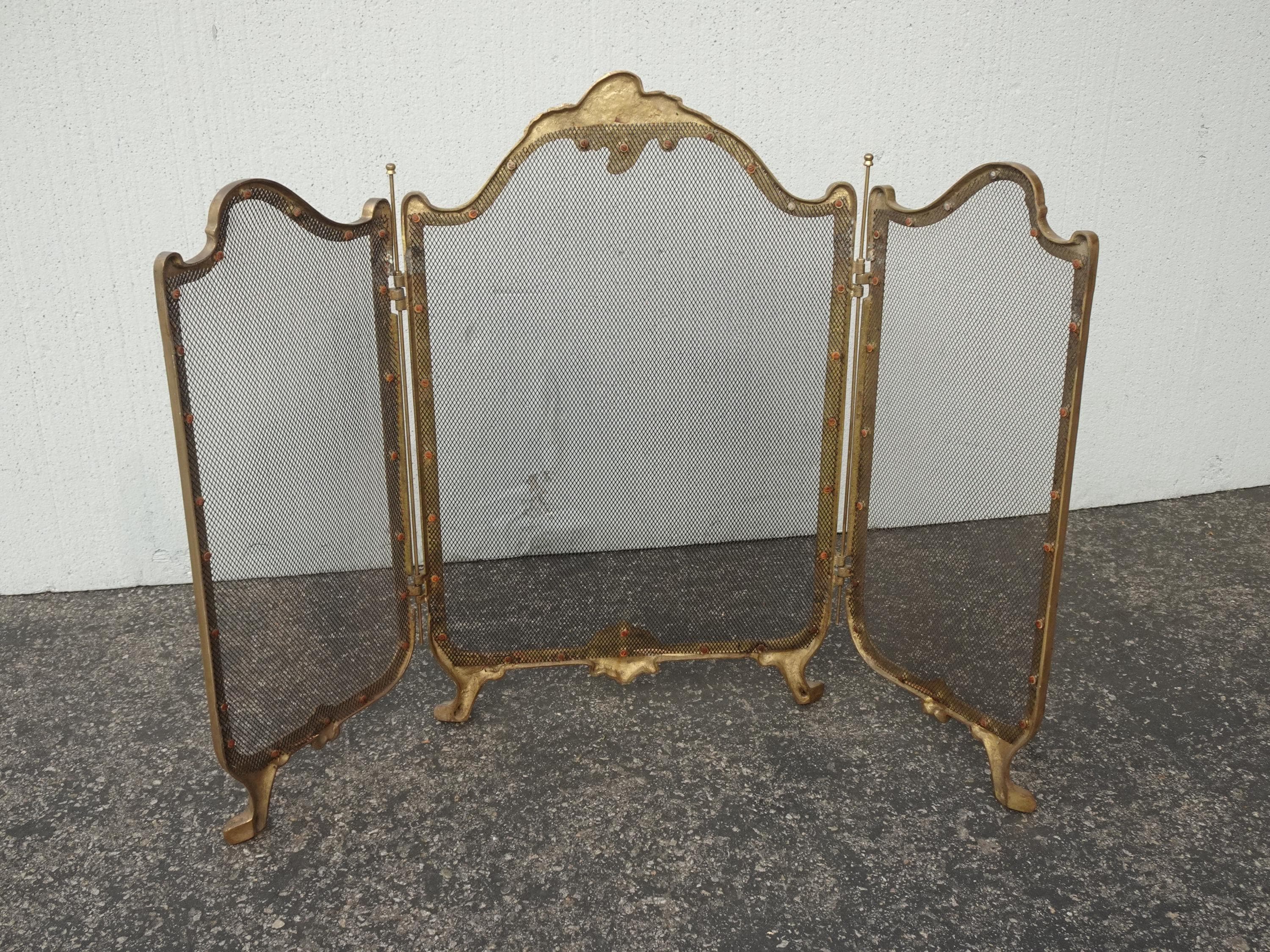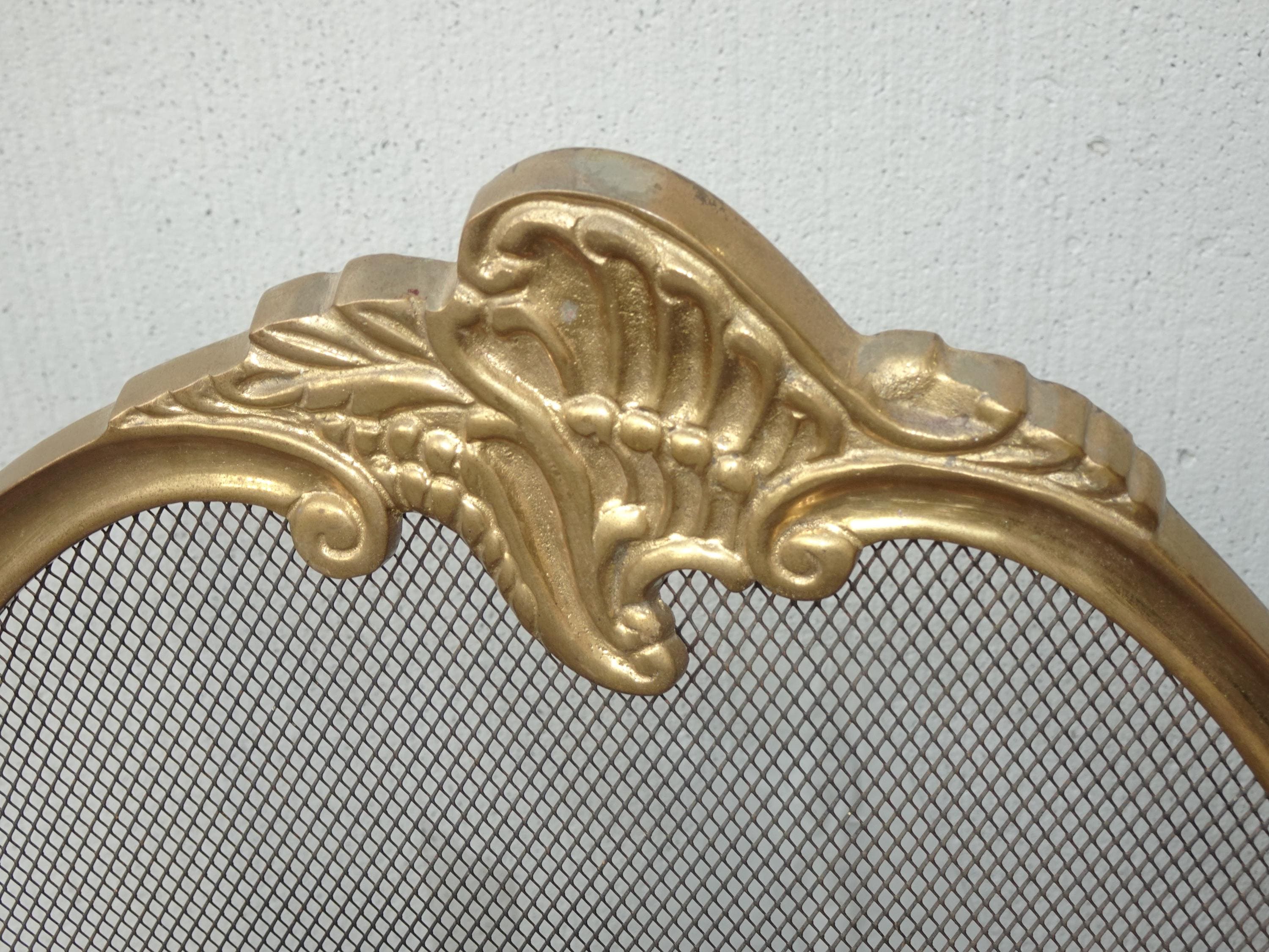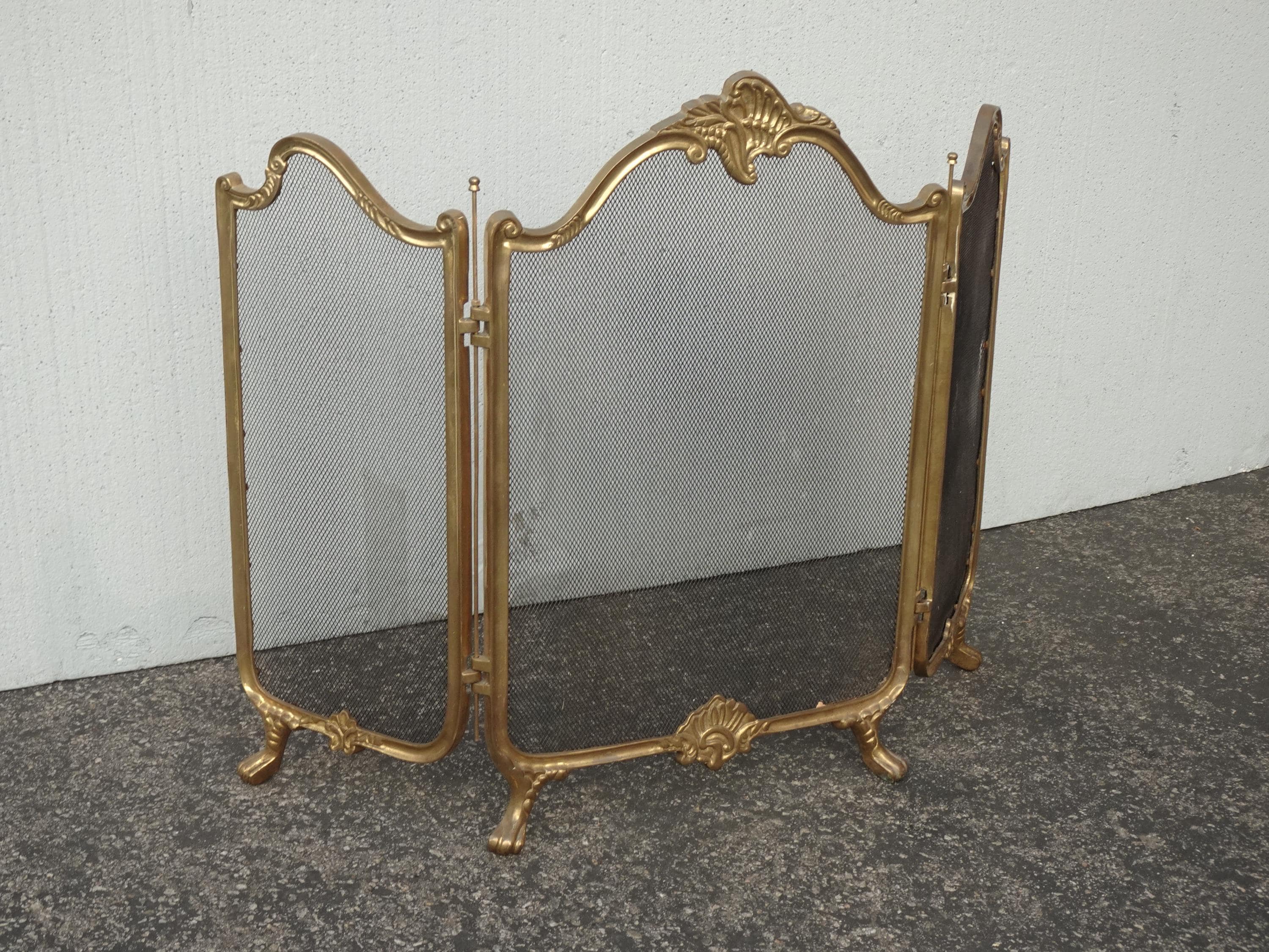 Vintage French Provincial Gold Brass Three Panel Fireplace Screen