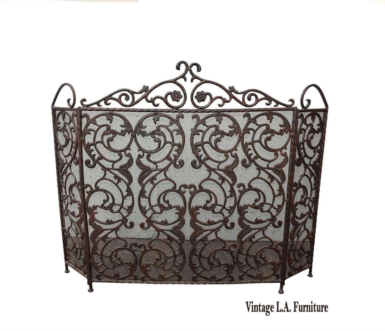 Vintage French Provincial Brown Scrolled Cast Iron Three Panel Fireplace Screen