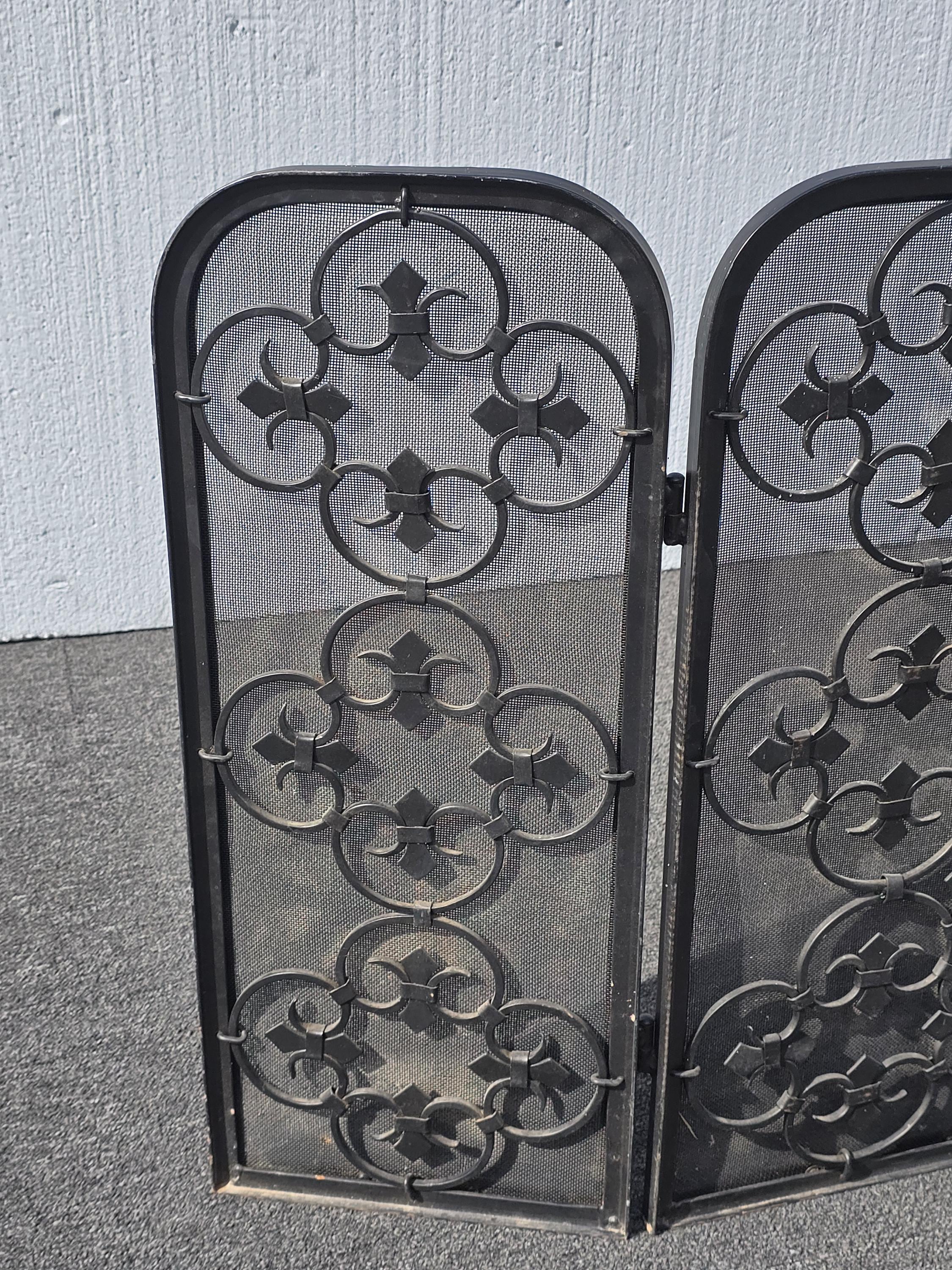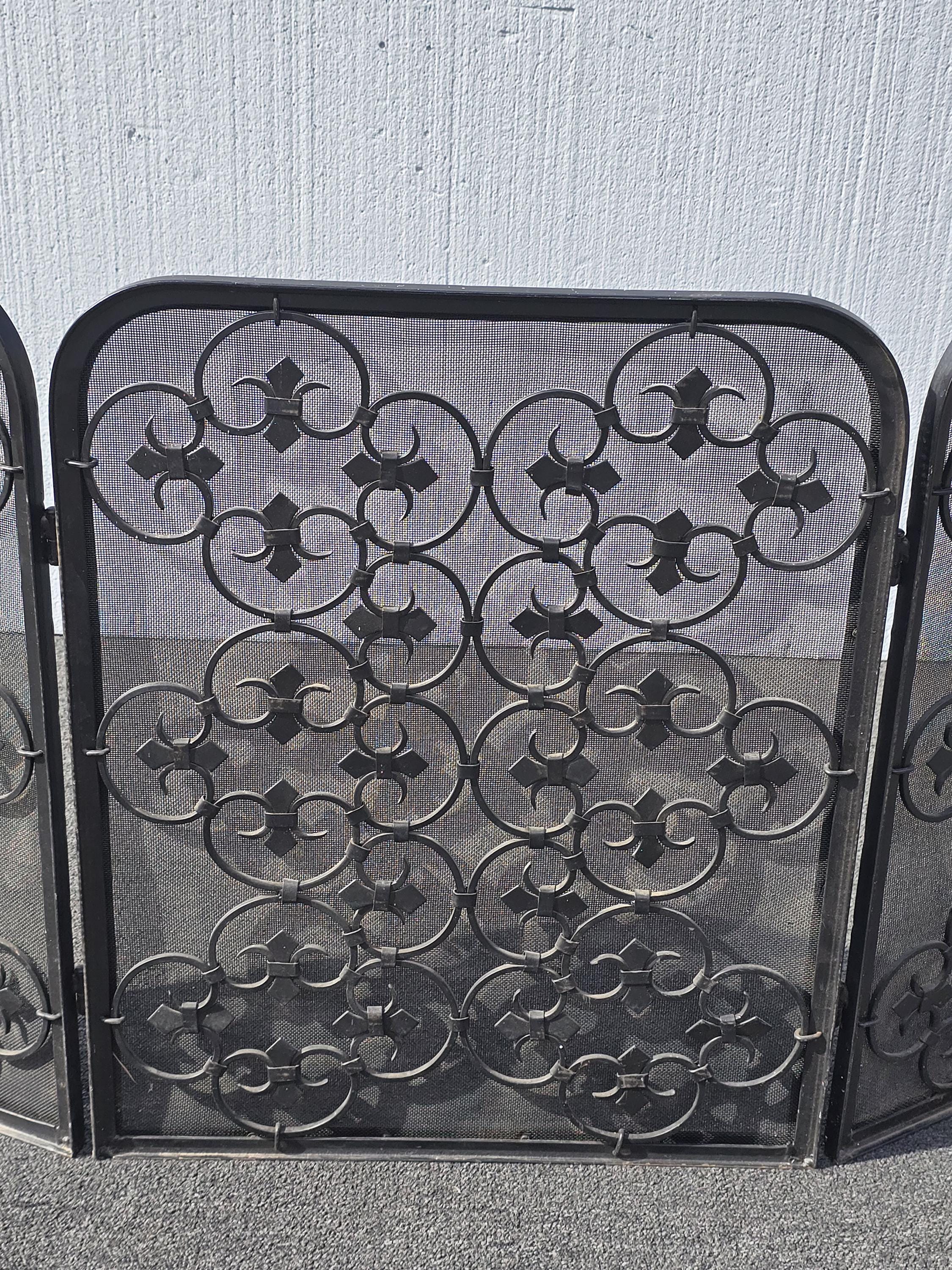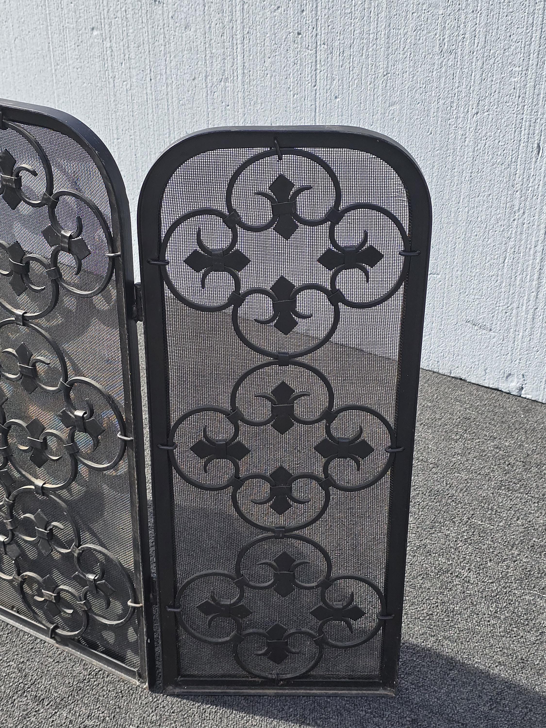 Vintage Three Panel Black Metal Fireplace Screen w Ornate Scrolls French Country