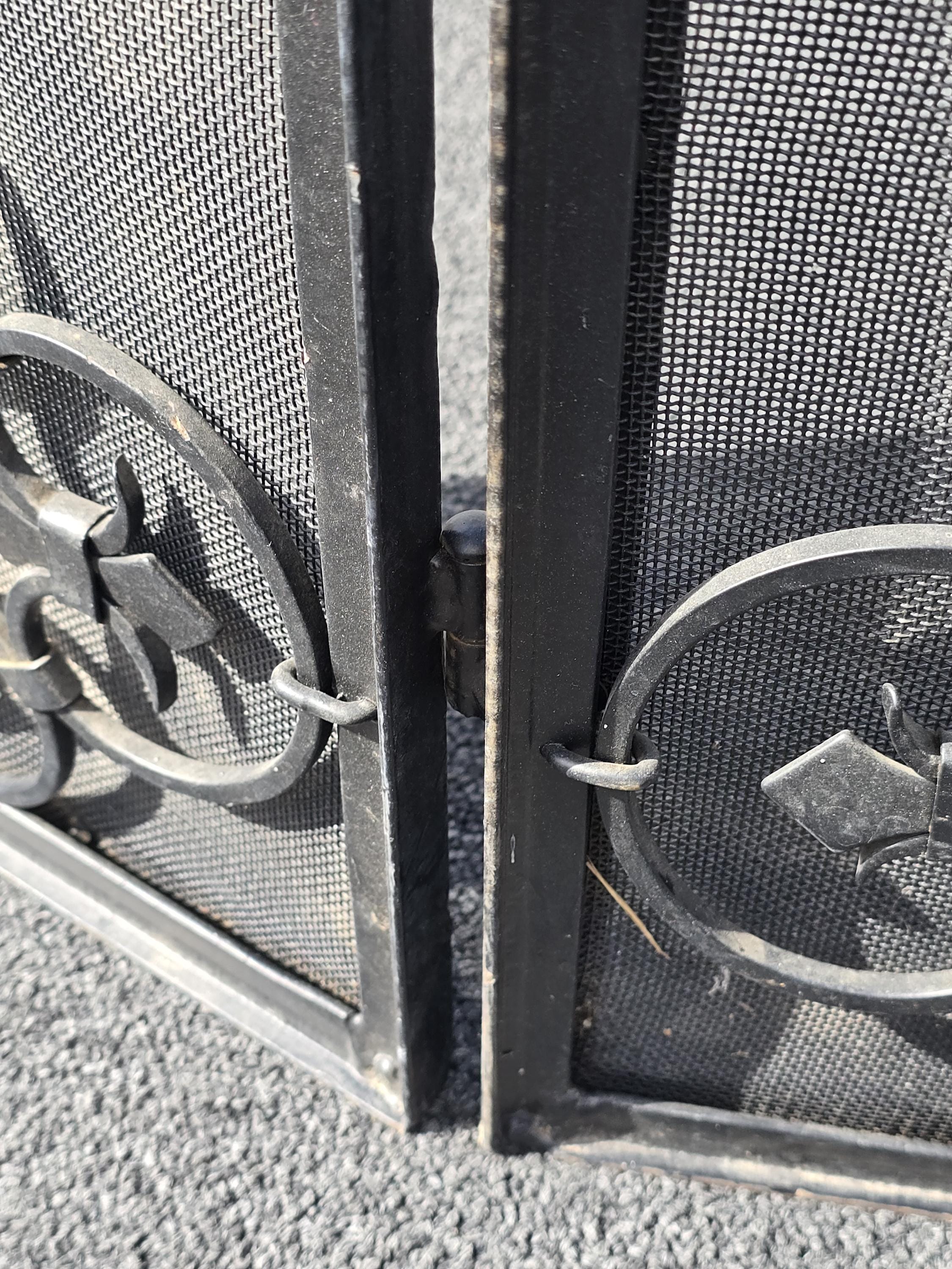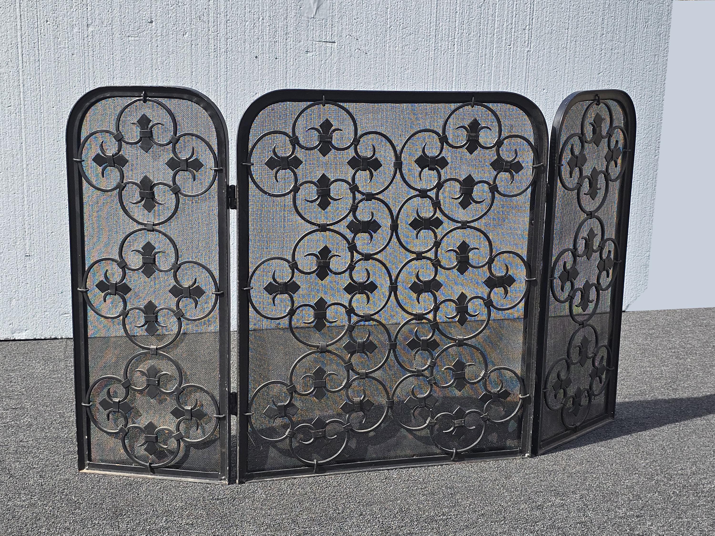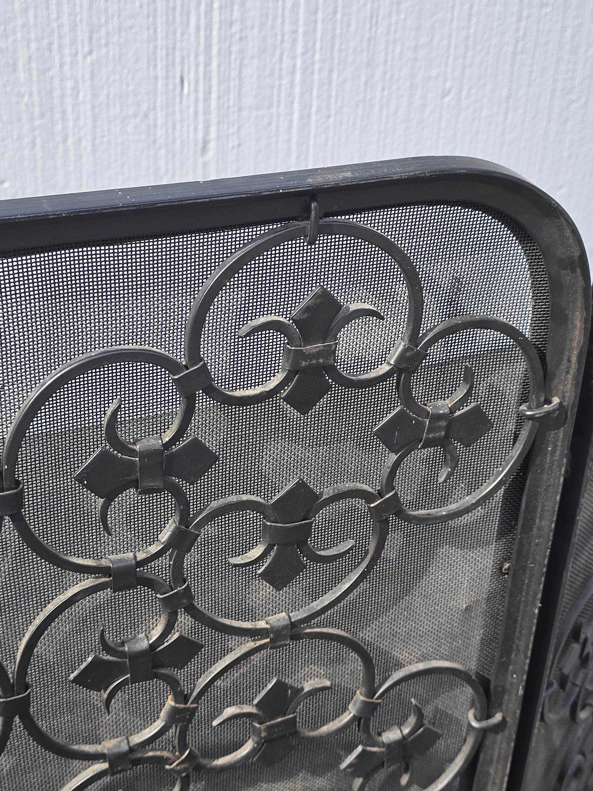 Vintage Three Panel Black Metal Fireplace Screen w Ornate Scrolls French Country