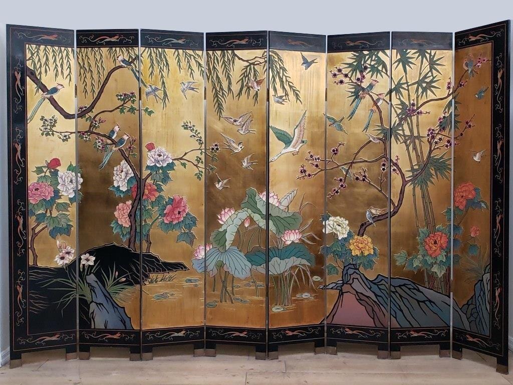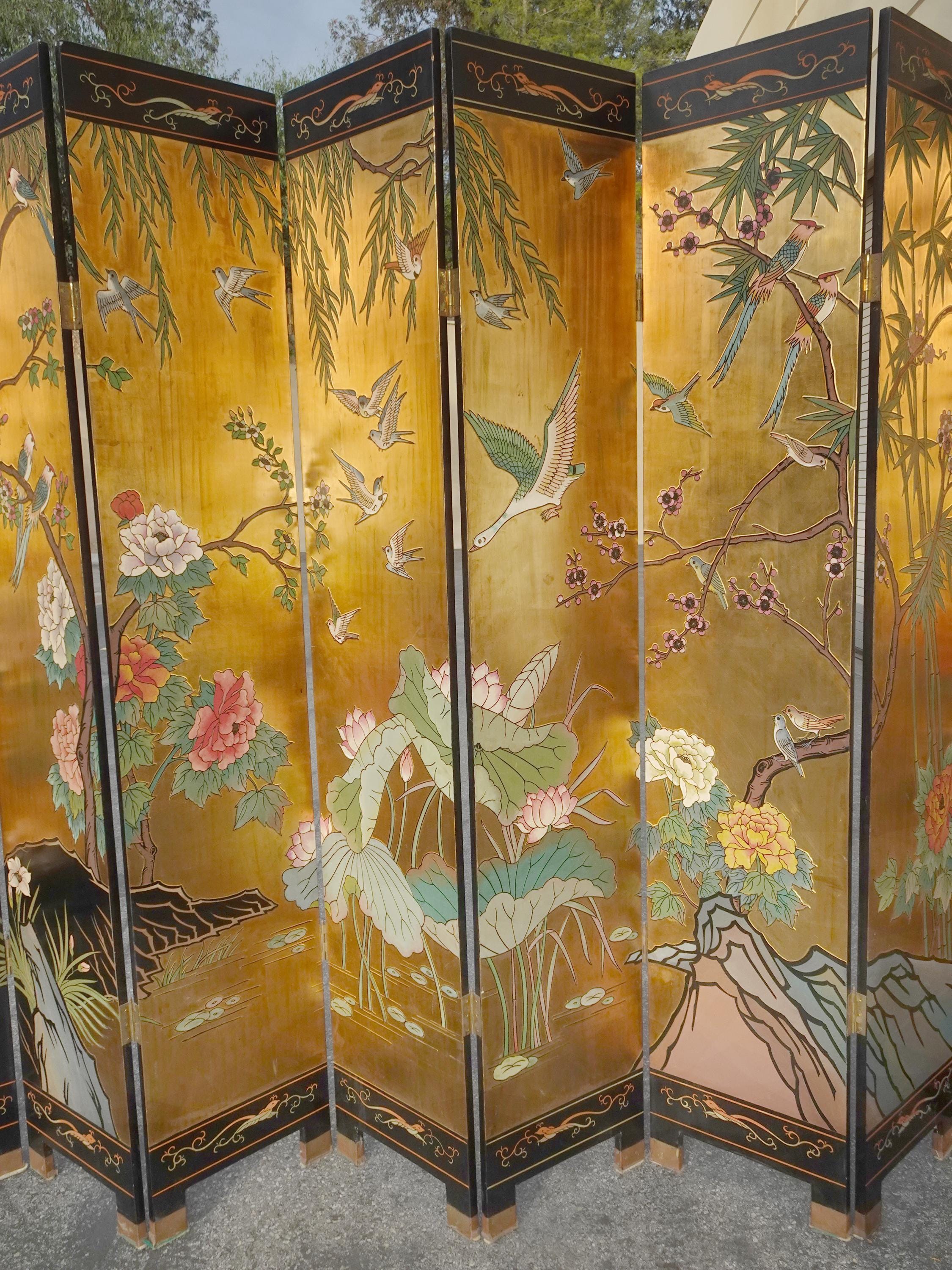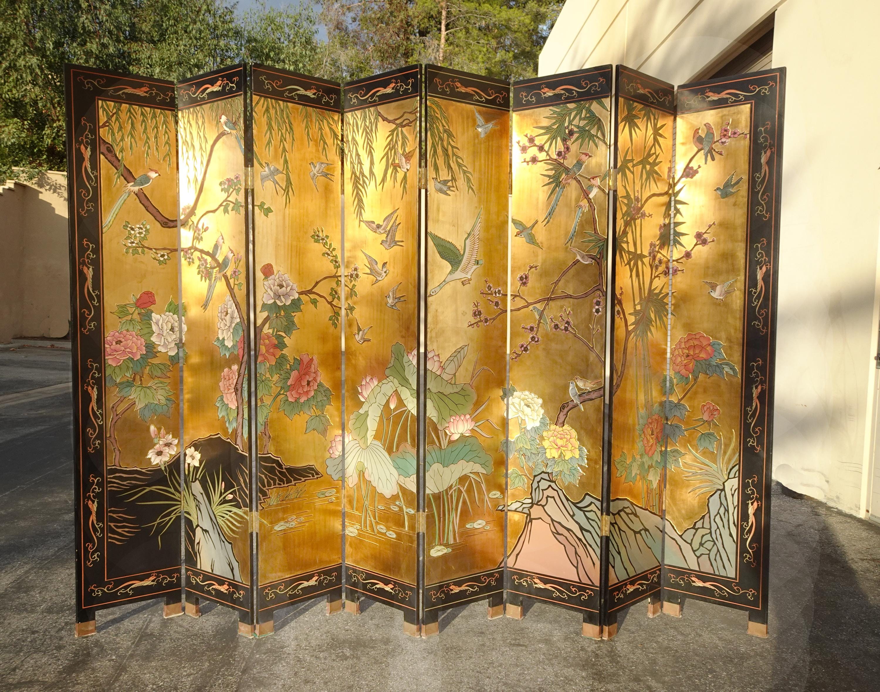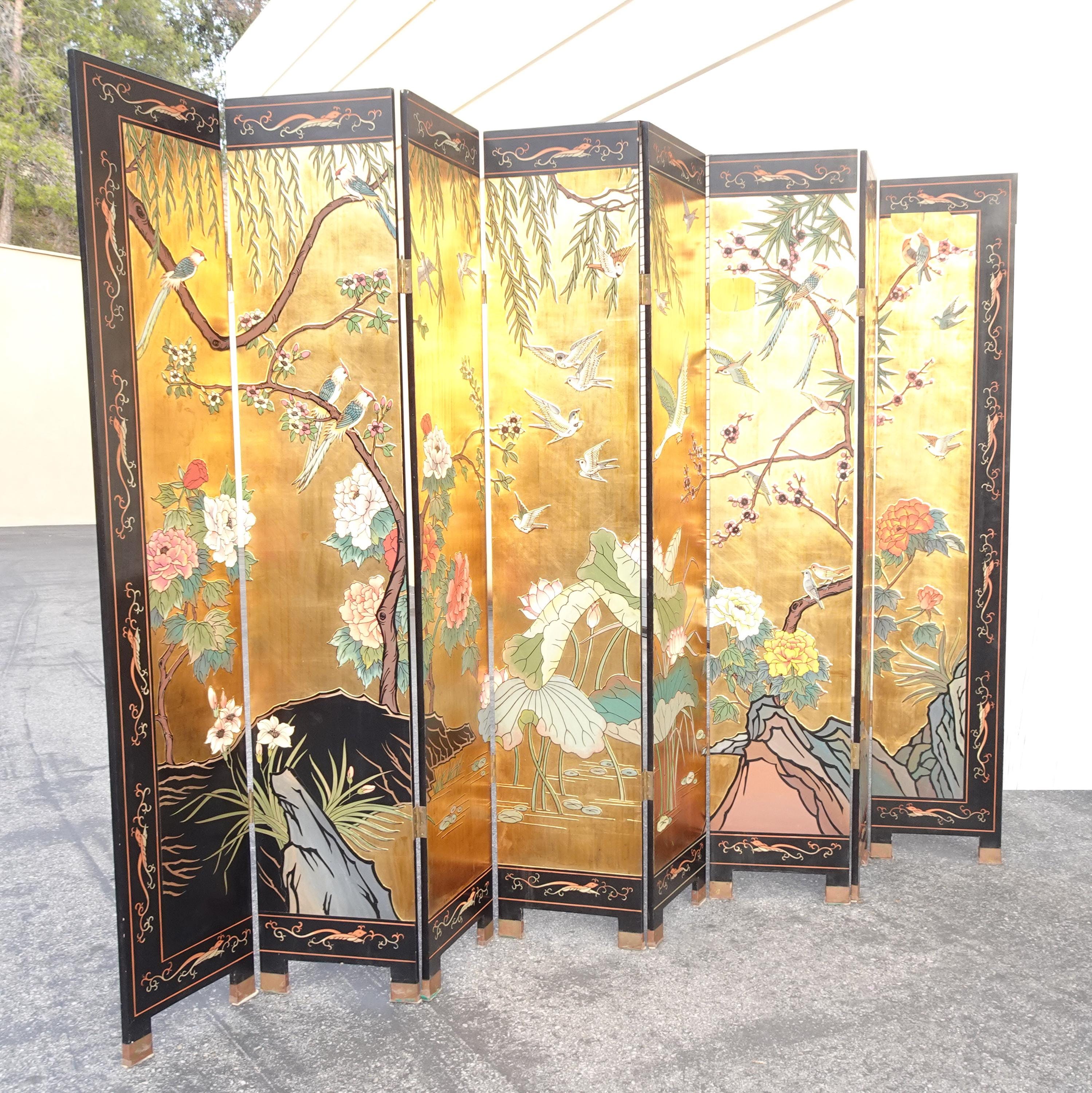 Vintage Eight Panel Oriental Asian Gold Folding Screen Room Divider w Birds