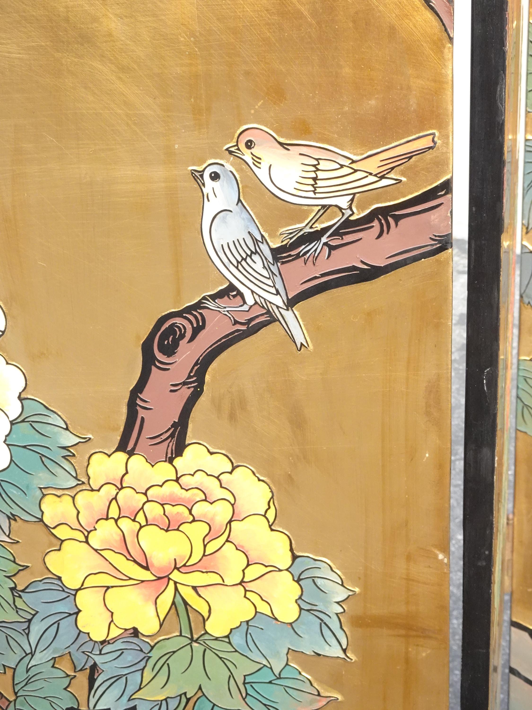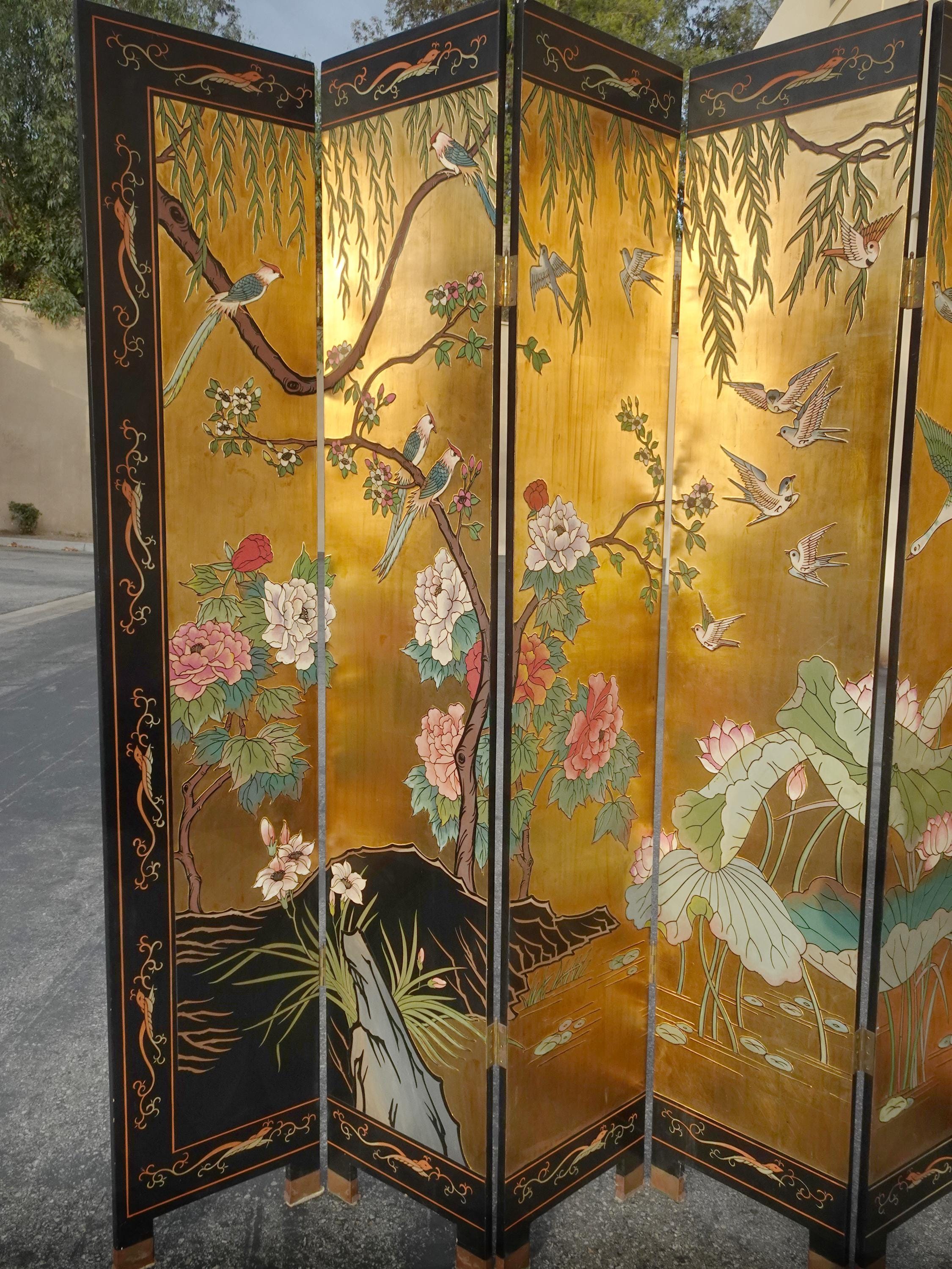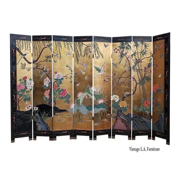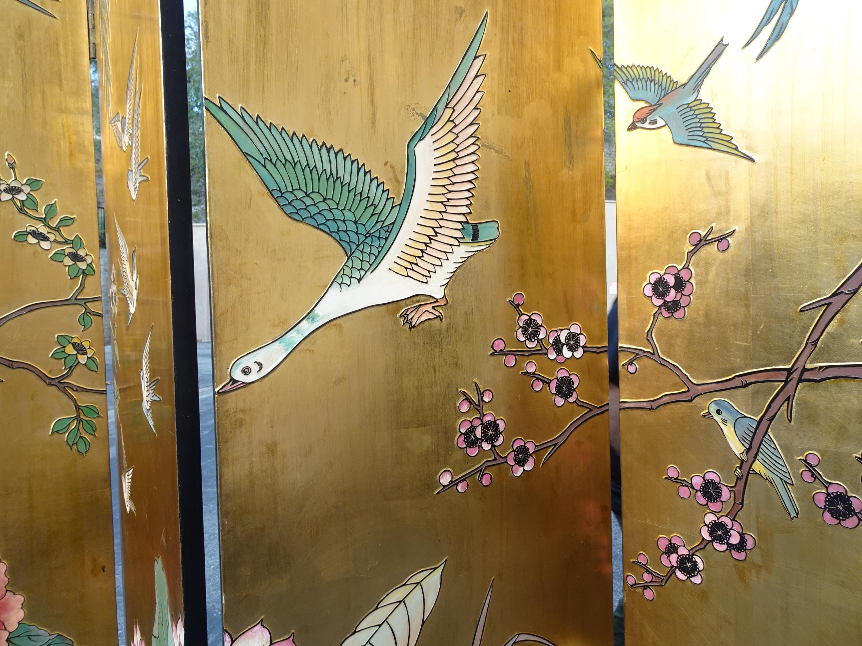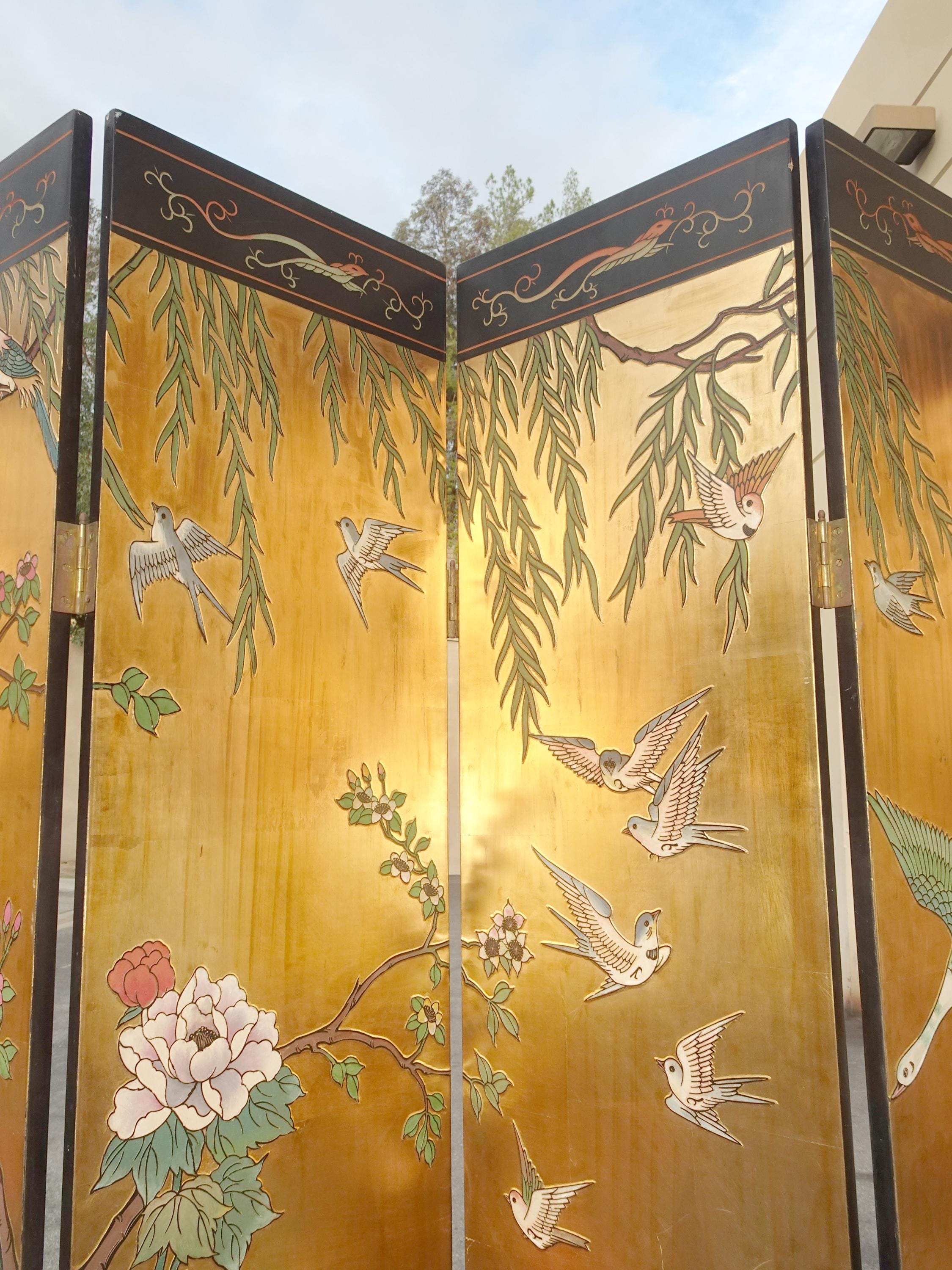 Vintage Eight Panel Oriental Asian Gold Folding Screen Room Divider w Birds