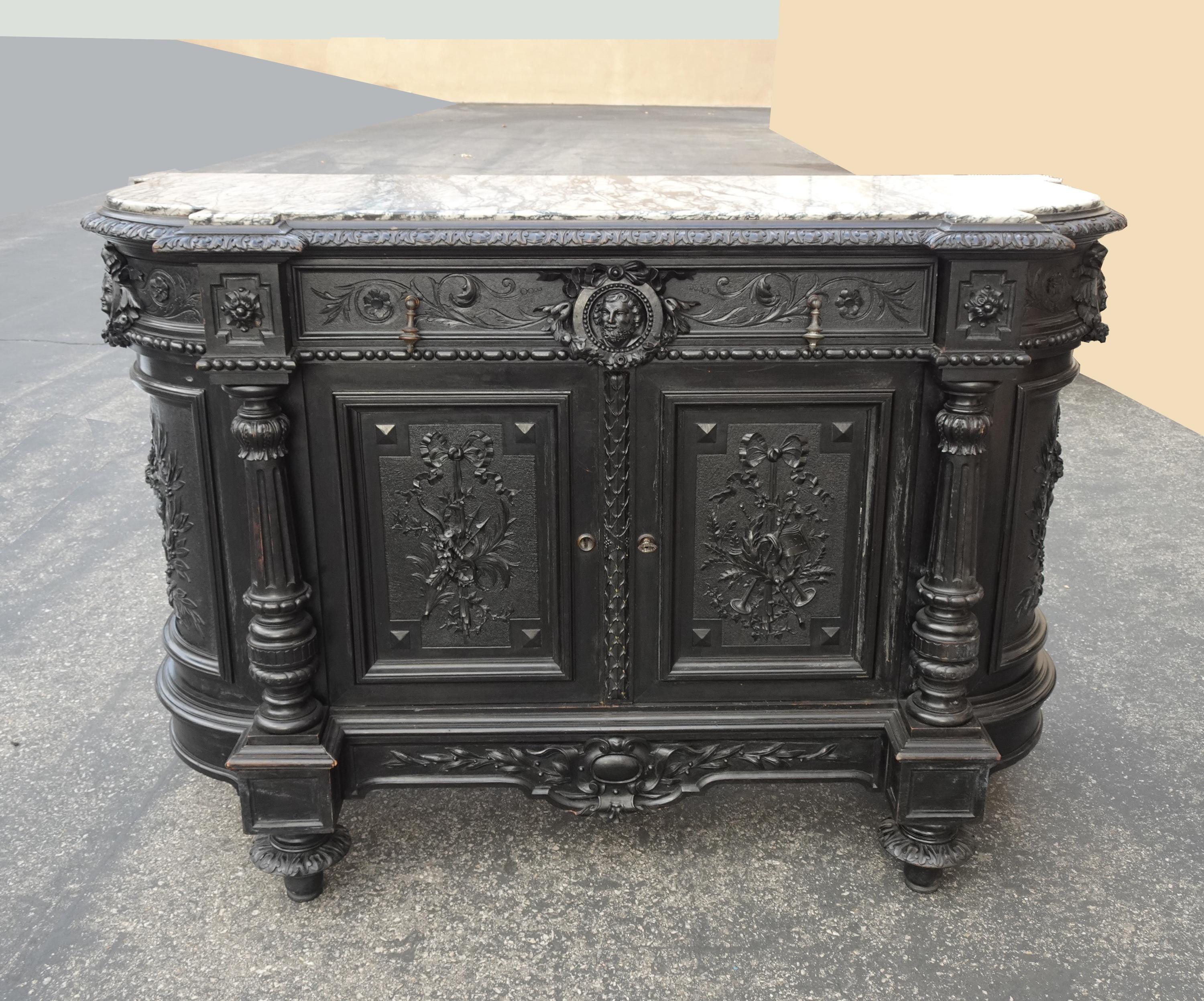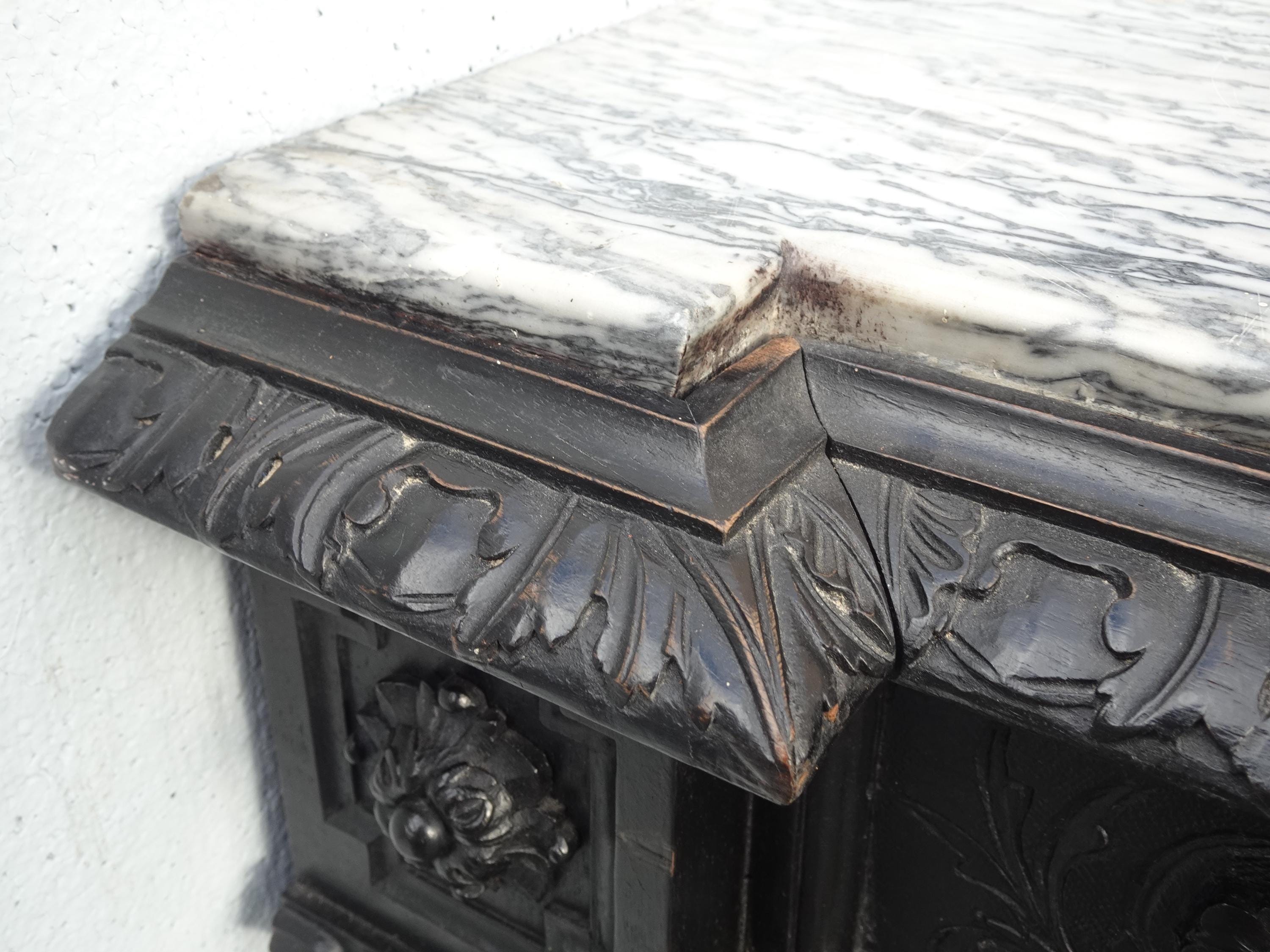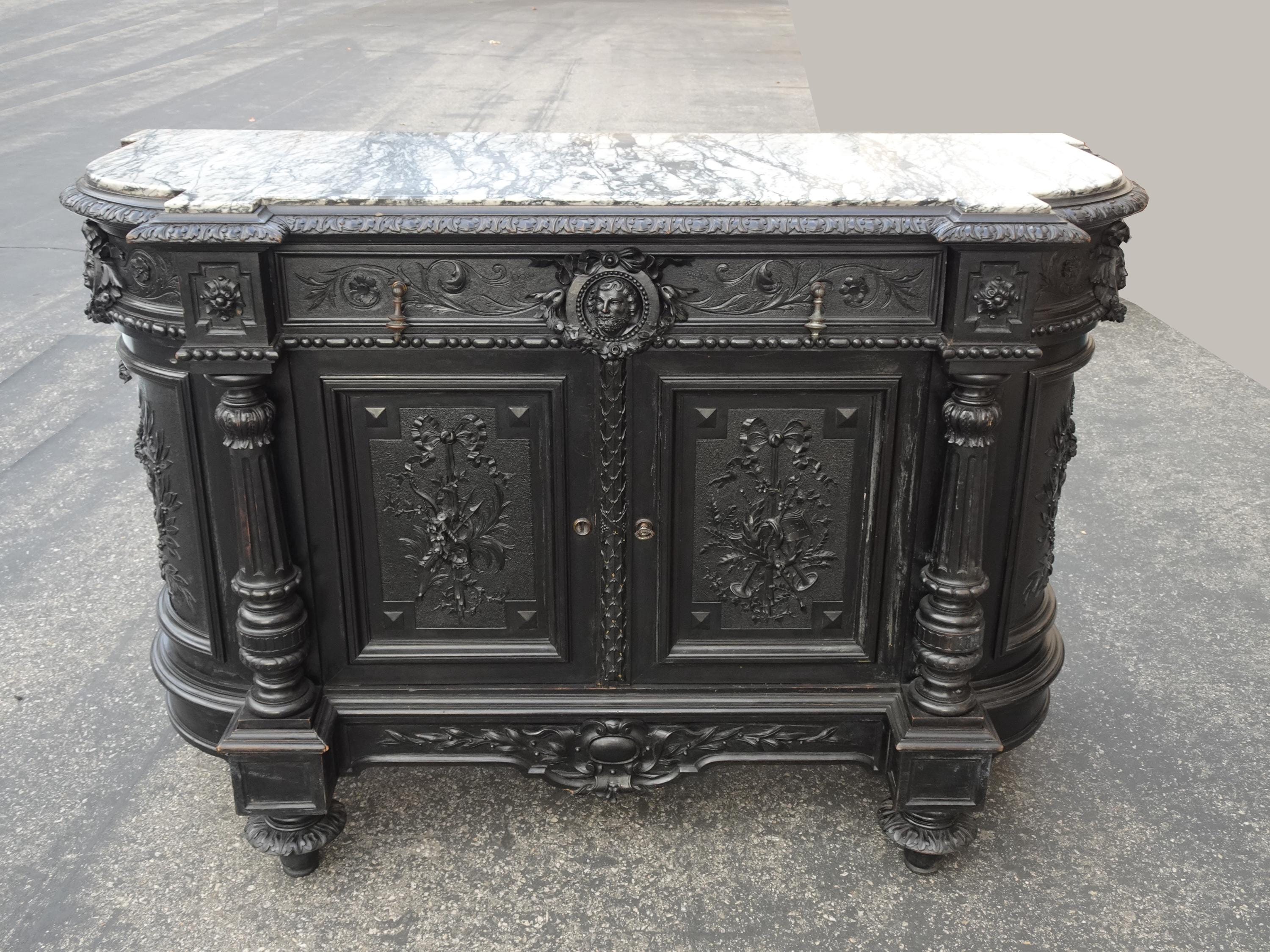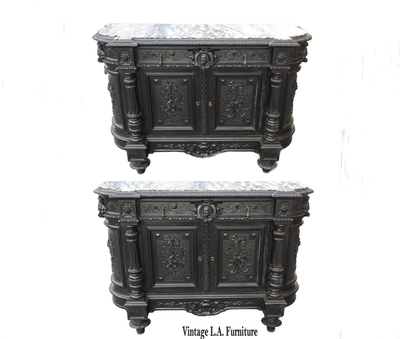 Pair Antique French Renaissance Ebonized Baroque Marble Sideboards Buffet France