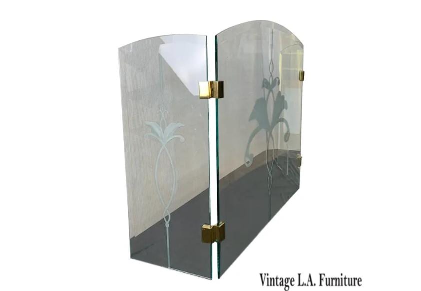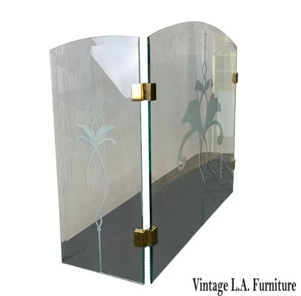Vtg Mid Century 1980's Three Panel Etched Glass Floral Fireplace Screen w Brass
