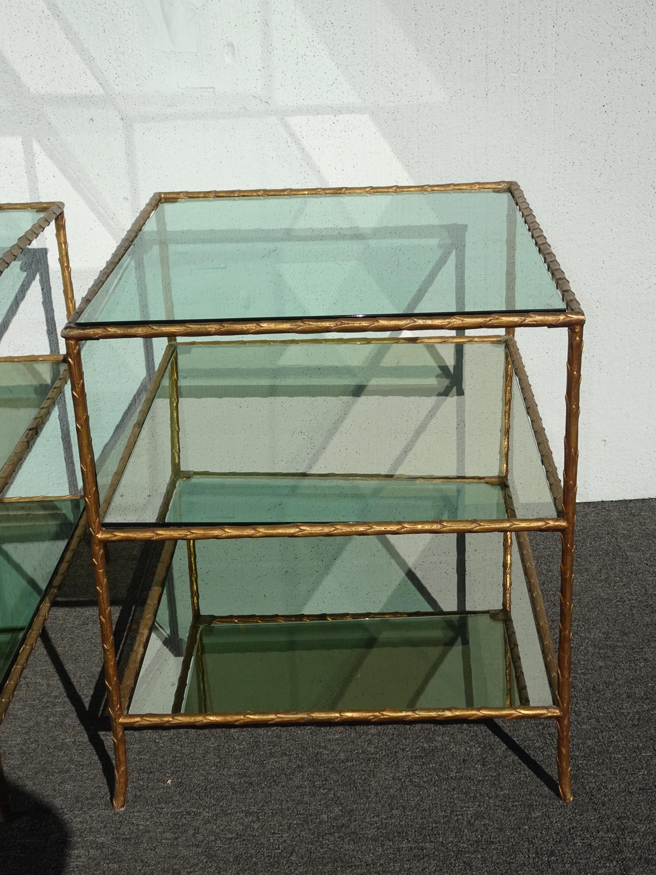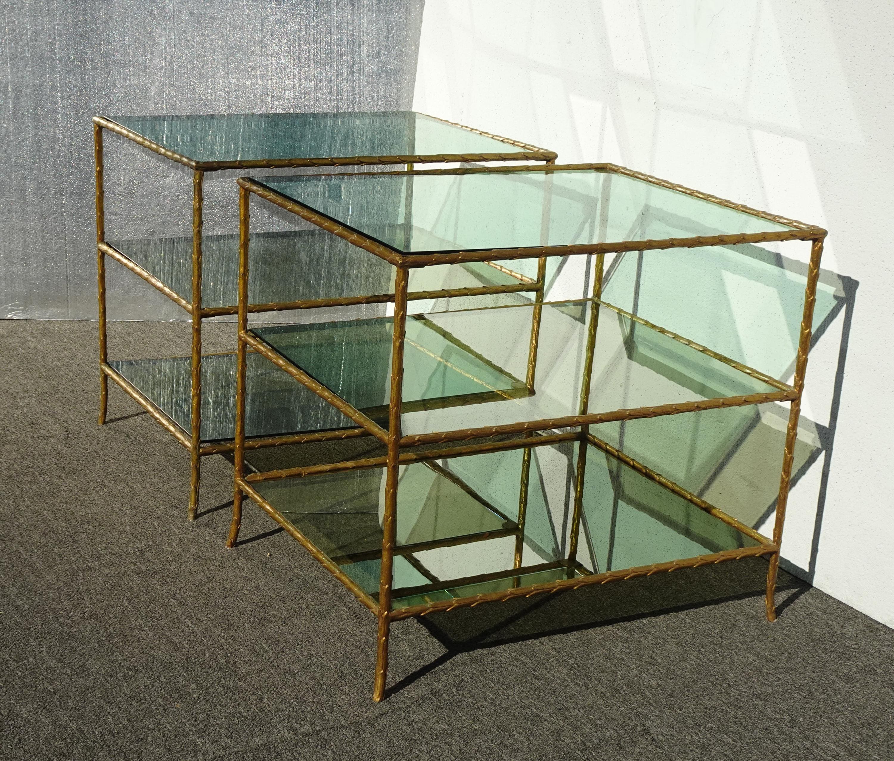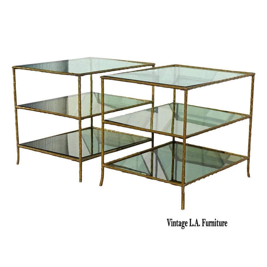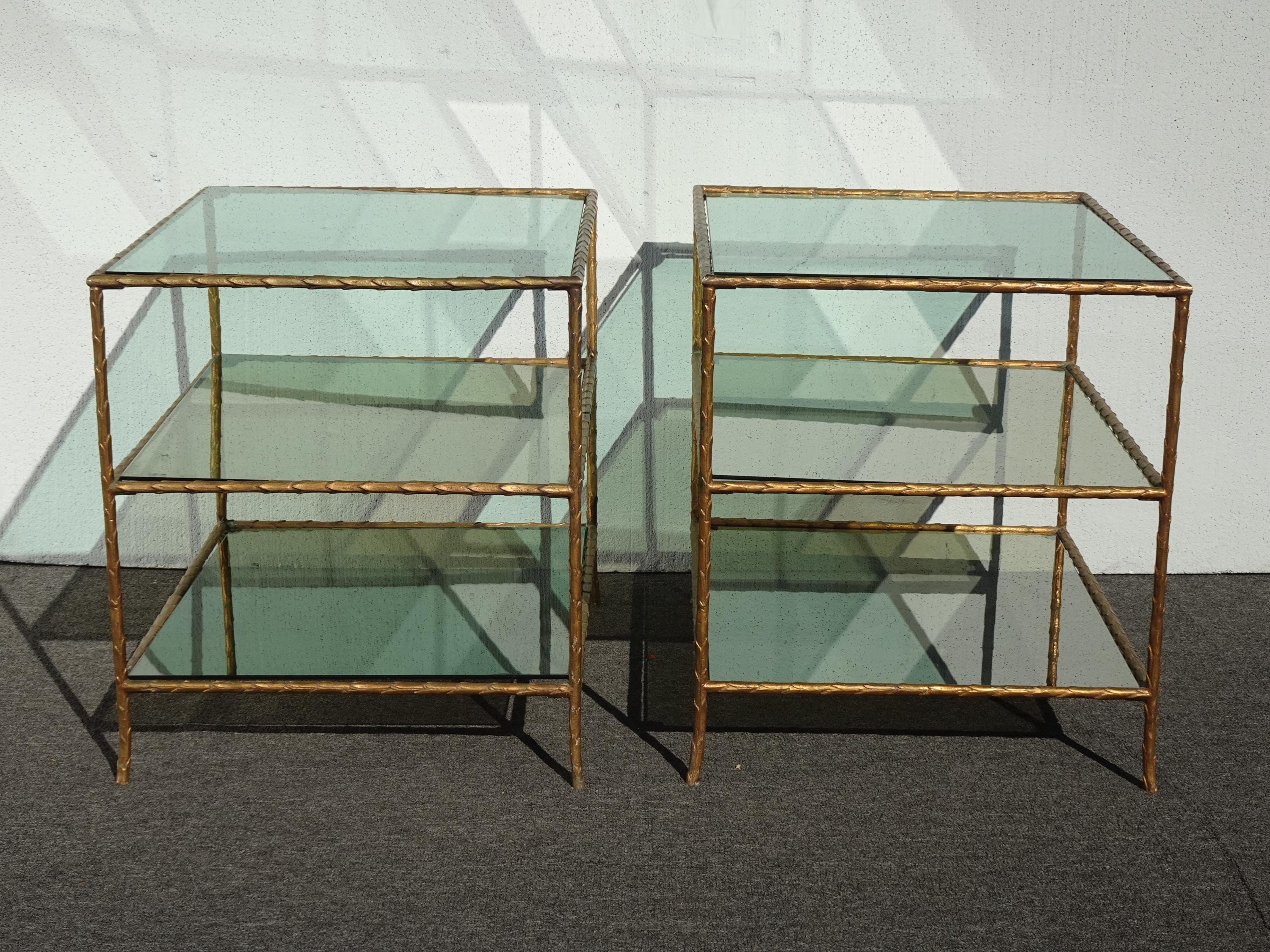 Pair of Vintage Three Tier Brass Bronze Side Tables w Etched Leaf Frames
