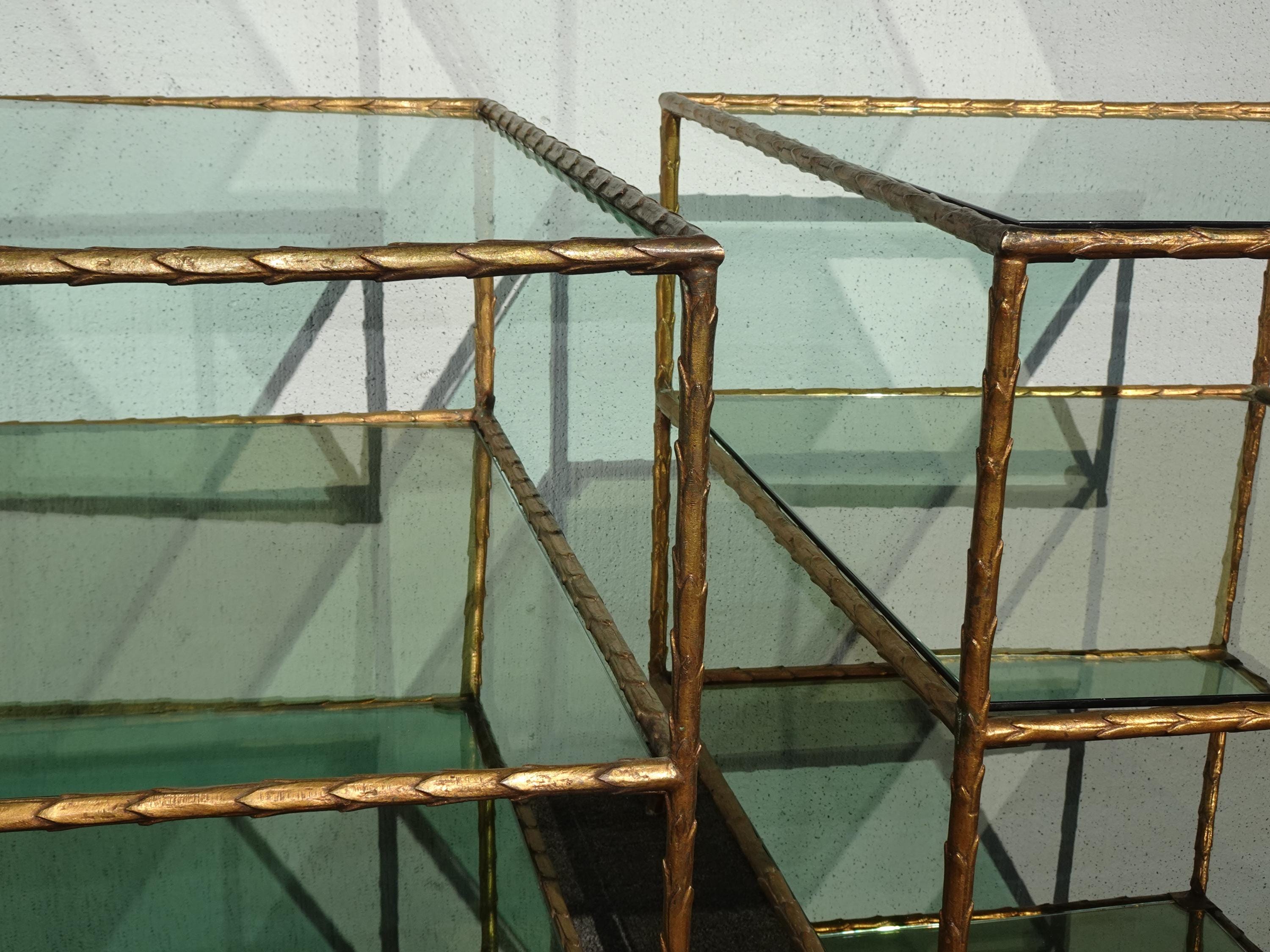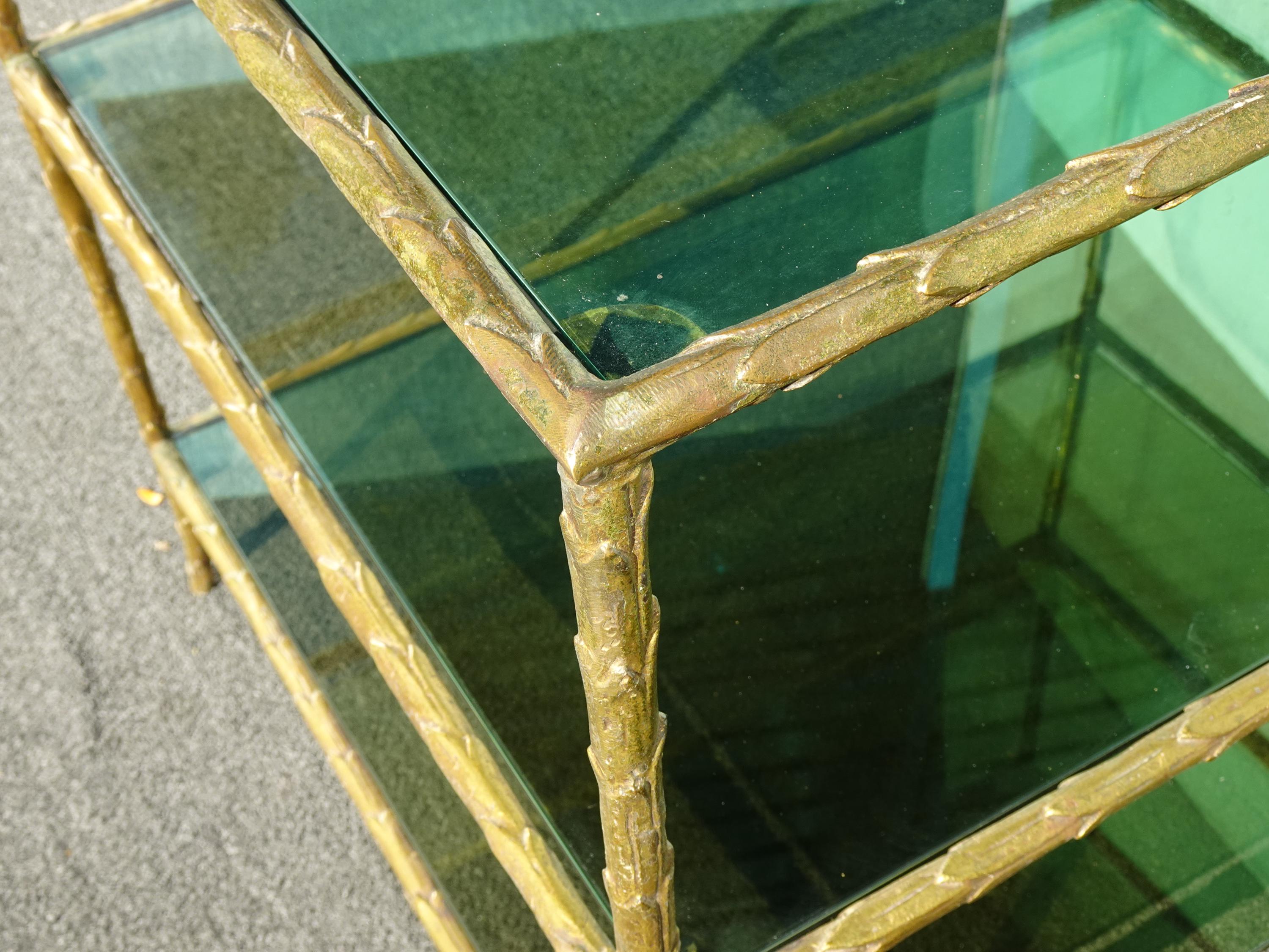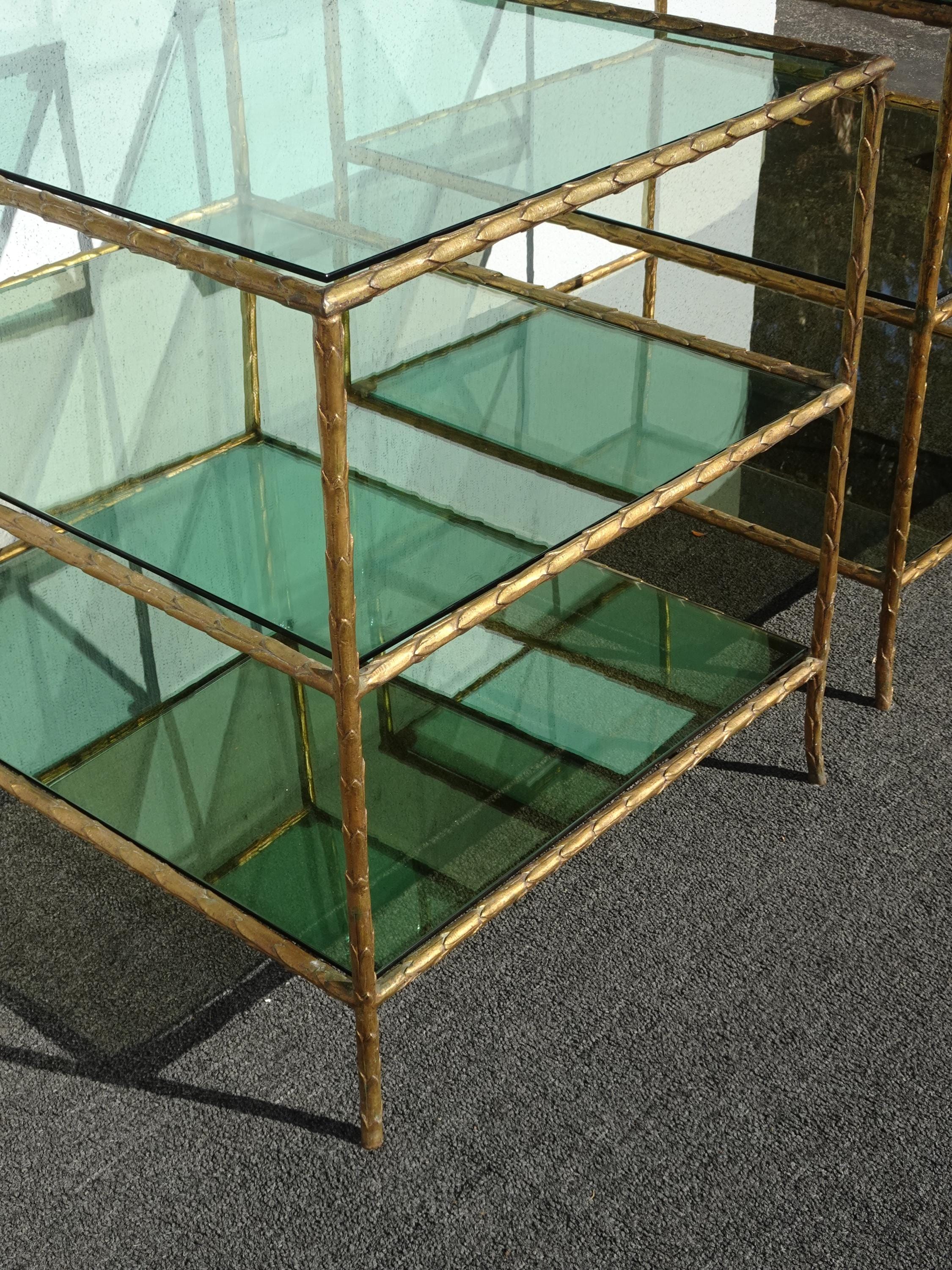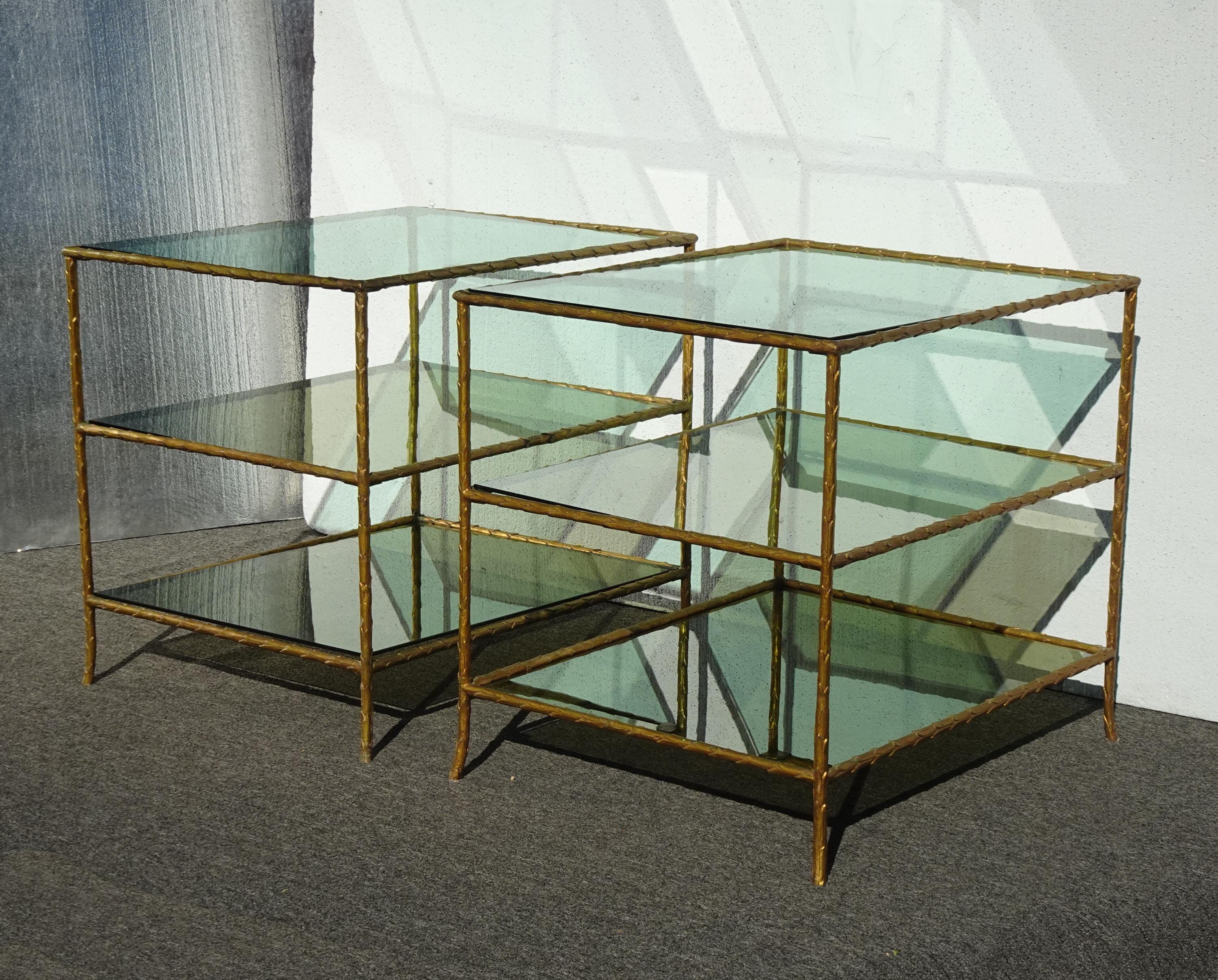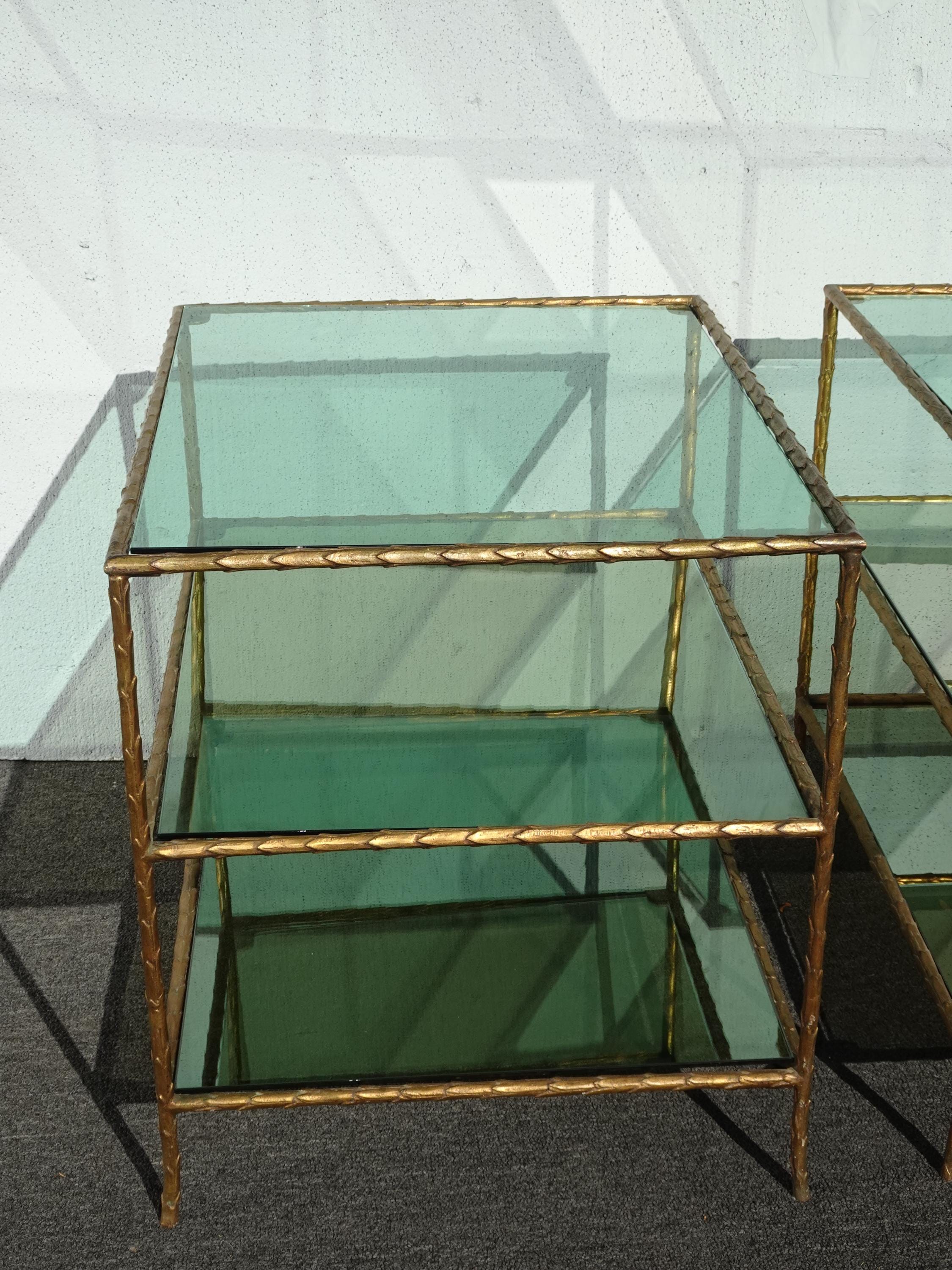 Pair of Vintage Three Tier Brass Bronze Side Tables w Etched Leaf Frames
