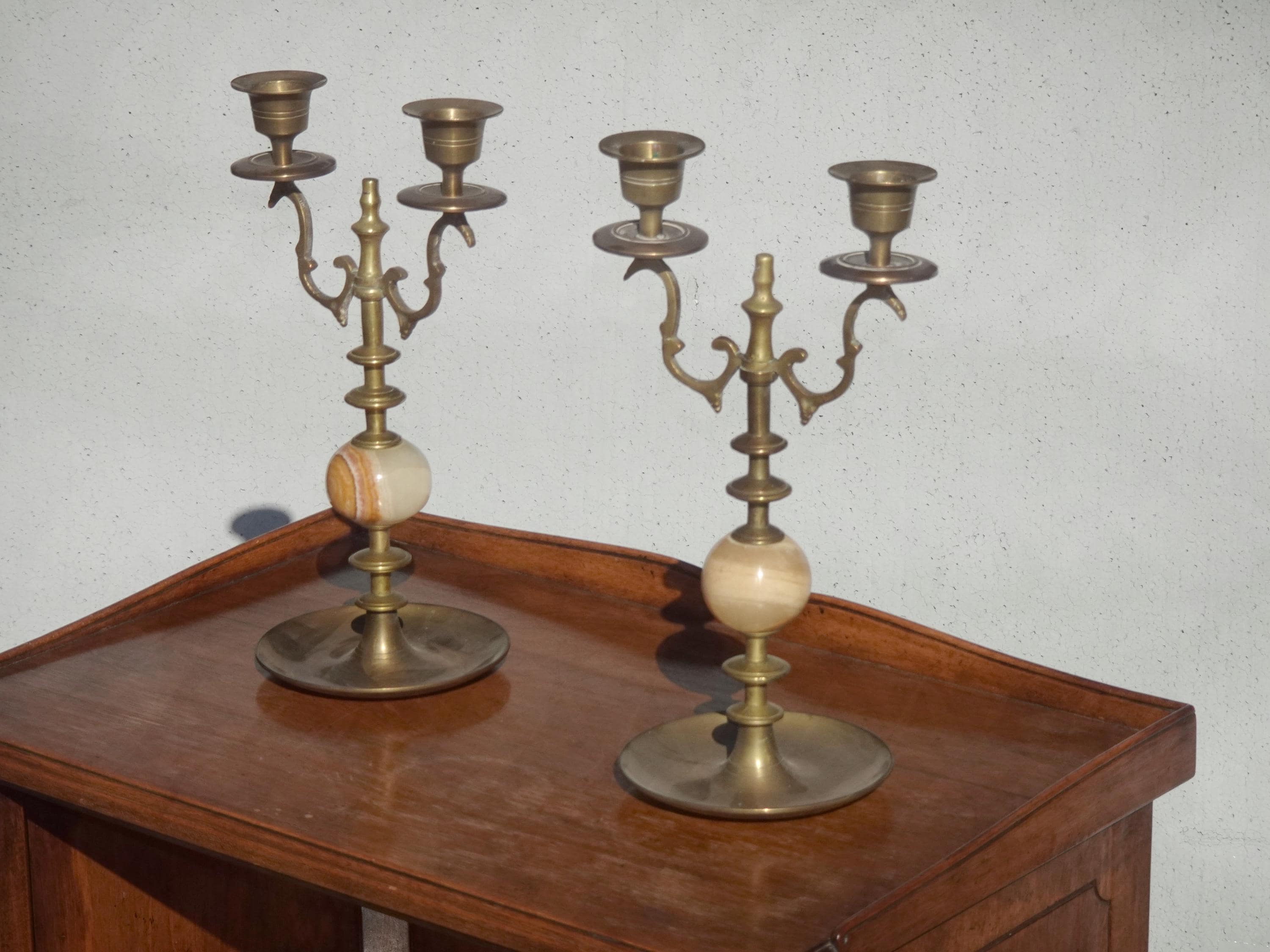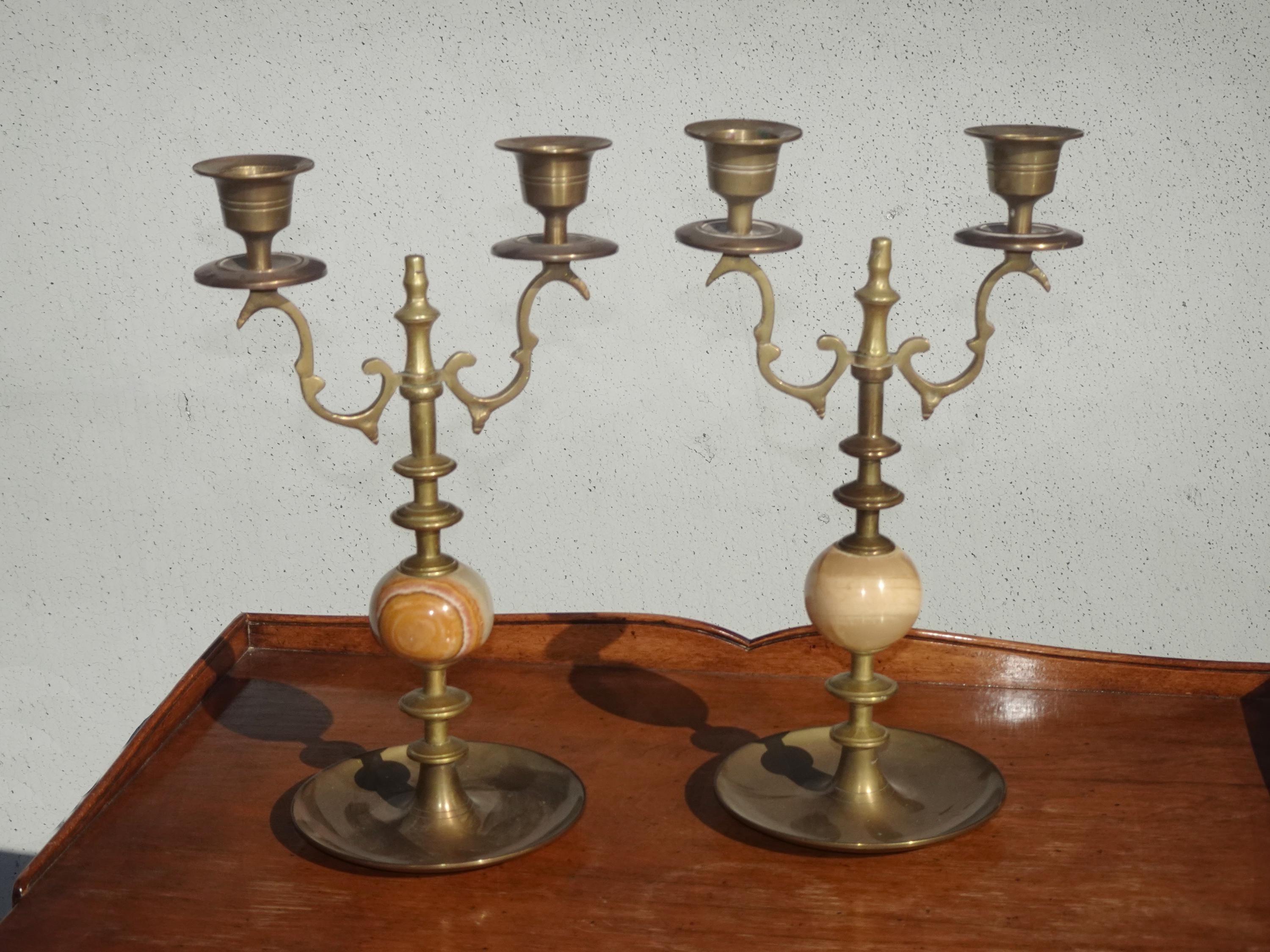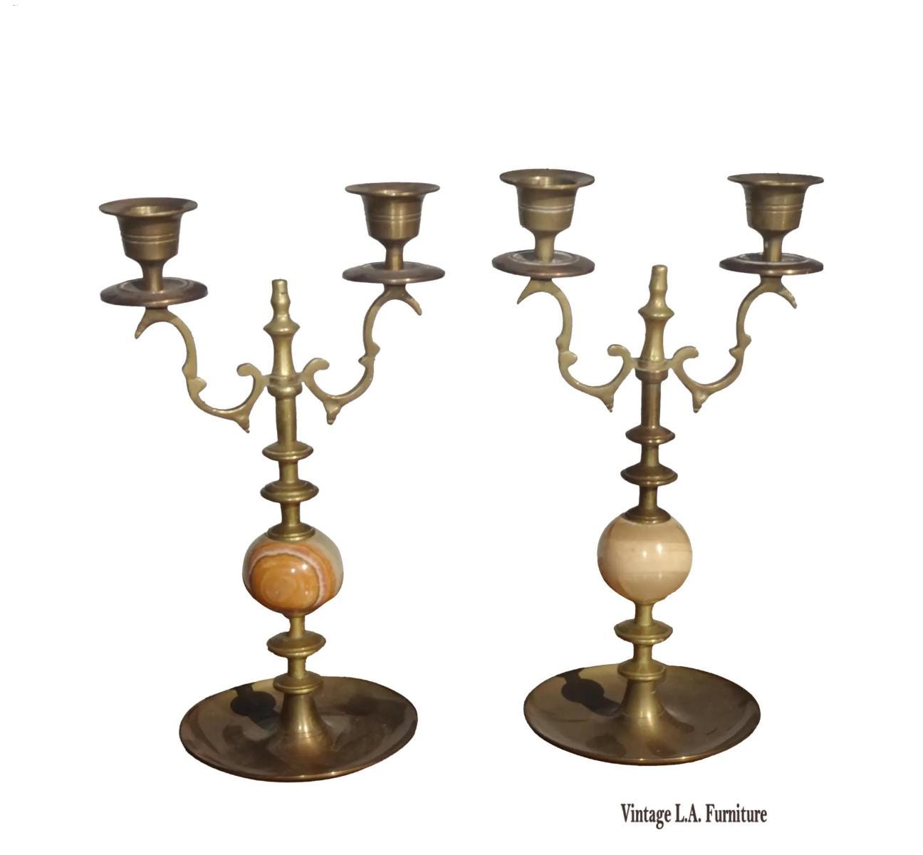Pair of Vintage Brass and Onyx Candelabras 10" High Candle Holders