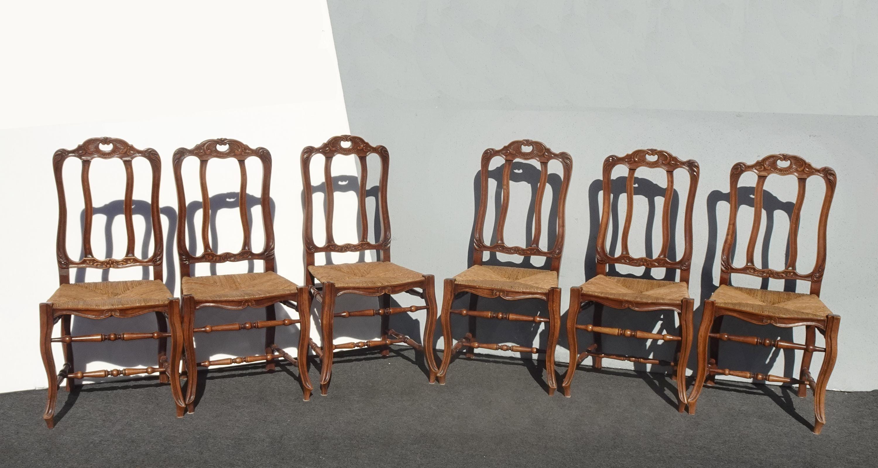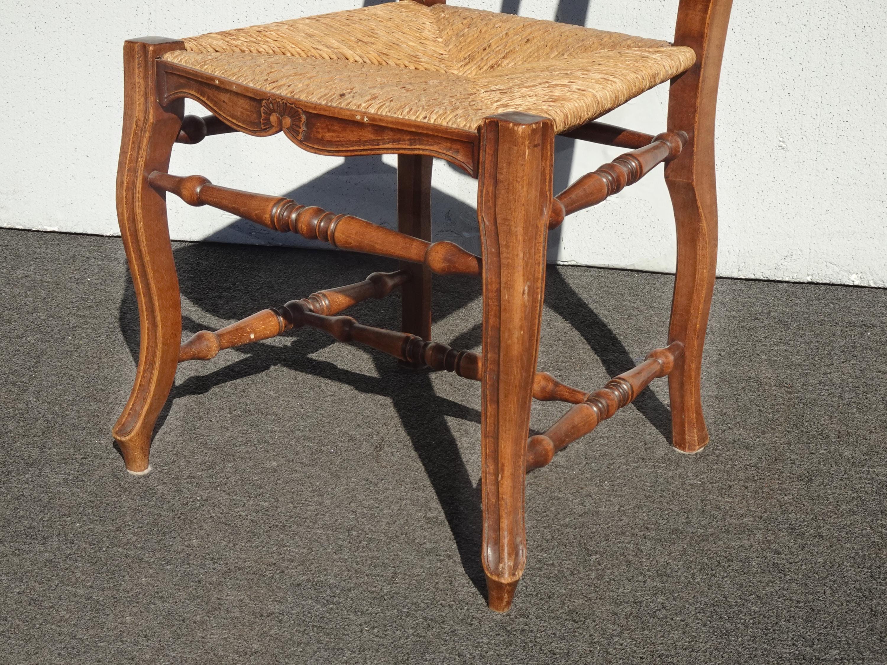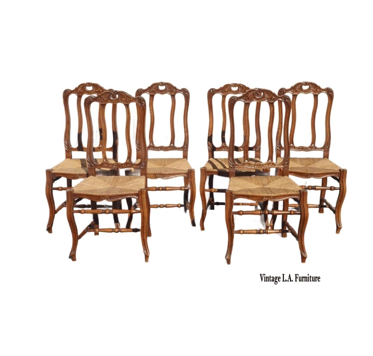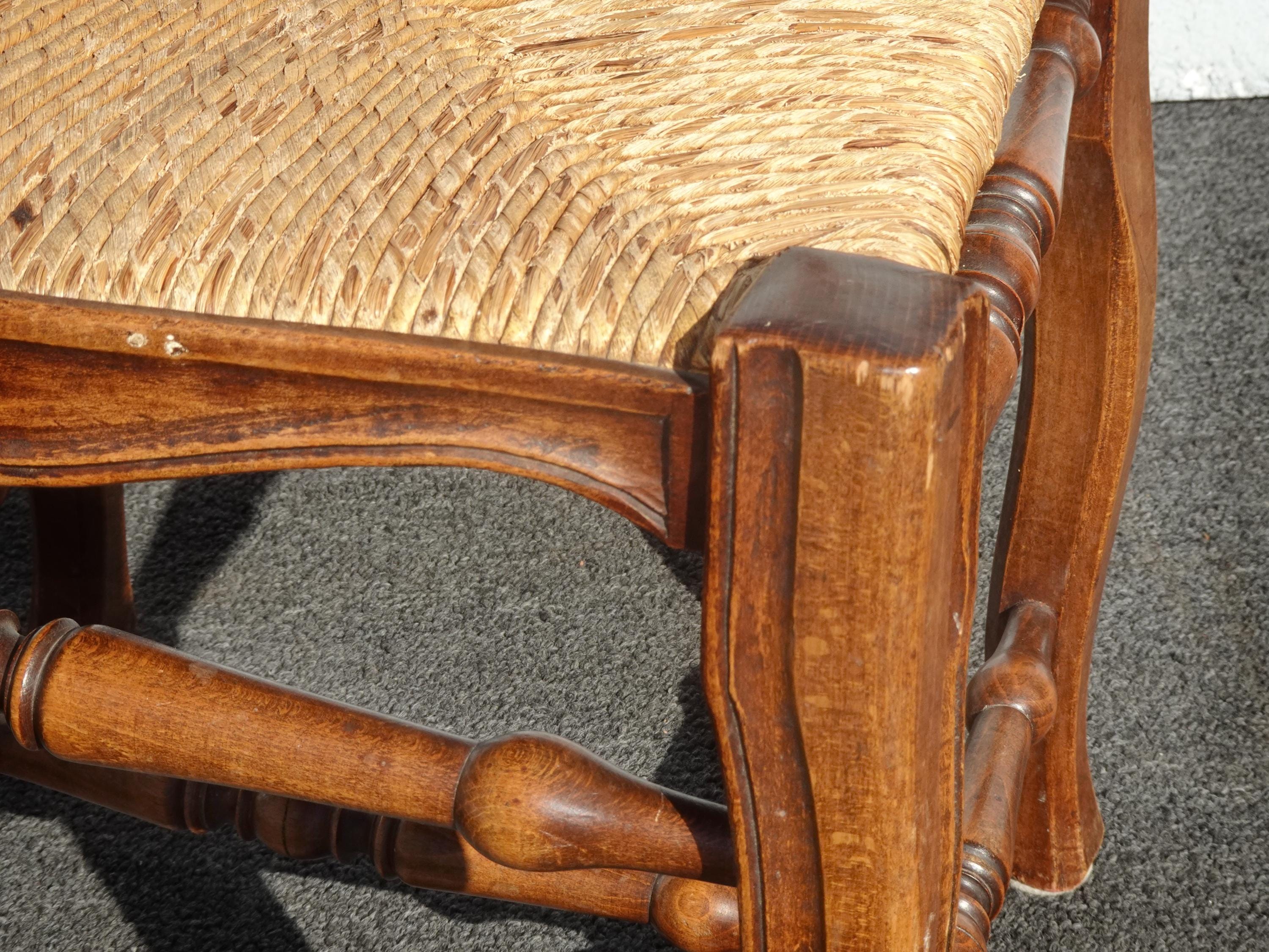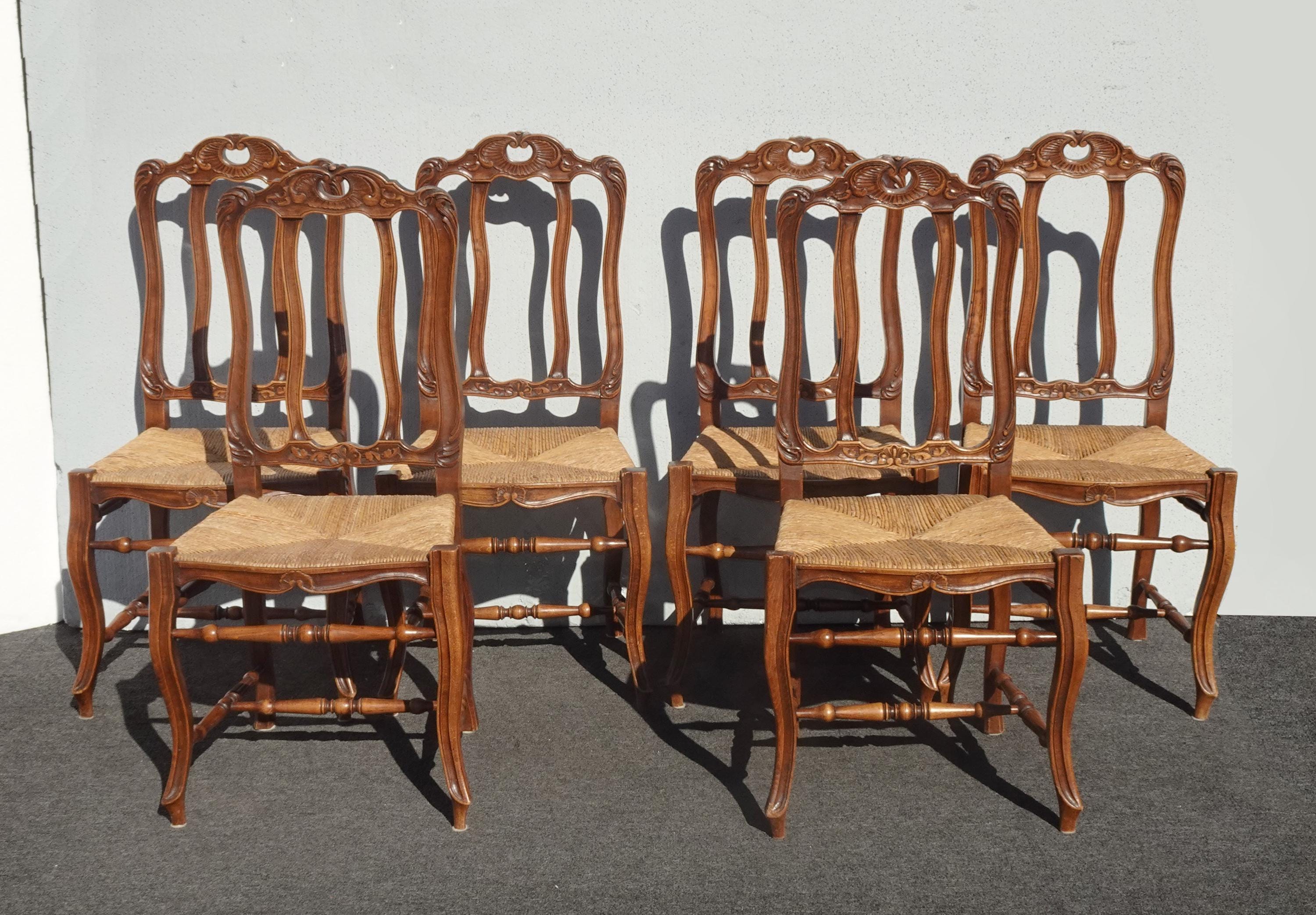 Set of Six Vintage French Country Brown Rush Dining Chairs
