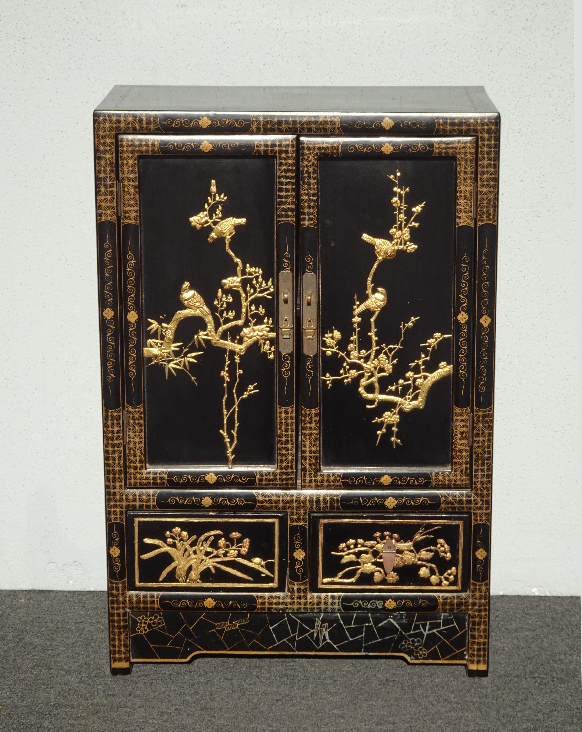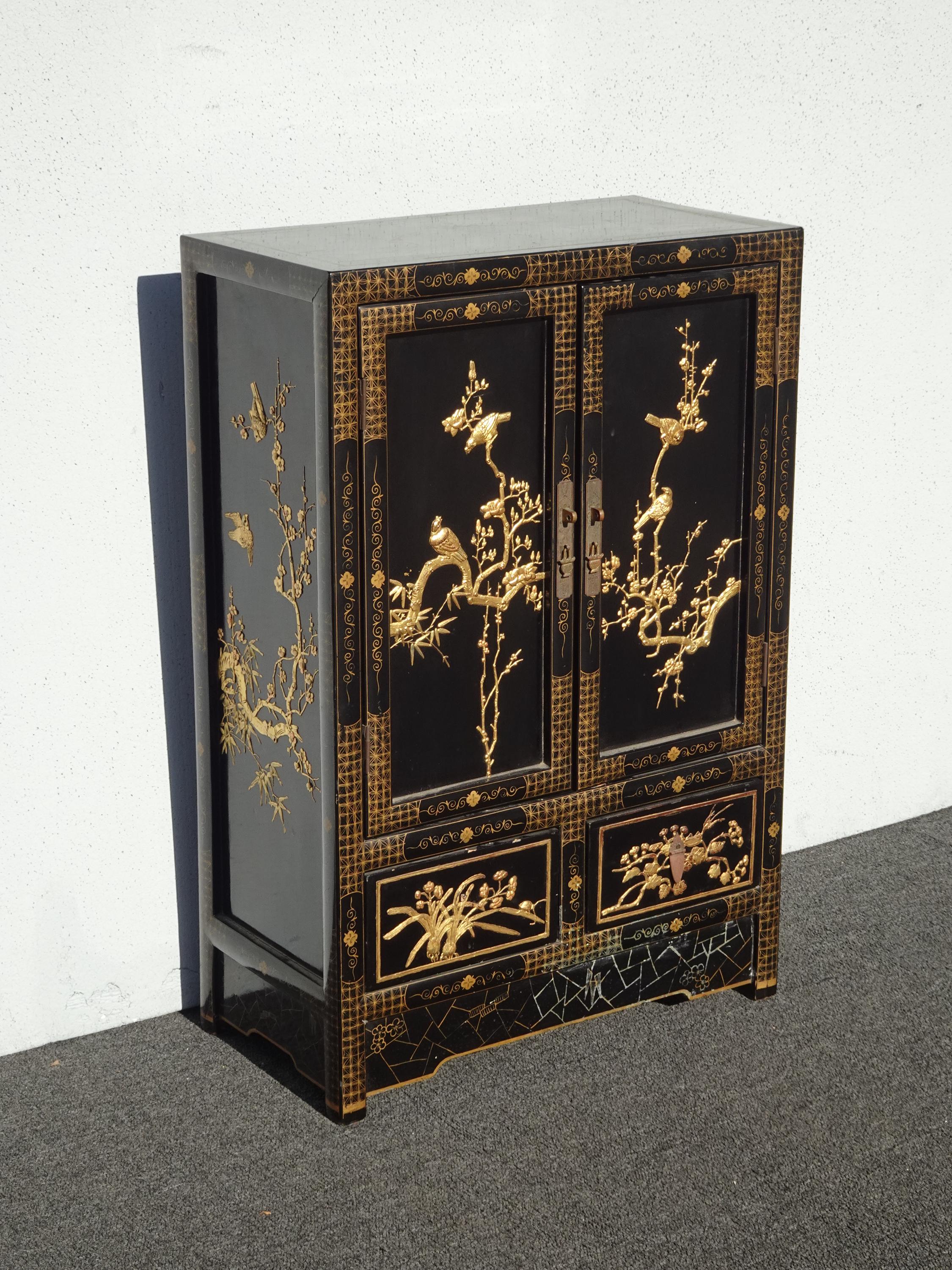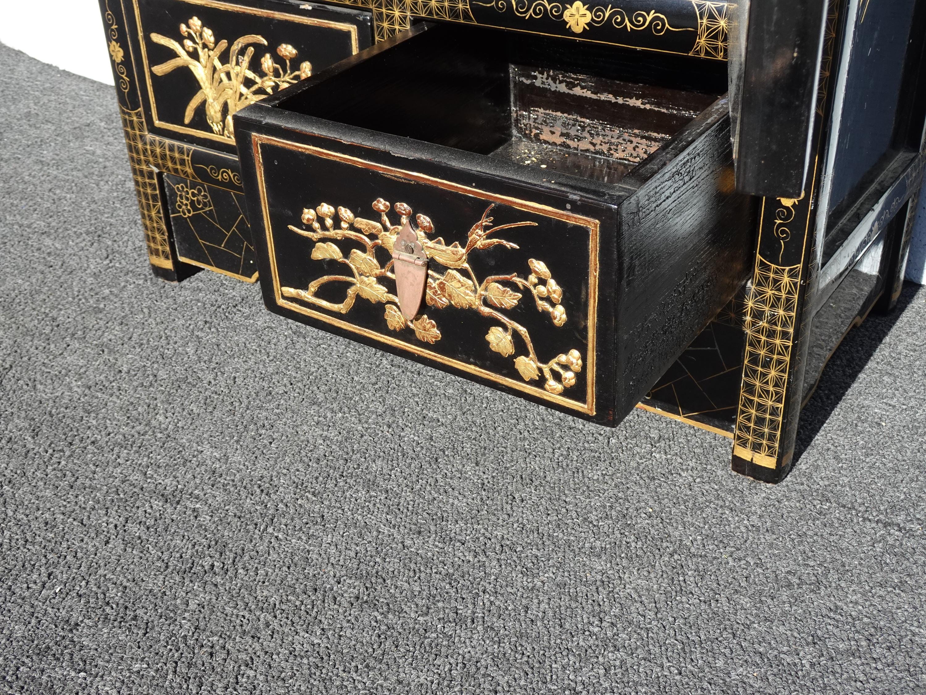 Vintage Oriental Chinese Chinoiserie Black Lacquer Cabinet w Drawers 1of2