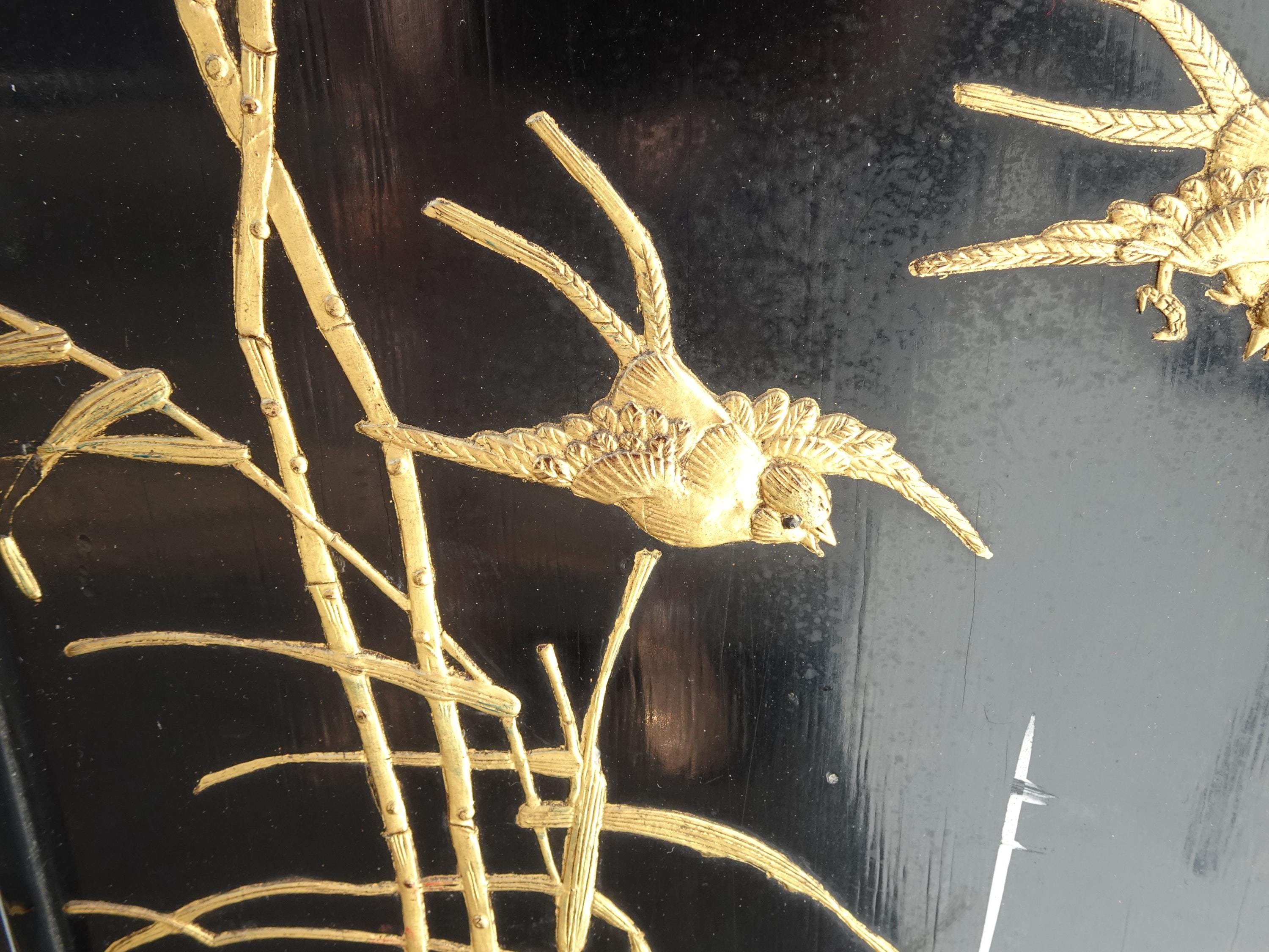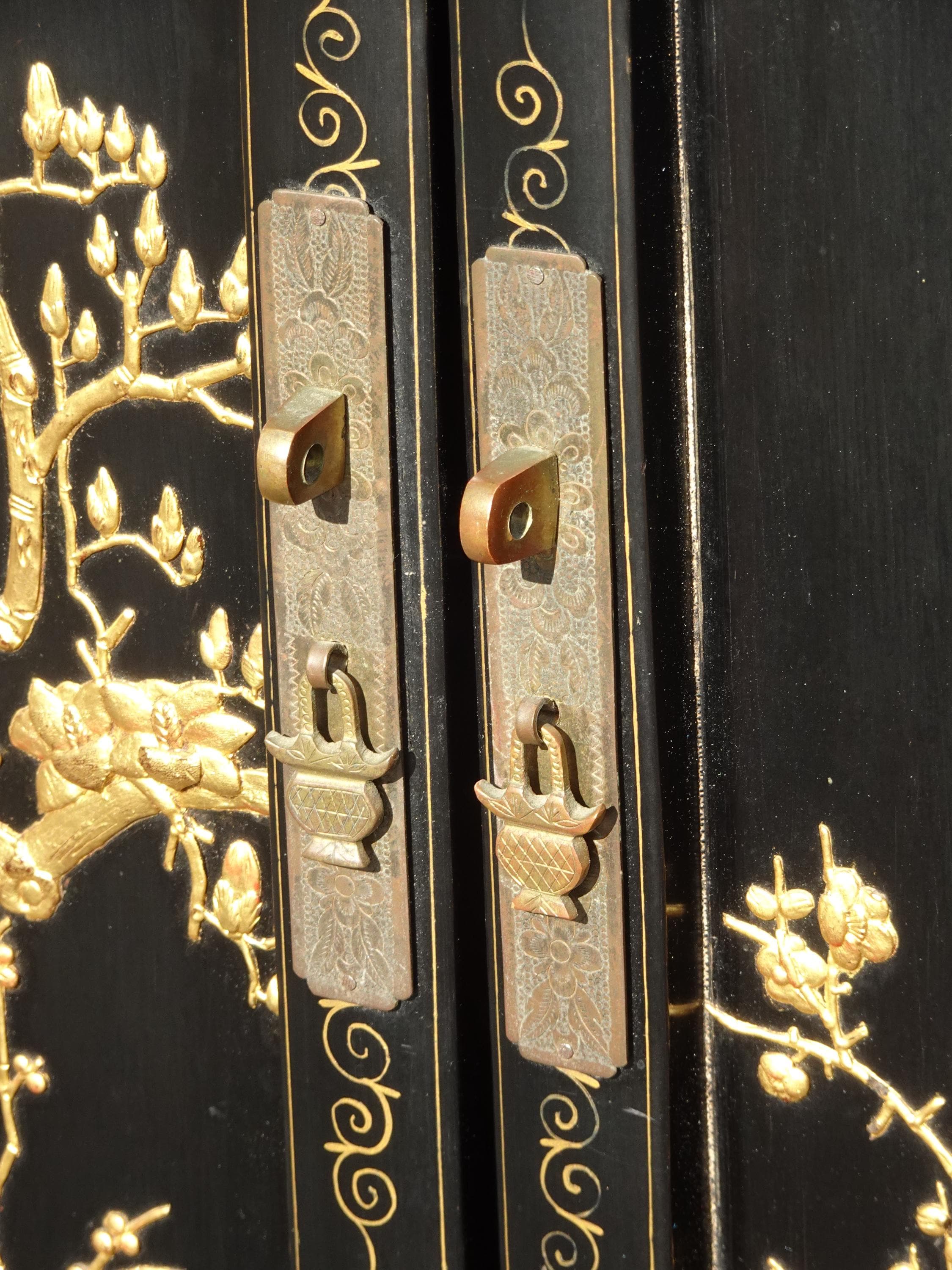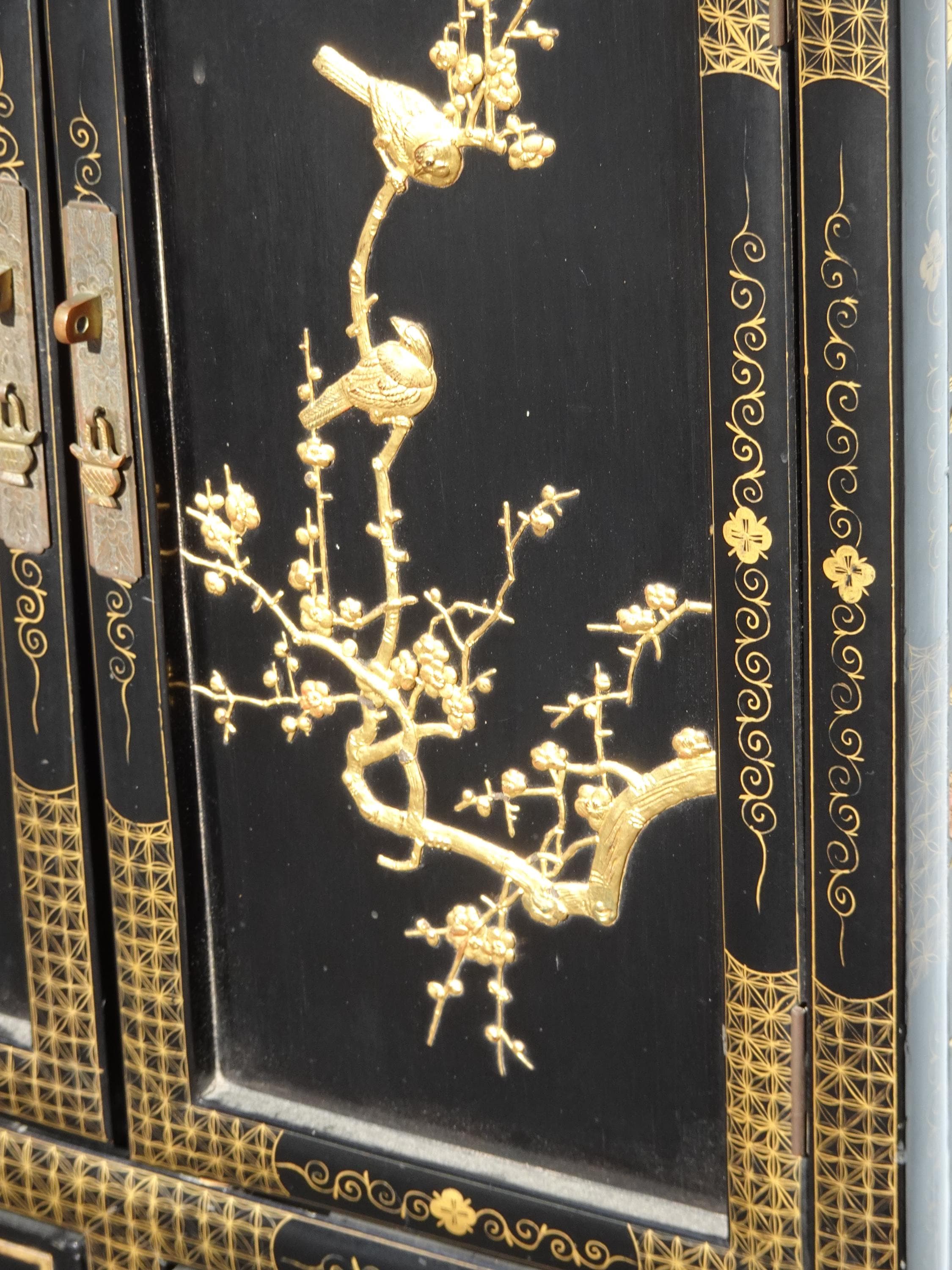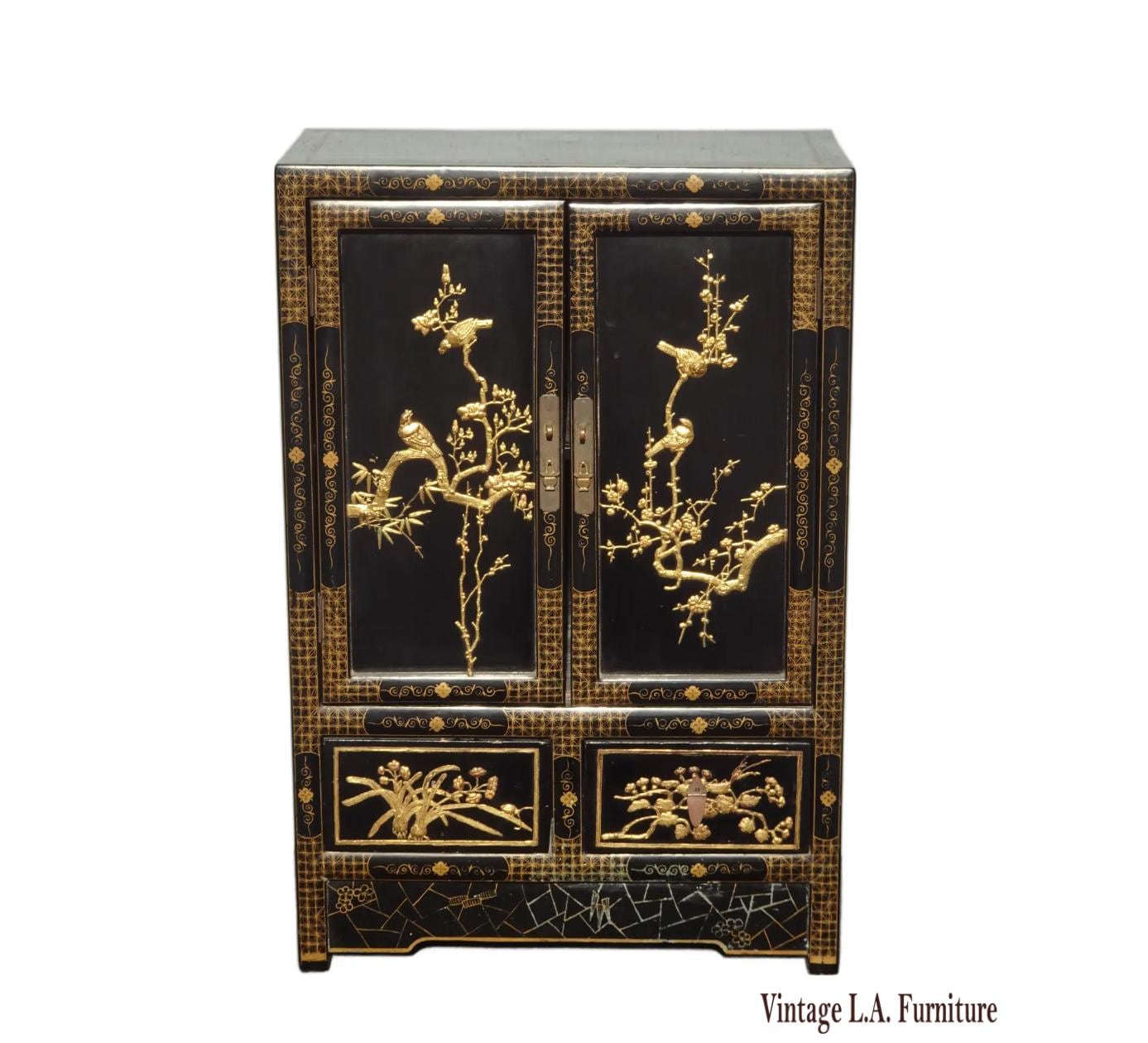 Vintage Oriental Chinese Chinoiserie Black Lacquer Cabinet w Drawers 1of2