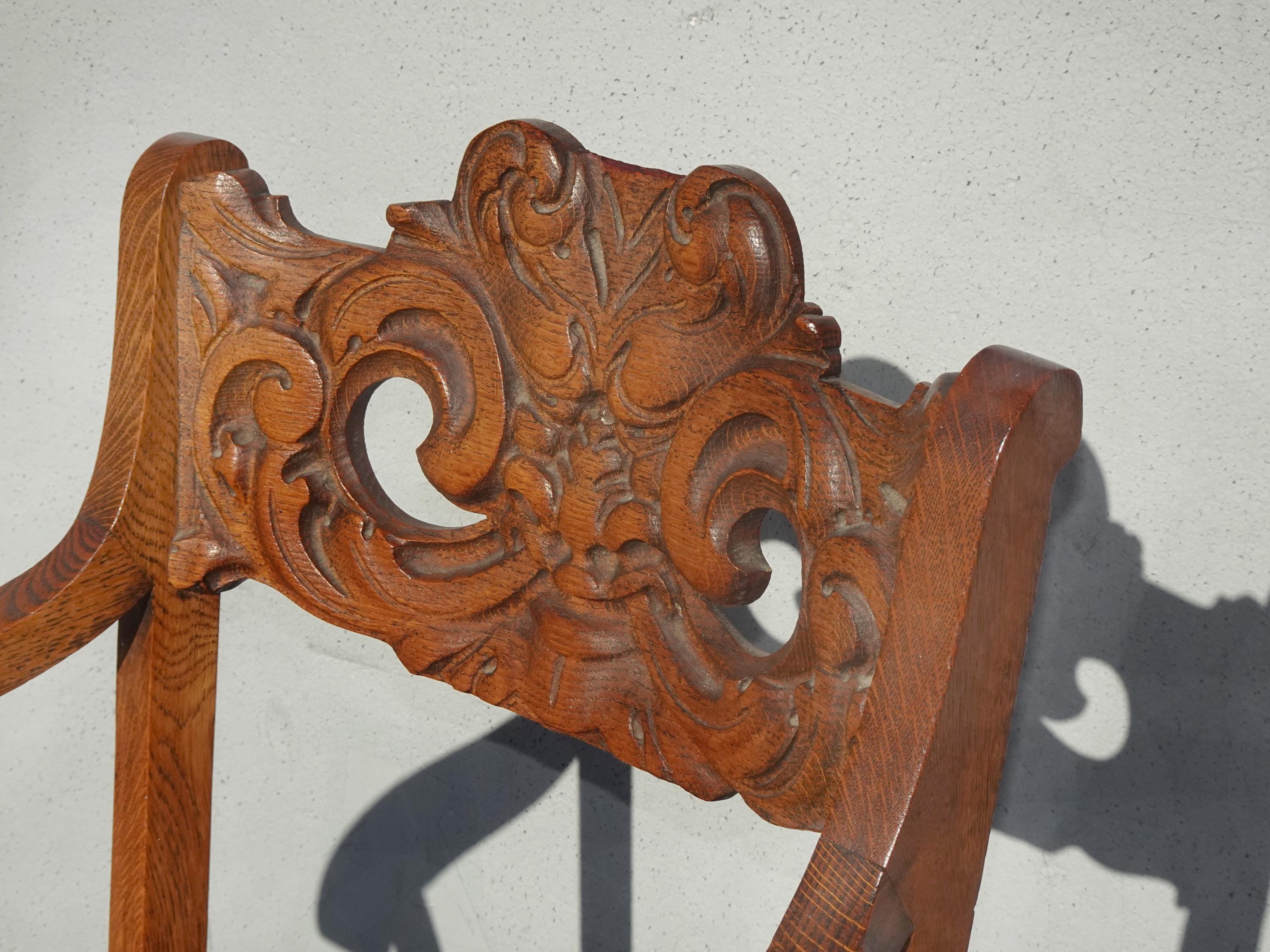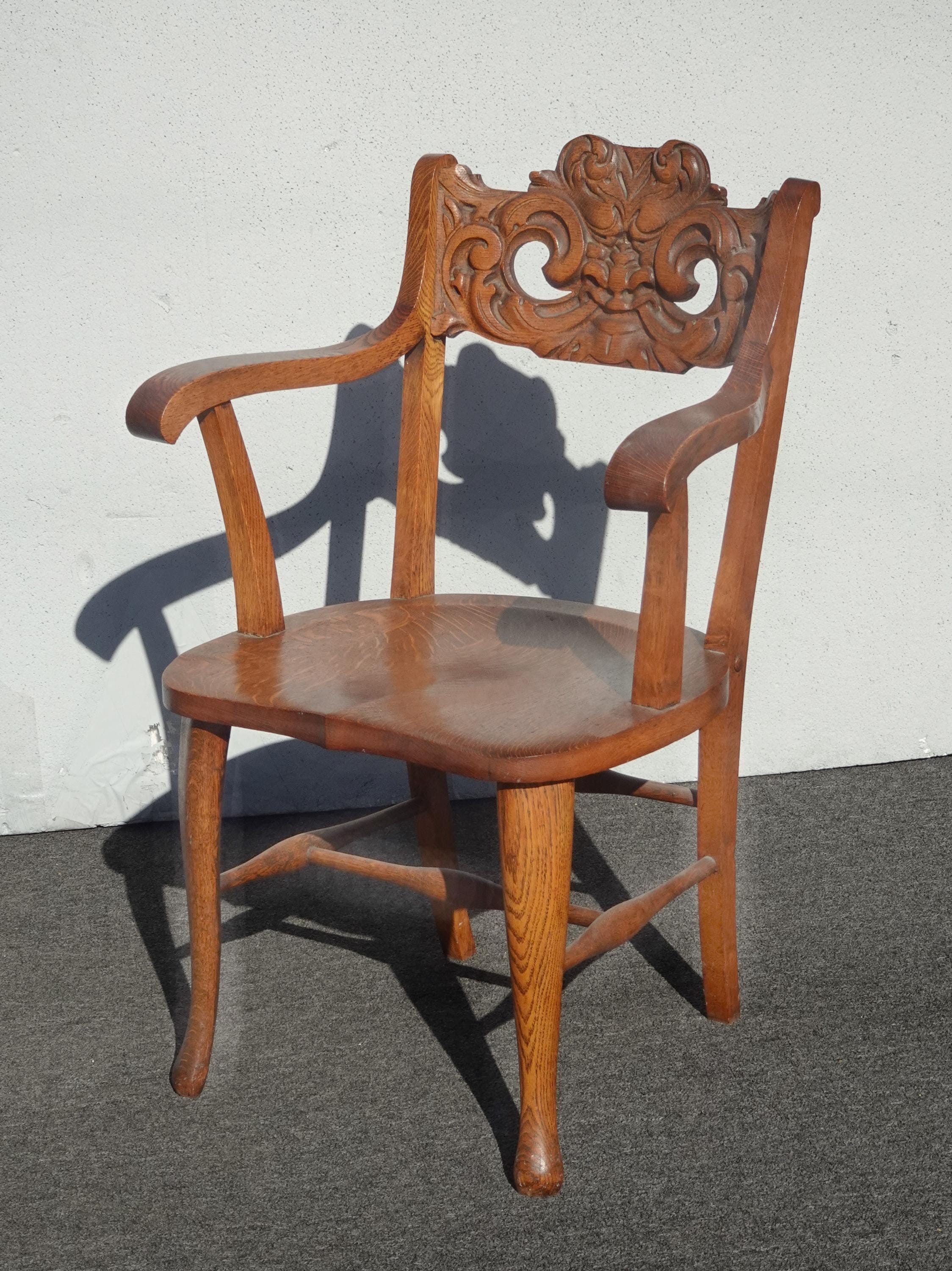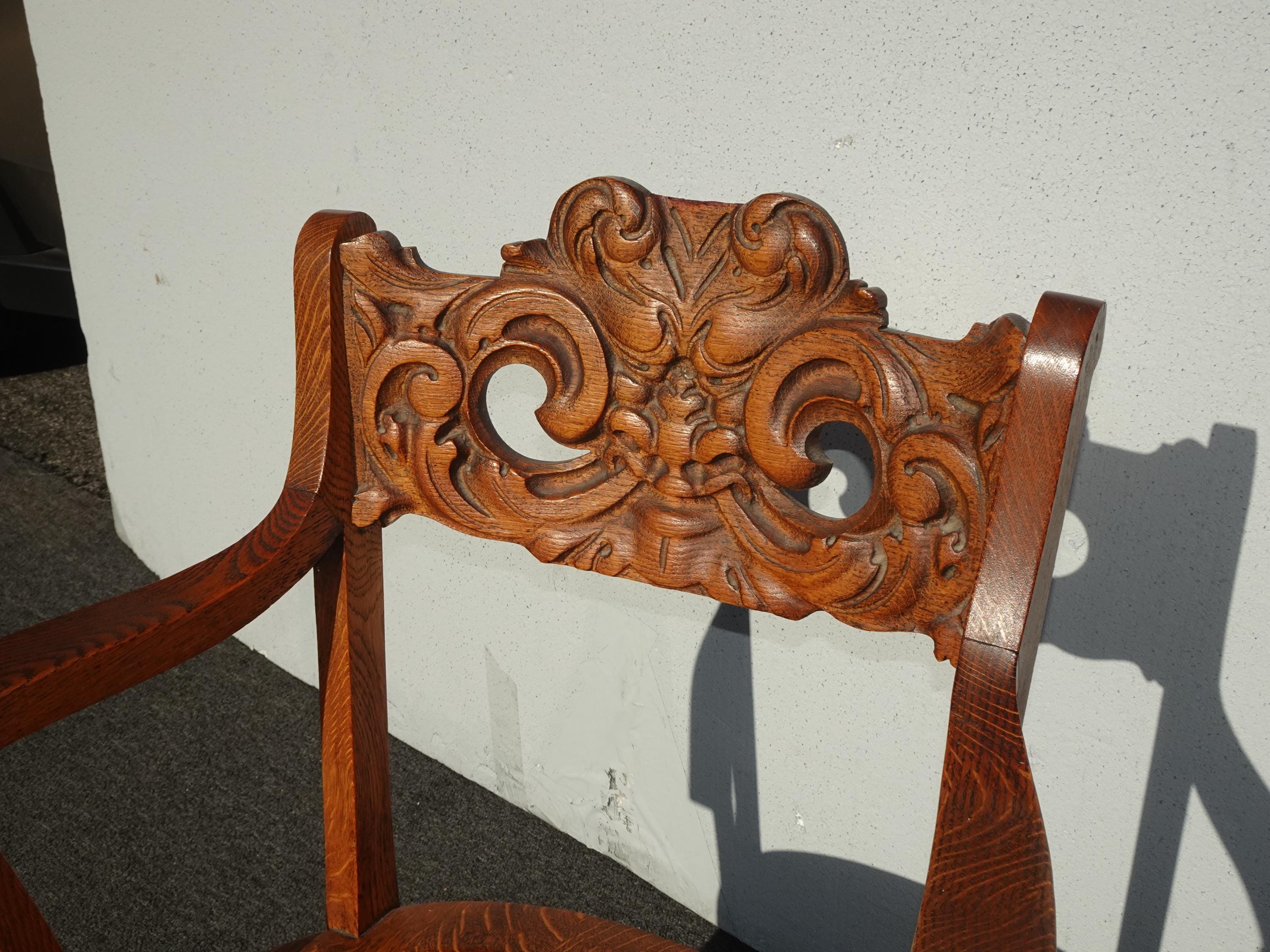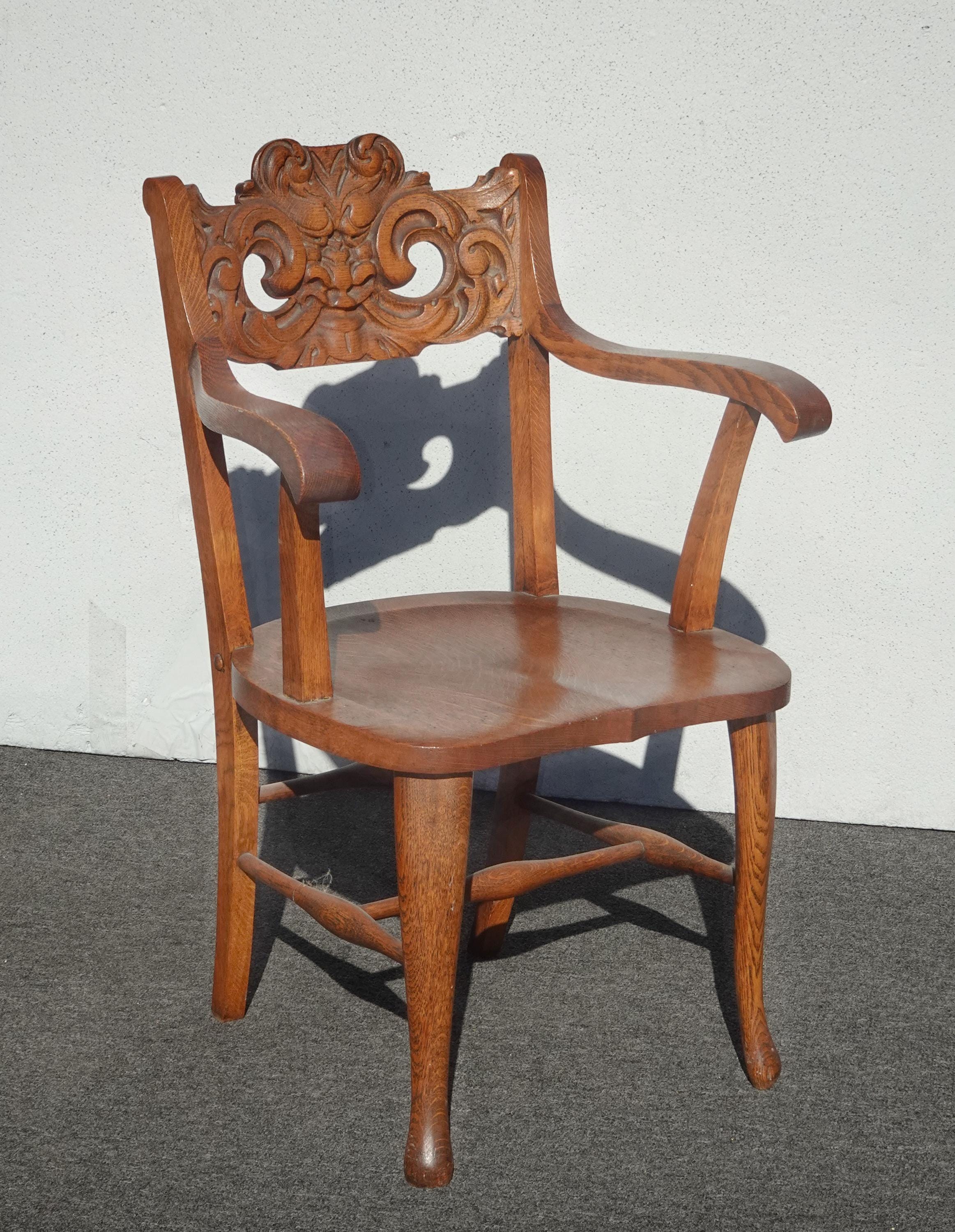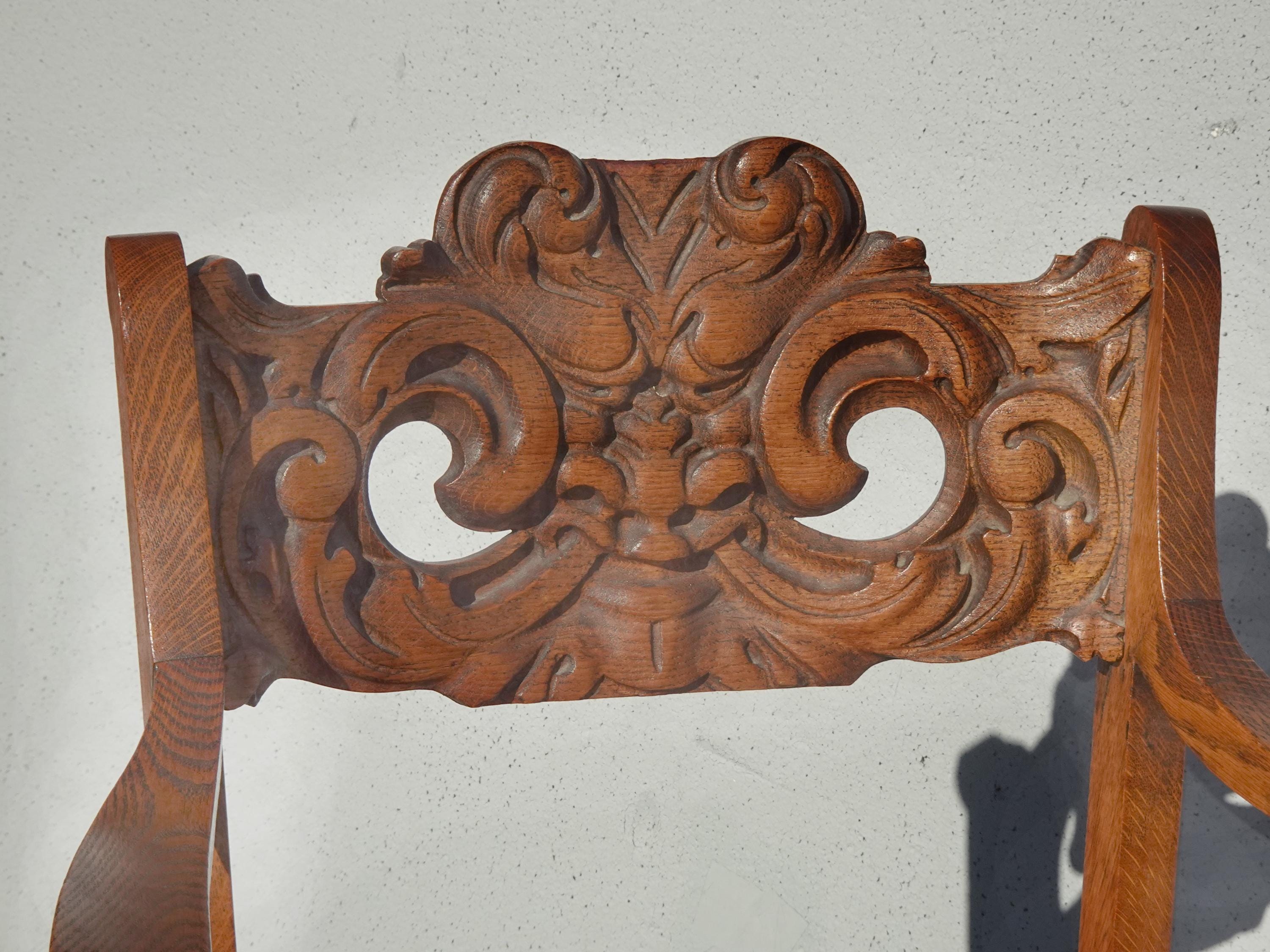 Vintage French Country Brown Oak Carved Arm Chair by Eldredge Co.