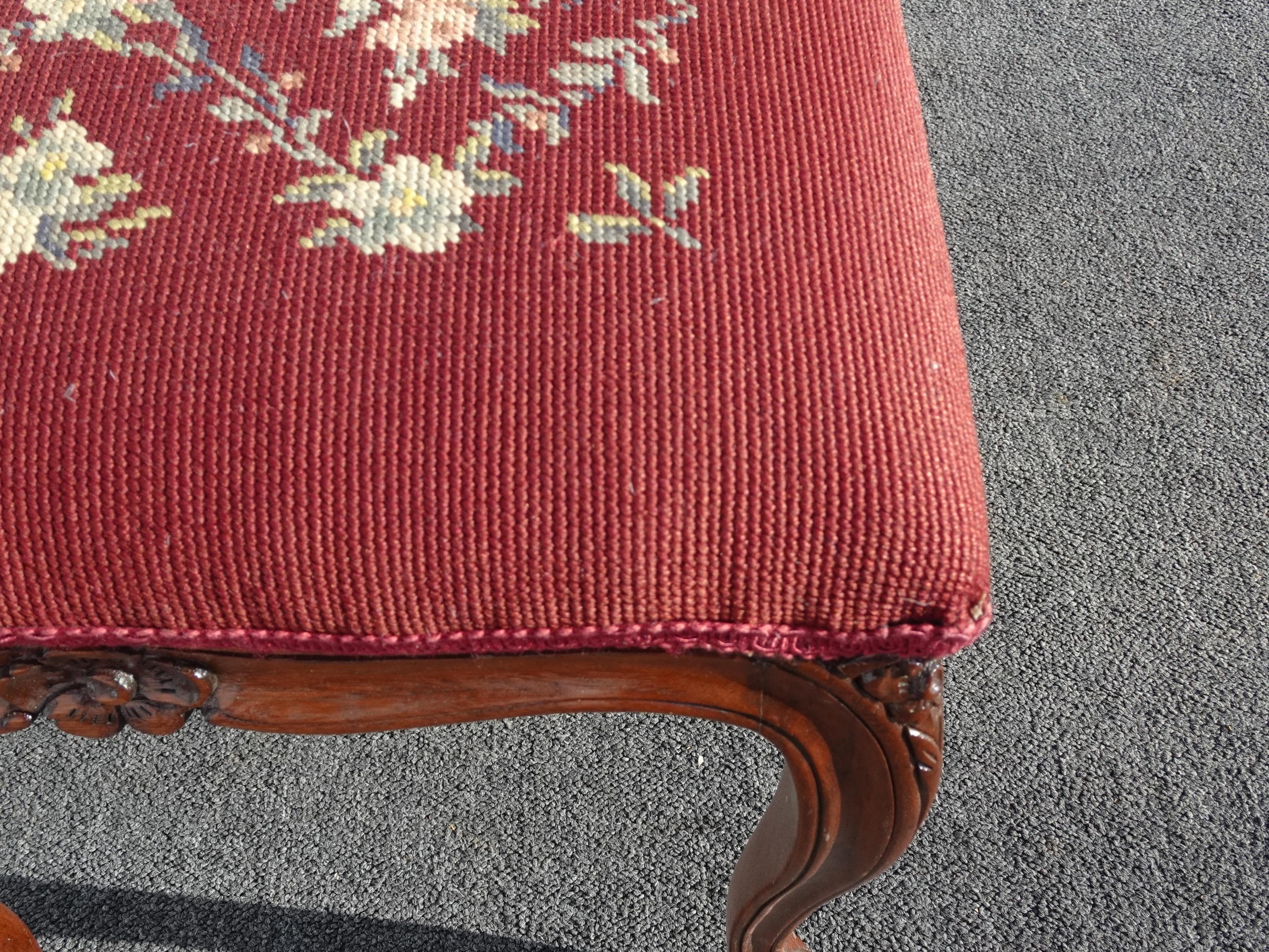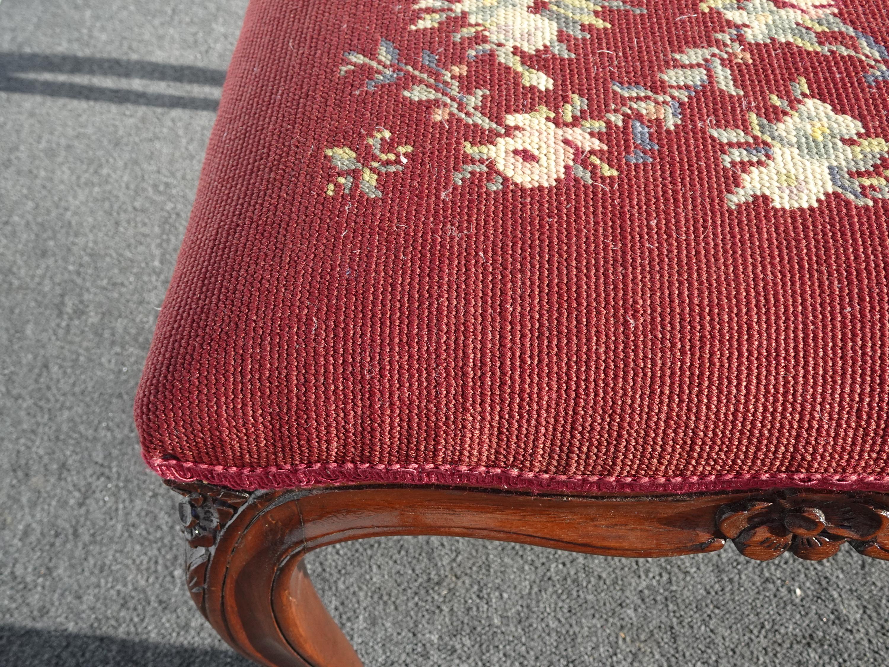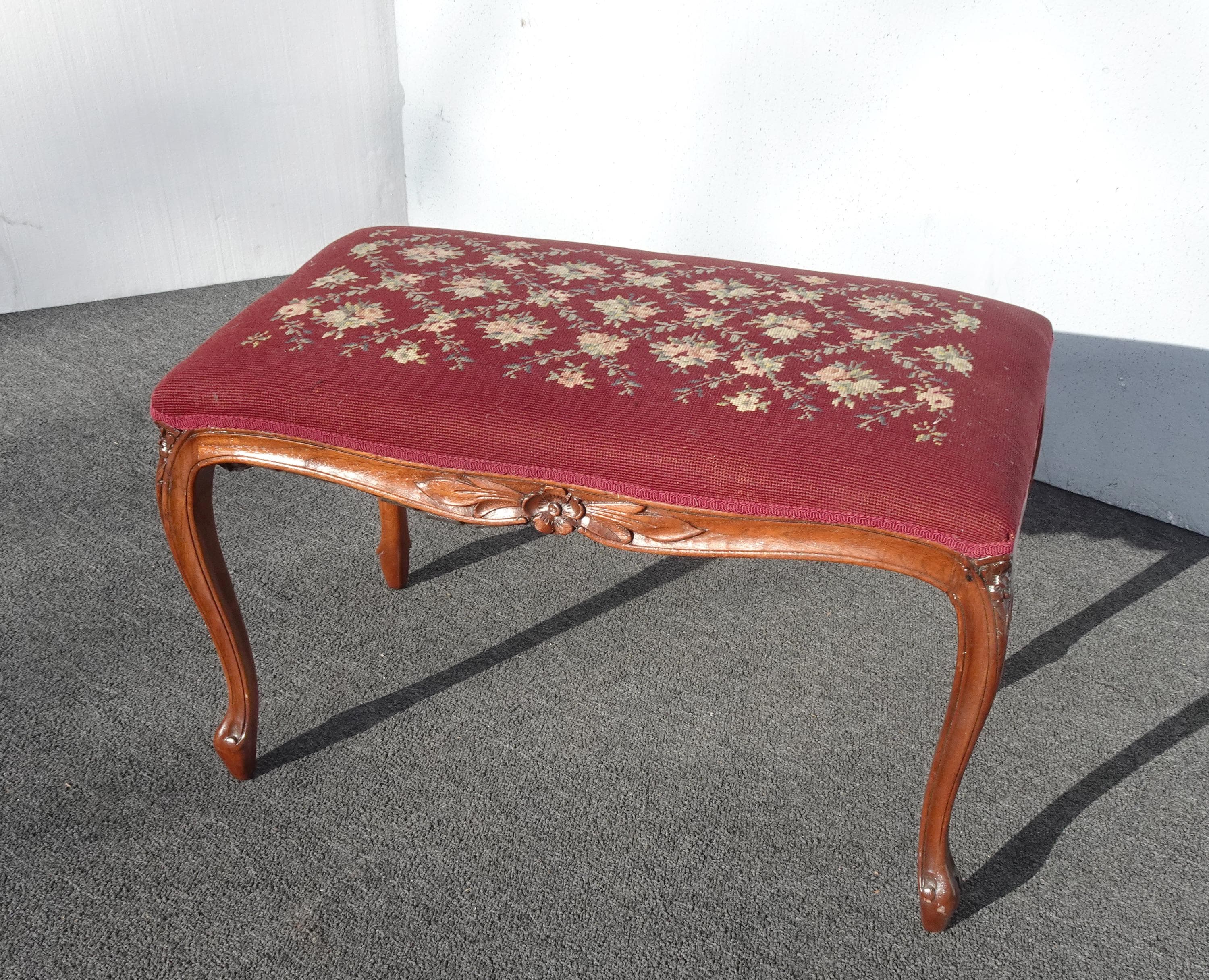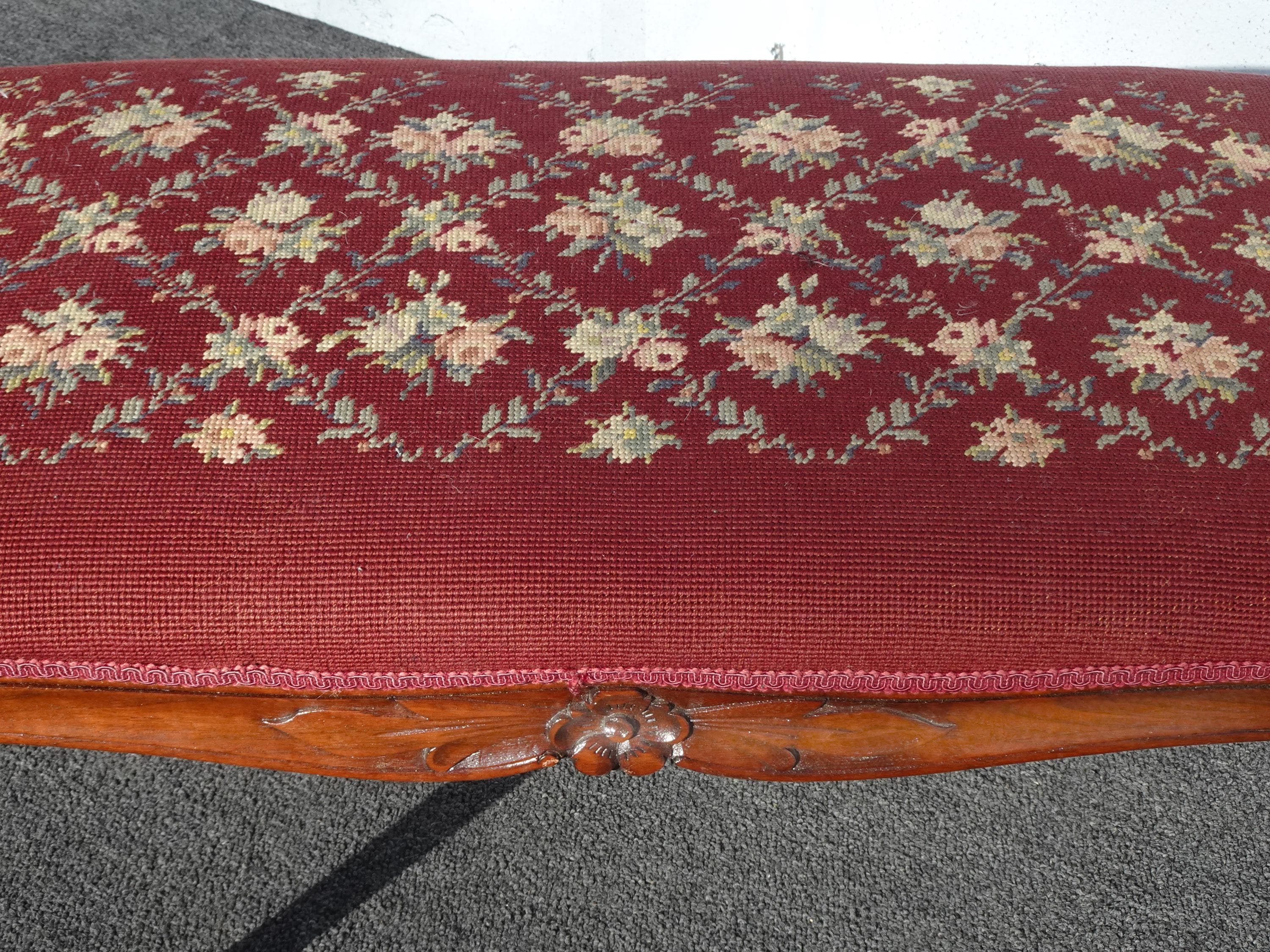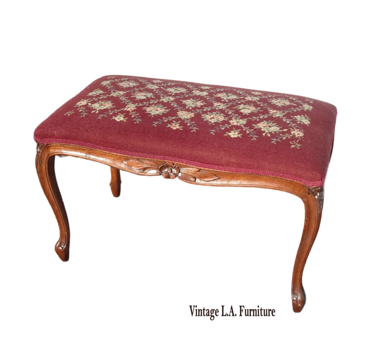 Vintage French Provincial Burgundy Needlepoint Tapestry Bench w Floral Design