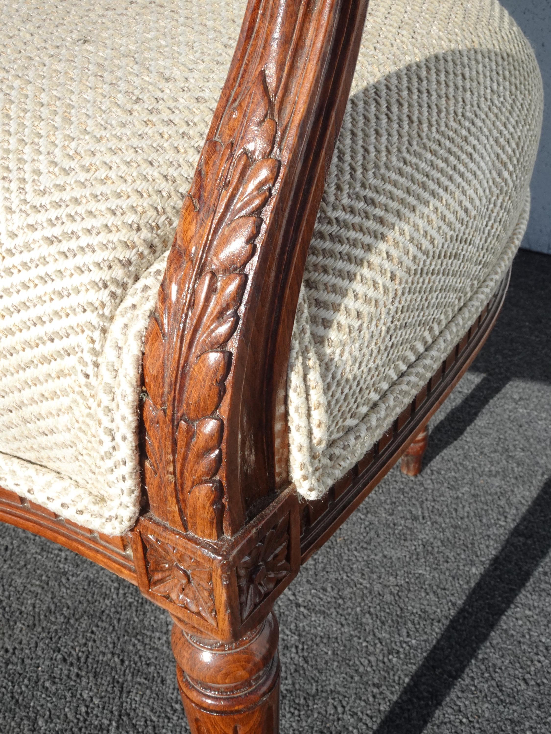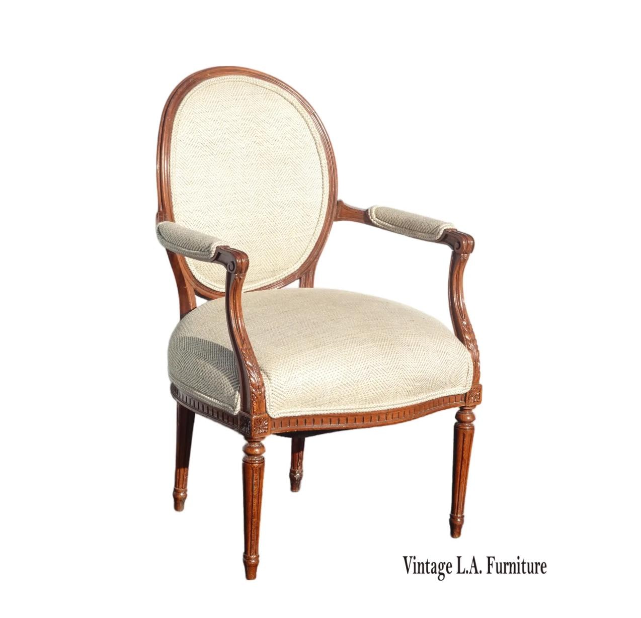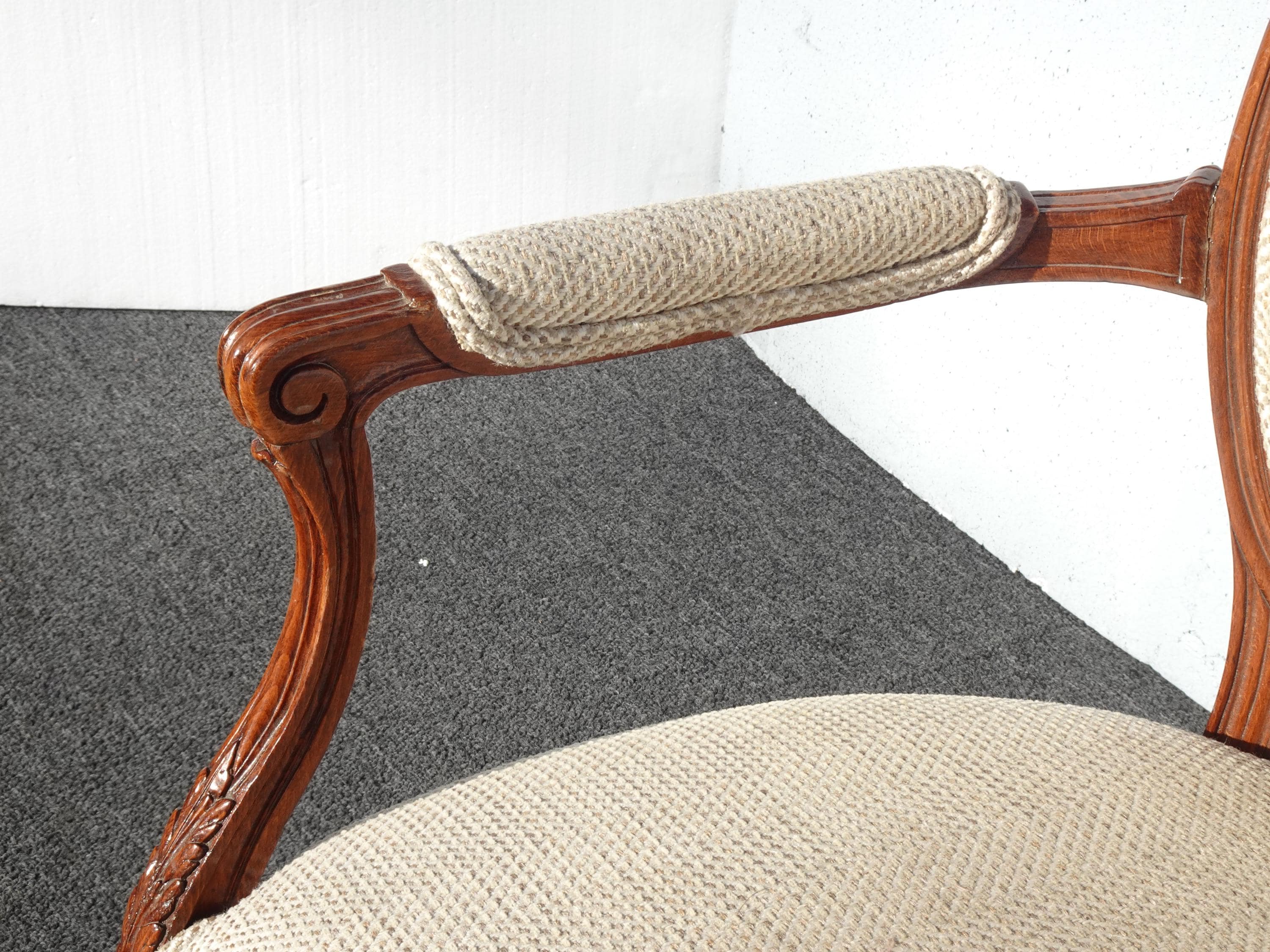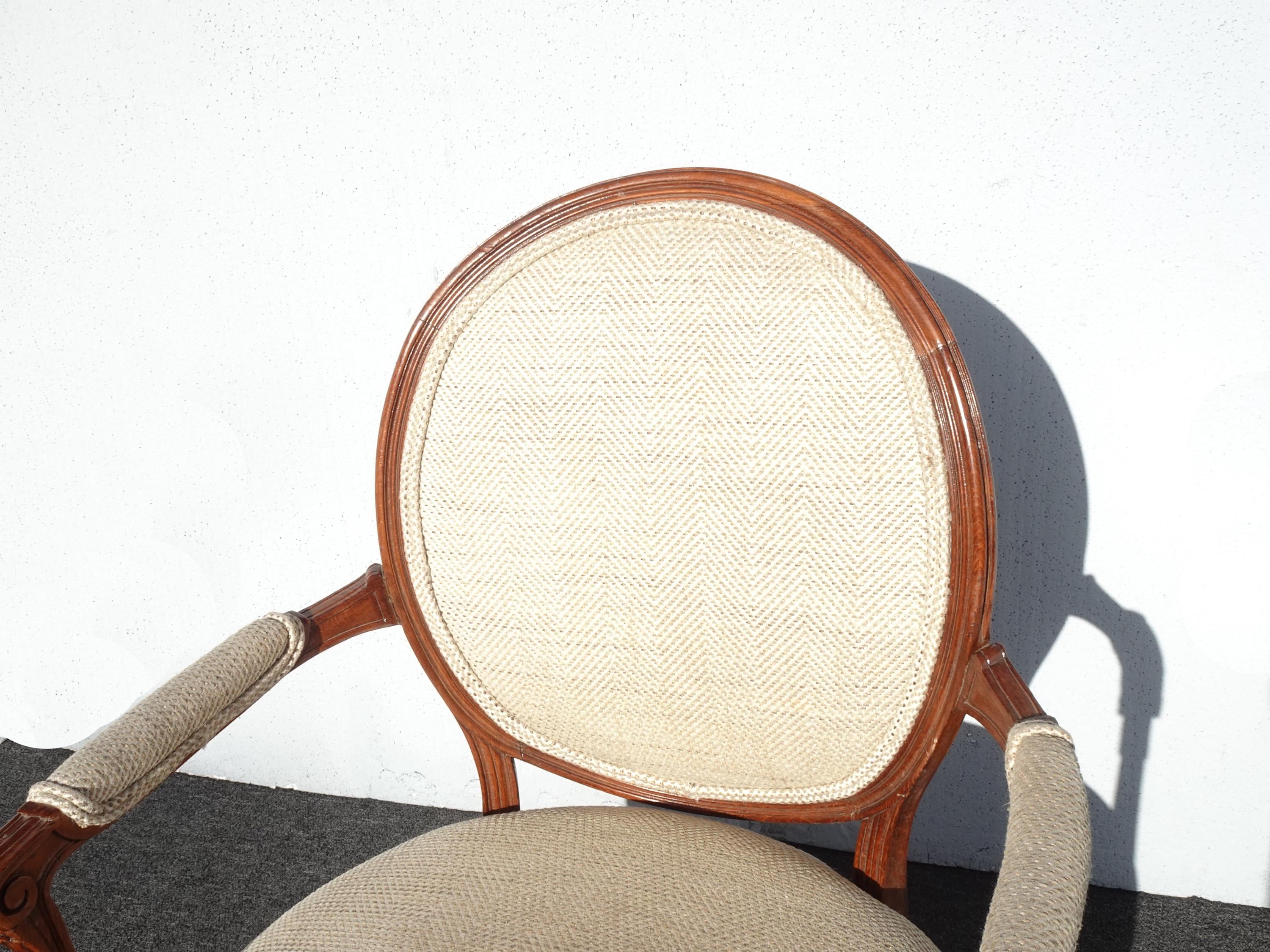 Vintage French Provincial Burlap Linen Side Arm Chair w Ornate Frame