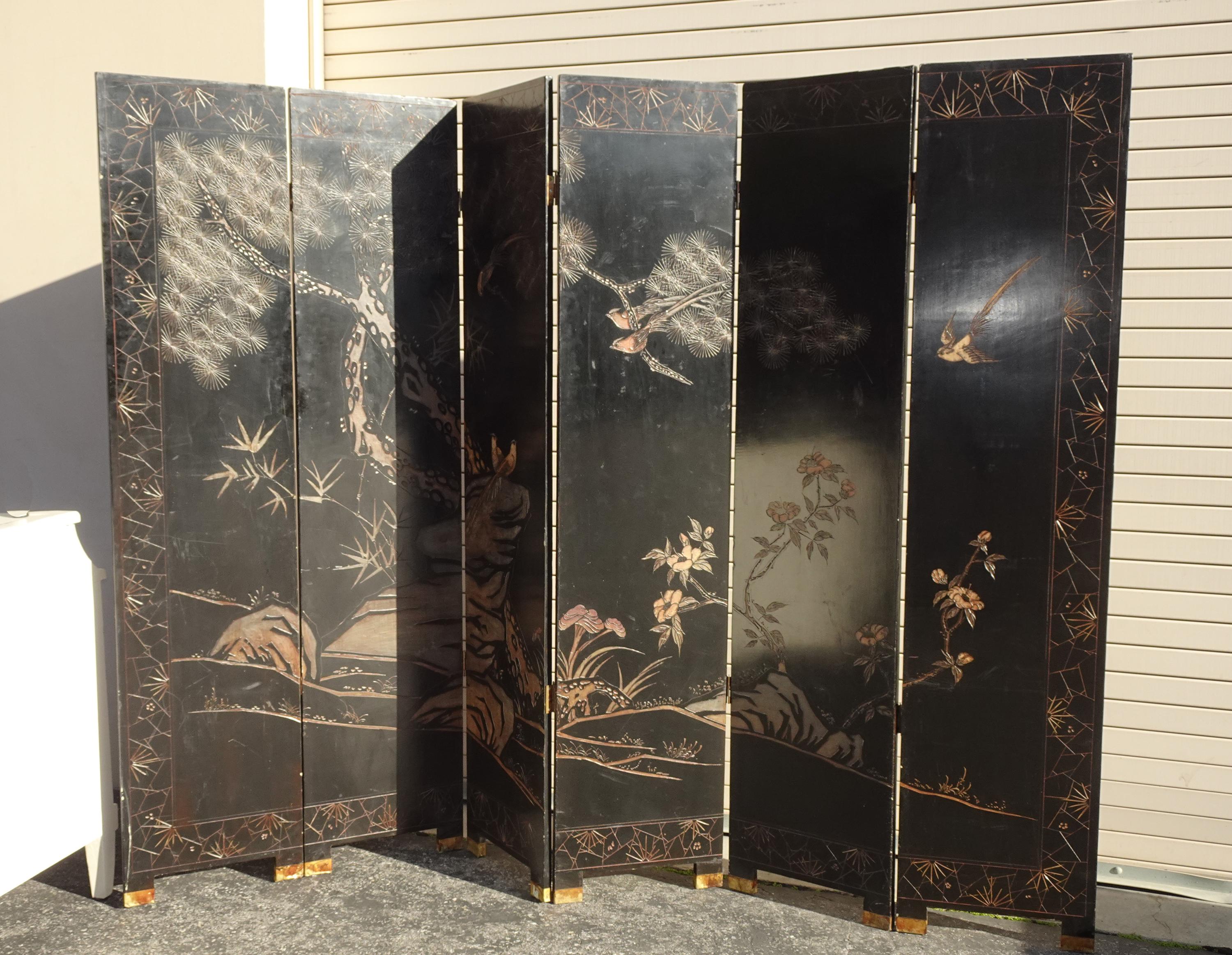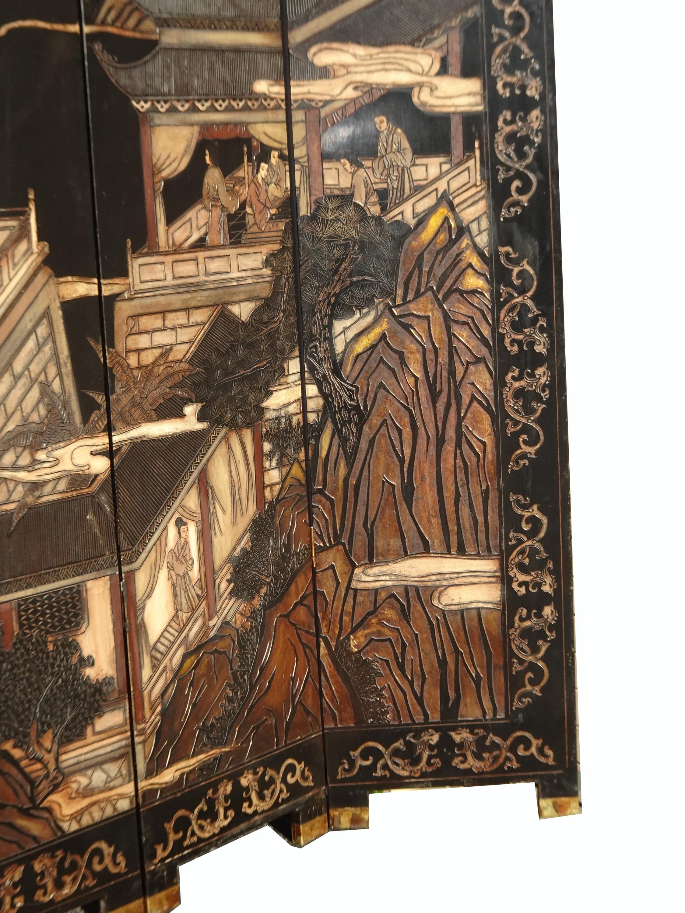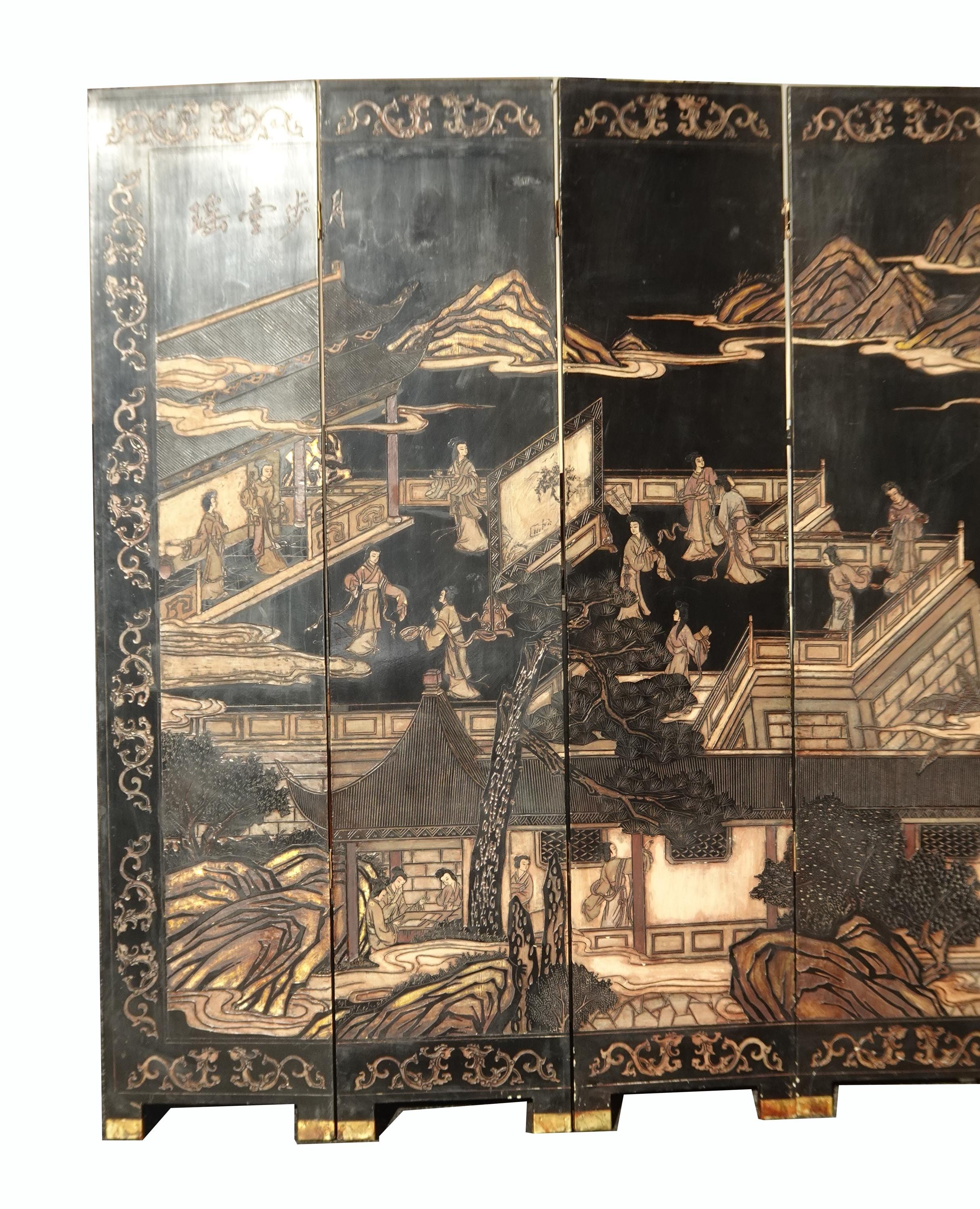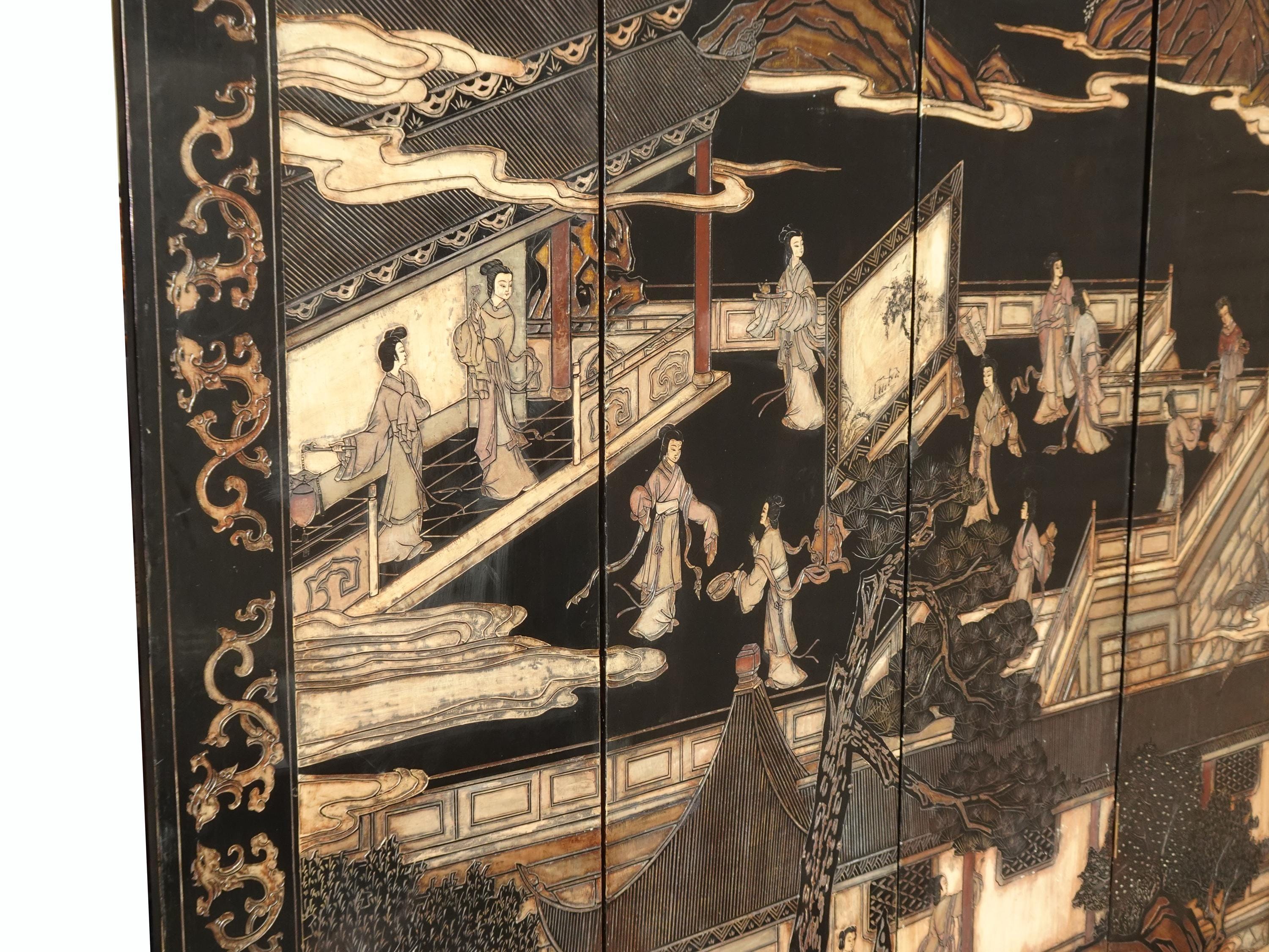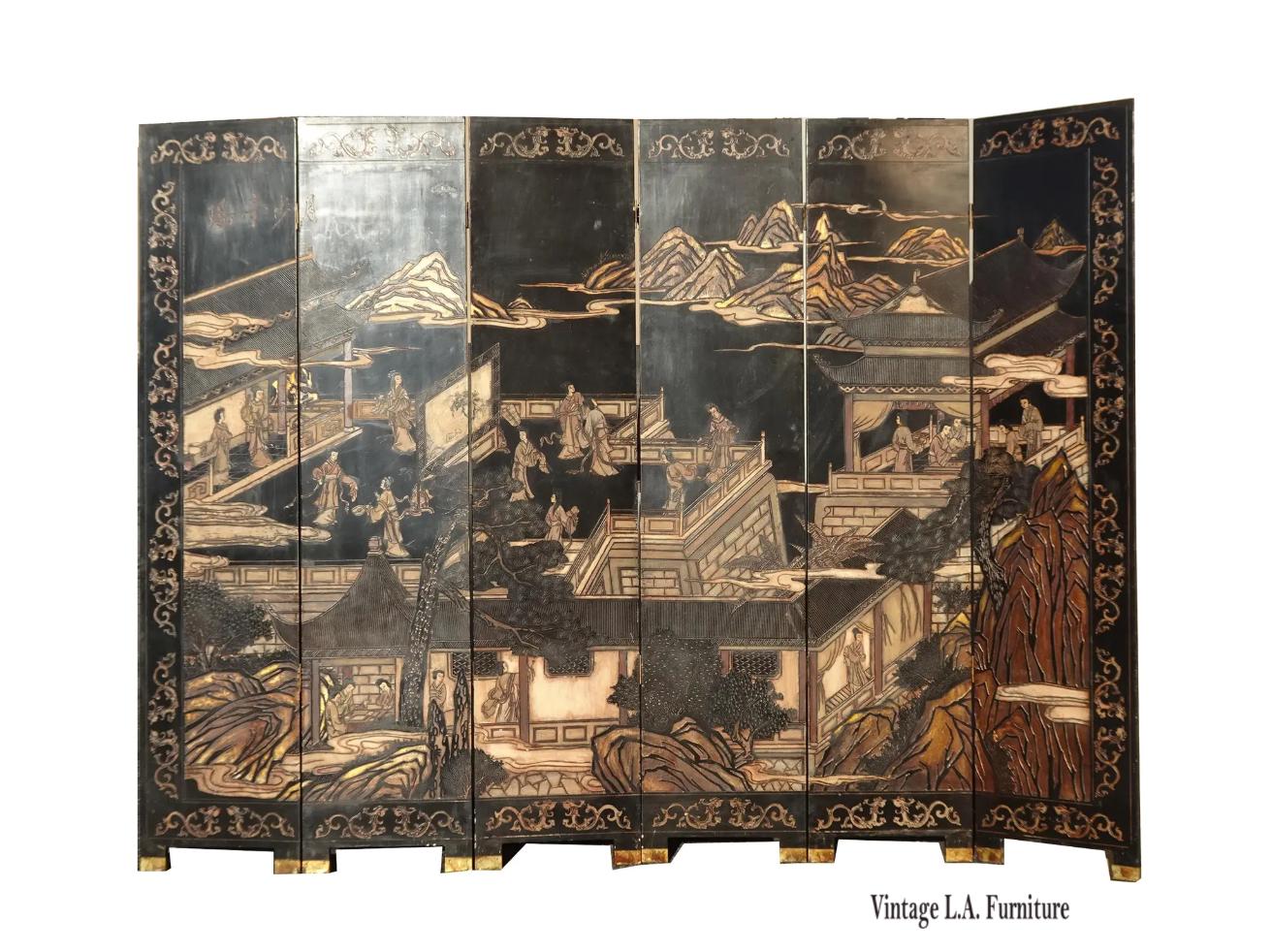 Vintage Oriental Asian Palace City Coromandel Chinoiserie Black Six Panel Screen