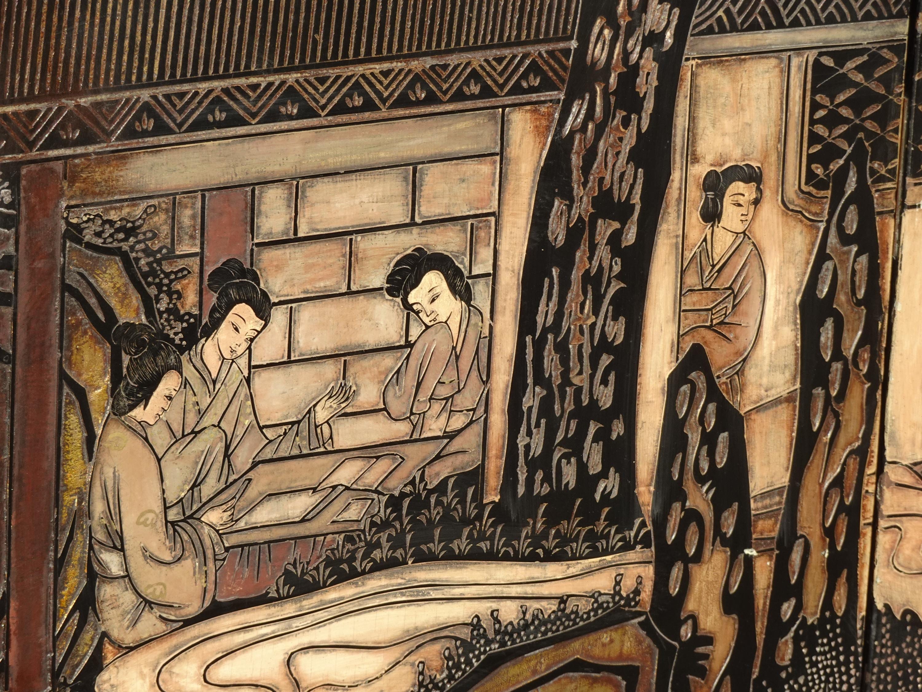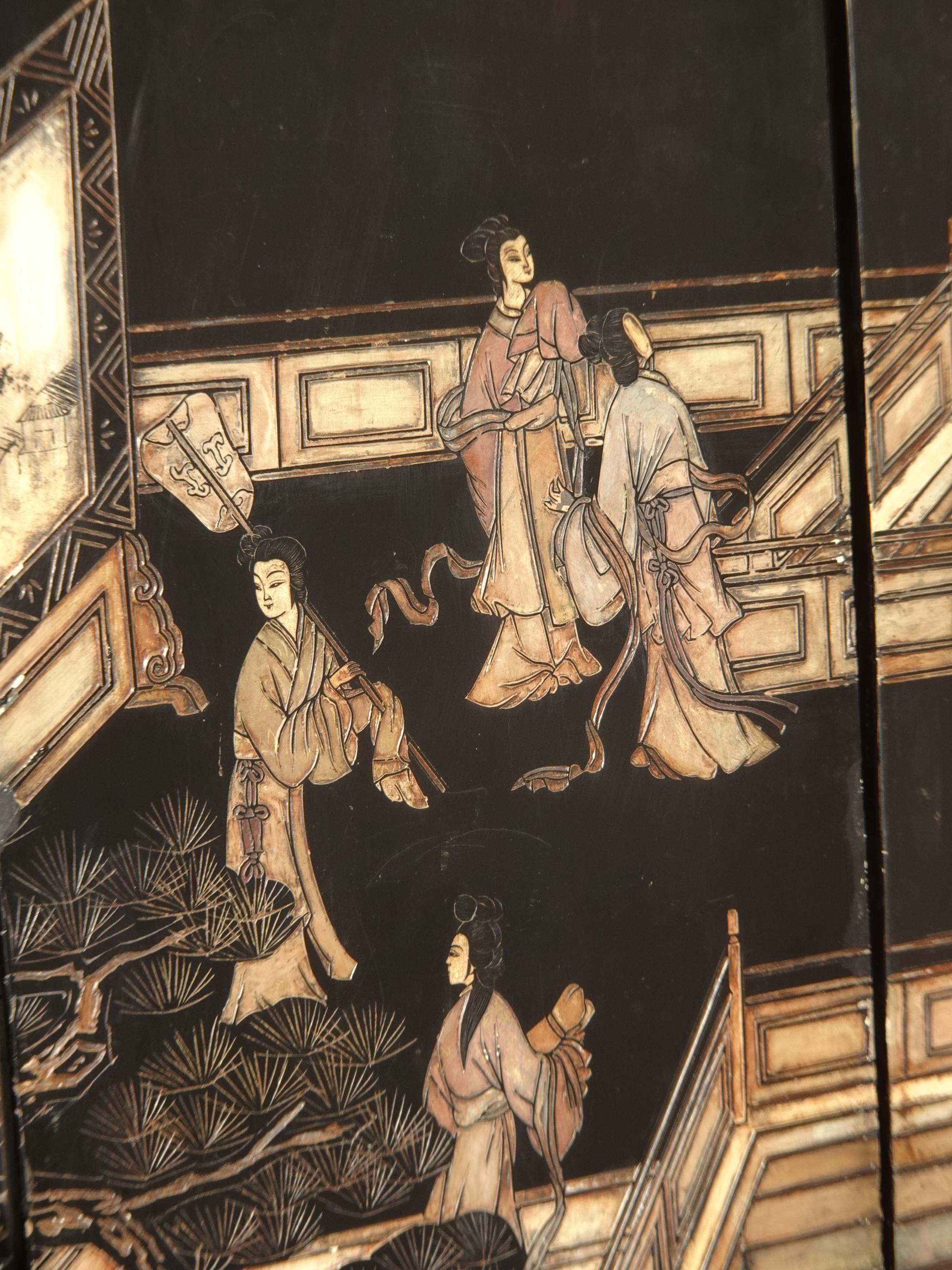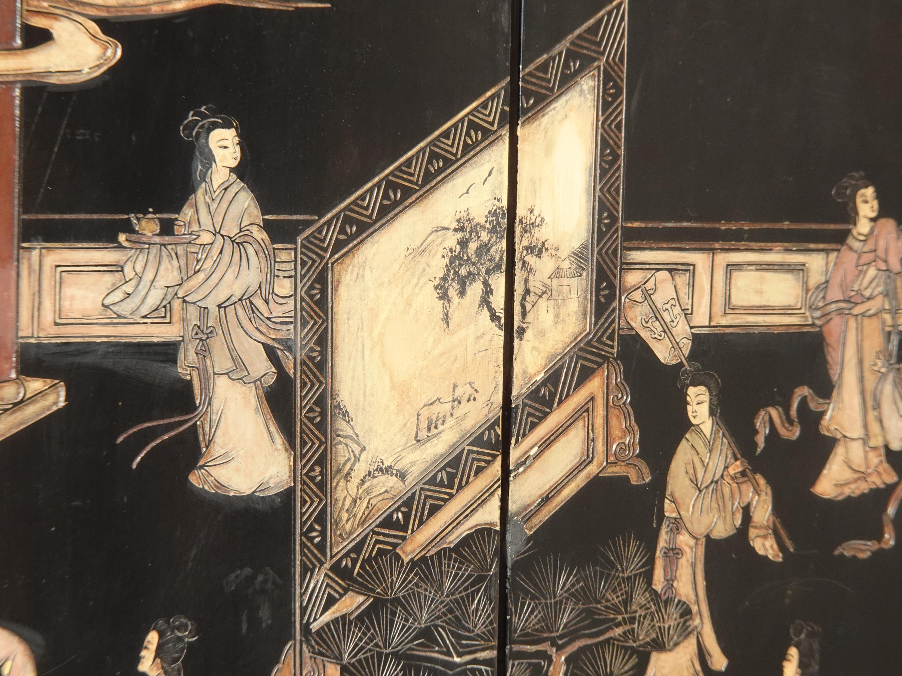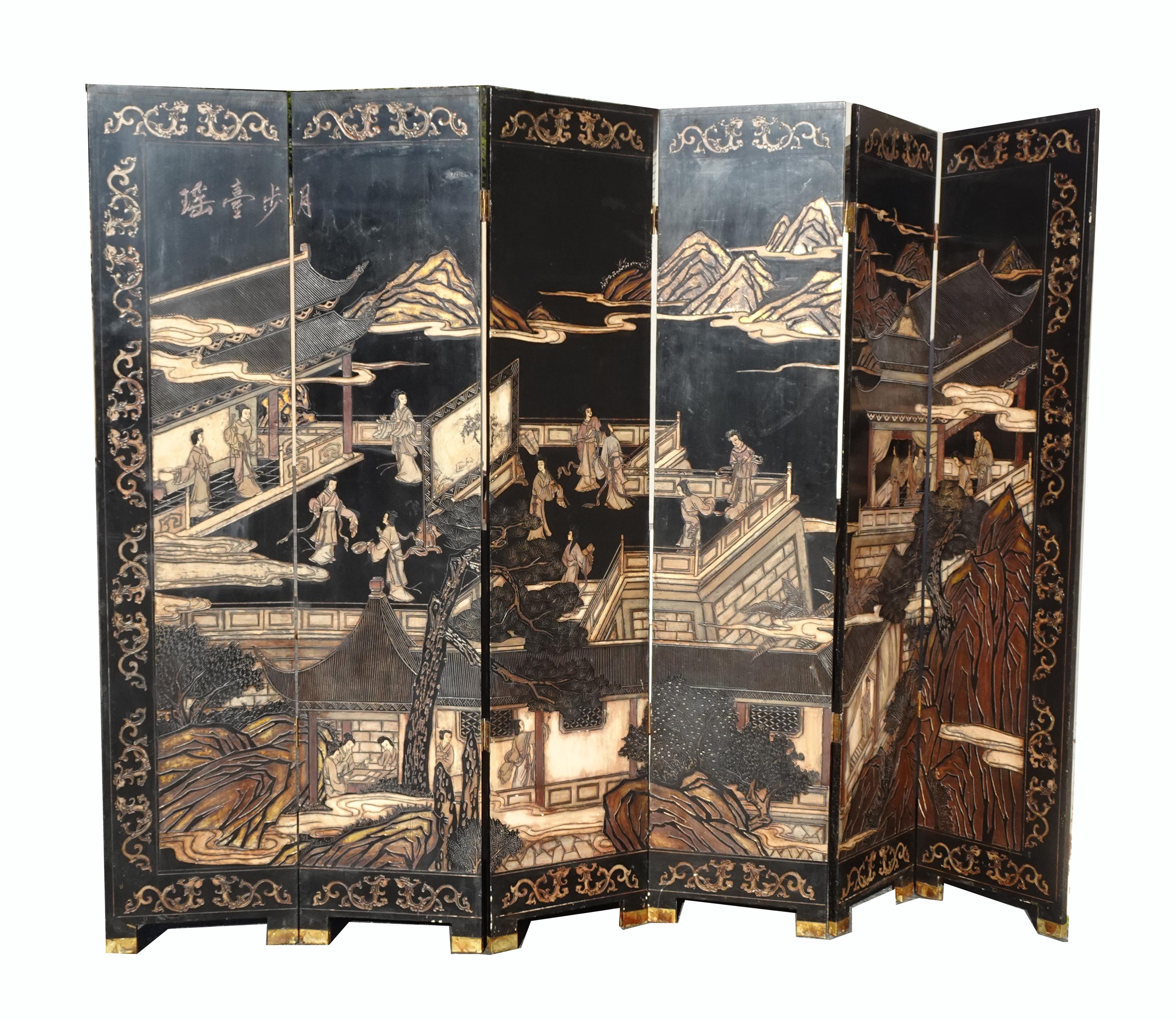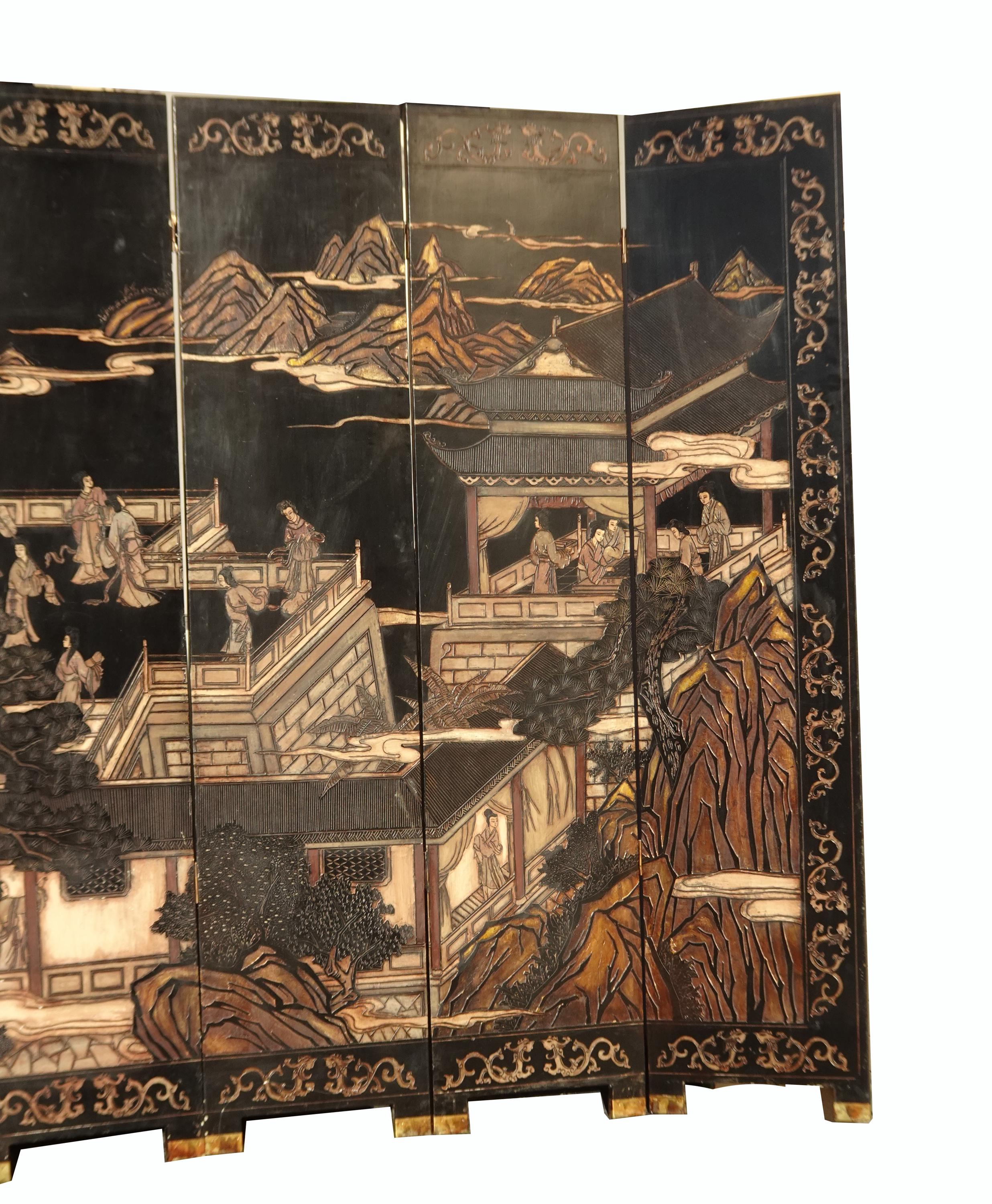 Vintage Oriental Asian Palace City Coromandel Chinoiserie Black Six Panel Screen