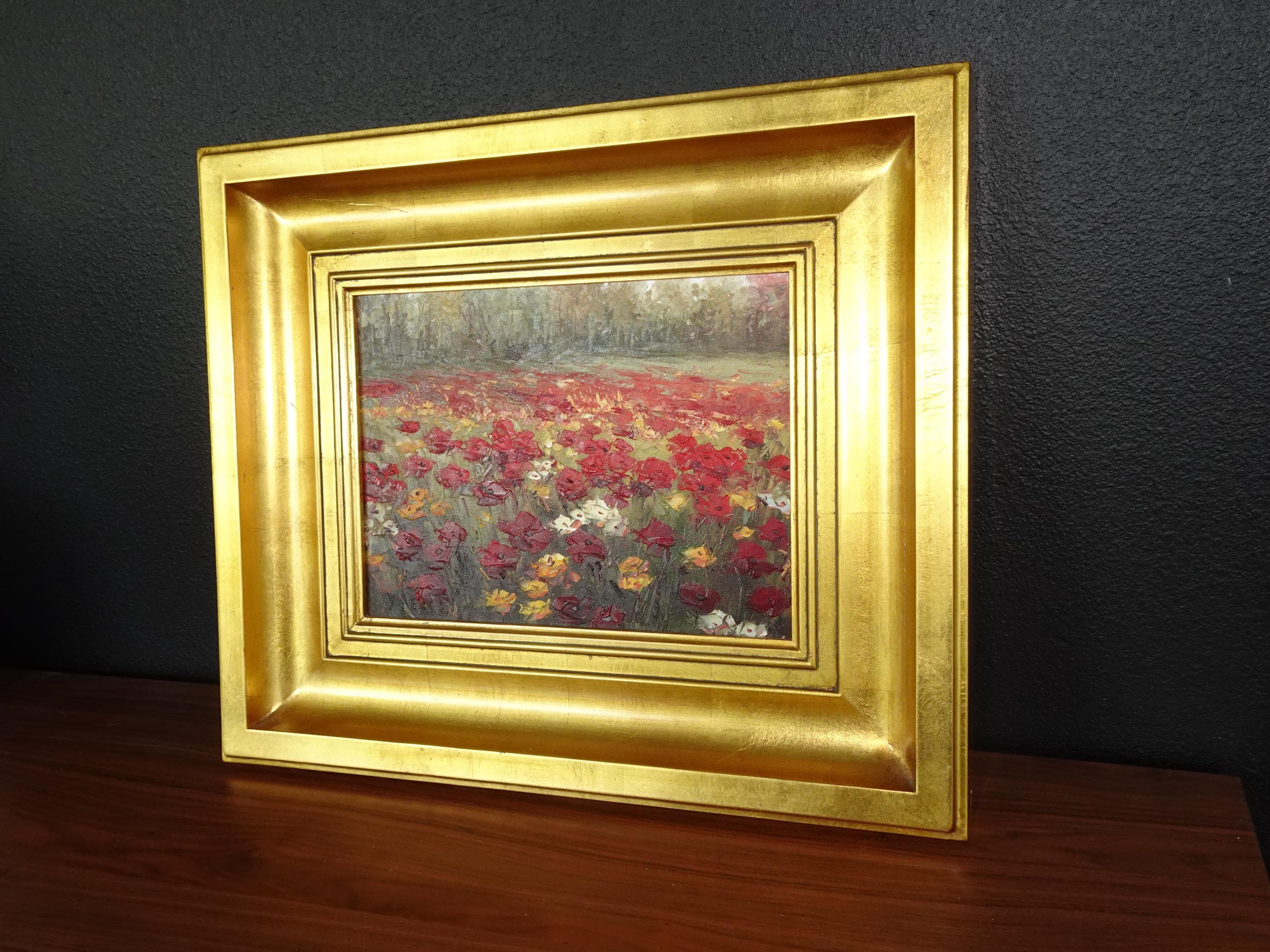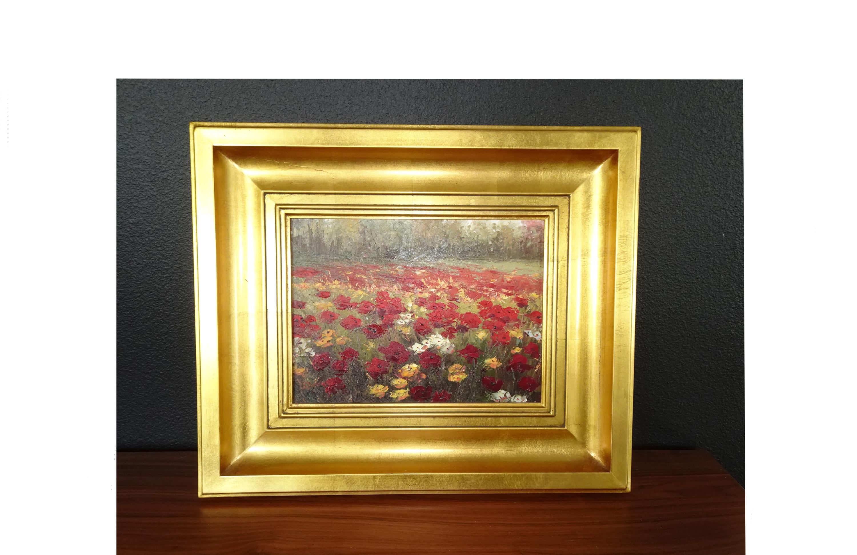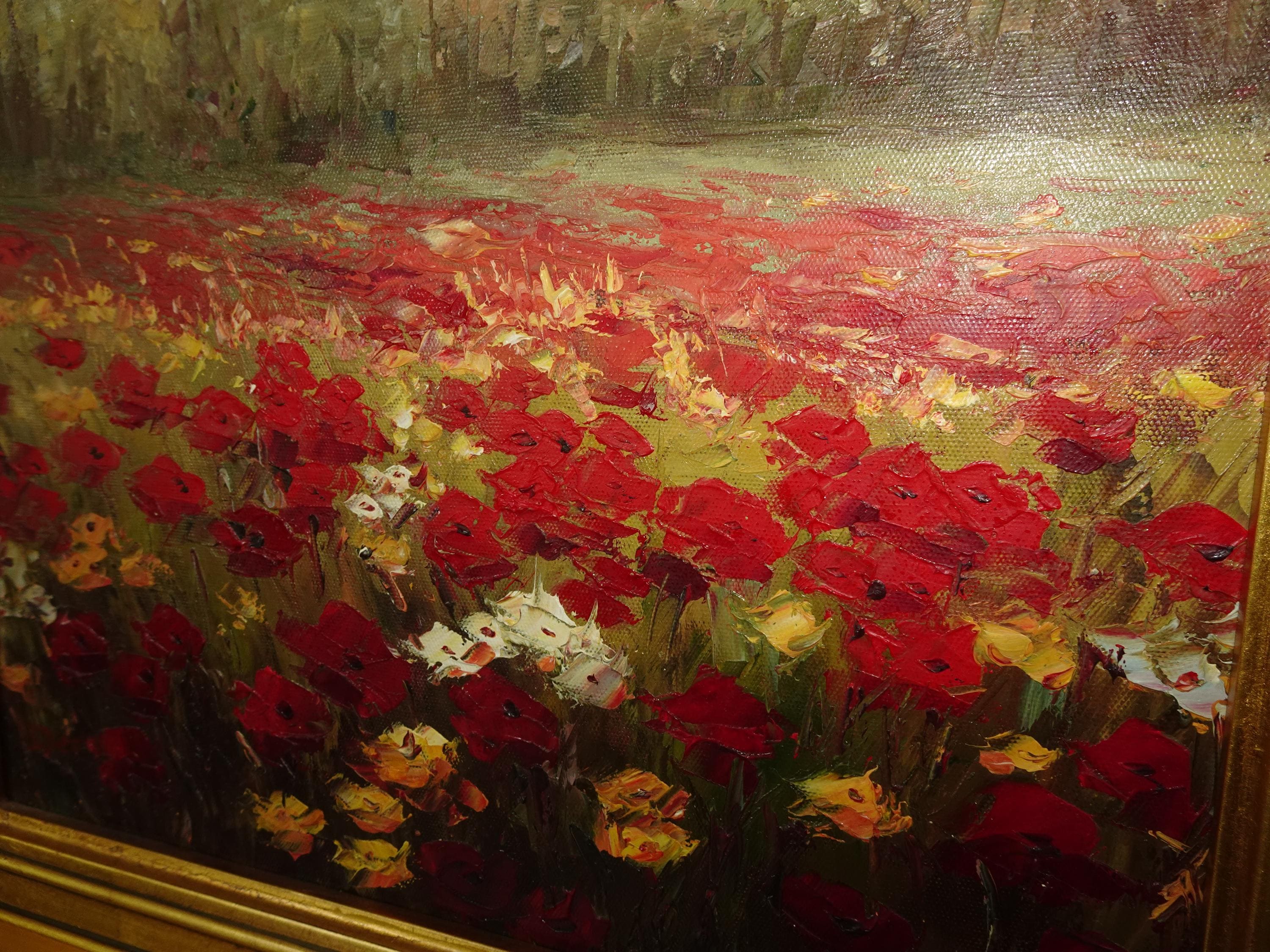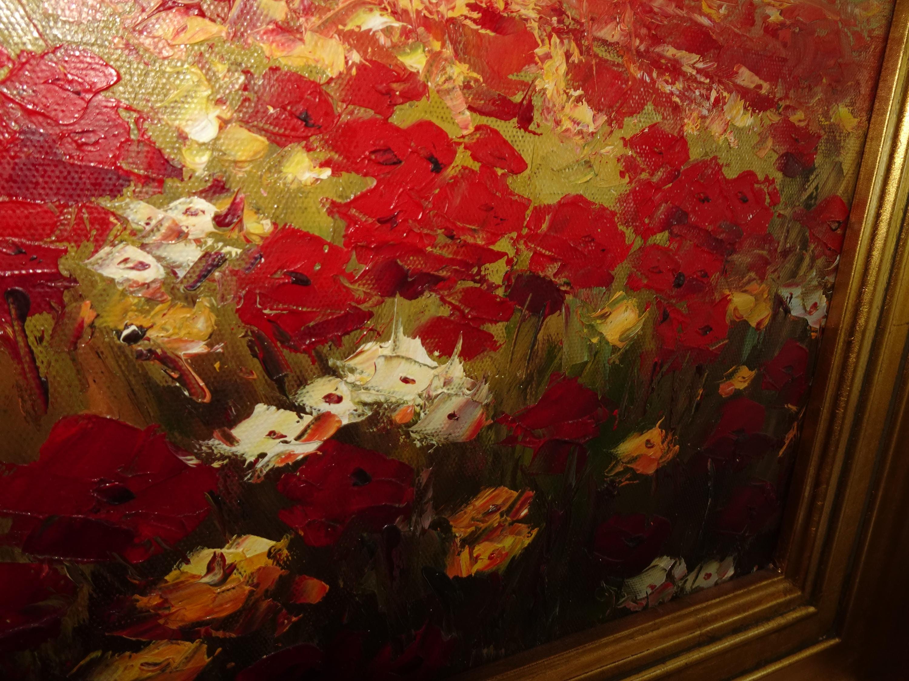 Vintage Oil on Canvas Red Field of Flowers Painting Picture in Gold Frame