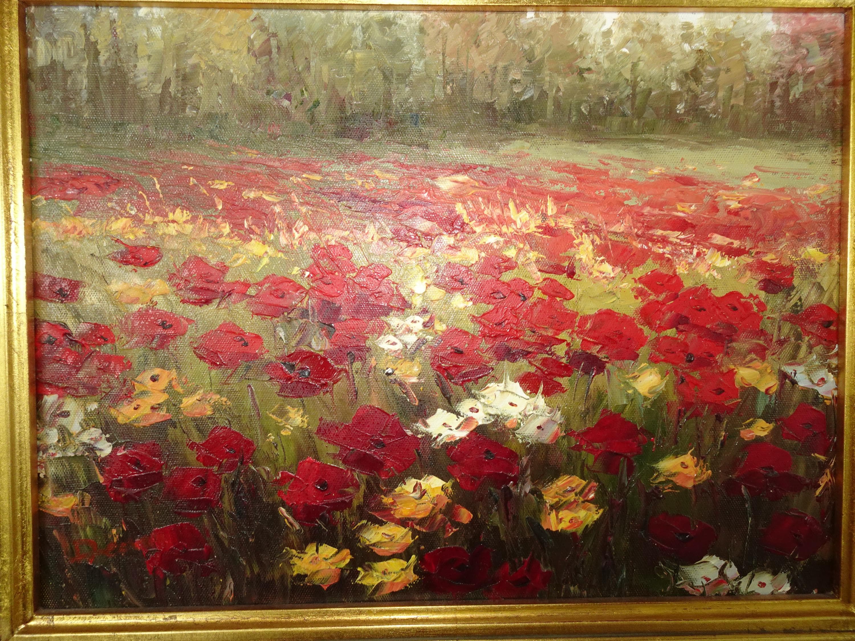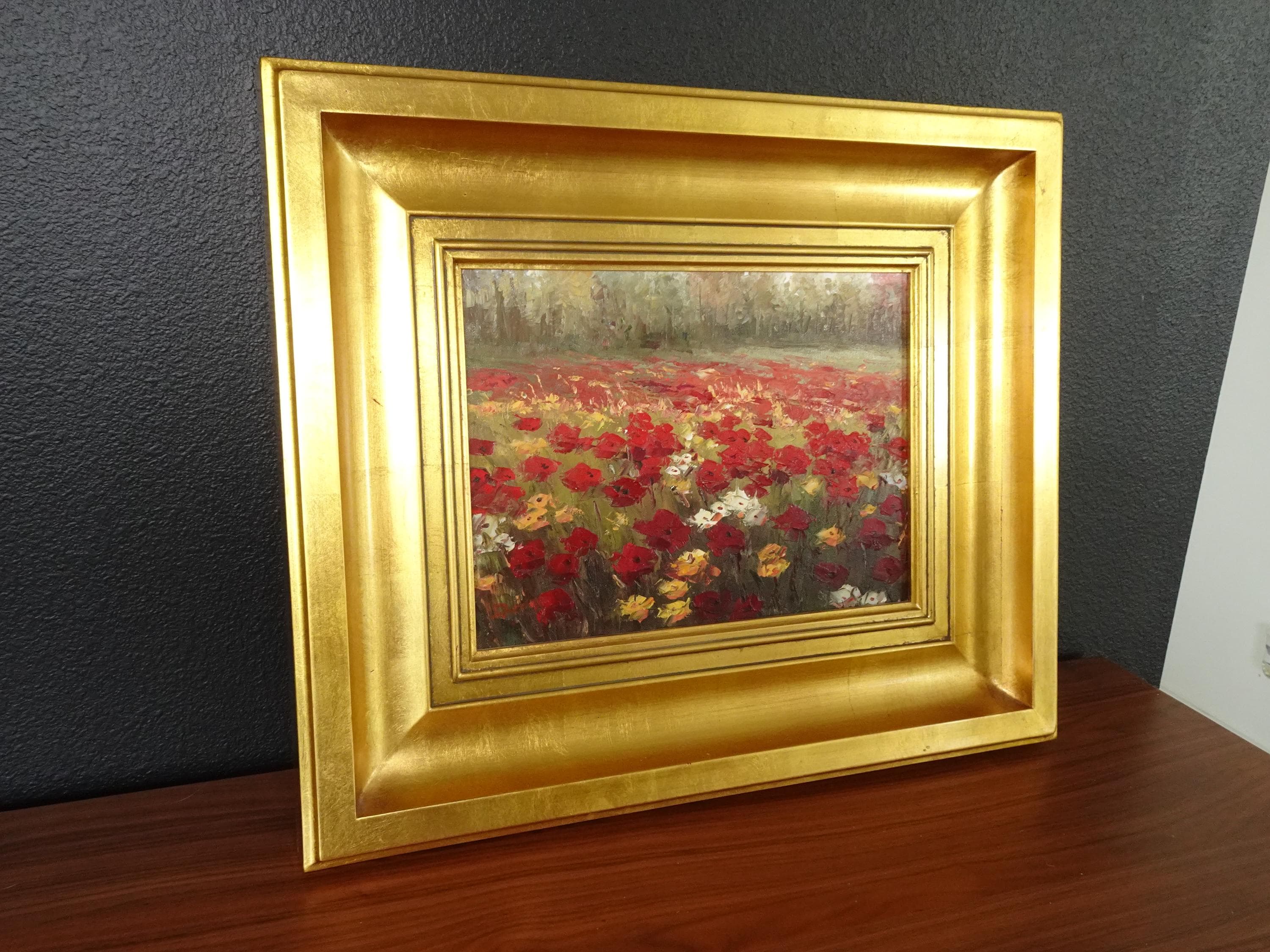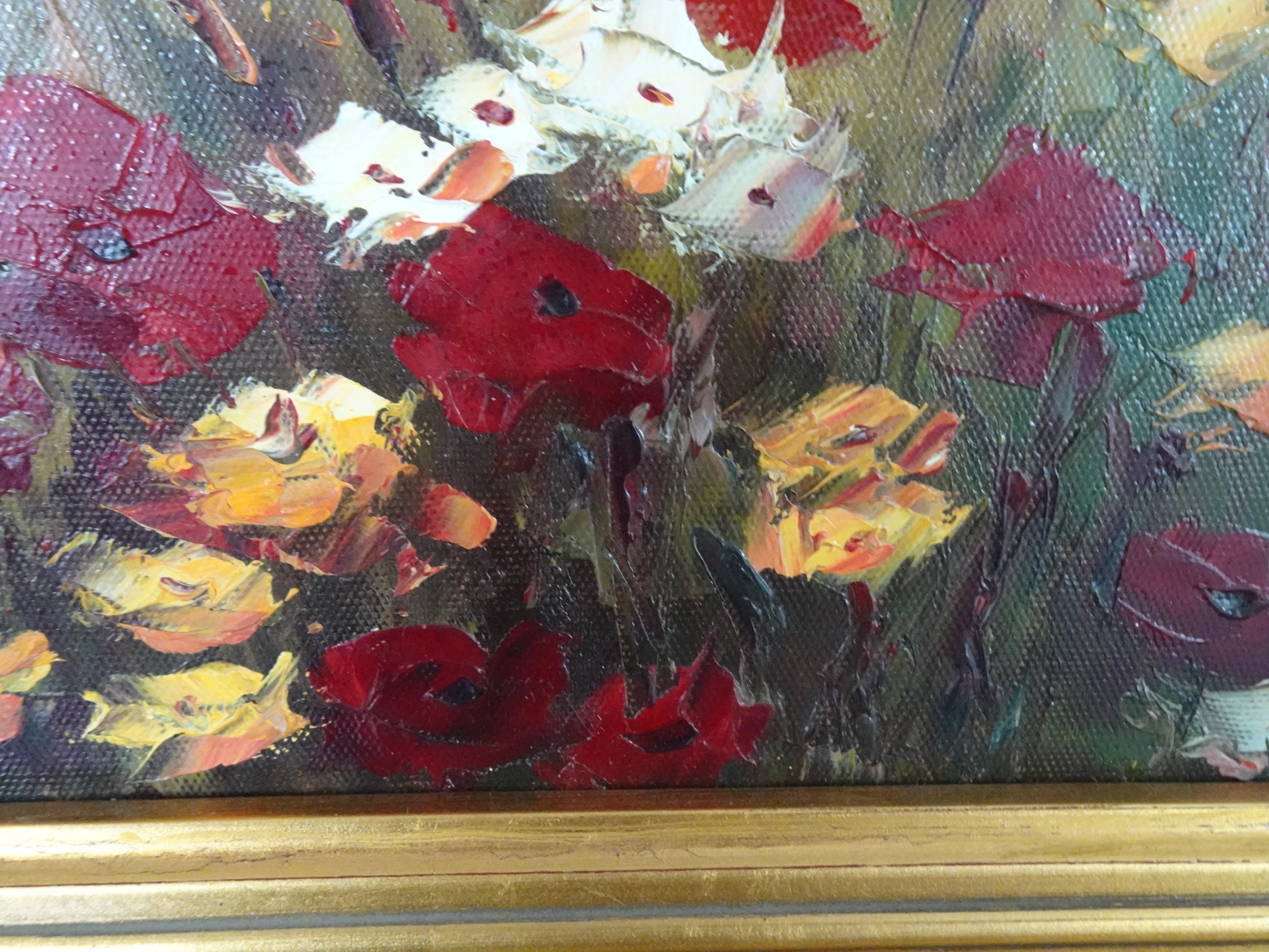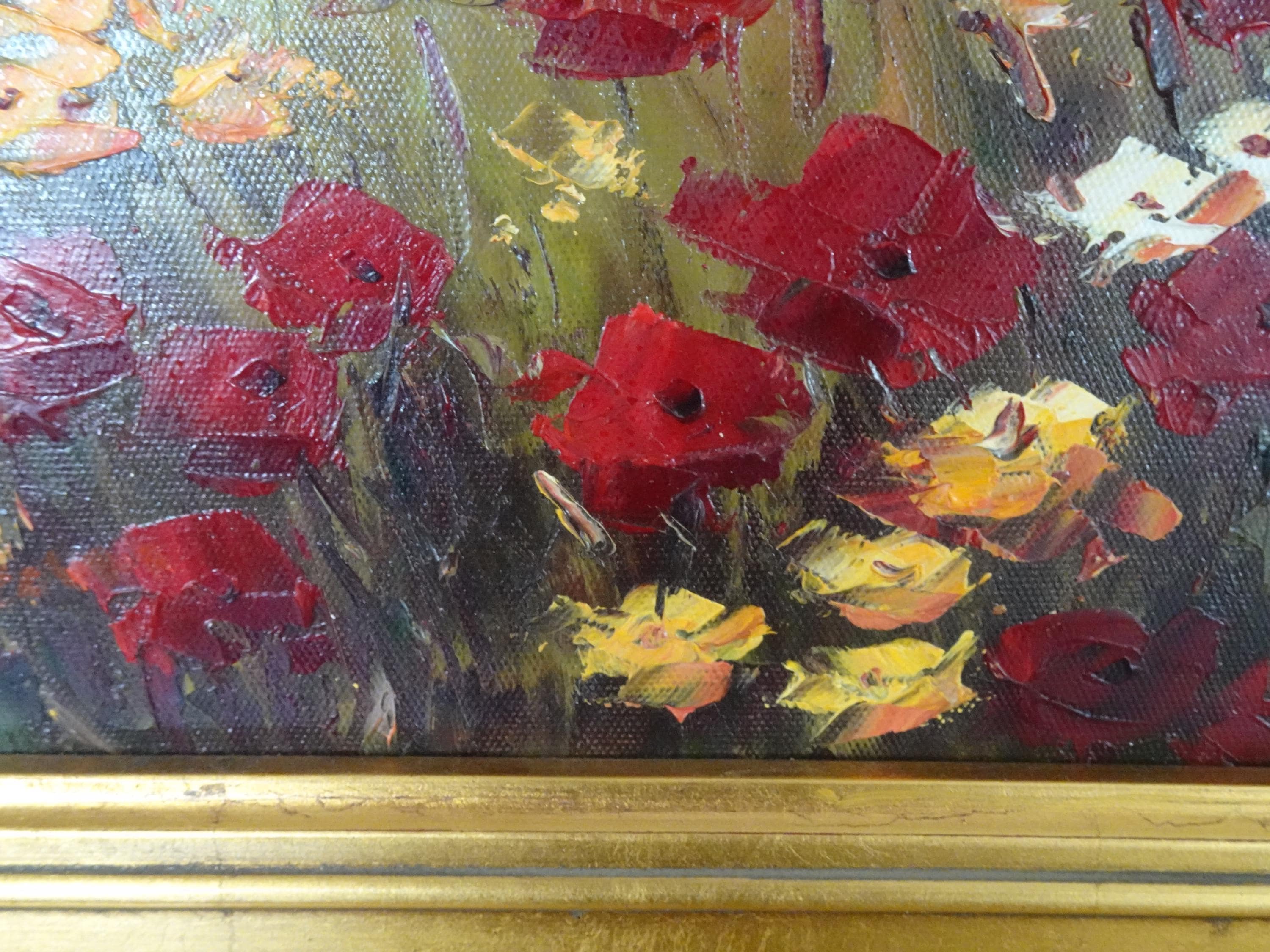 Vintage Oil on Canvas Red Field of Flowers Painting Picture in Gold Frame