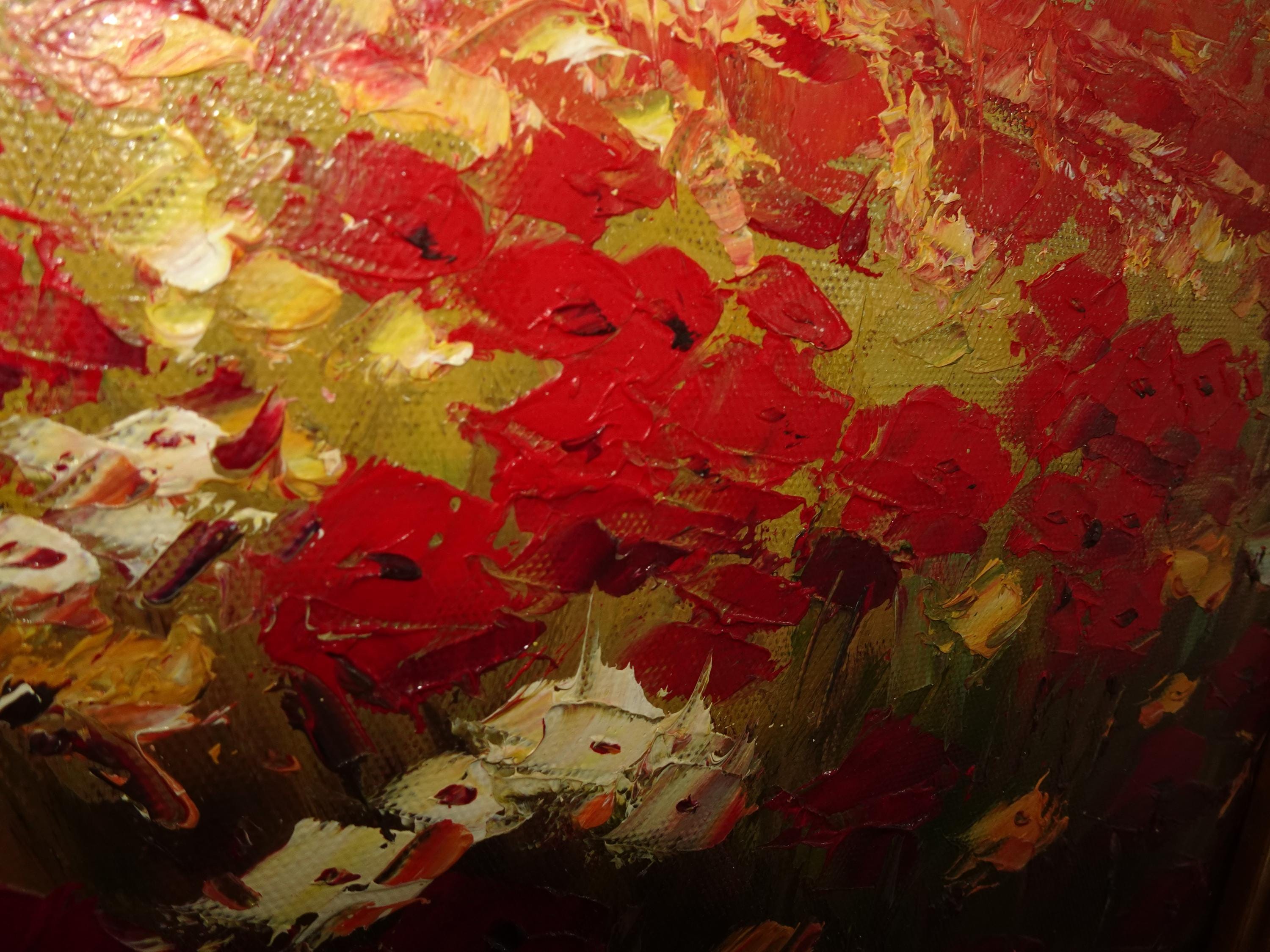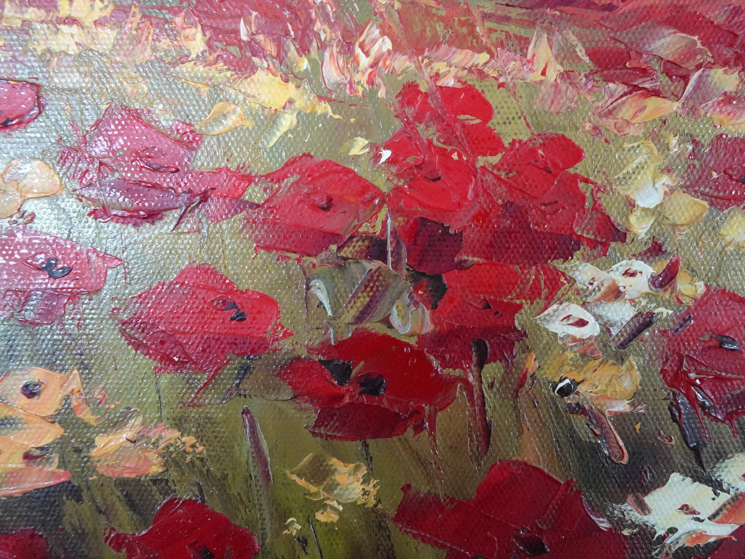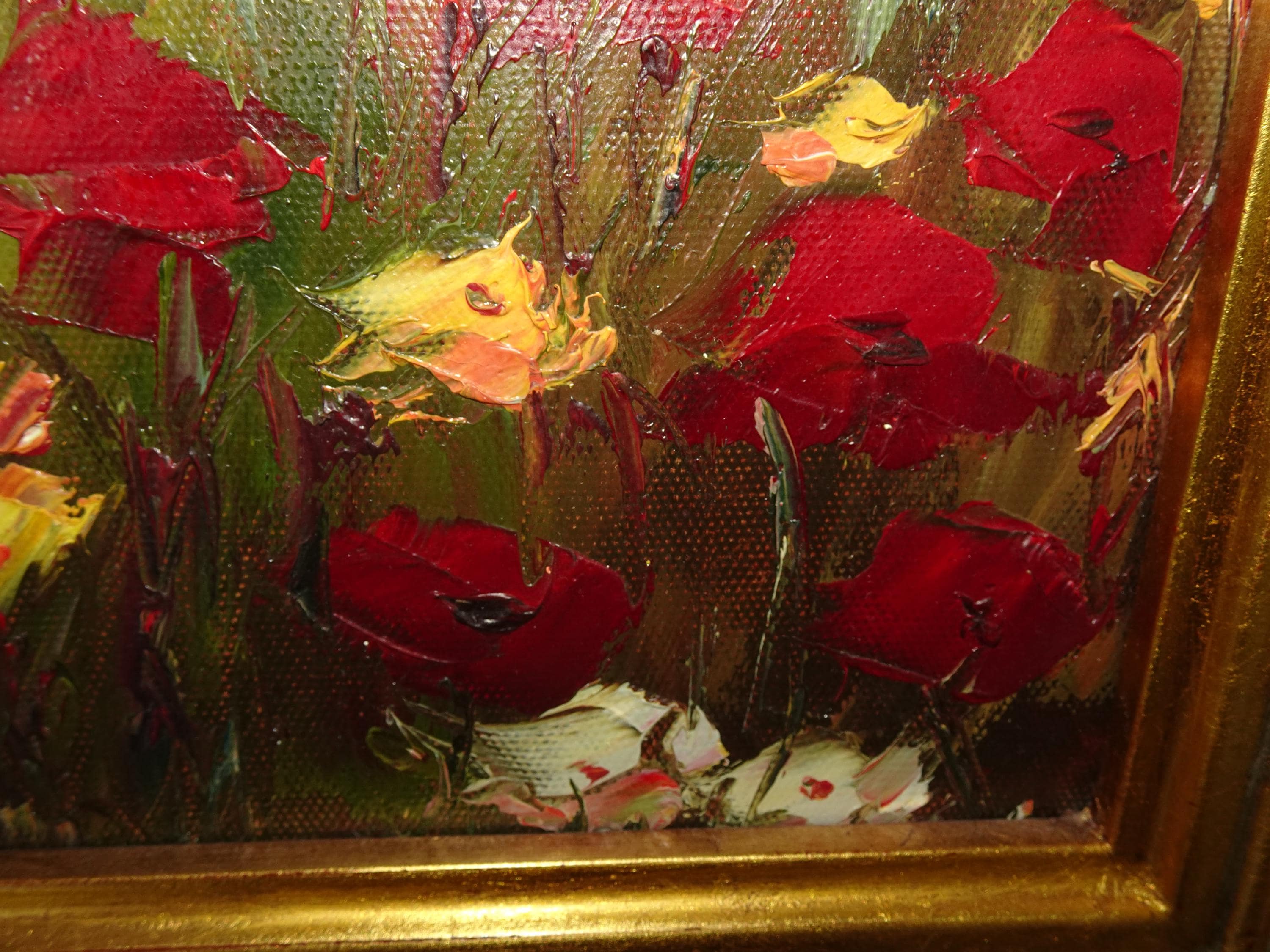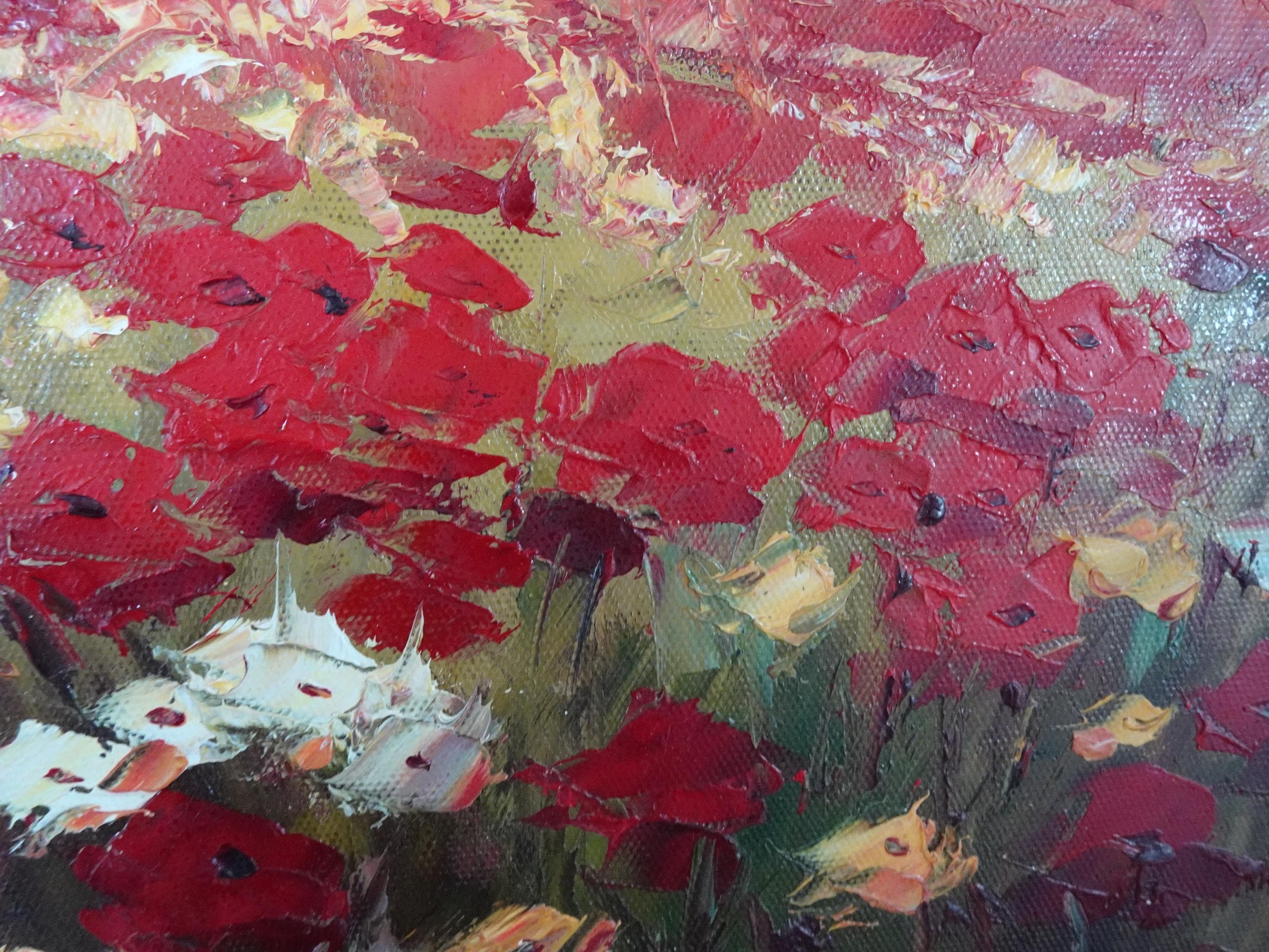 Vintage Oil on Canvas Red Field of Flowers Painting Picture in Gold Frame