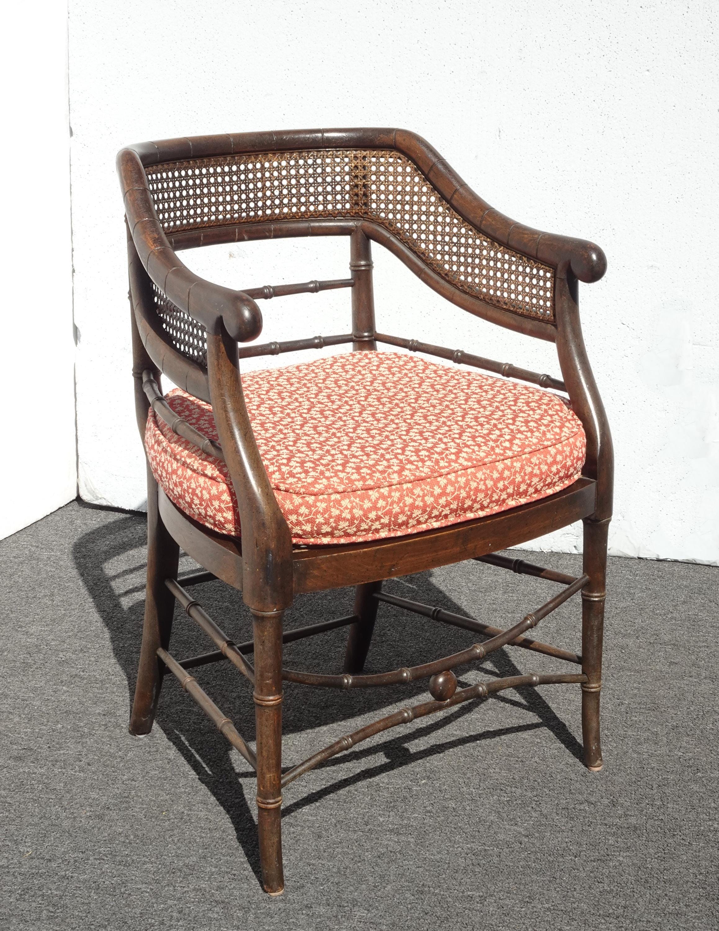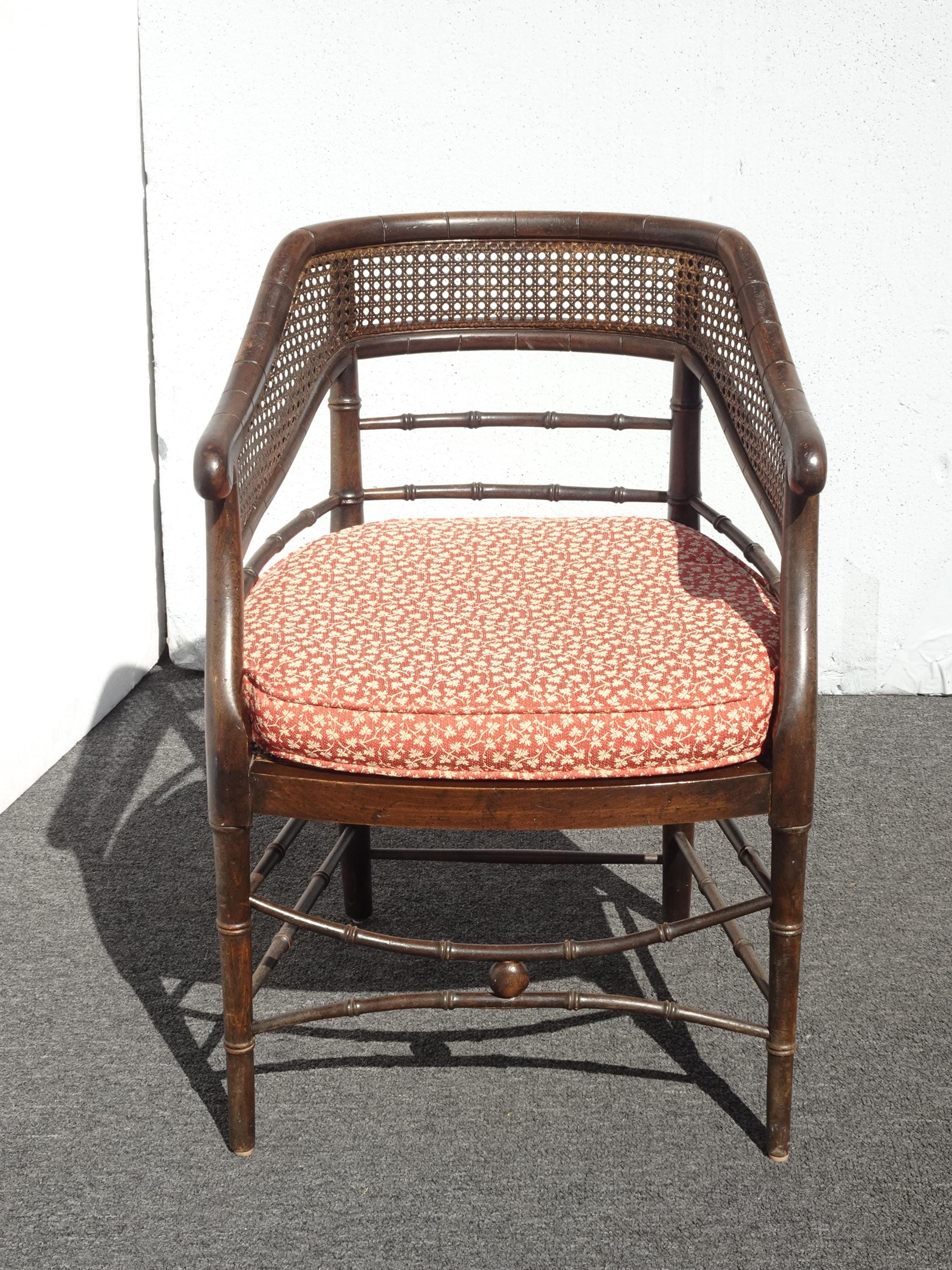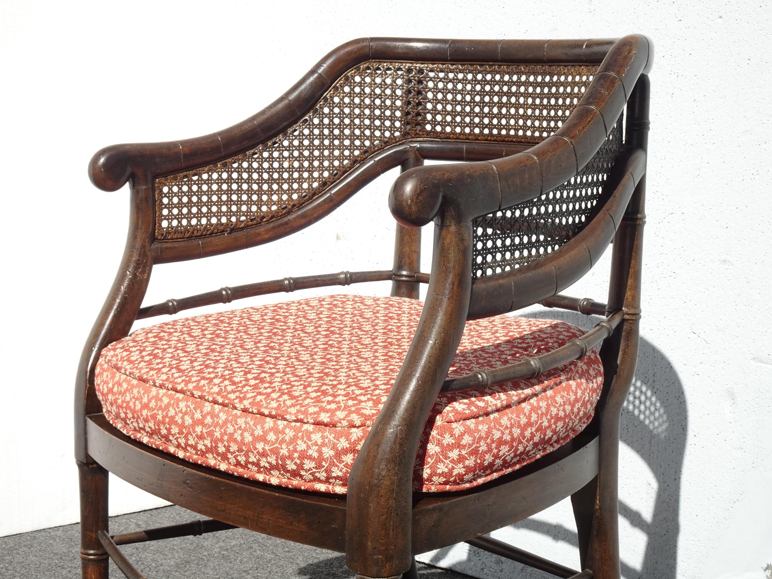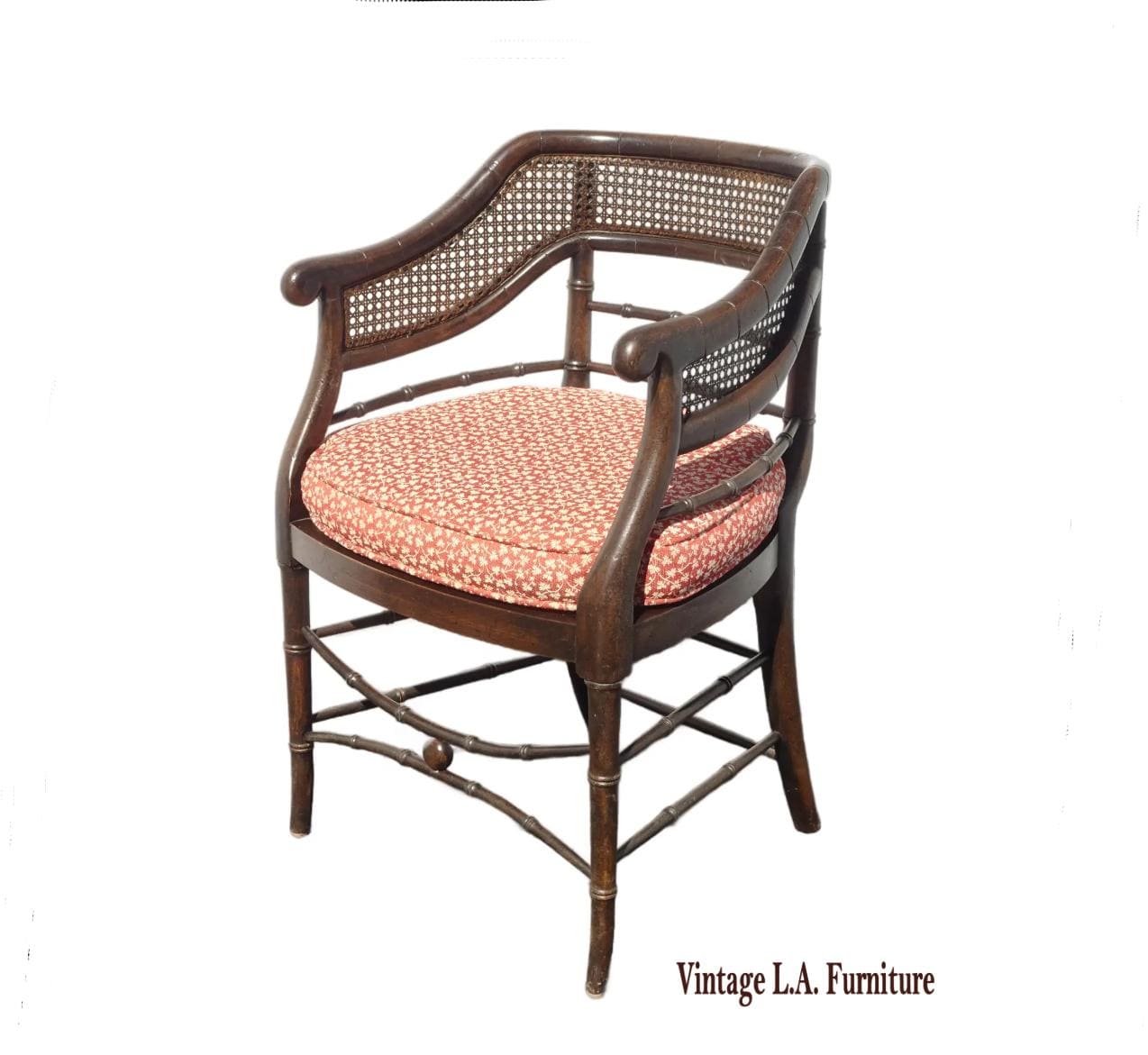 Vintage Polynesian Bamboo Cane Back Barrel Accent Chair w Cane Seat & Cushion