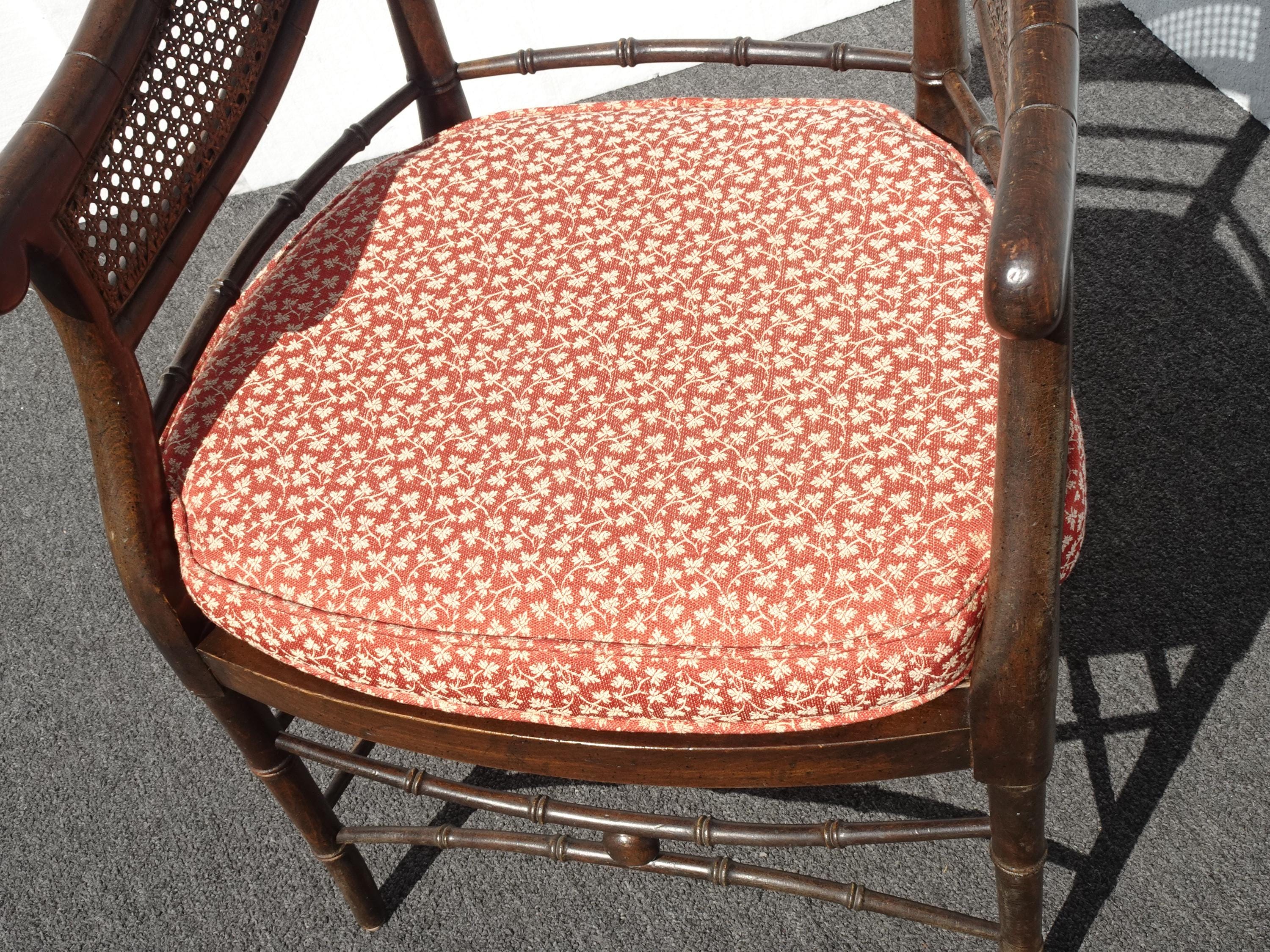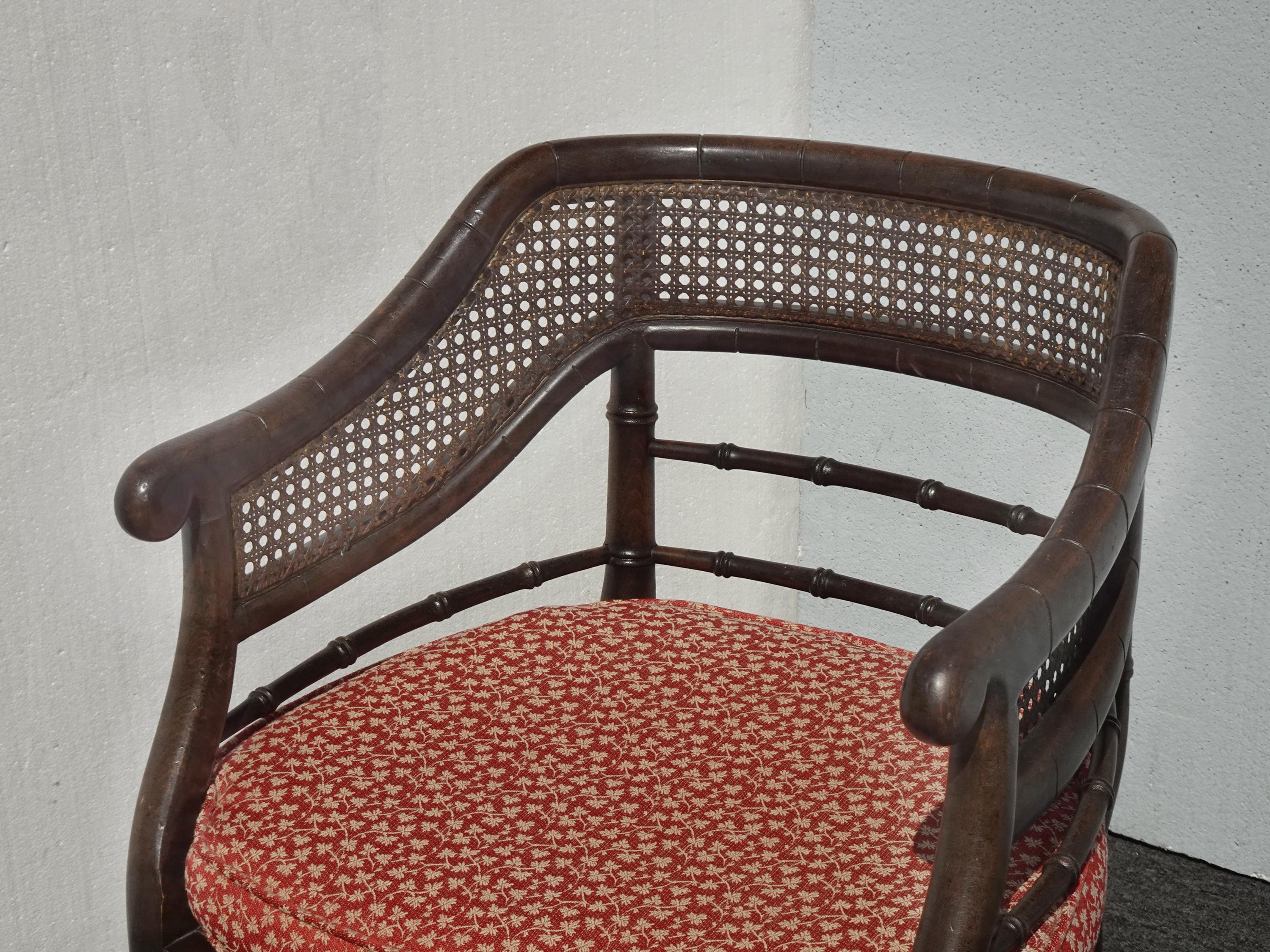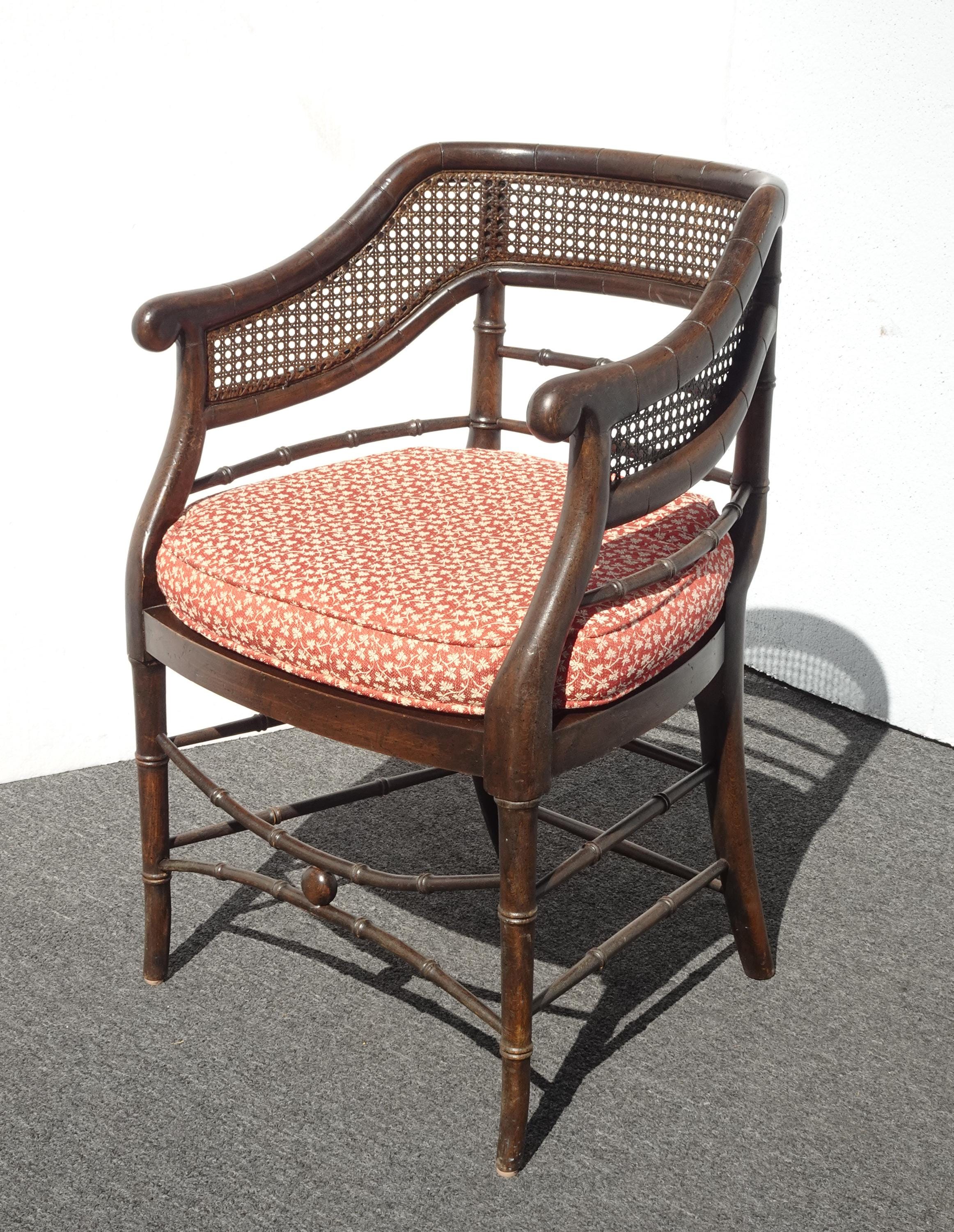 Vintage Polynesian Bamboo Cane Back Barrel Accent Chair w Cane Seat & Cushion