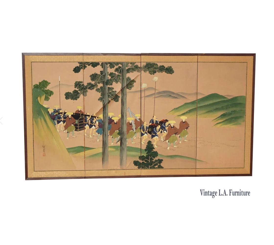 Vintage Japanese Byobu Four Panel Folding Screen Picture Caravan of Men Signed