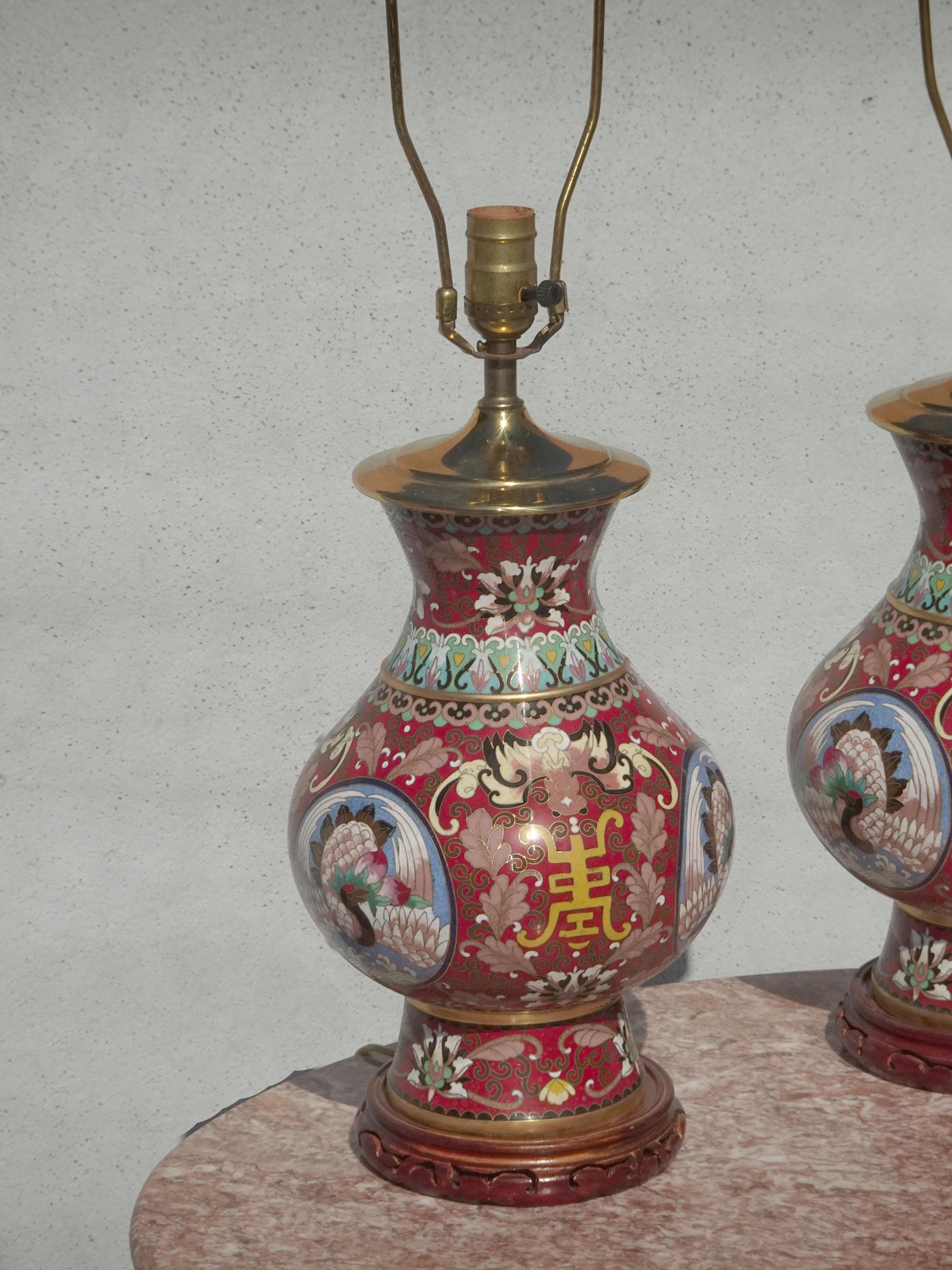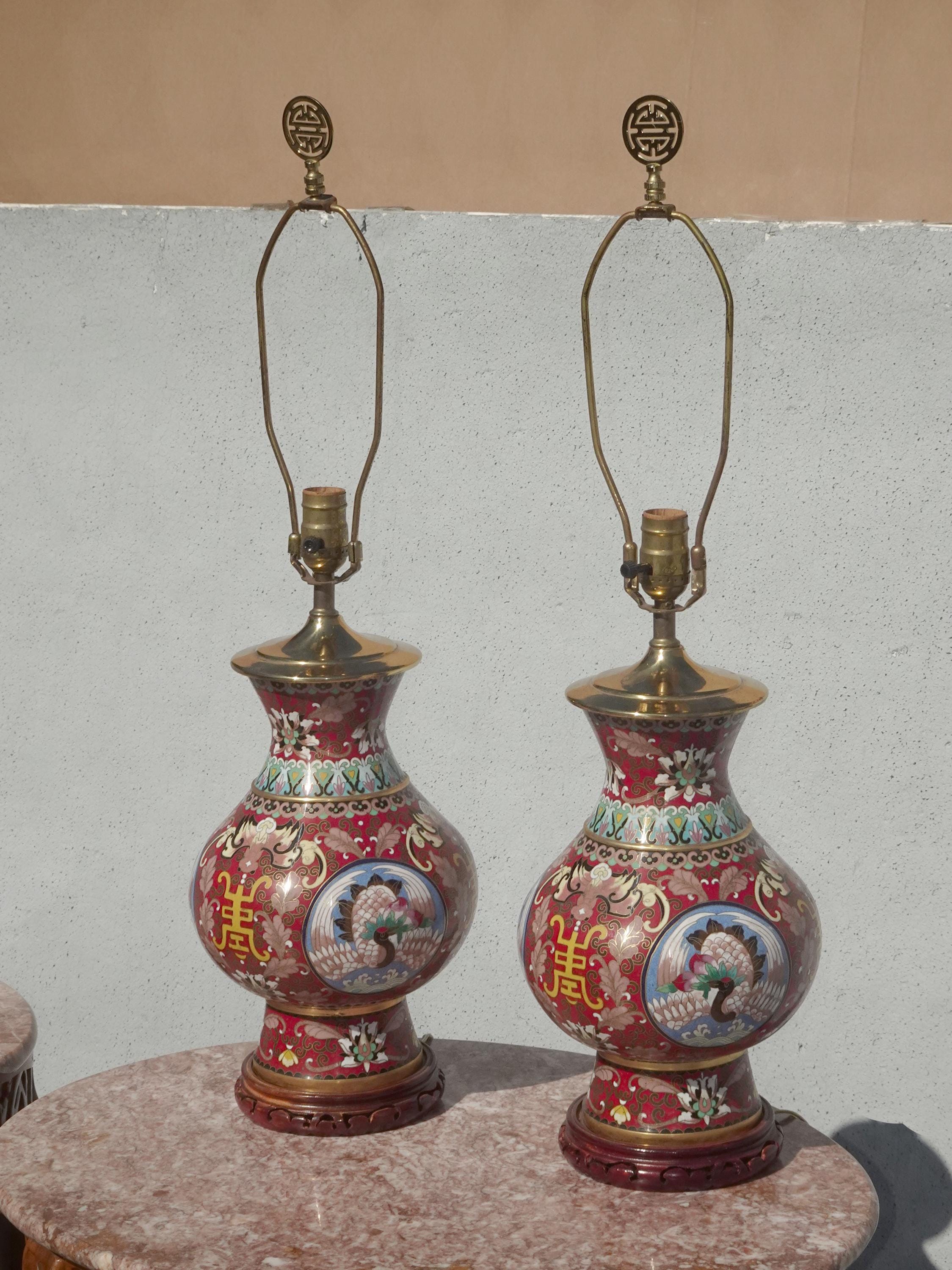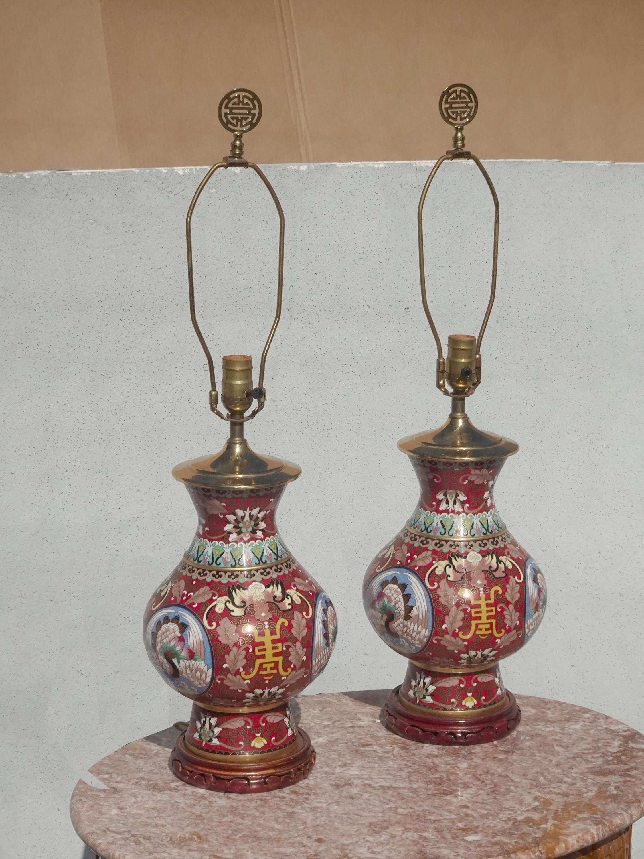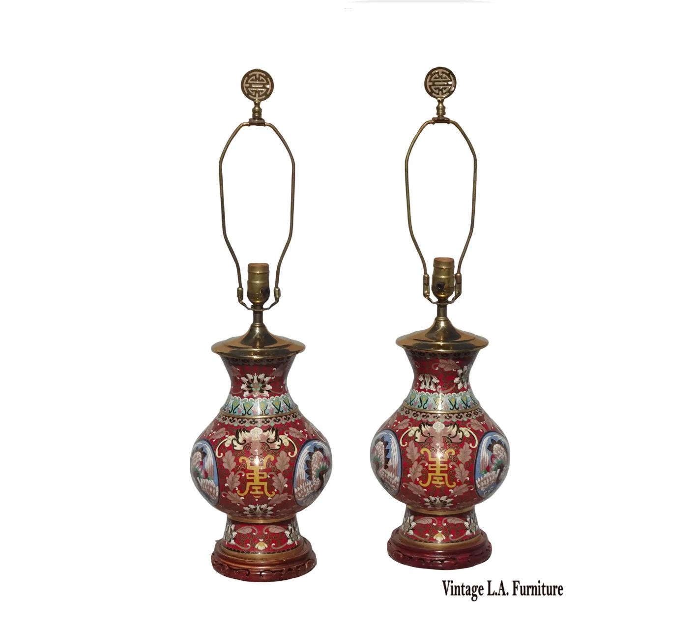 Pair of Vintage Asian Chinoiserie Cloisonne Red Table Lamps