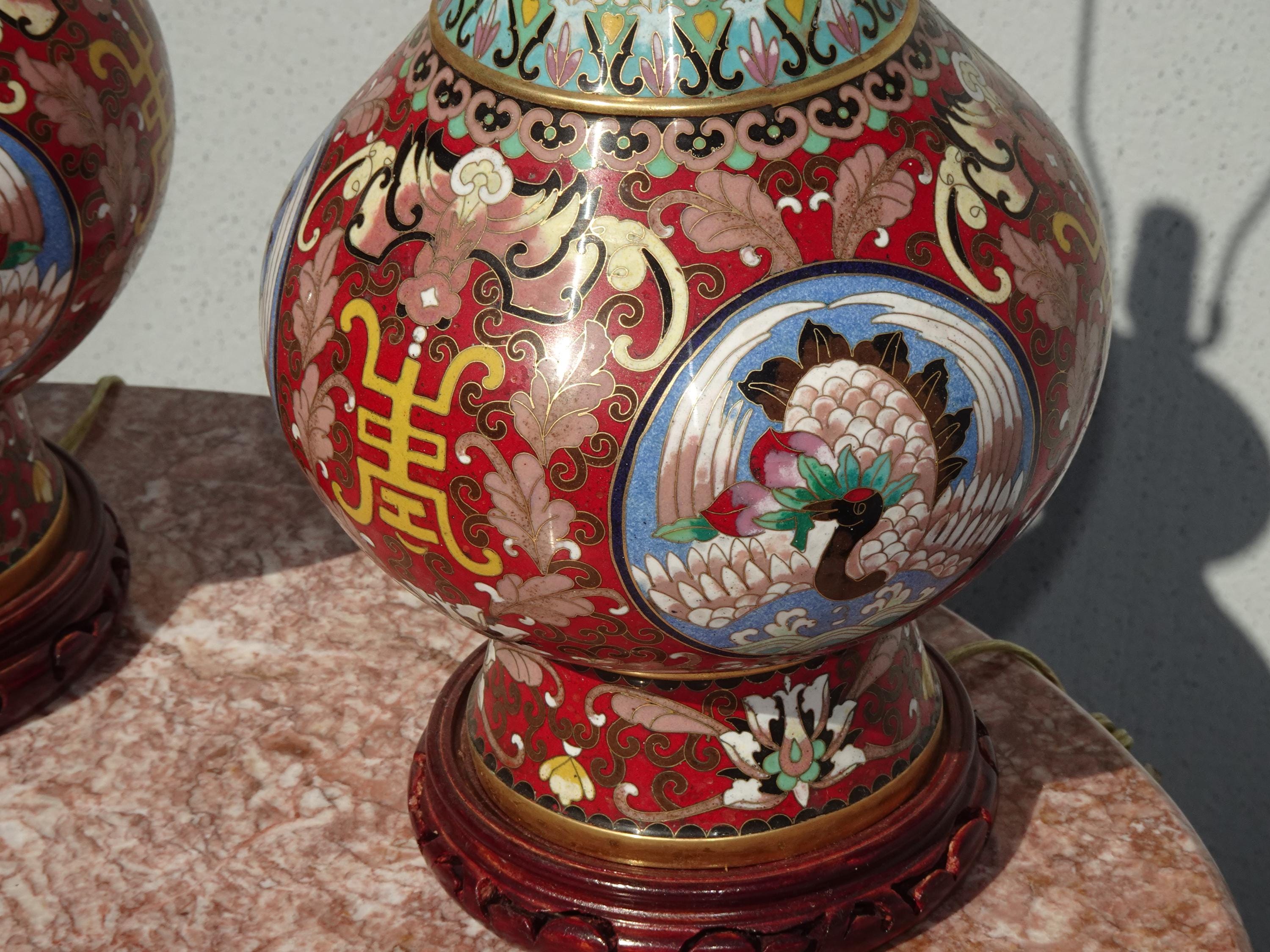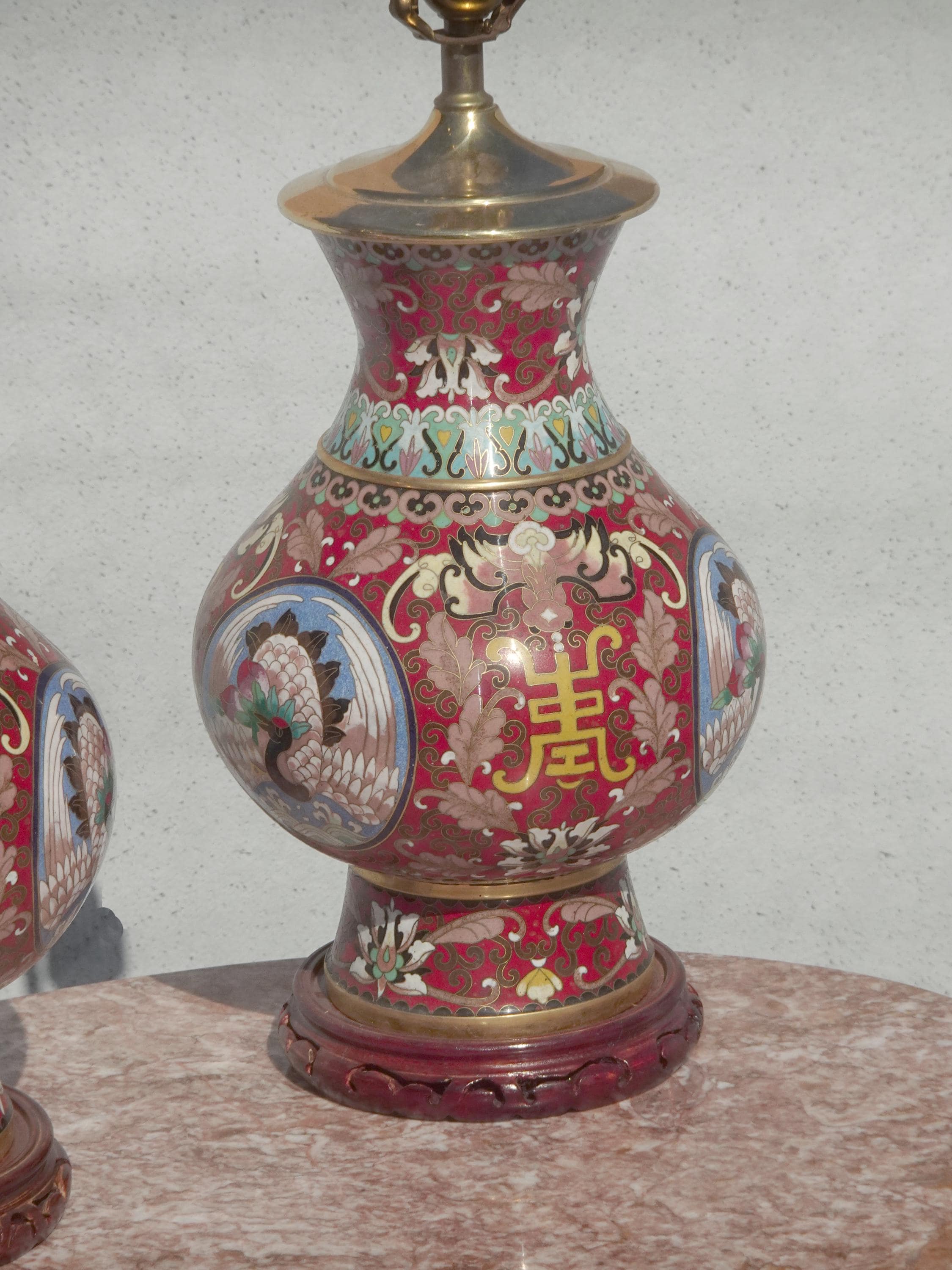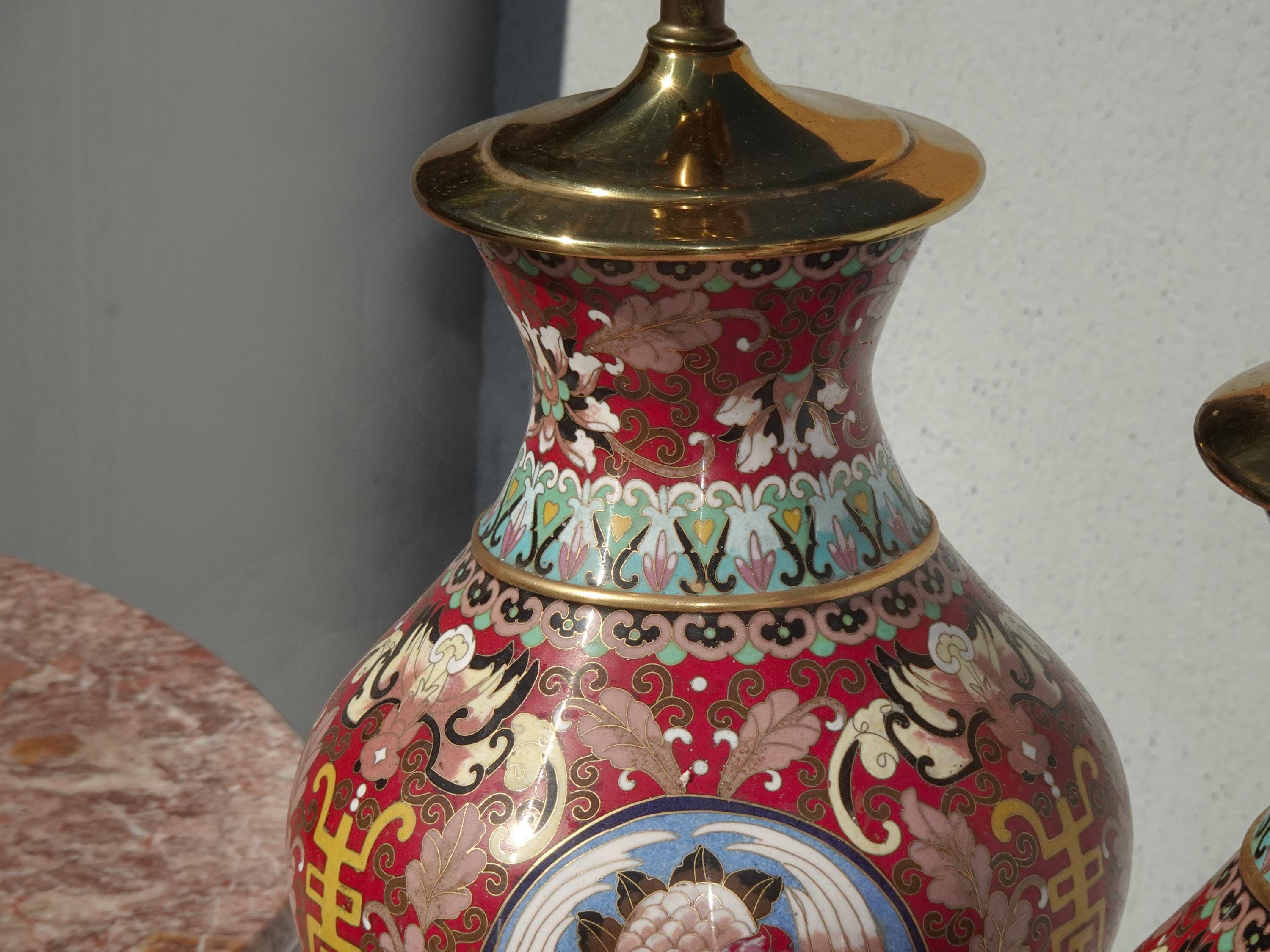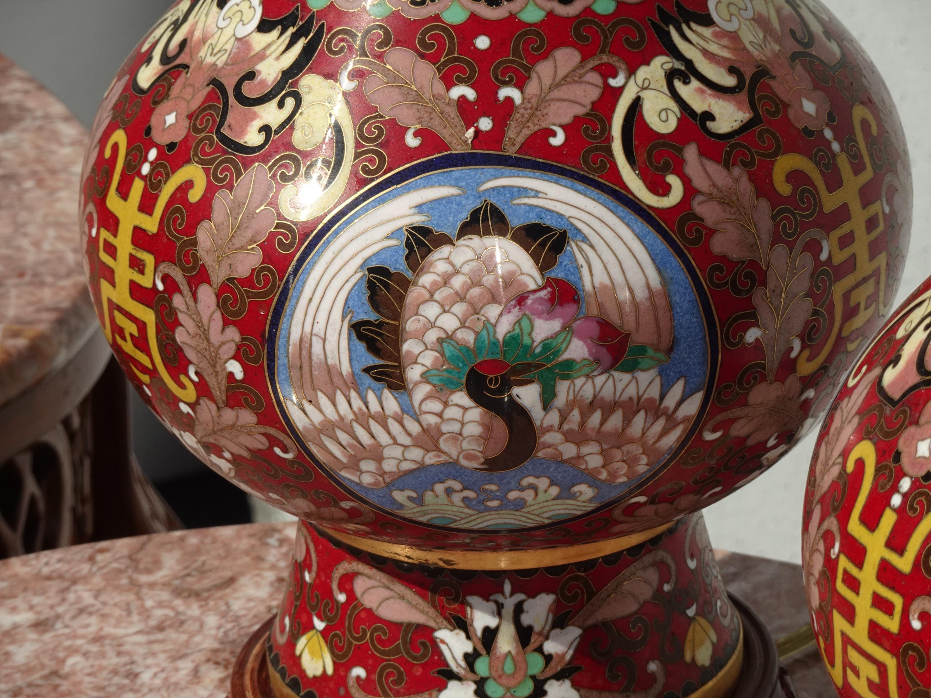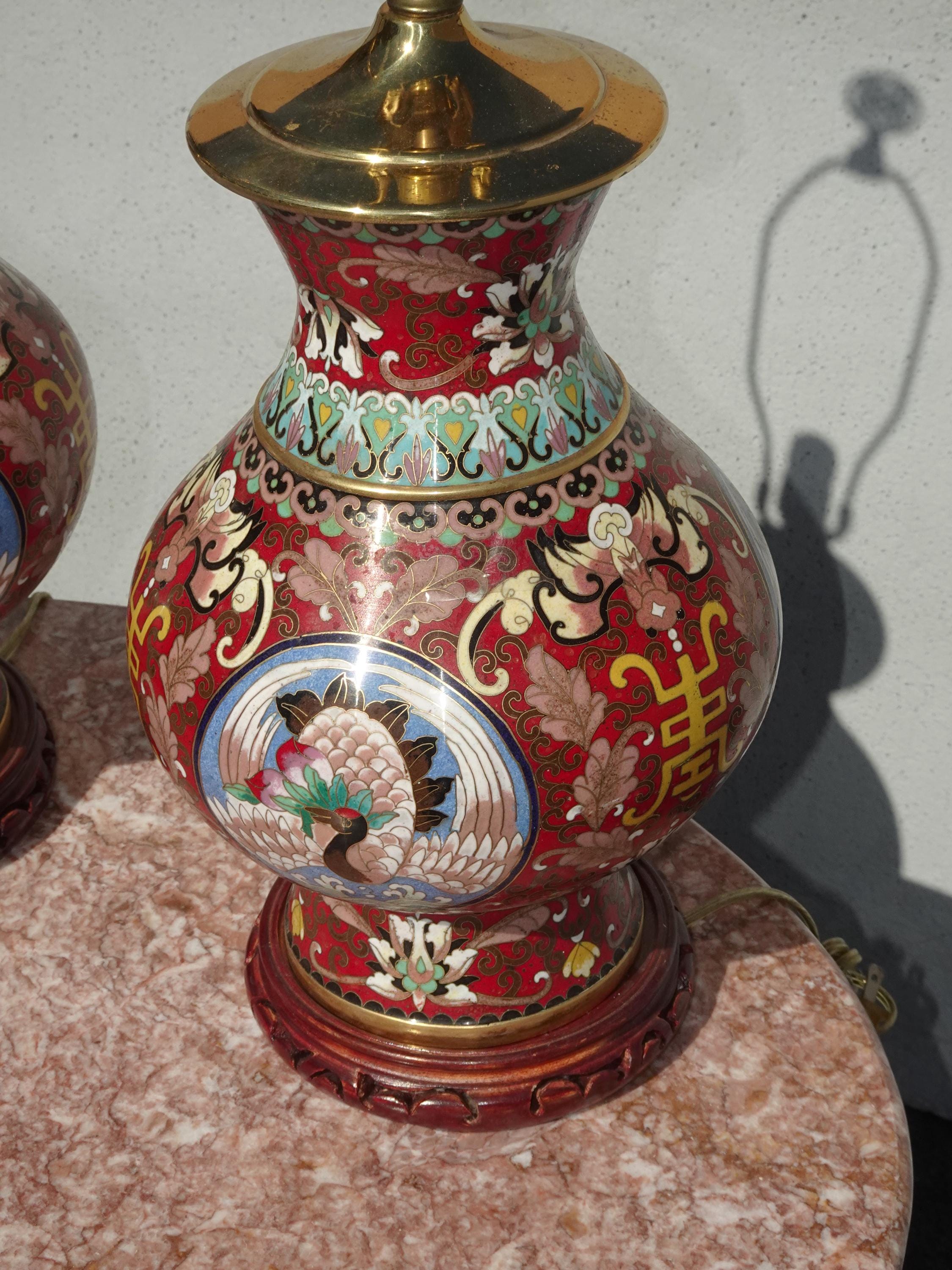 Pair of Vintage Asian Chinoiserie Cloisonne Red Table Lamps