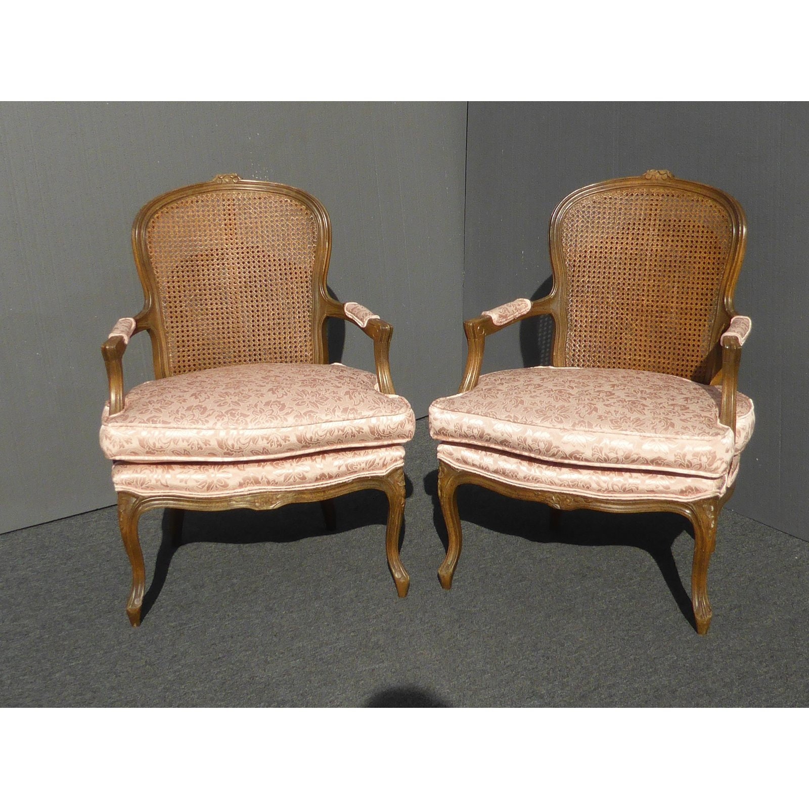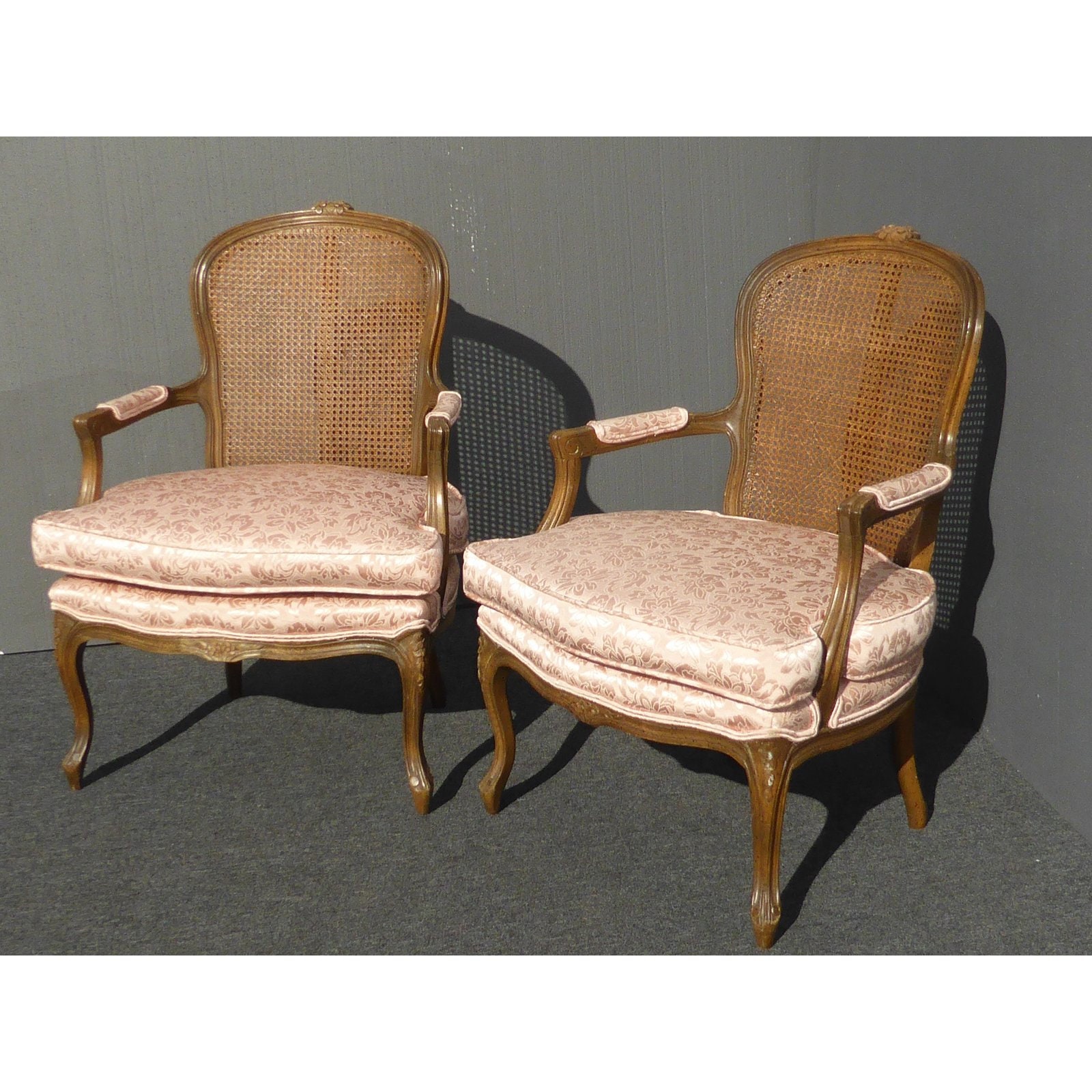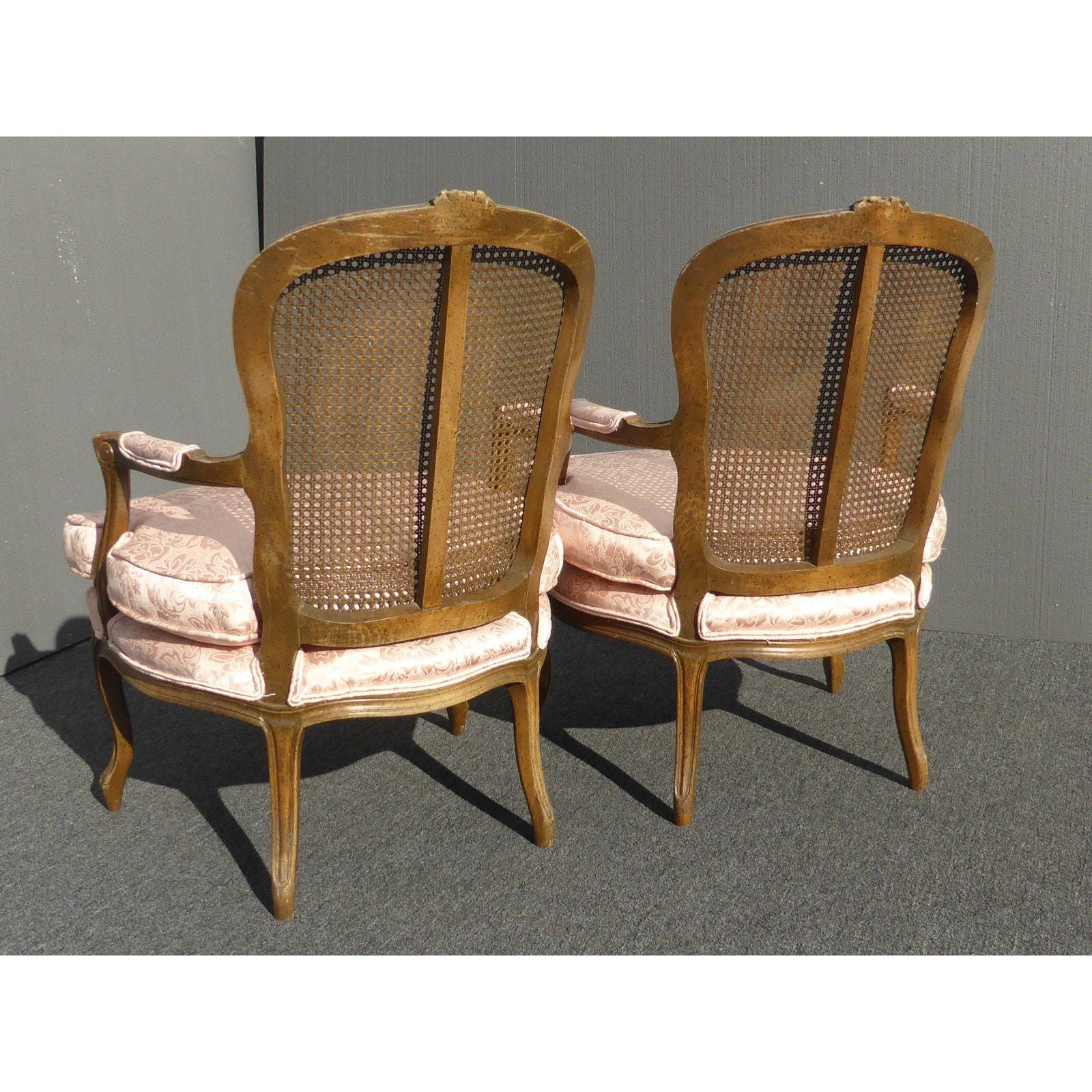 Vintage Pair of French Provincial Cane Back Chairs with Pink Floral Upholstery