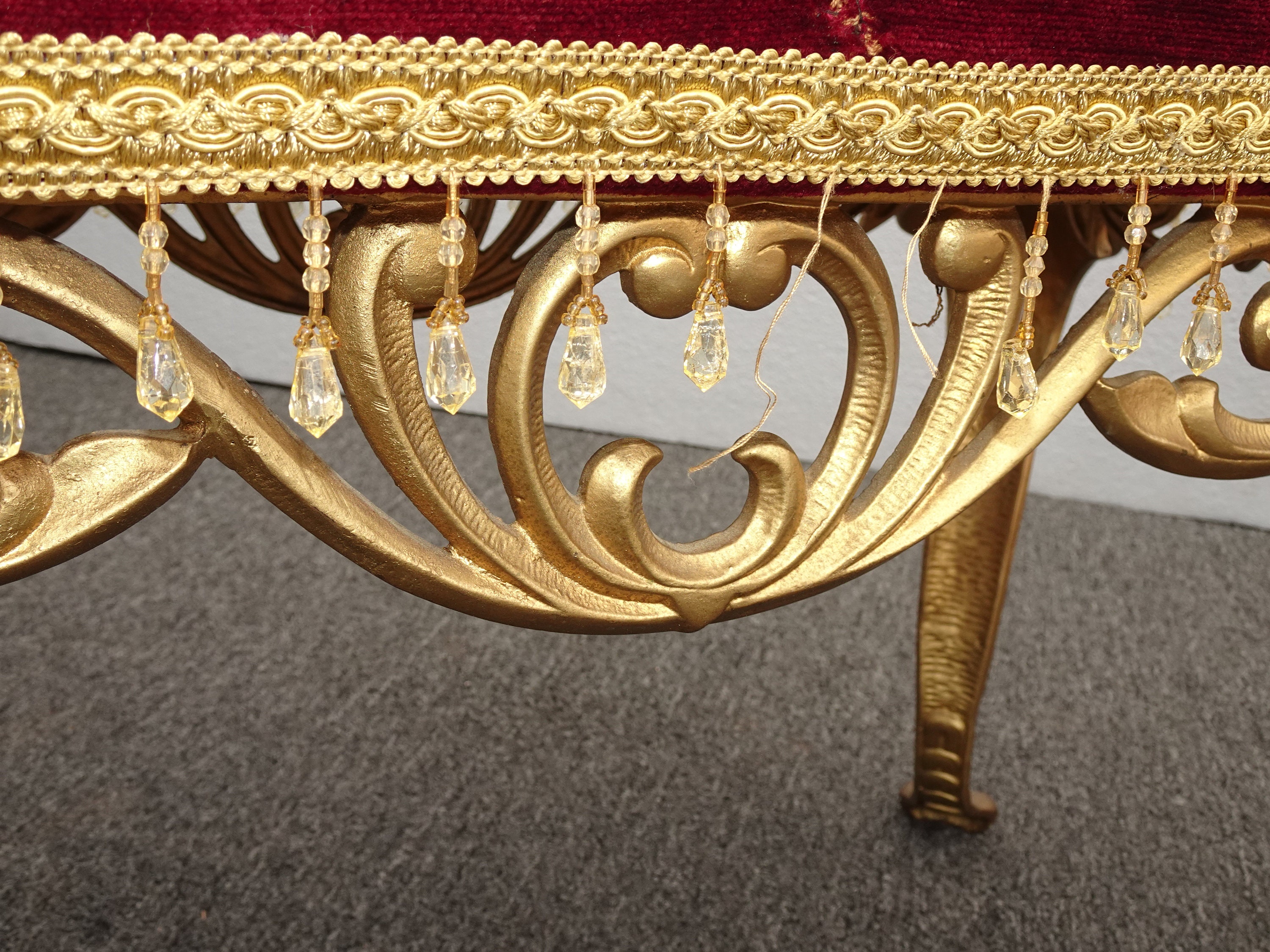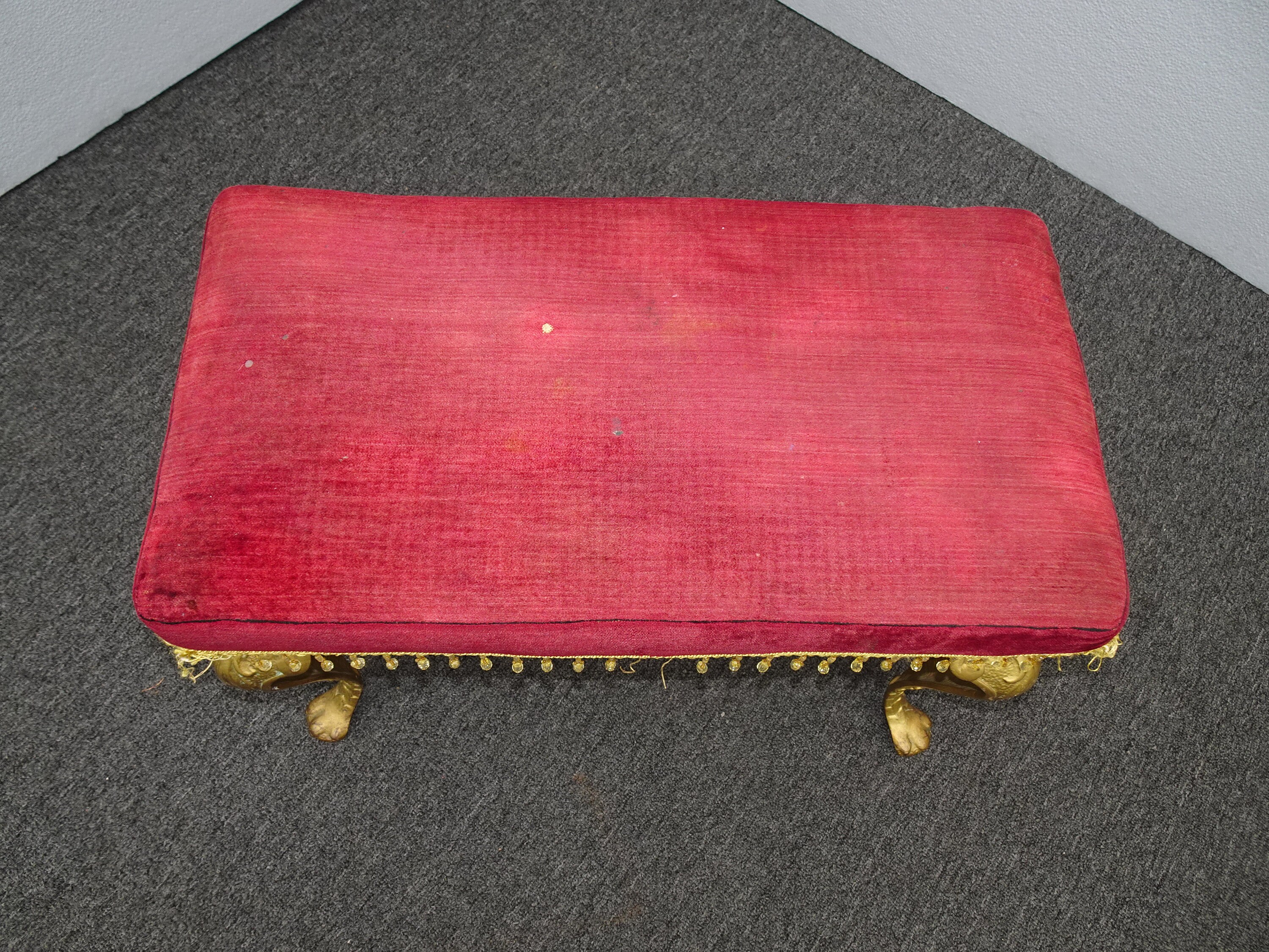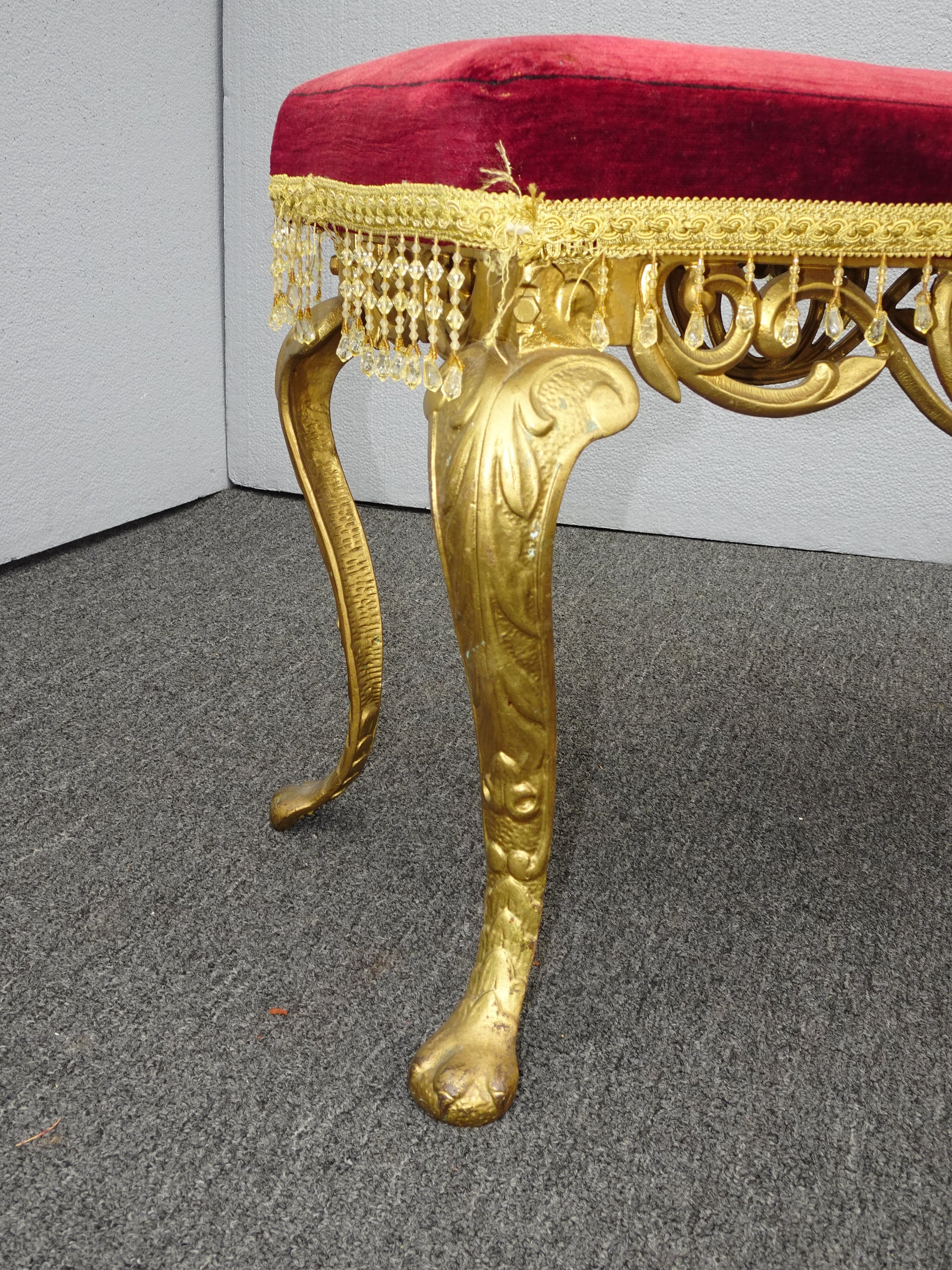 Vintage Spanish Style Red Velvet Bench w Gold Cast Iron Legs Hollywood Regency