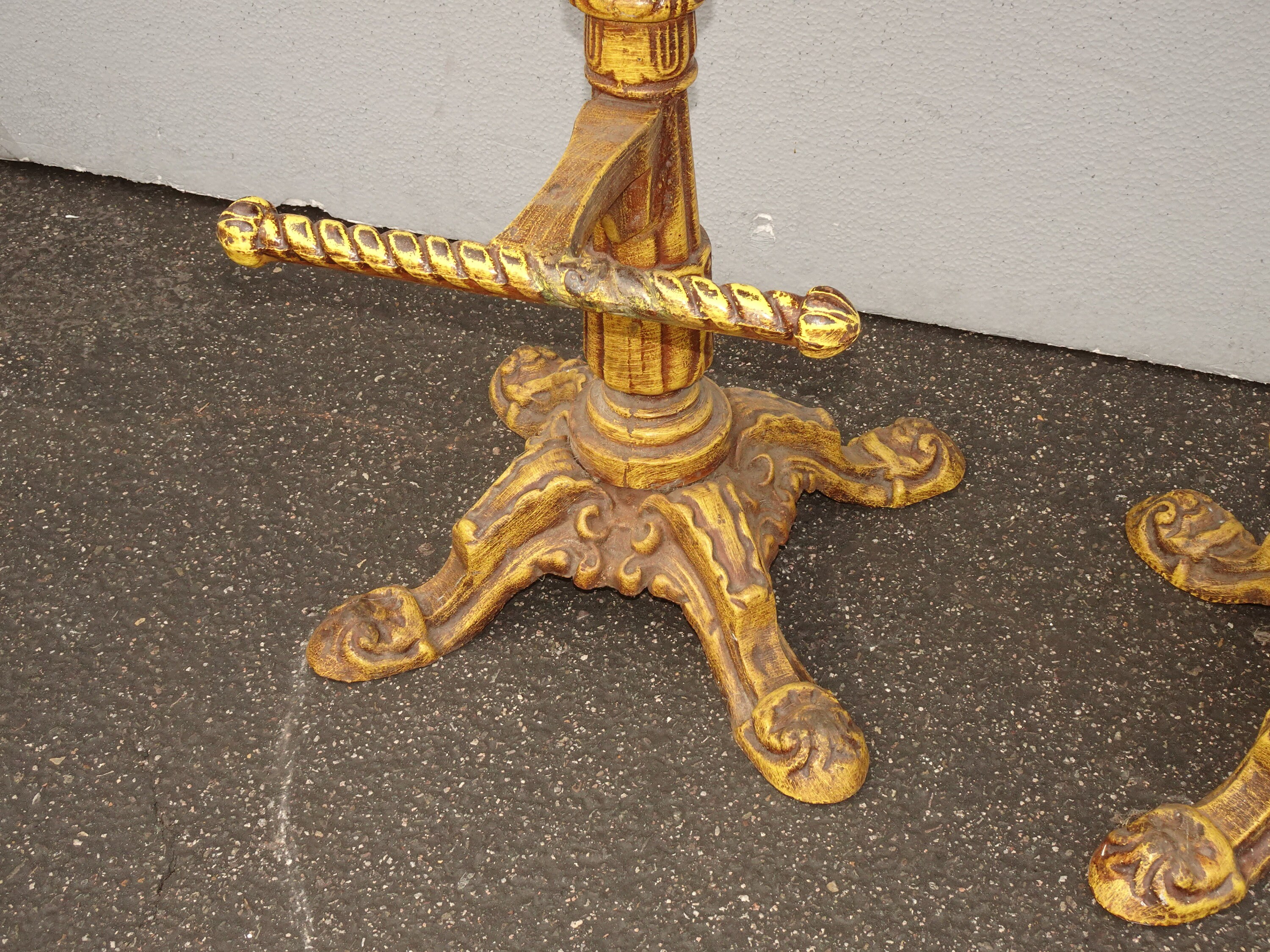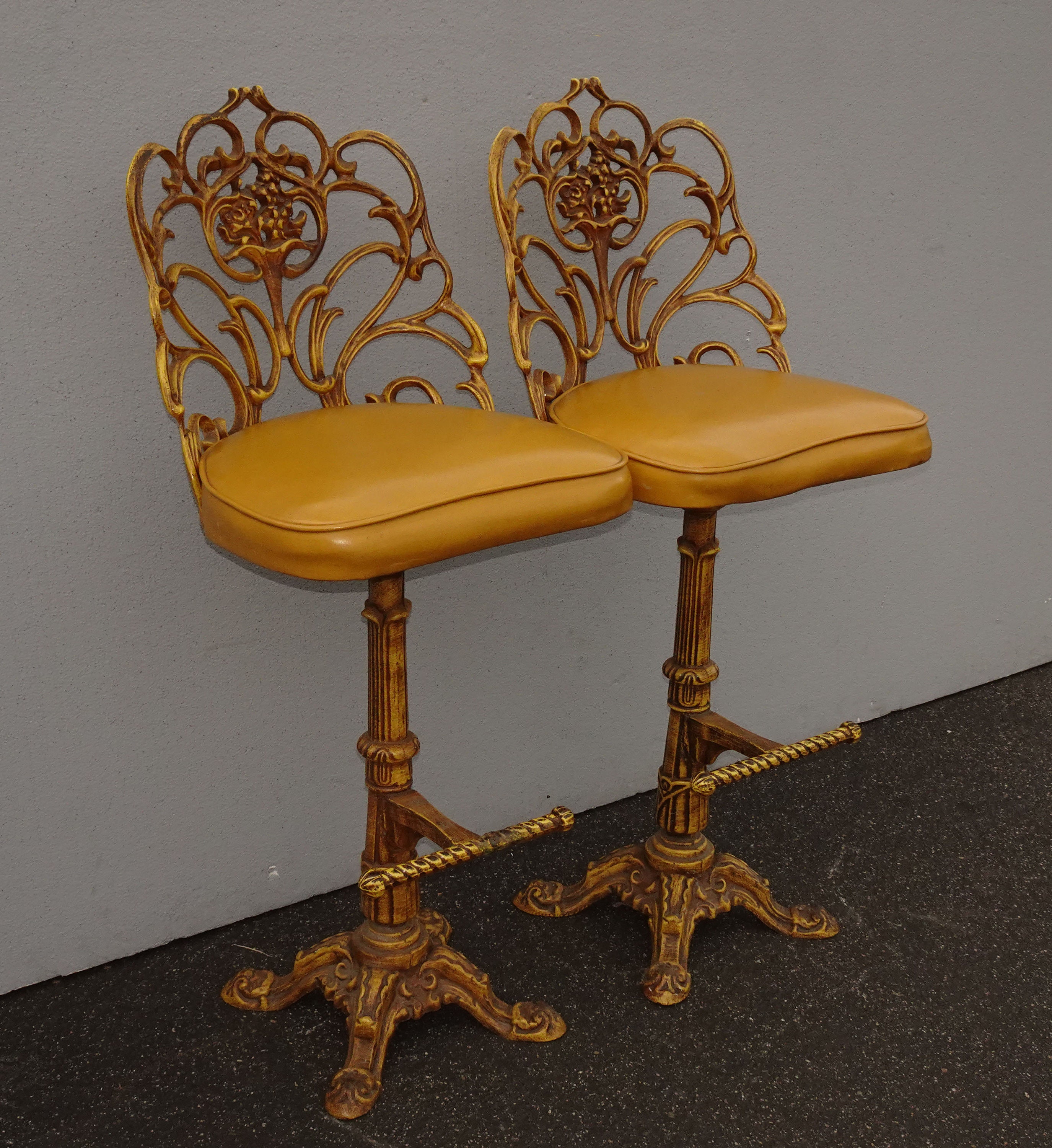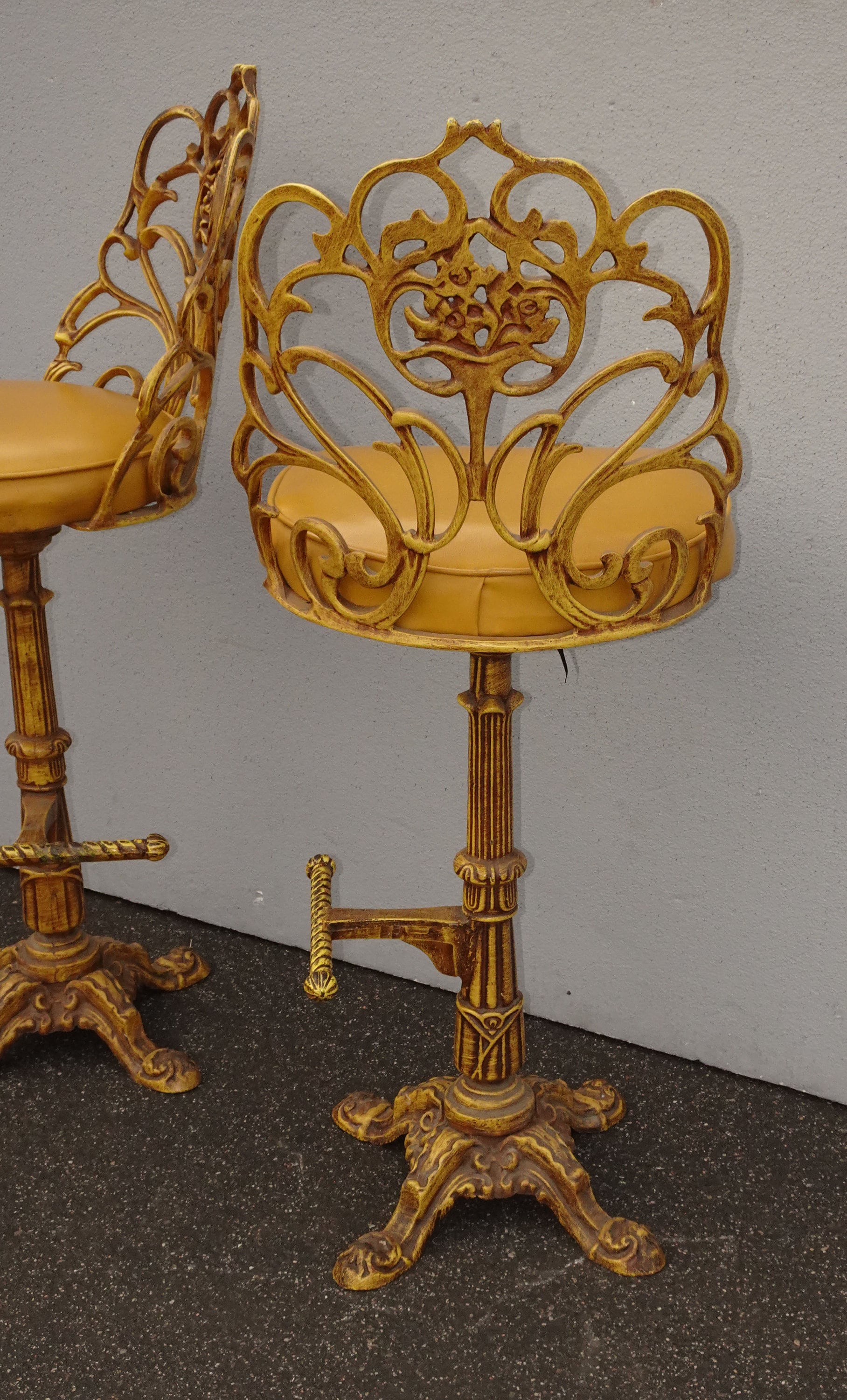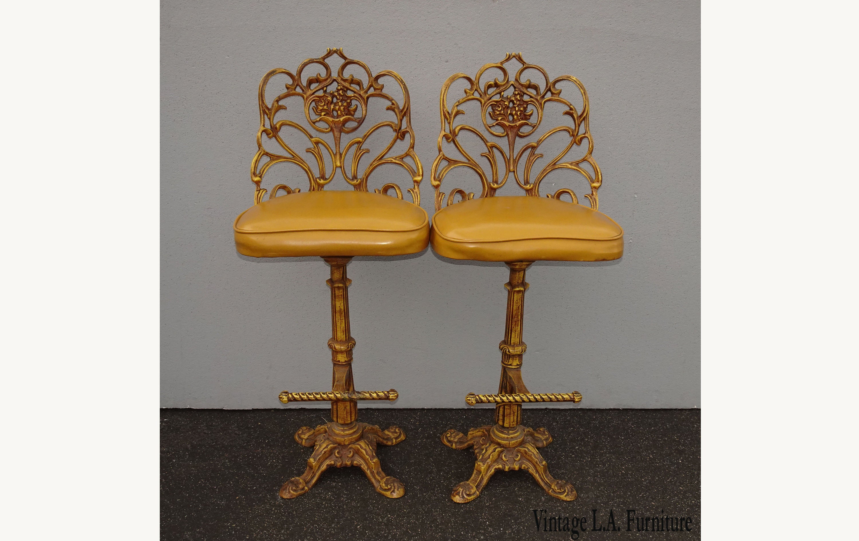 Pair of Vintage Spanish Style Cast Iron Gold Yellow Ornate Scrolled Bar Stools