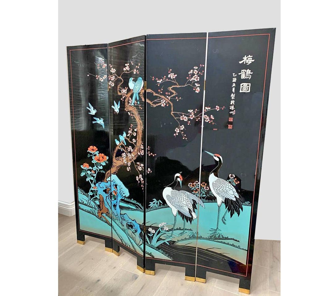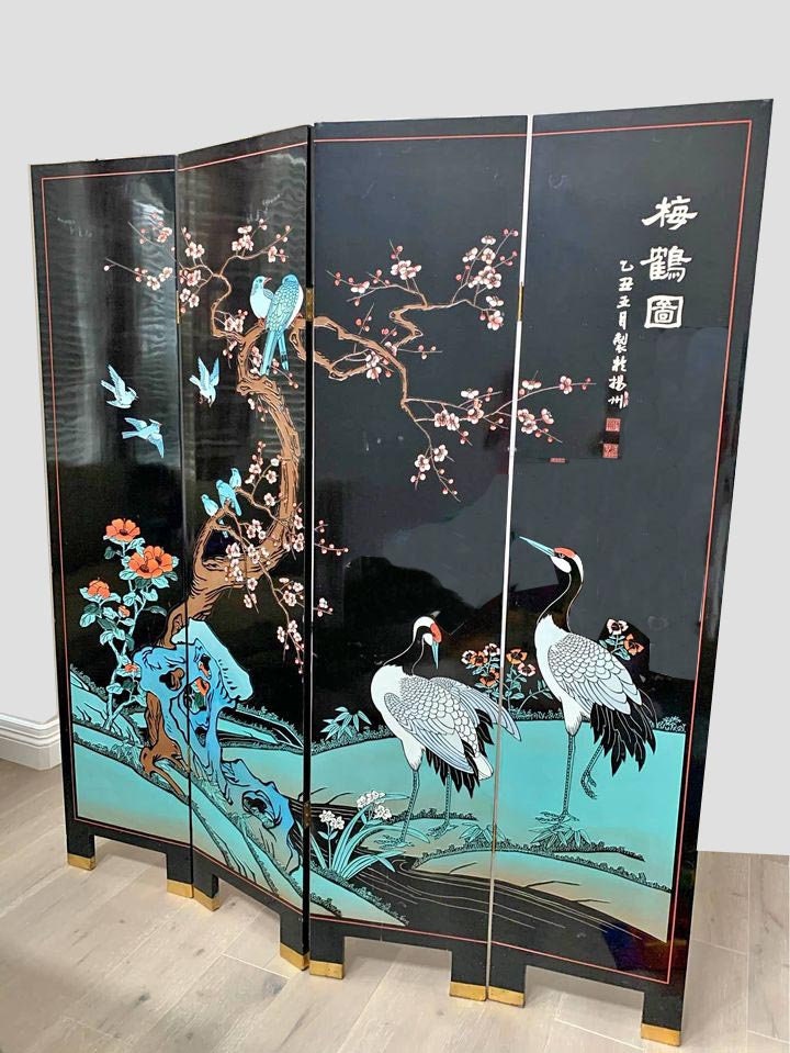 Vintage Coromandel Oriental Asian Four Panel Screen Blue Room Divider w Crane